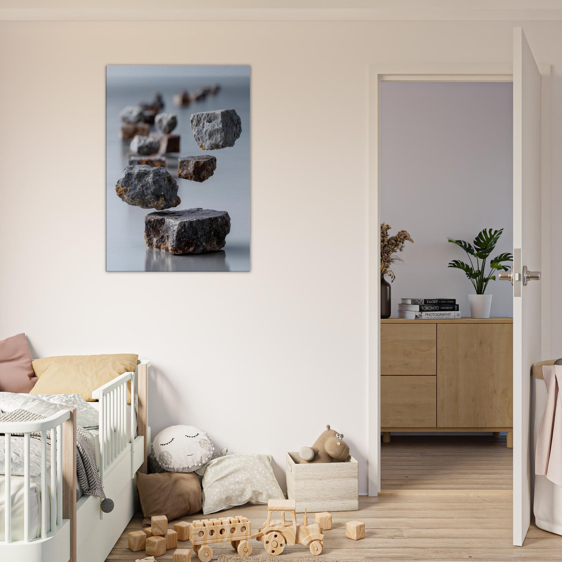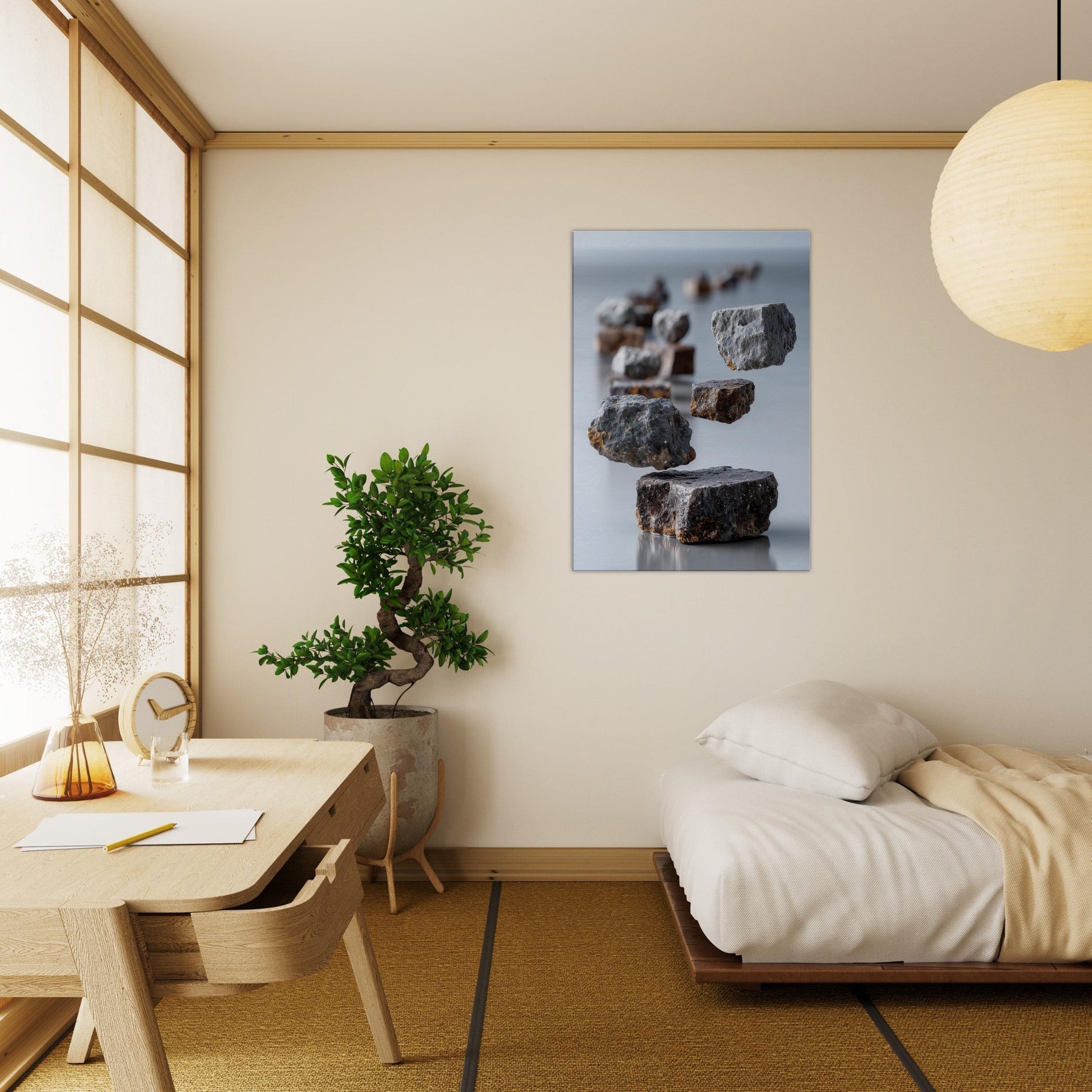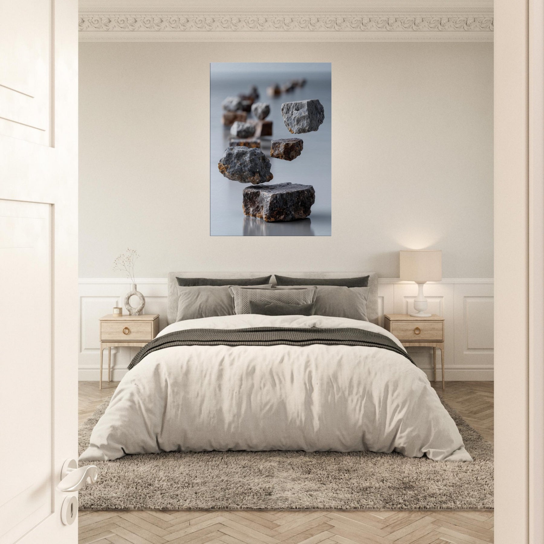 In this dreamlike scene, stones hover and balance above a tranquil Lake, turning a natural balance into a poetry of weightless moment. The soft, misty horizon and glassy water invite quiet reflection, as if color and memory have learned to breathe differently. This surreal composition fills walls with stillness and wonder, ideal for a sunlit living room or reading nook. Let it anchor conversations while you savor the hush of evening light.