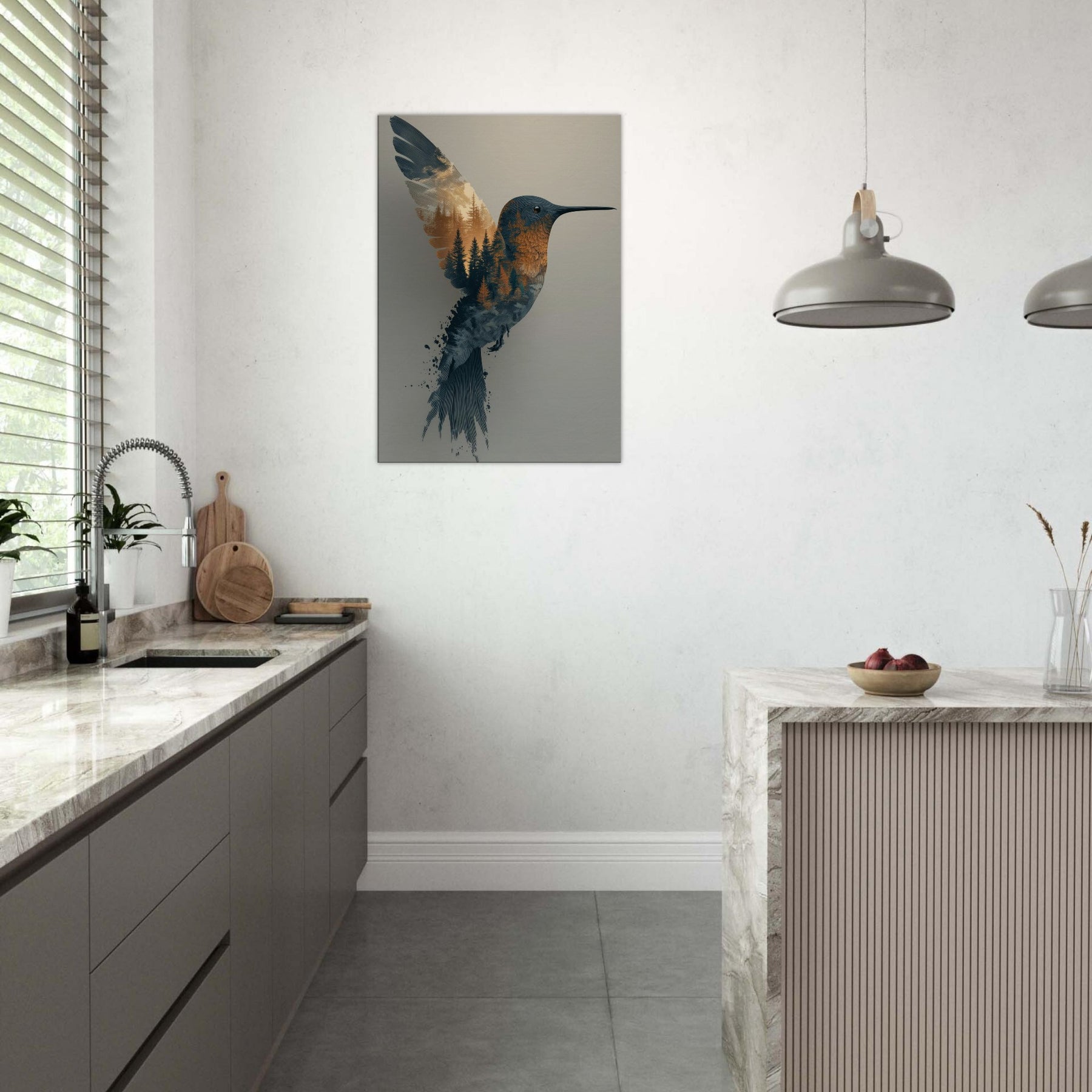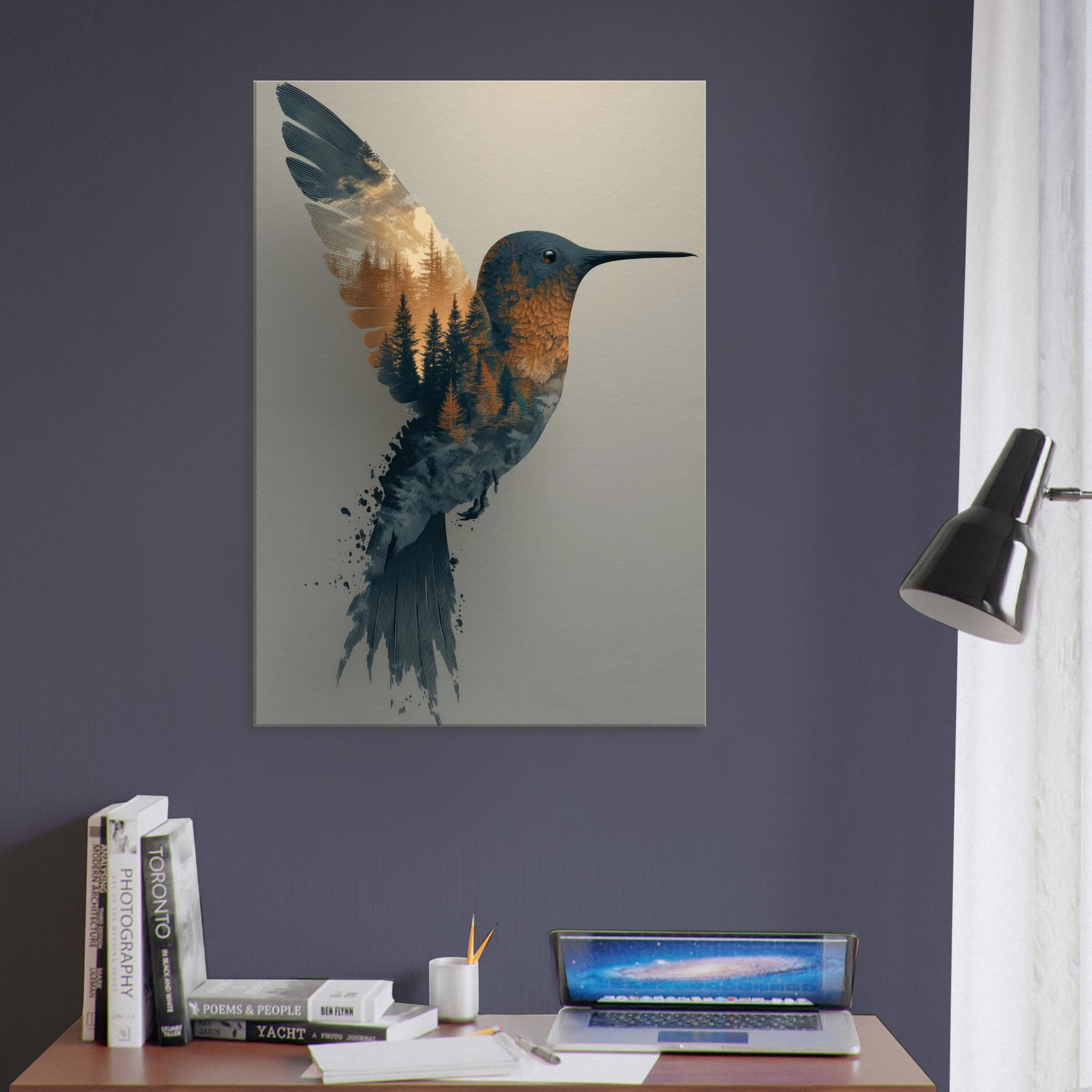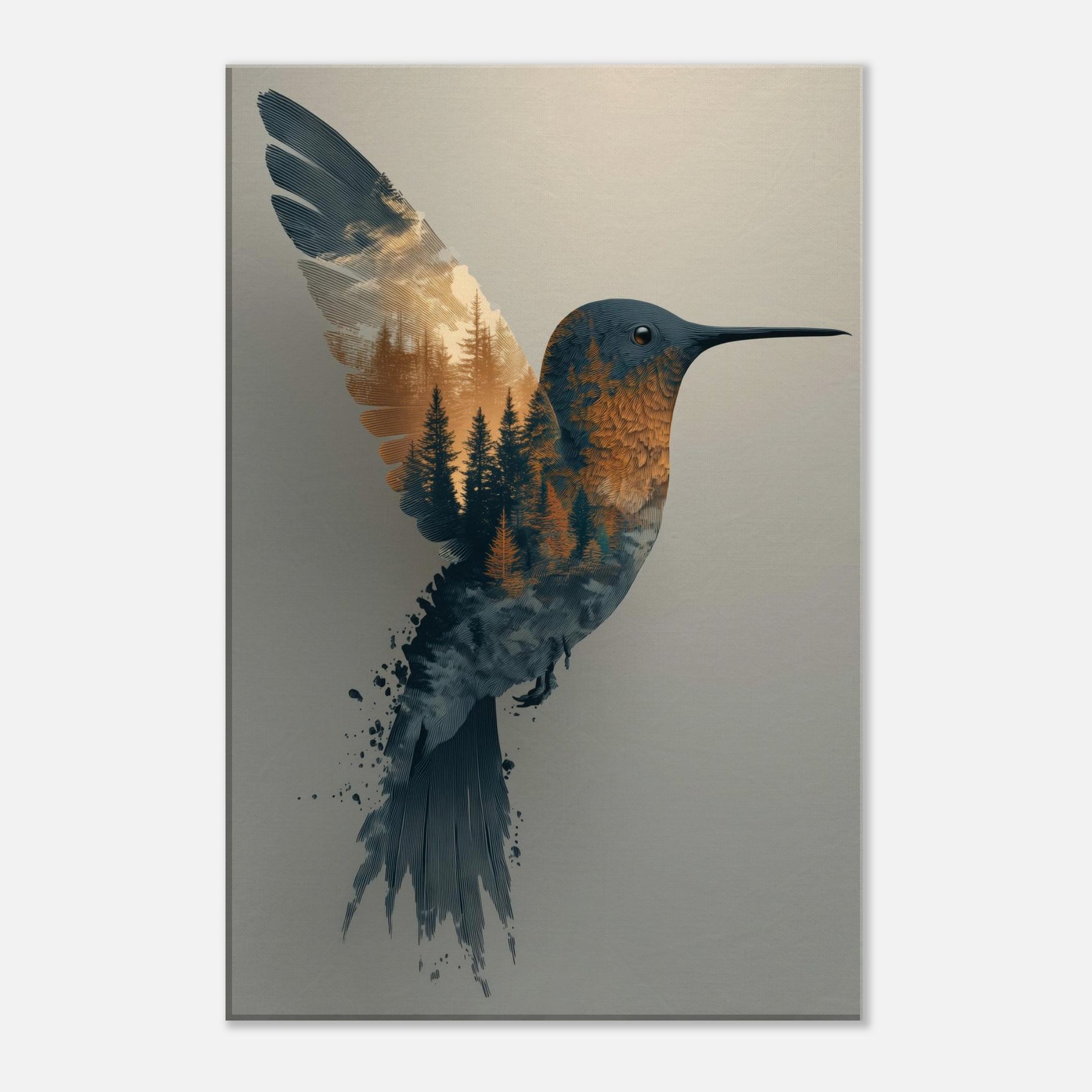 Where daylight and woodland breathe as one, this Surrealism inspired composition centers the Hummingbird, whose form dissolves into a forest of pines. The image invites quiet wonder: the bird's slender beak points toward a horizon of amber and slate, while conifer textures ripple through its plumage as if memory and nature braid together in flight. The palette: soft blues, warm ambers, and hints of dusk evokes a tranquil mood that bathes any room in calm. Perfect for living rooms, bedrooms, or studios, it adds movement, poetry, and a contemplative ambience to your space.