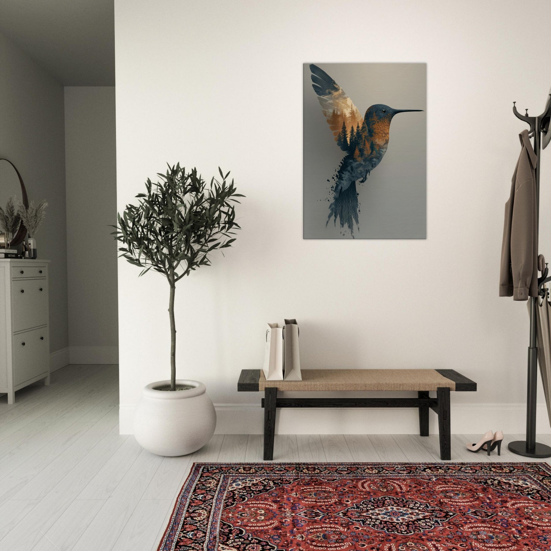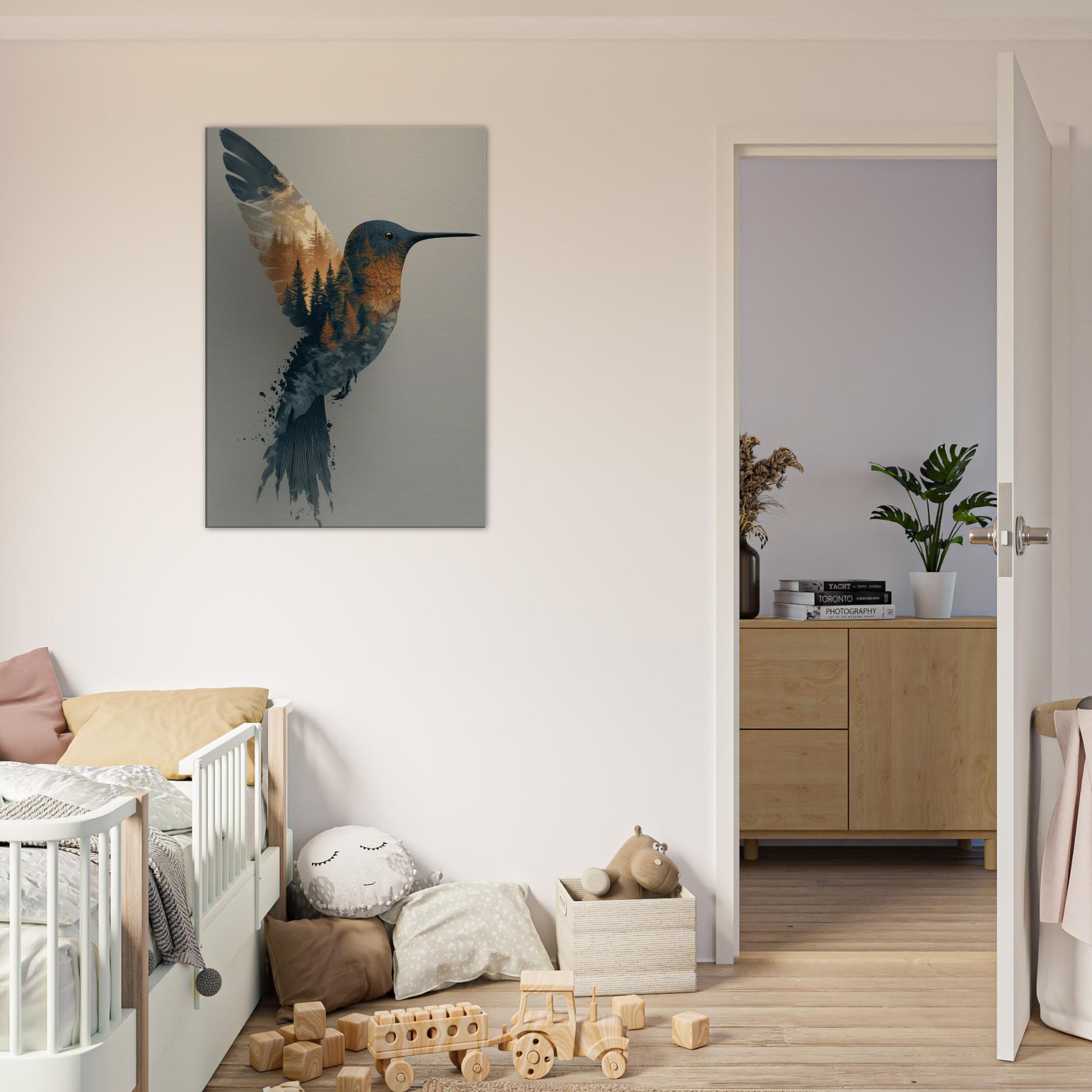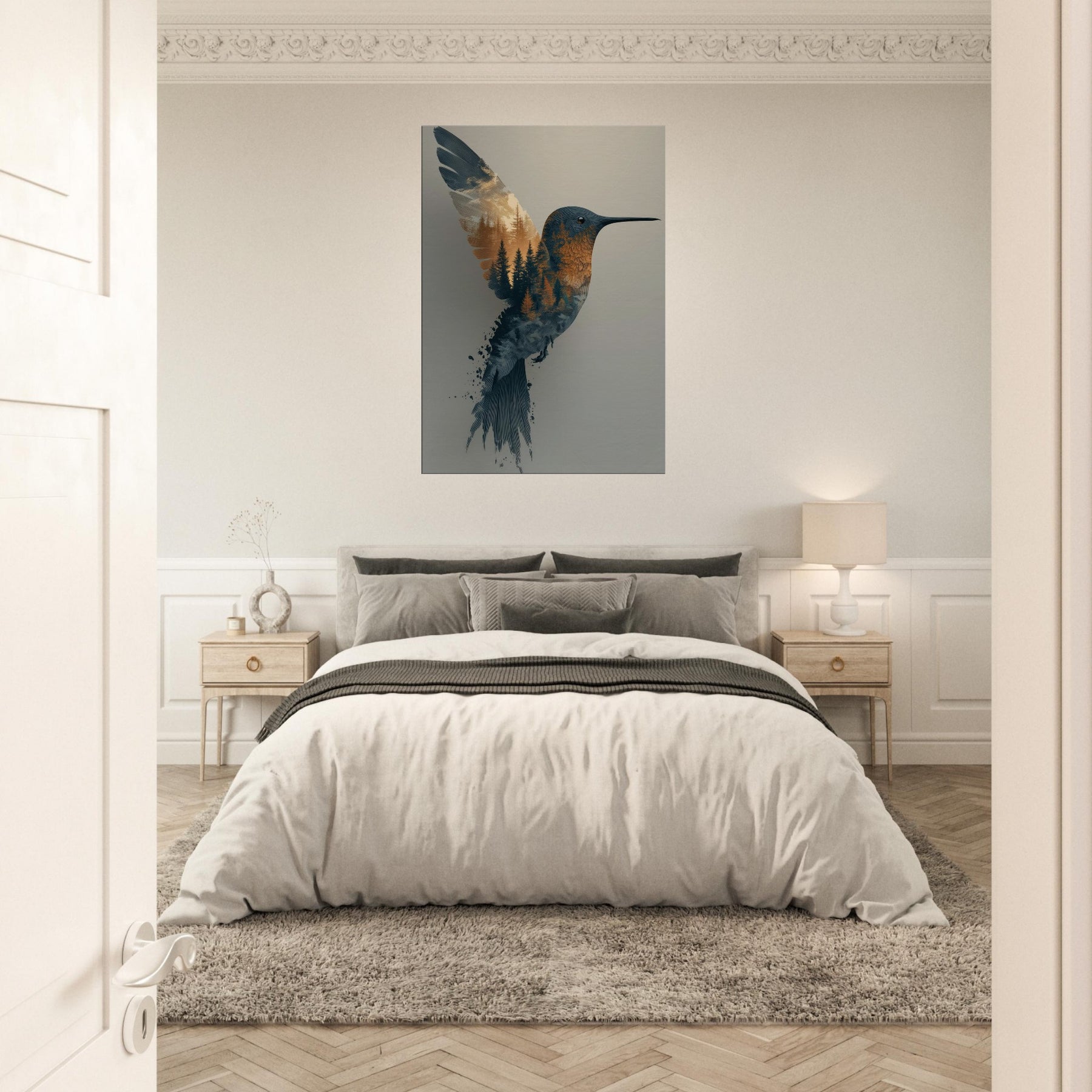 Where daylight and woodland breathe as one, this Surrealism inspired composition centers the Hummingbird, whose form dissolves into a forest of pines. The image invites quiet wonder: the bird's slender beak points toward a horizon of amber and slate, while conifer textures ripple through its plumage as if memory and nature braid together in flight. The palette: soft blues, warm ambers, and hints of dusk evokes a tranquil mood that bathes any room in calm. Perfect for living rooms, bedrooms, or studios, it adds movement, poetry, and a contemplative ambience to your space.