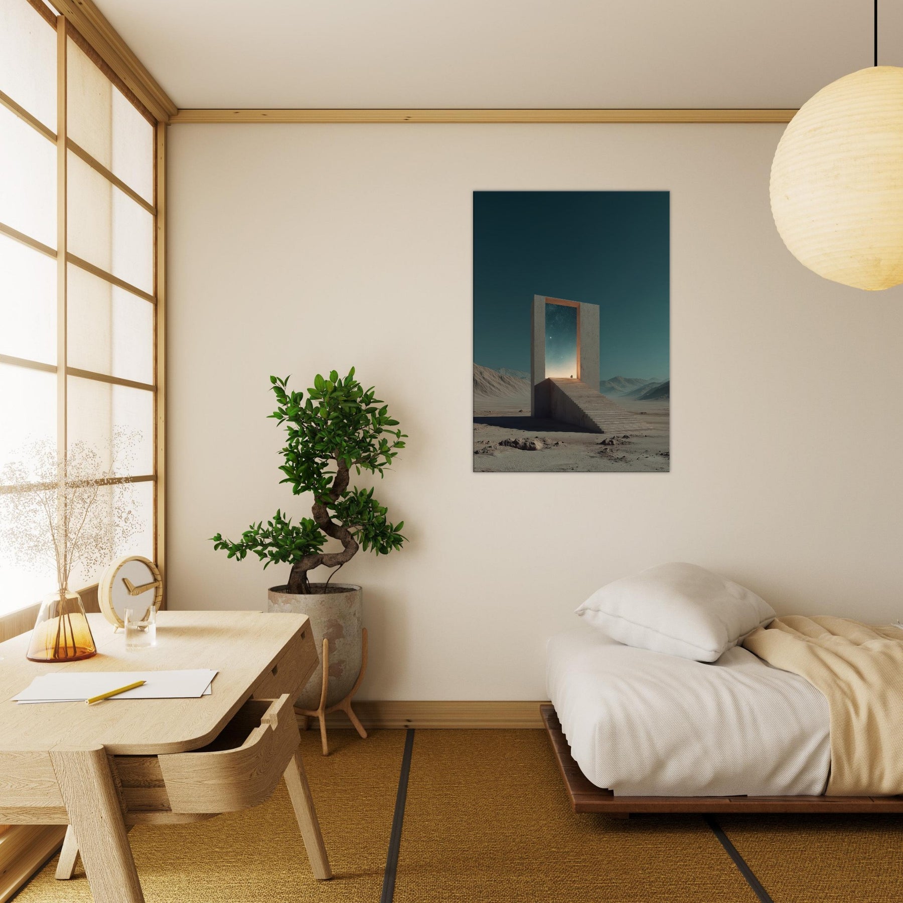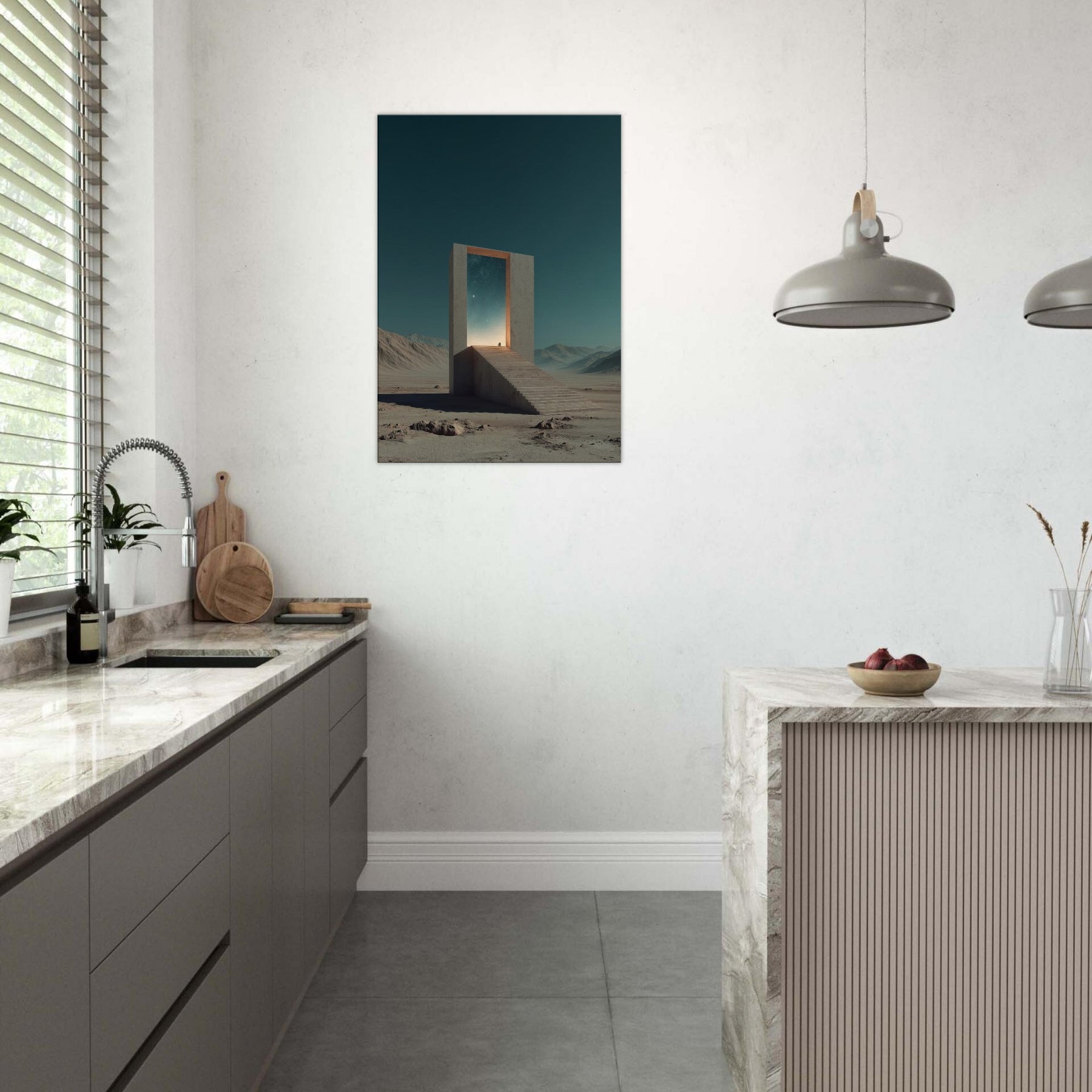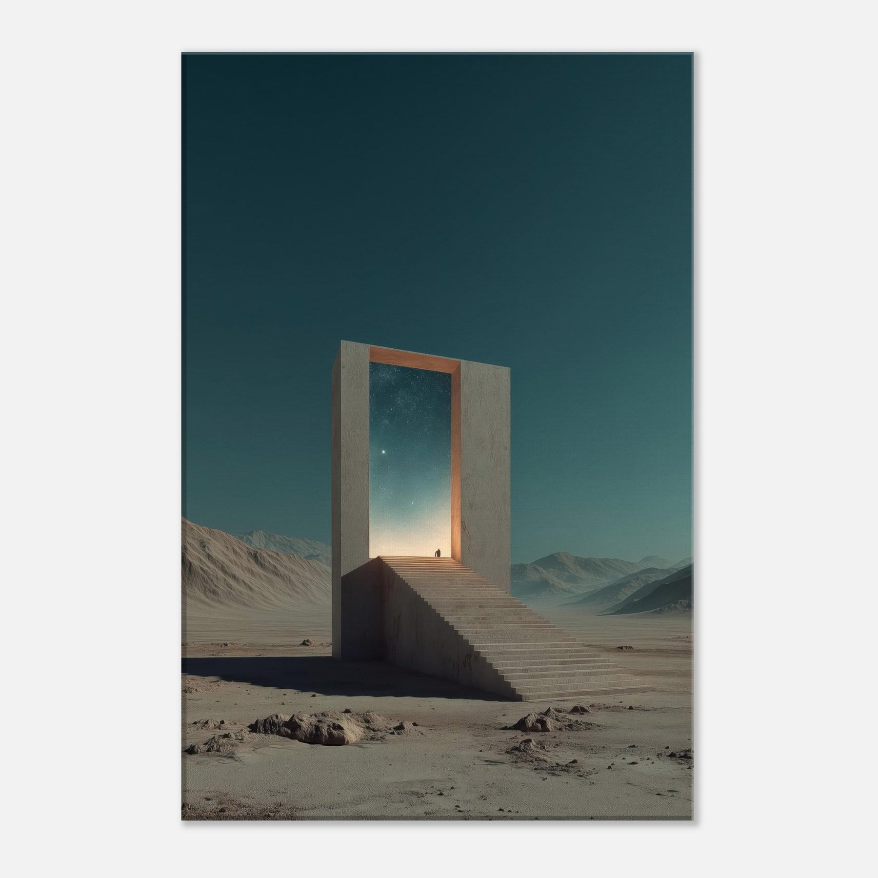 An endless staircase leads to a radiant doorway, framing a pale horizon where distant stars glow. This Athens inspired surreal scene invites quiet reflection, as if the city’s ancient light leans into a dream. A solitary gate stands in a barren expanse, its edges catching a warm, otherworldly glow and casting soft, meditative shadows. Hang this piece to bathe a living room or study in mythic calm and architectural poetry, elevating everyday moments with a sense of mystery and timeless possibility.