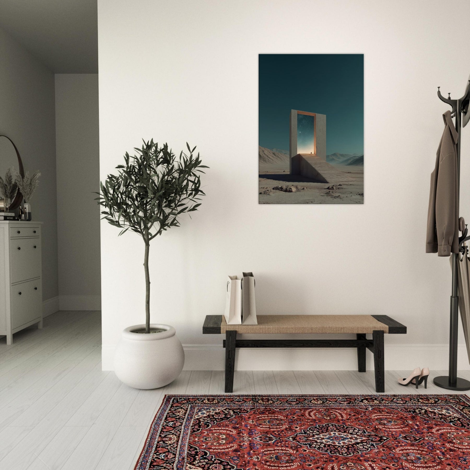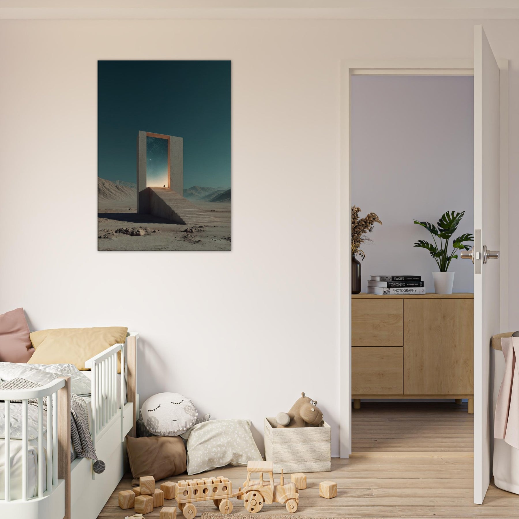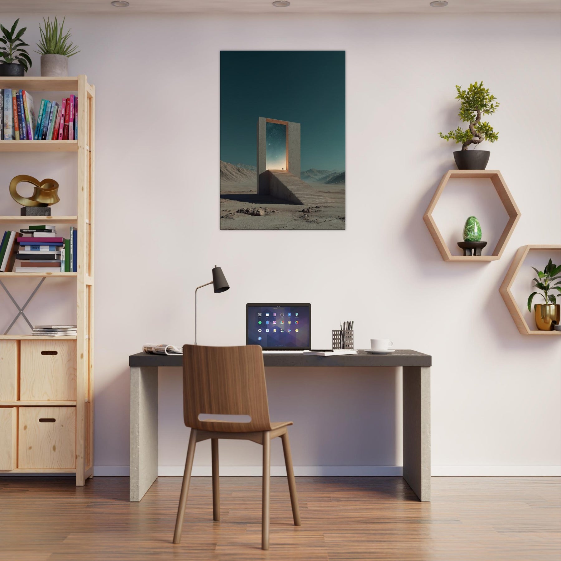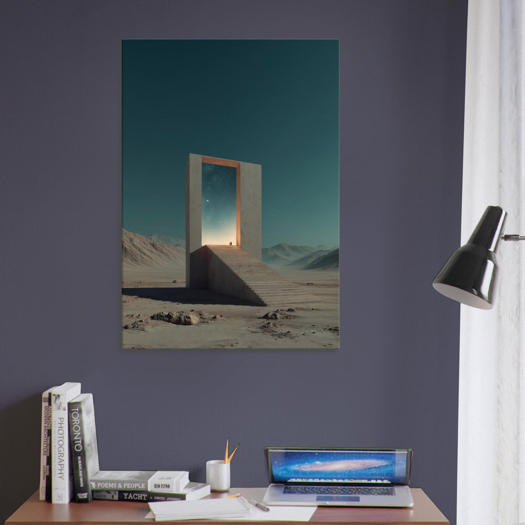 An endless staircase leads to a radiant doorway, framing a pale horizon where distant stars glow. This Athens inspired surreal scene invites quiet reflection, as if the city’s ancient light leans into a dream. A solitary gate stands in a barren expanse, its edges catching a warm, otherworldly glow and casting soft, meditative shadows. Hang this piece to bathe a living room or study in mythic calm and architectural poetry, elevating everyday moments with a sense of mystery and timeless possibility.
