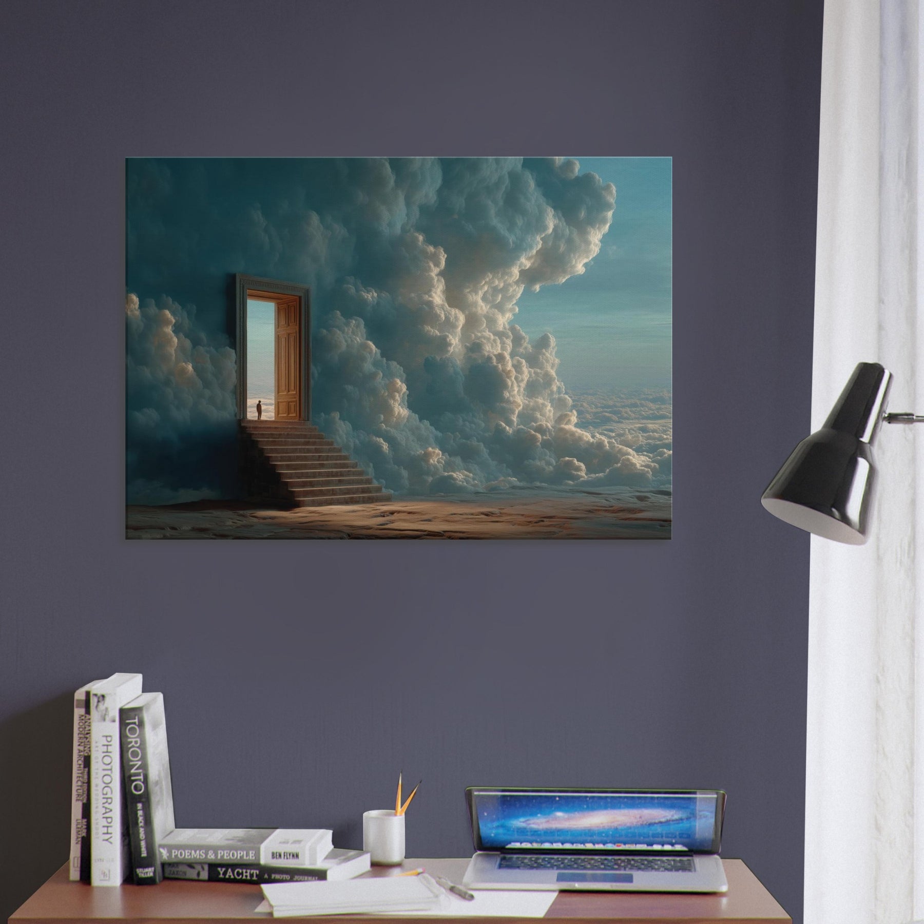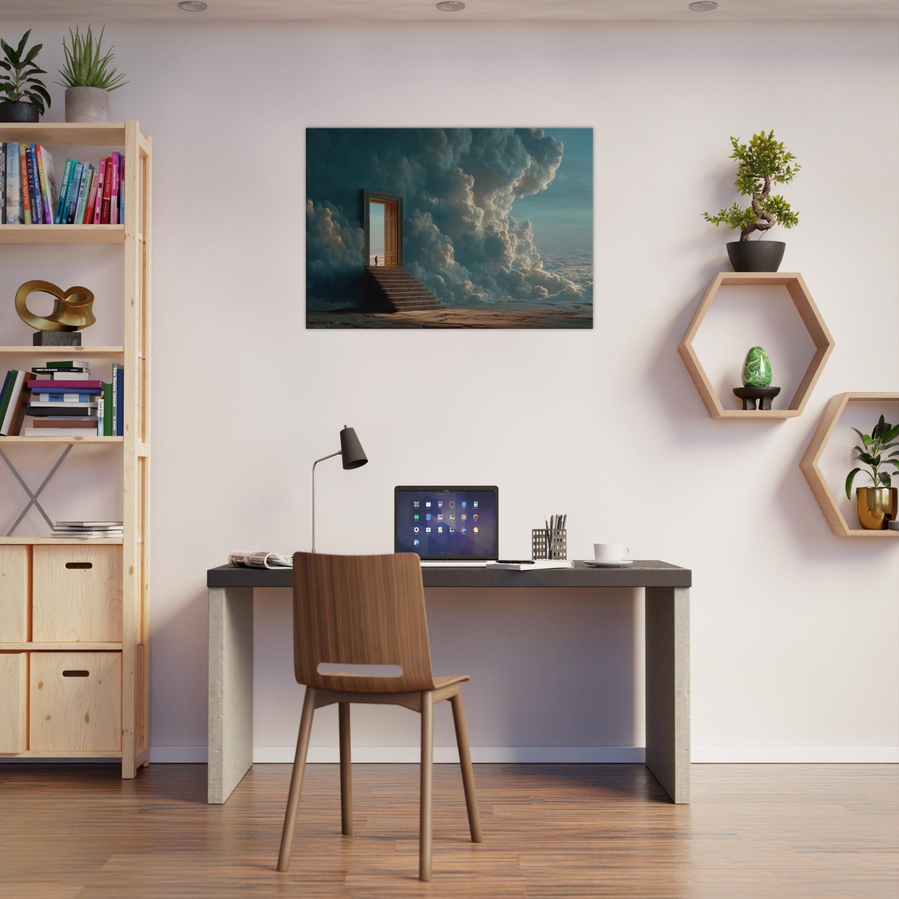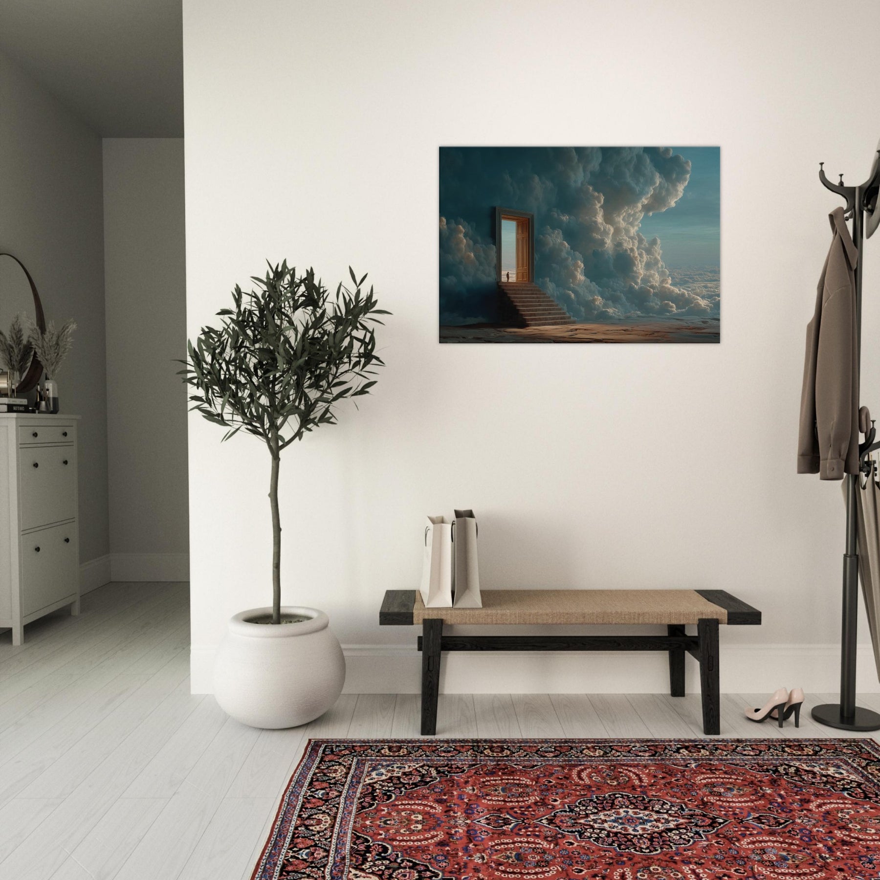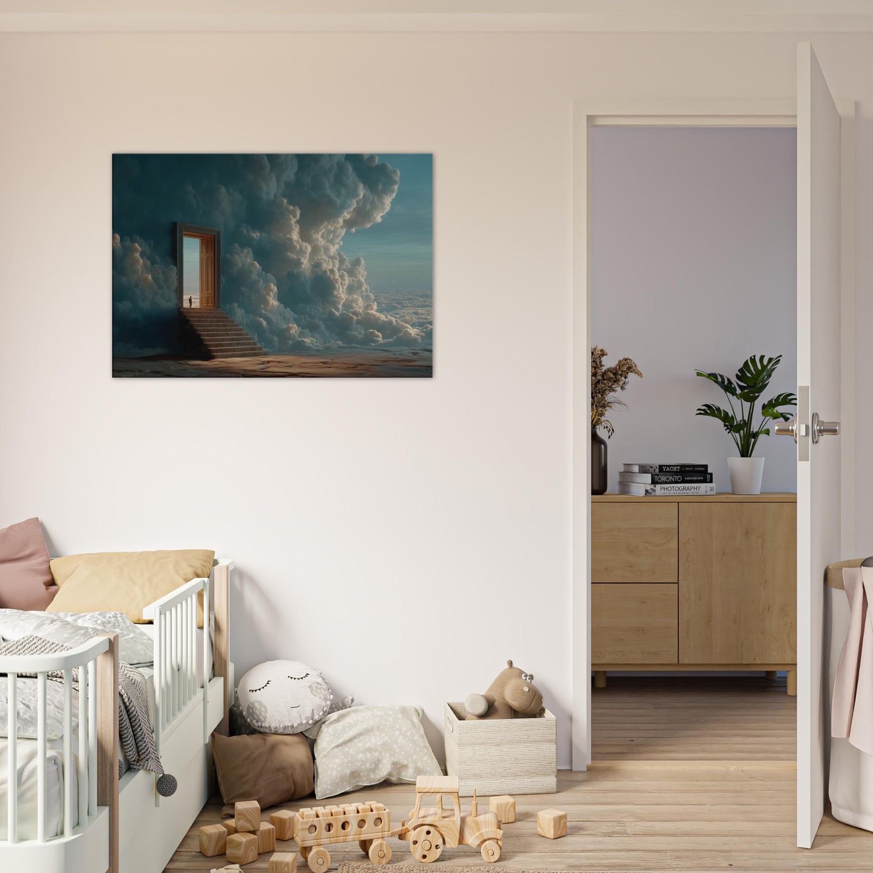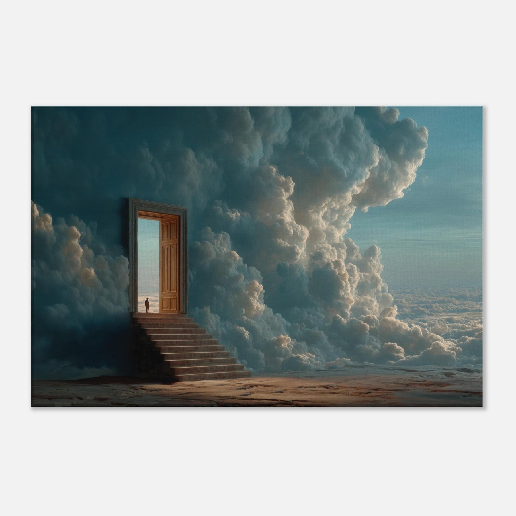 A dreamlike meditation on scale and memory, this surreal composition invites the eye to ascend a staircase toward a doorway that opens on Angkor Wat's timeless geometry, refracted through clouds. A solitary figure stands at the threshold as light spills through carved panels, turning stone into wind and rumor into color. The atmosphere mingles temple hush with cinematic vastness, transforming any living space into a corridor of possibility calm, curious, and endlessly inspiring.