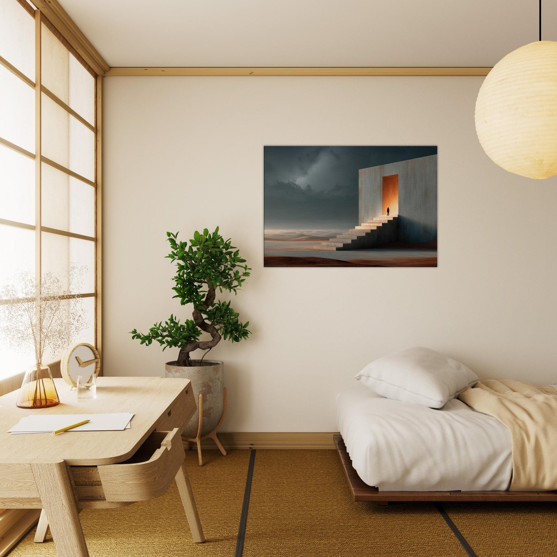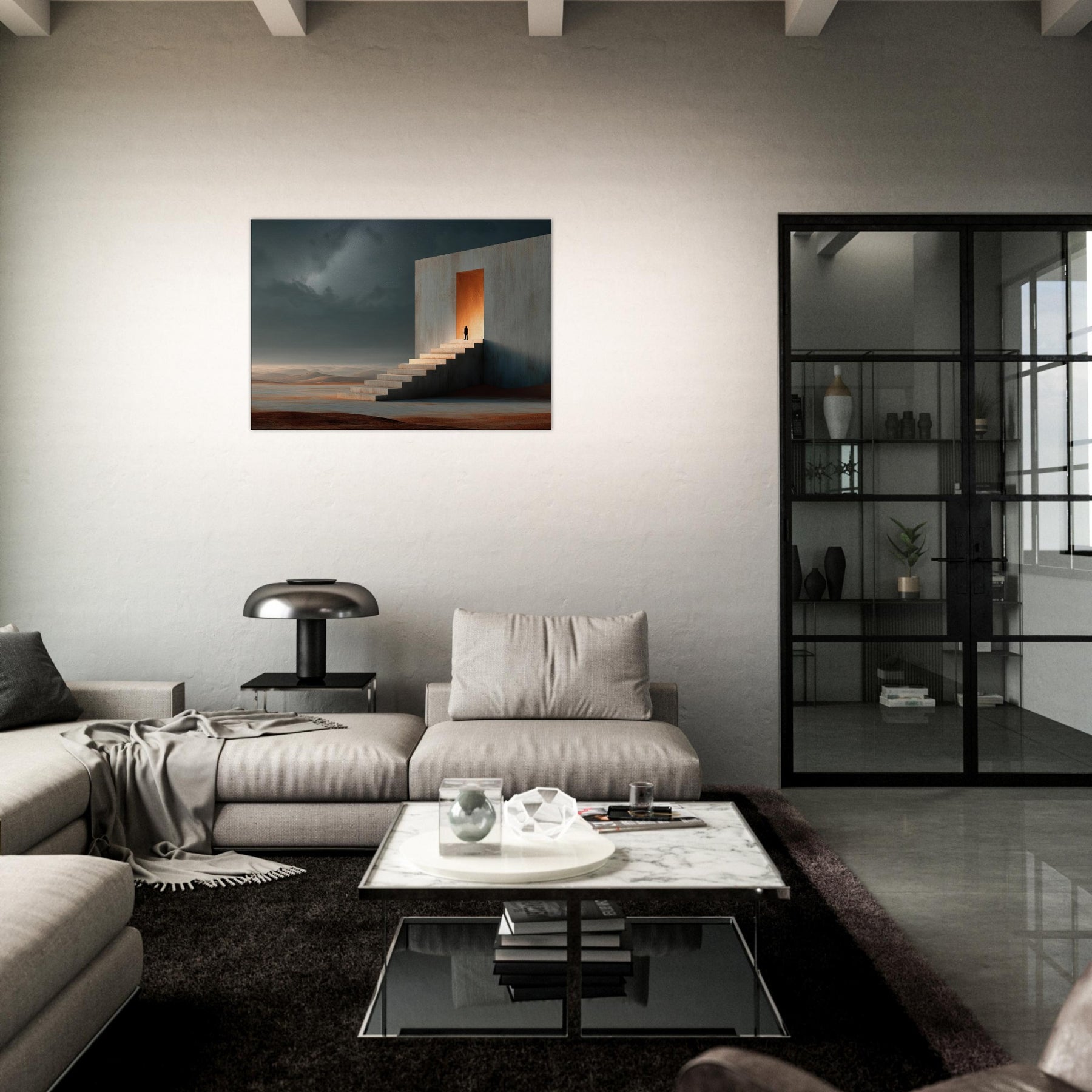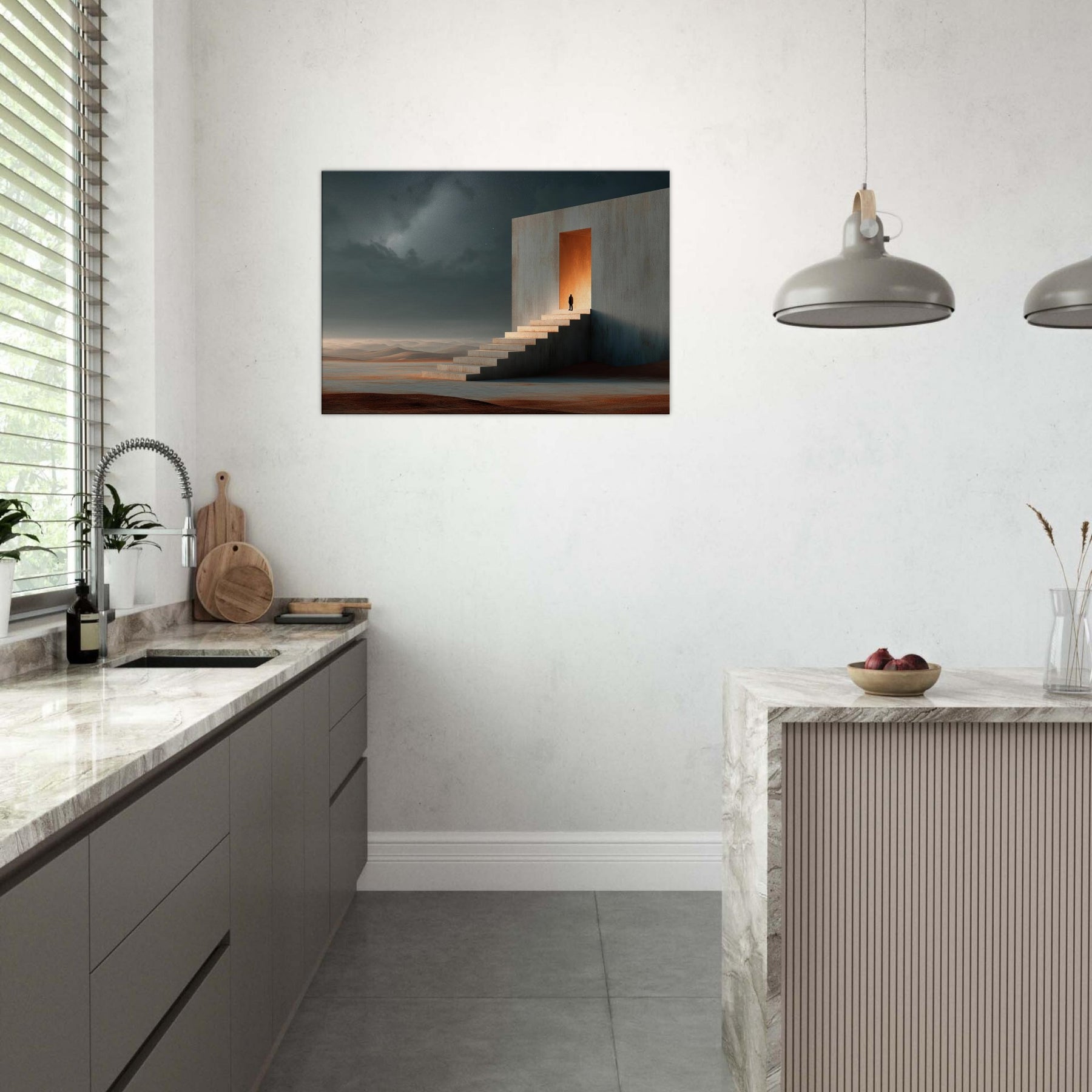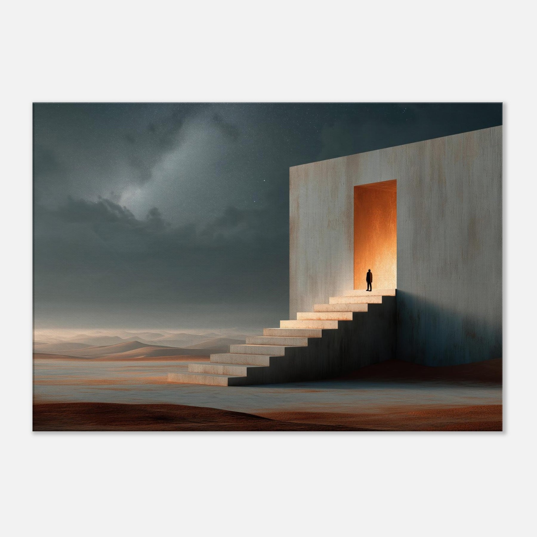 An architectural mirage unfolds where Athens meets a dreamlike desert. This surreal composition places a stark stairway ascending a monumental wall, lit from within by a warm halo that frames a solitary figure. The atmosphere hums with quiet mystery, as if the city’s ancient stone and modern rhythm have stepped into a distant horizon. Hang this piece to invite contemplation, soft golden light, and a sense of spacious, lived in wonder into your living space.