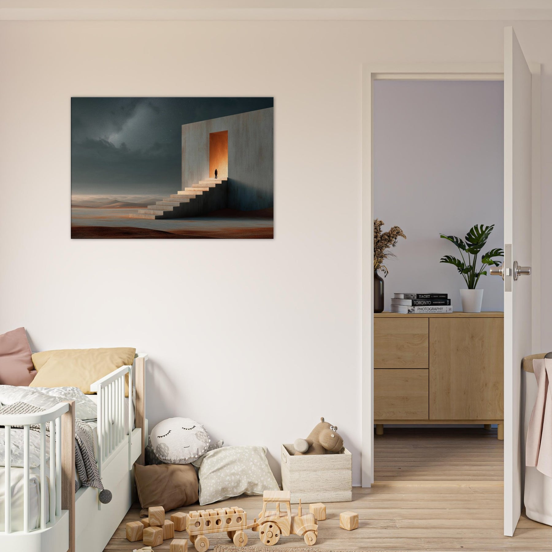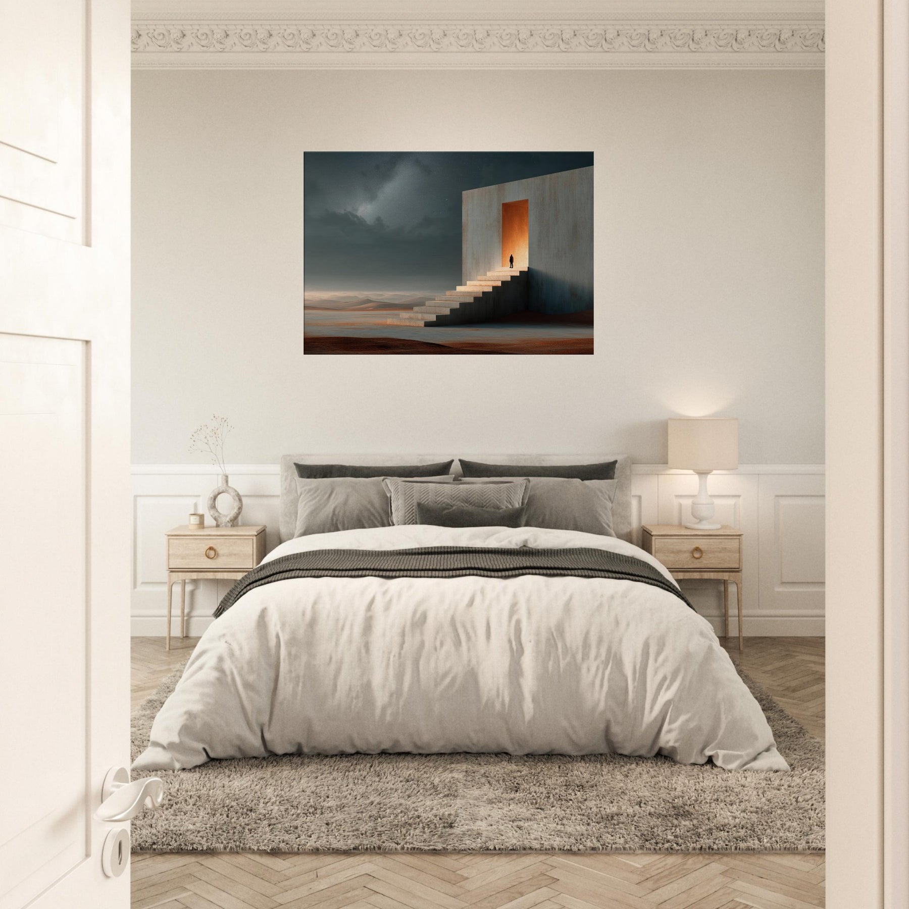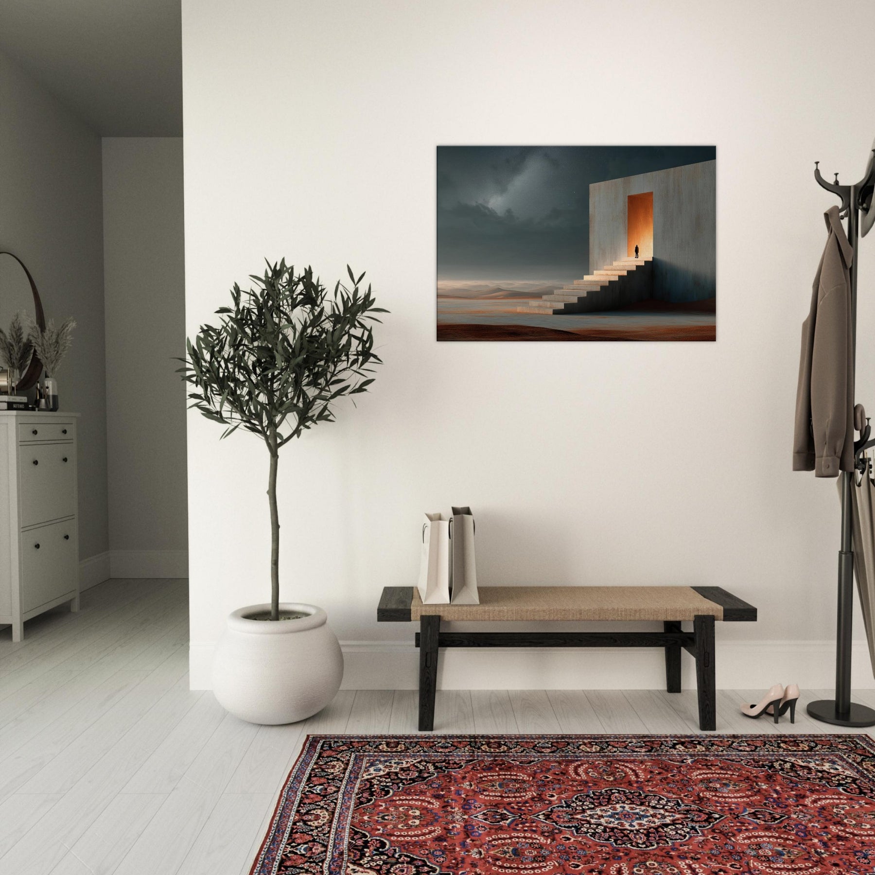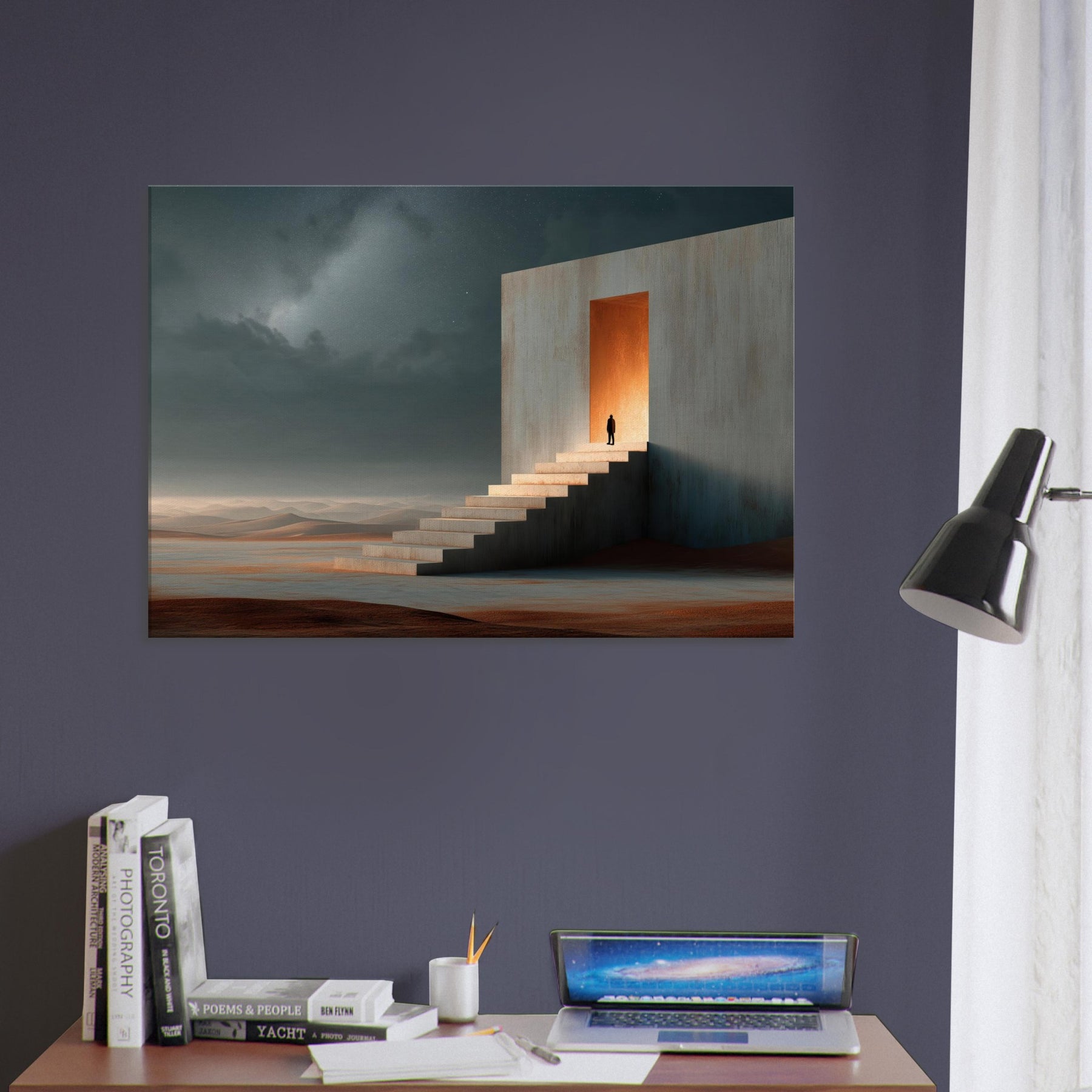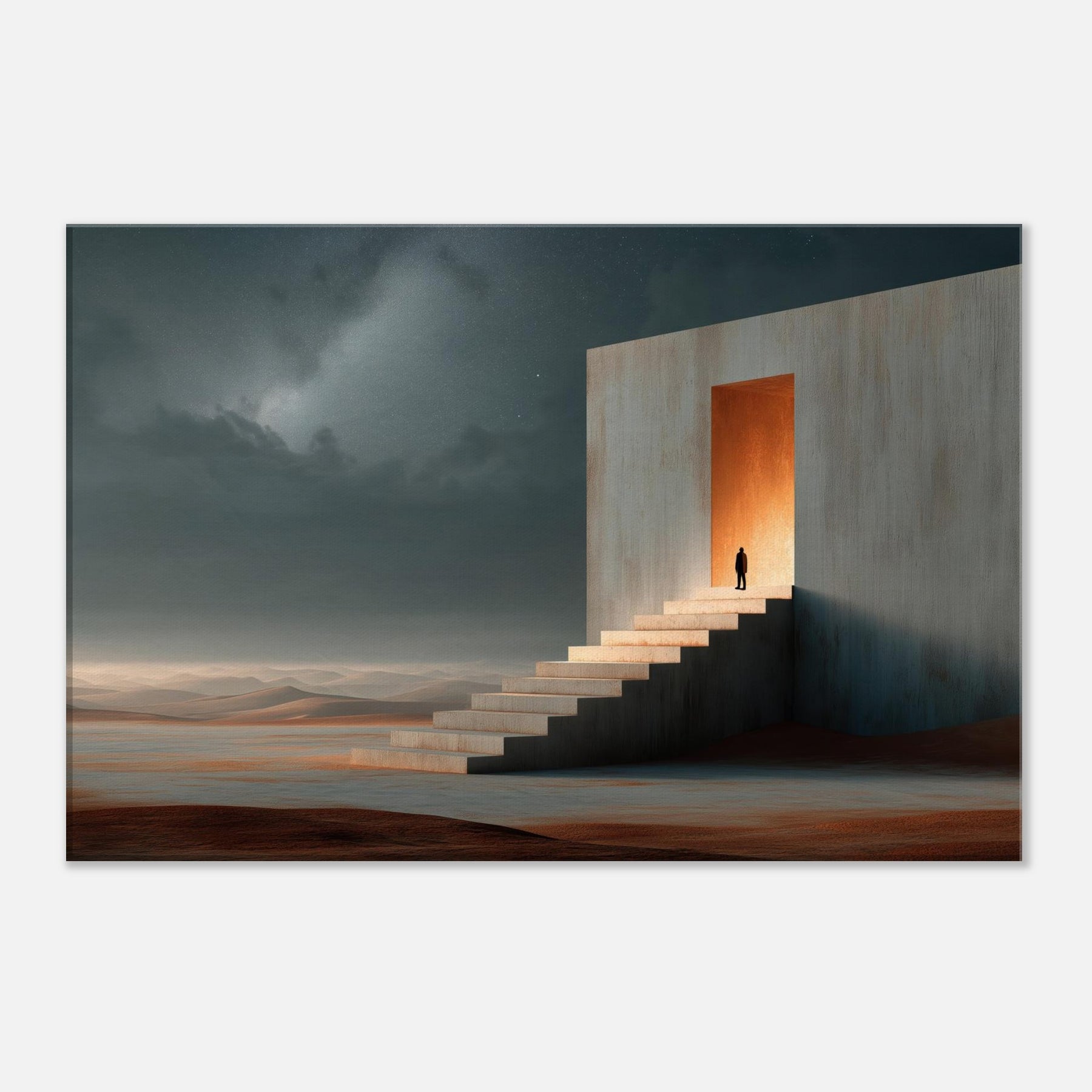 An architectural mirage unfolds where Athens meets a dreamlike desert. This surreal composition places a stark stairway ascending a monumental wall, lit from within by a warm halo that frames a solitary figure. The atmosphere hums with quiet mystery, as if the city’s ancient stone and modern rhythm have stepped into a distant horizon. Hang this piece to invite contemplation, soft golden light, and a sense of spacious, lived in wonder into your living space.