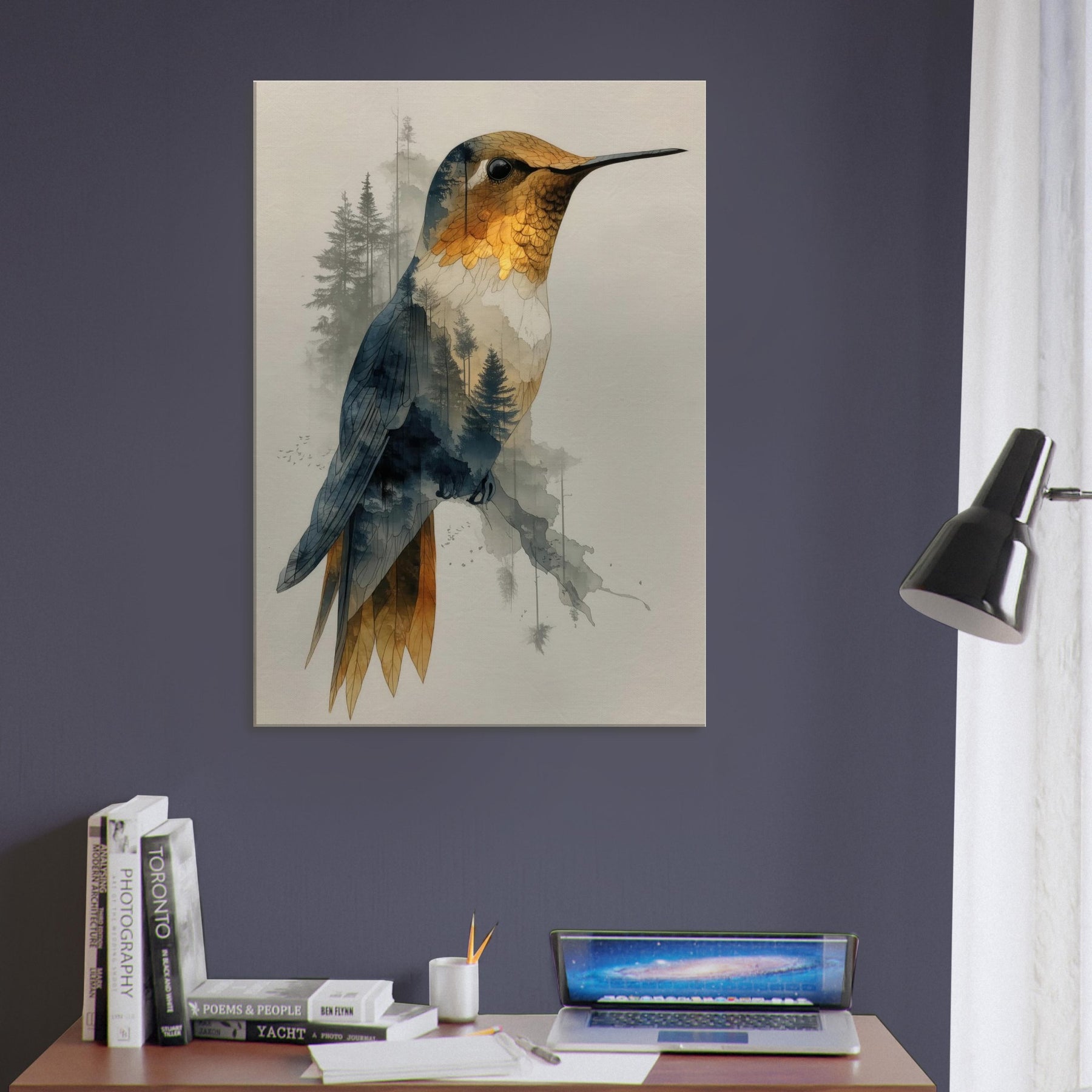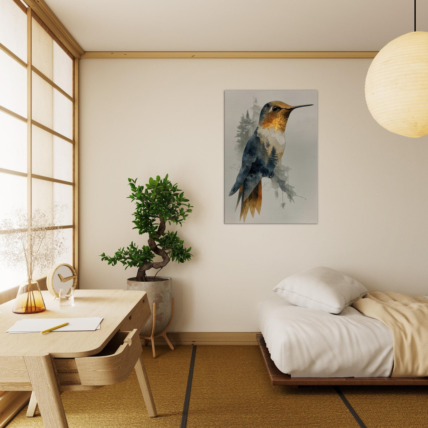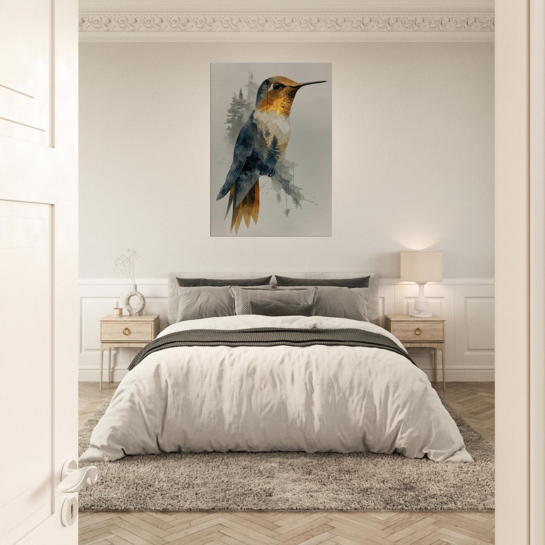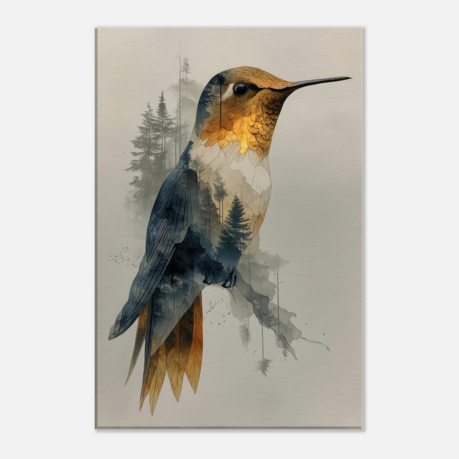 Let the Hummingbird hover between waking nature and a dream you can hang on your wall. This surreal composition layers a delicate avian form over a forest of slender trees, creating a gentle double exposure that feels both intimate and expansive. The piece exhales calm through soft gradients of gold, blue, and charcoal, inviting quiet contemplation in any living space. Hang it in a lounge or bedroom to evoke movement, wonder, and a contemplative stillness that elevates every moment.