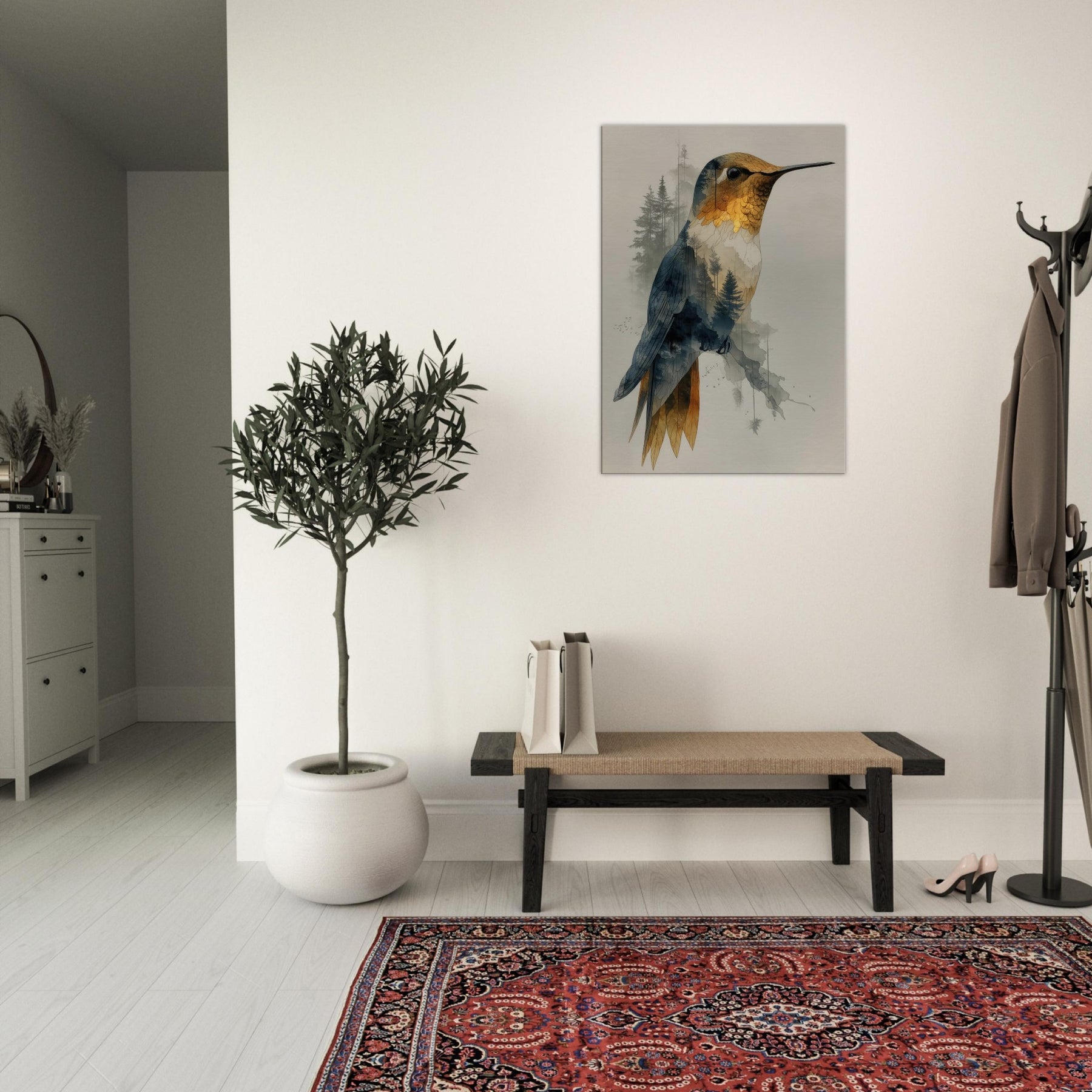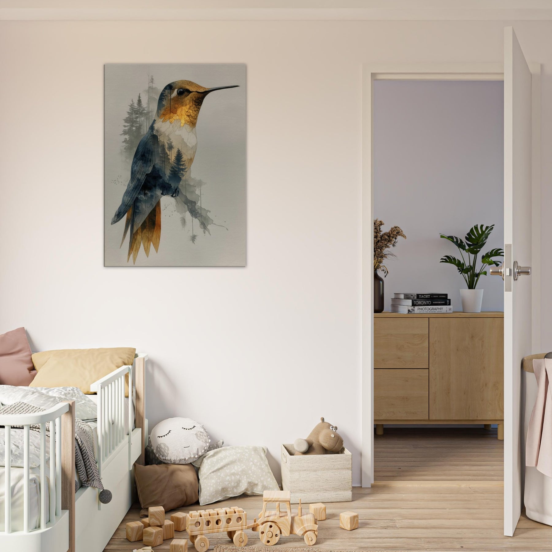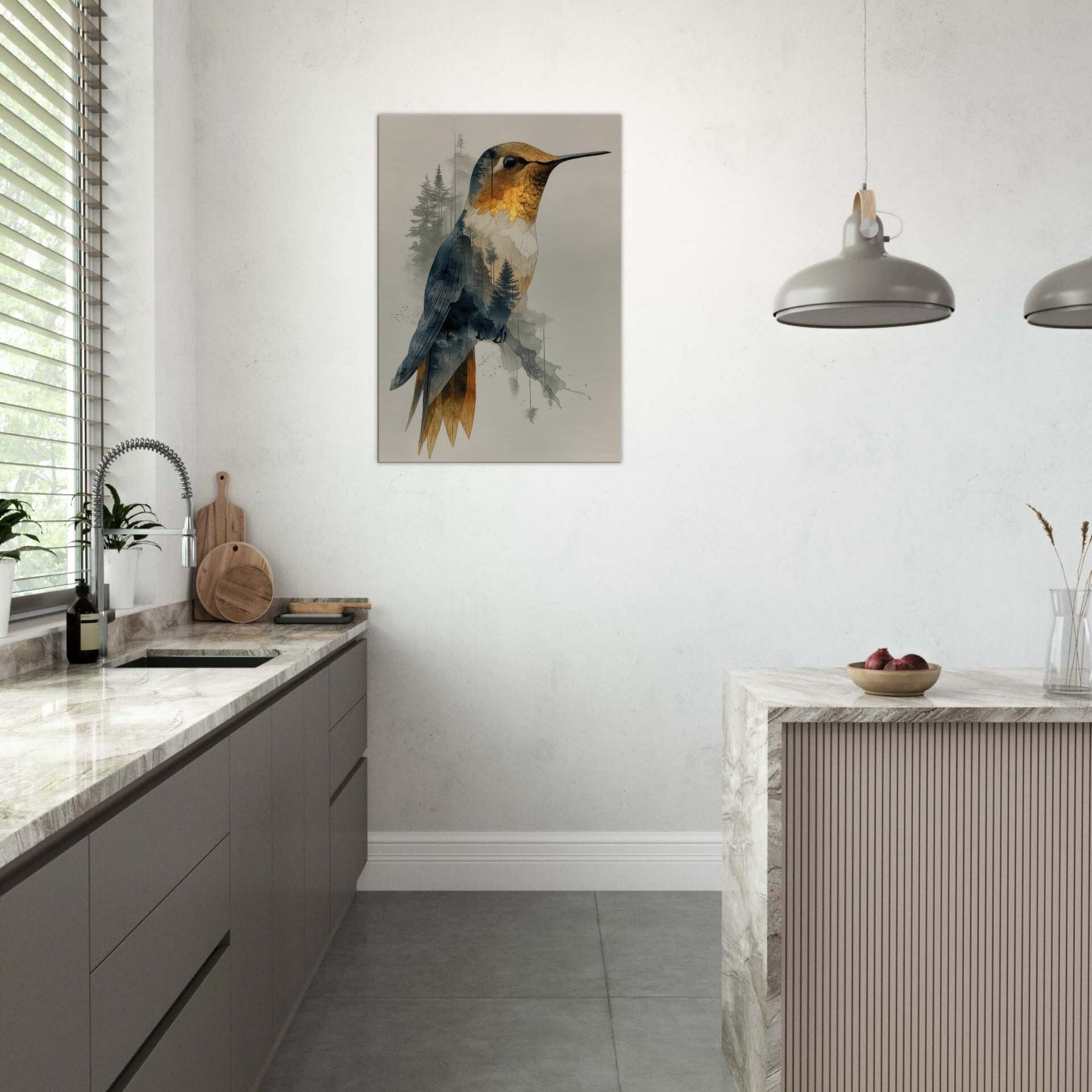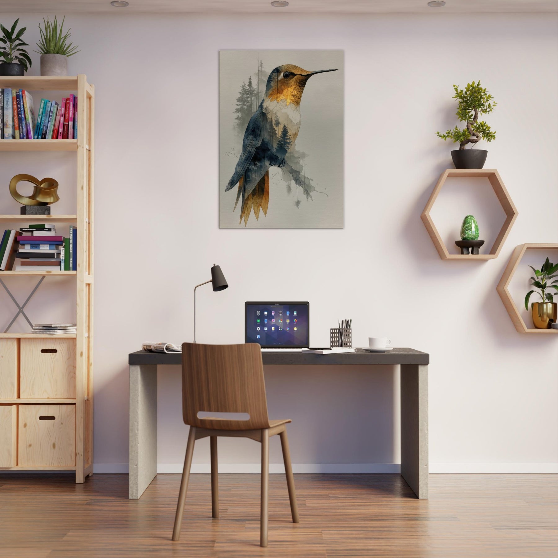 Let the Hummingbird hover between waking nature and a dream you can hang on your wall. This surreal composition layers a delicate avian form over a forest of slender trees, creating a gentle double exposure that feels both intimate and expansive. The piece exhales calm through soft gradients of gold, blue, and charcoal, inviting quiet contemplation in any living space. Hang it in a lounge or bedroom to evoke movement, wonder, and a contemplative stillness that elevates every moment.