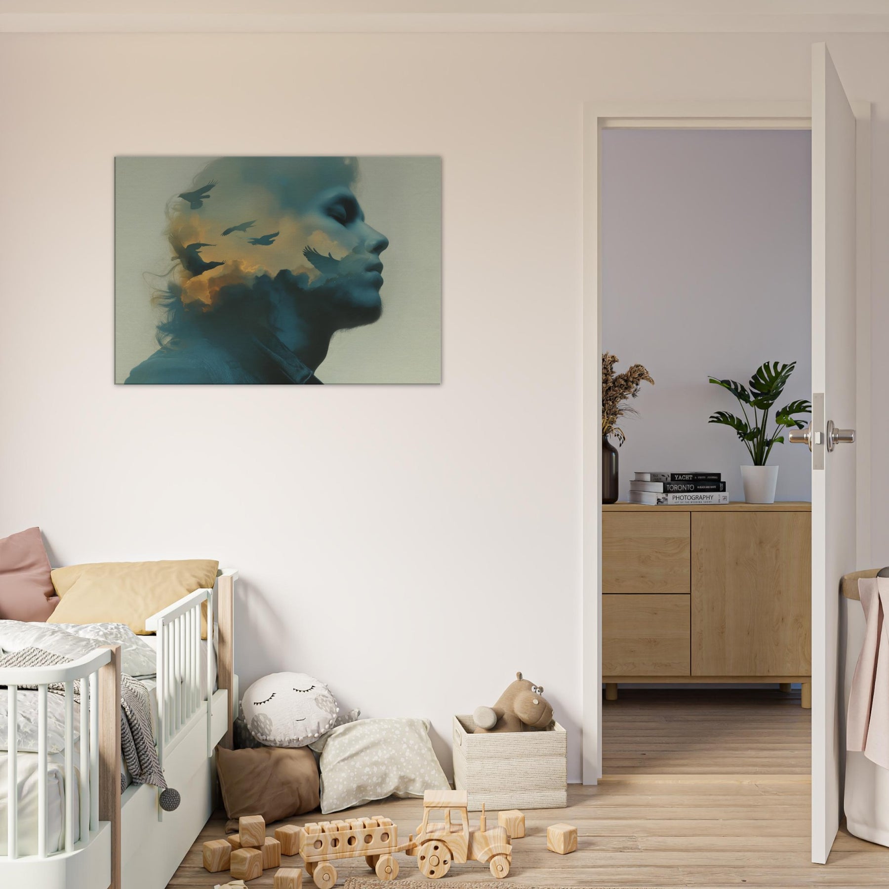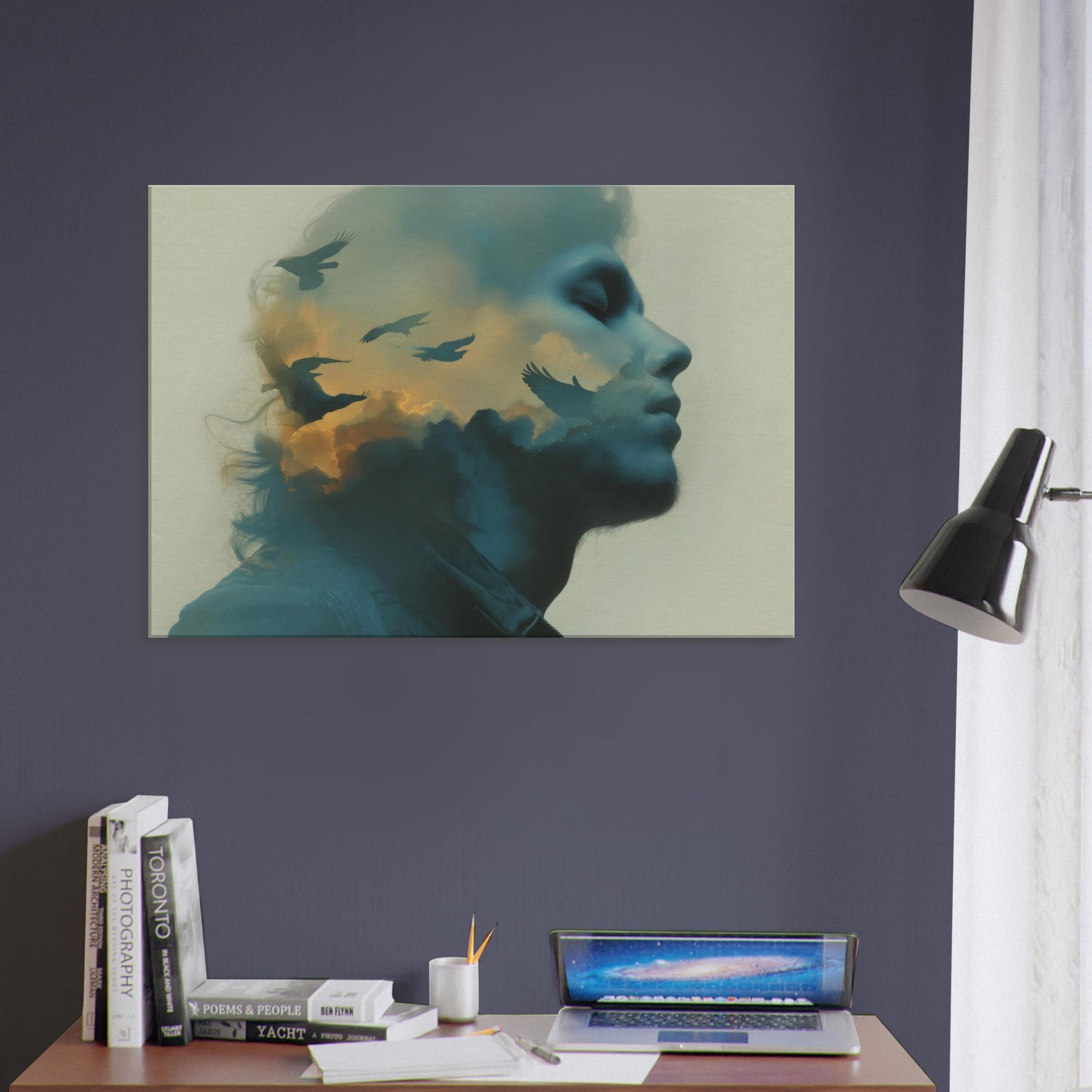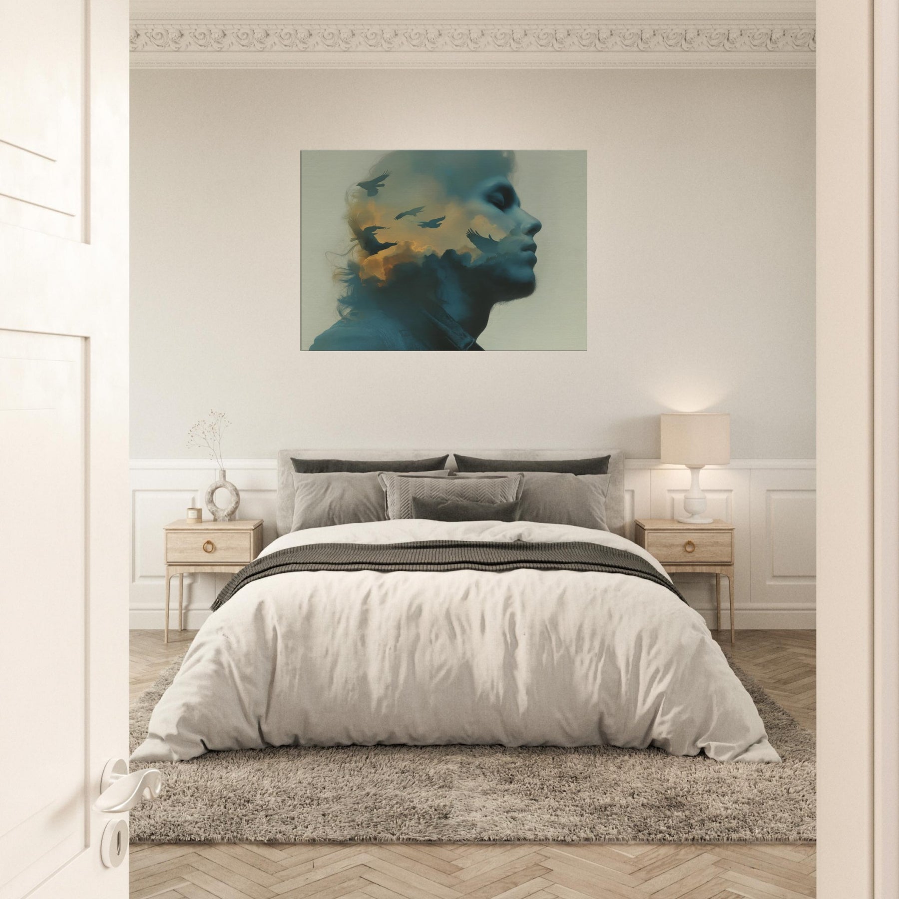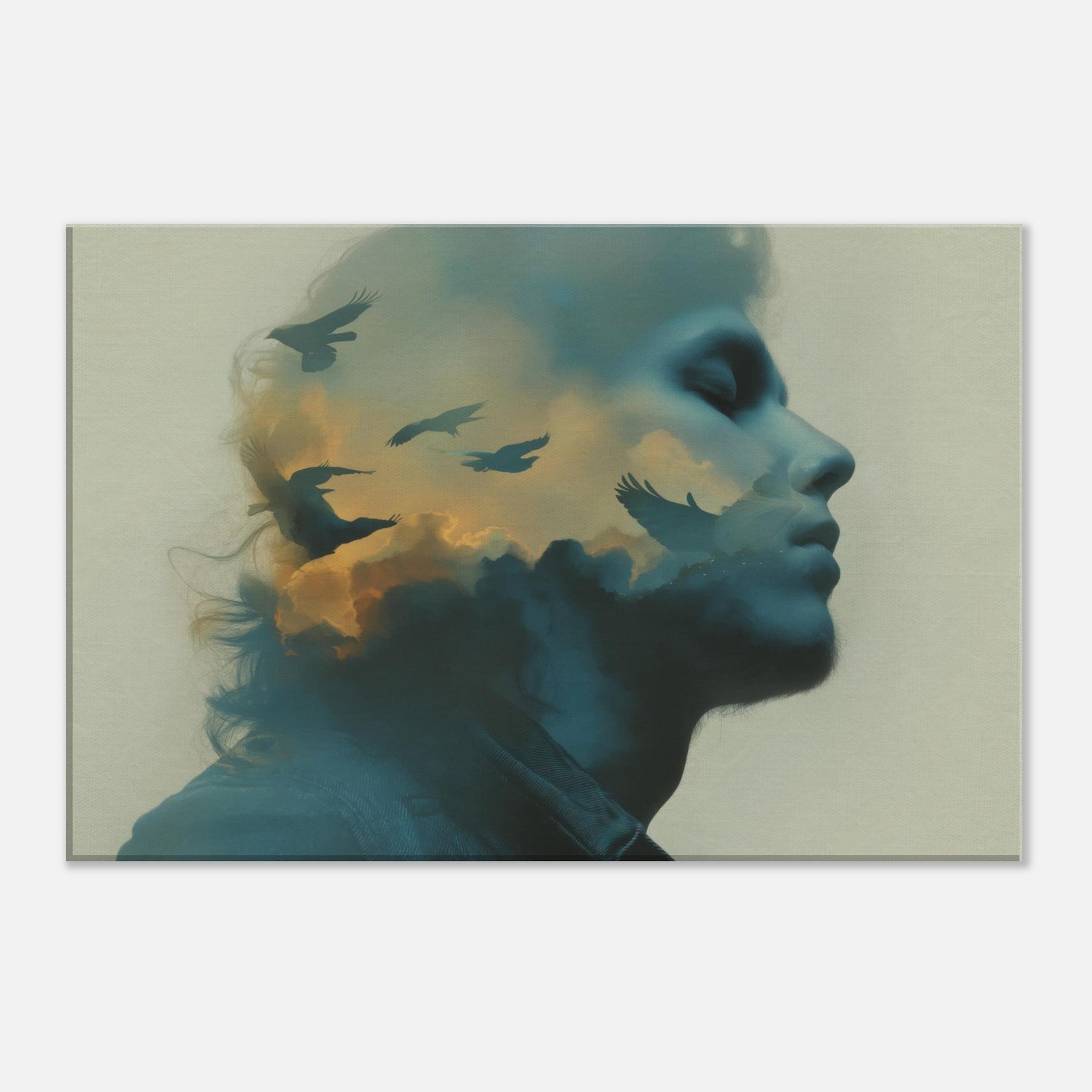 Floating between silhouette and sky, this work layers the intimate of a Guitarist with sweeping clouds and flocking birds. The double exposure composition bends time, turning melody into wind, memory into color. Soft teal and sunset gold drift across the face, inviting quiet reflection and imaginative space. Hang it in your living room or studio to whisper a dreamlike mood, encouraging conversation, creativity, and a serene focus for everyday moments.