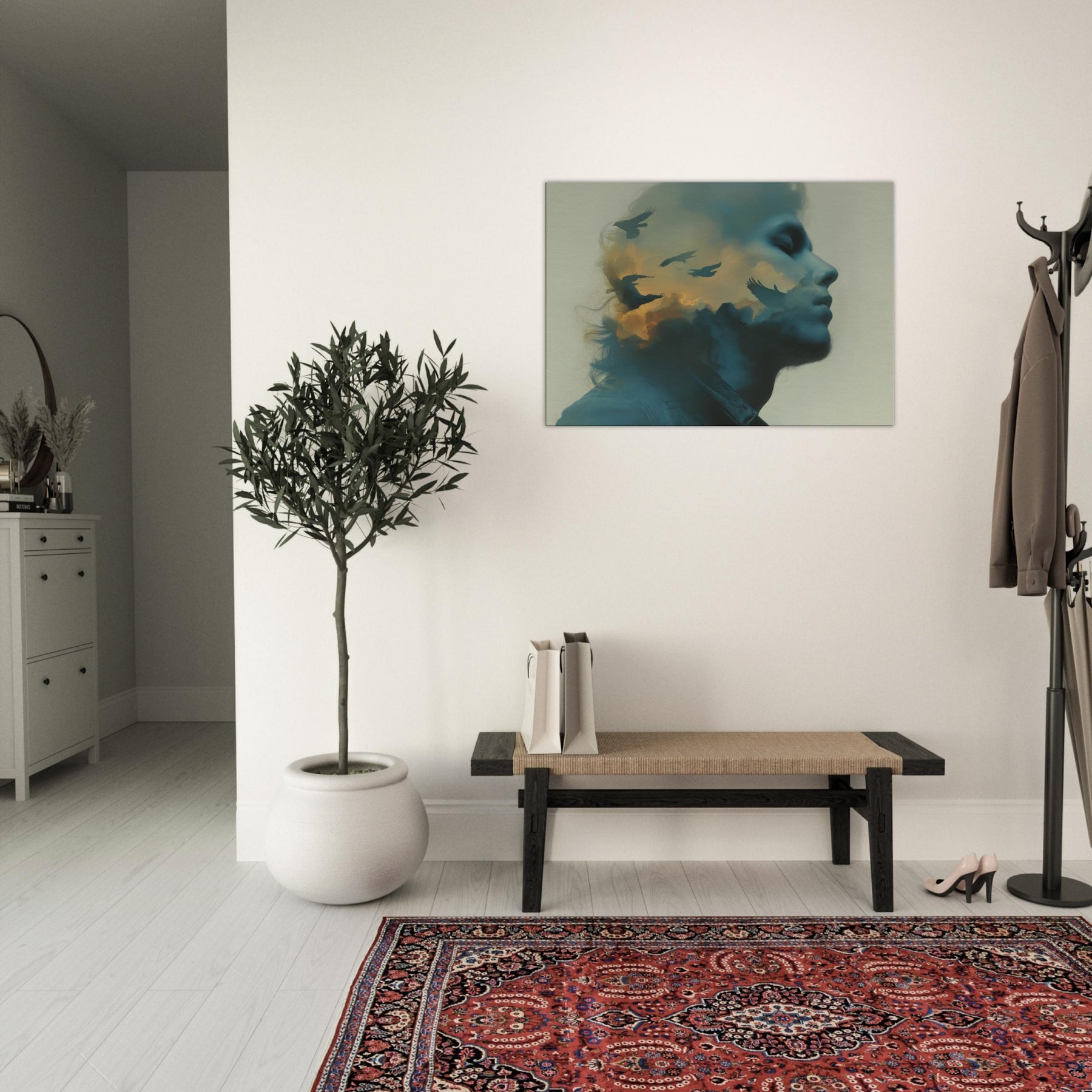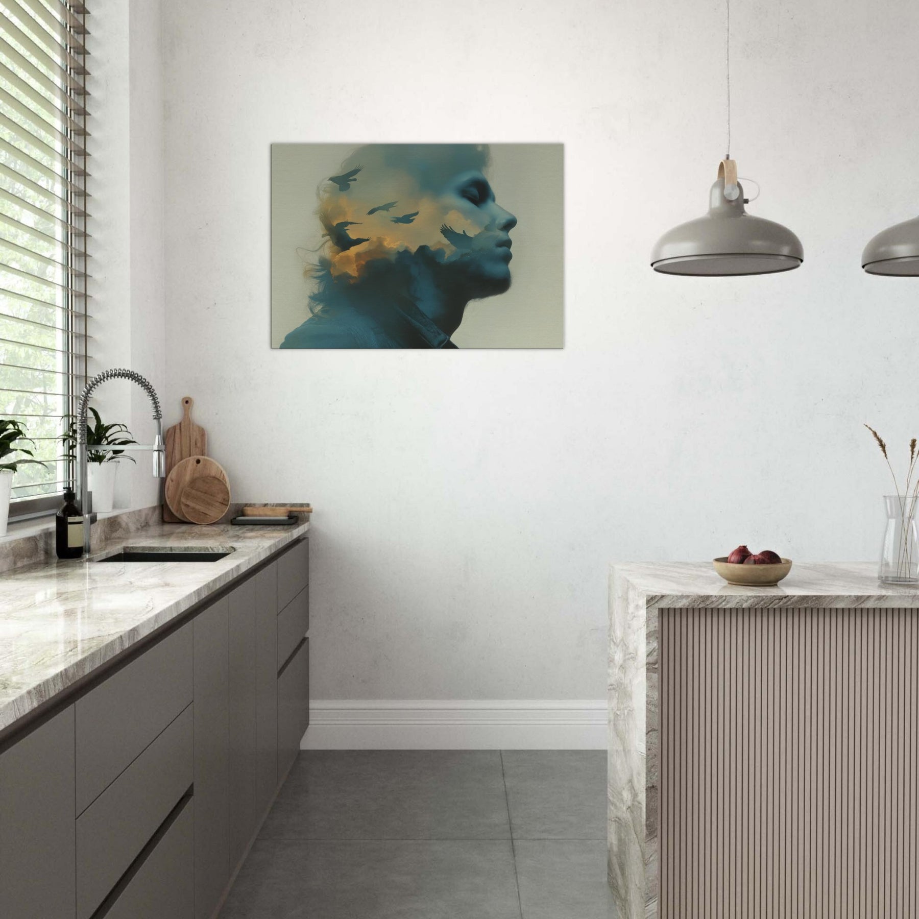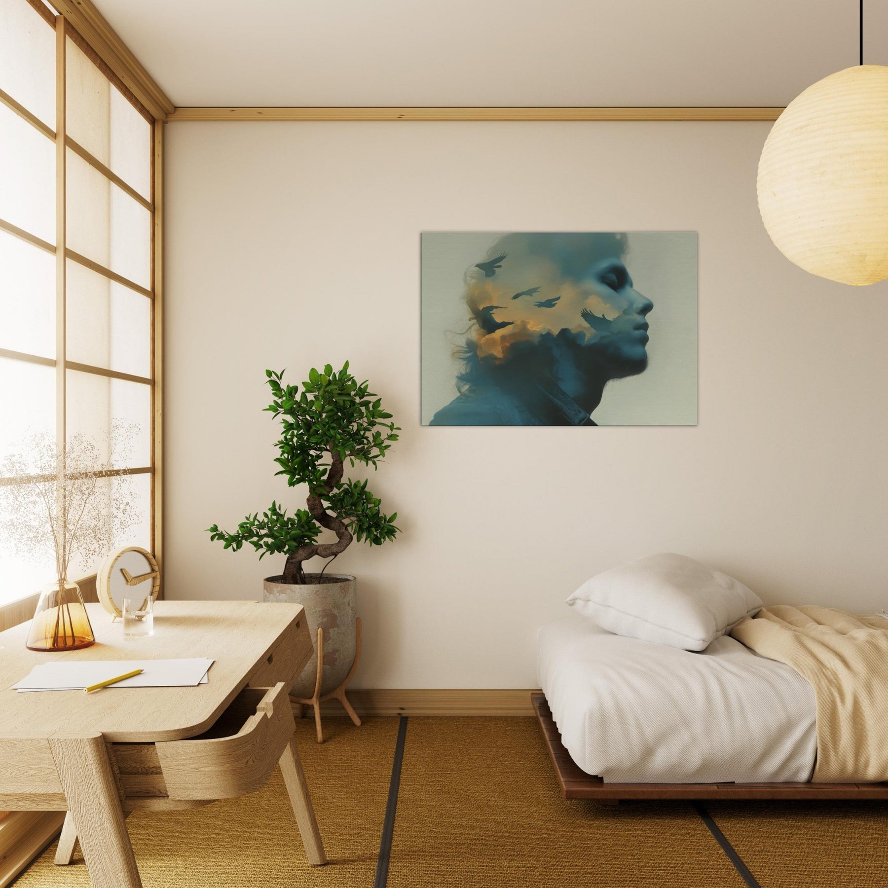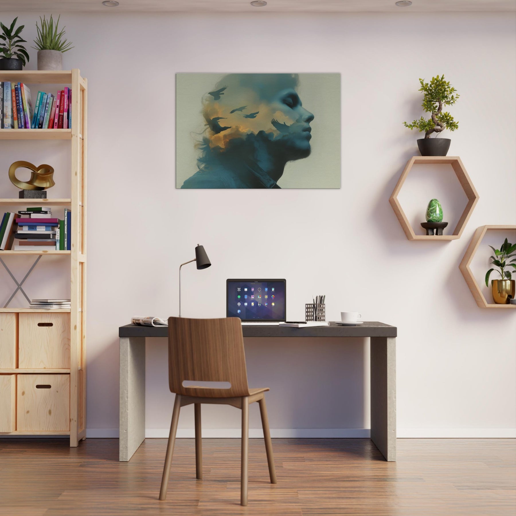 Floating between silhouette and sky, this work layers the intimate of a Guitarist with sweeping clouds and flocking birds. The double exposure composition bends time, turning melody into wind, memory into color. Soft teal and sunset gold drift across the face, inviting quiet reflection and imaginative space. Hang it in your living room or studio to whisper a dreamlike mood, encouraging conversation, creativity, and a serene focus for everyday moments.