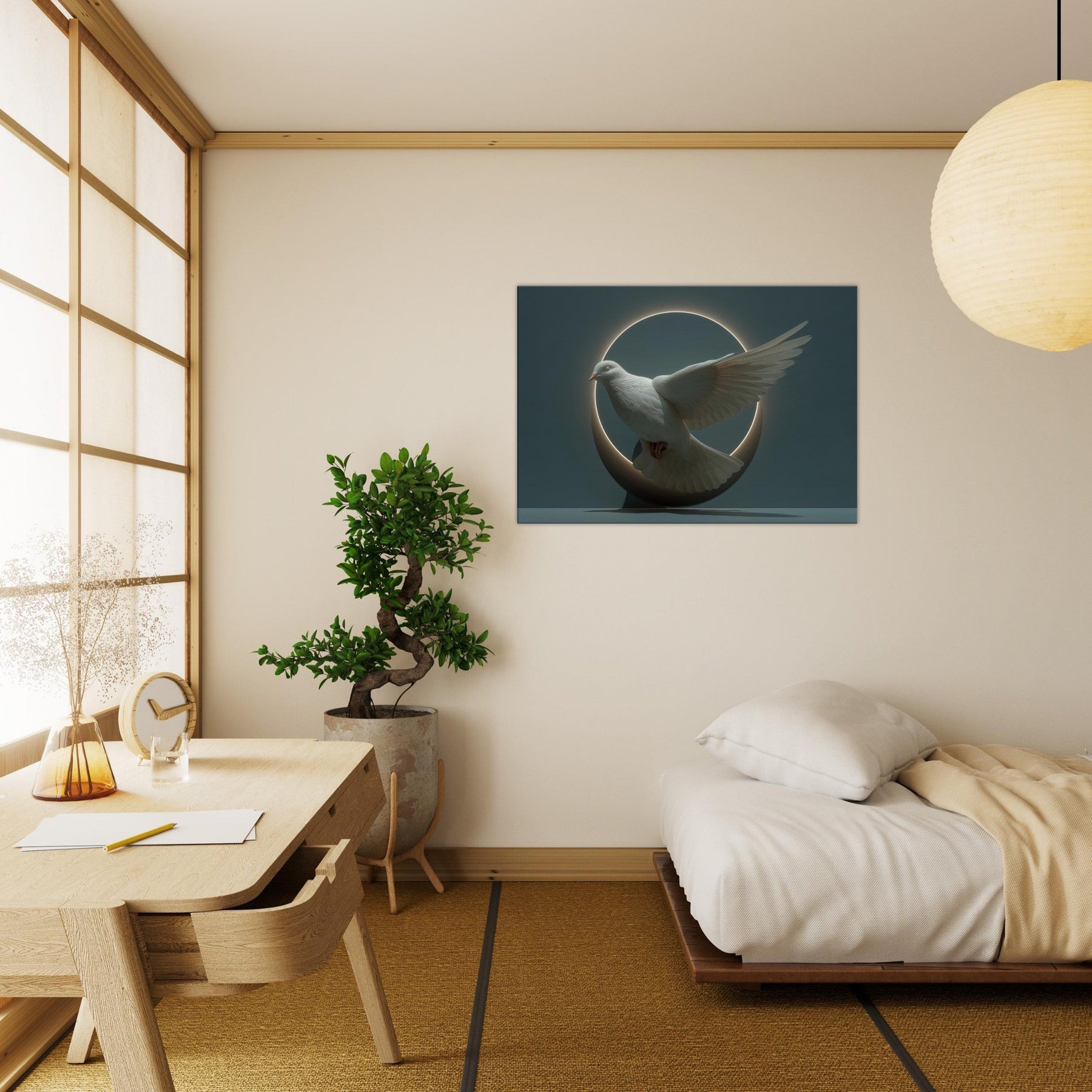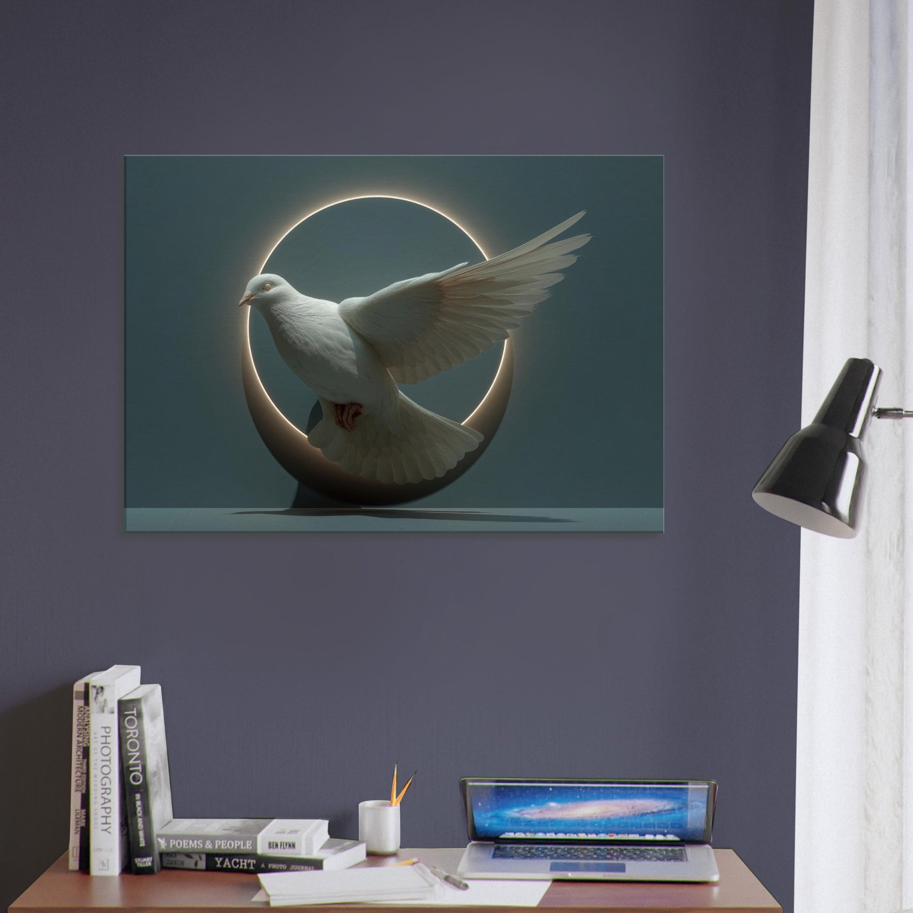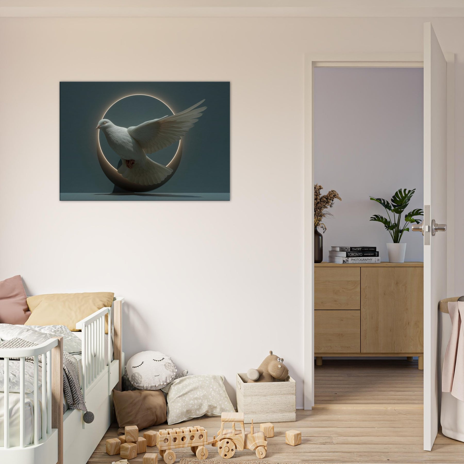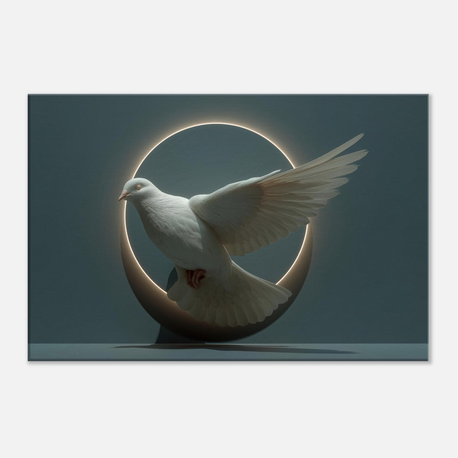 Immersed in moonlit stillness, this surreal composition elevates the Dove of Peace into a delicate orbit of light and shadow. A glowing circle cradles the bird, its wings spread in suspended grace, as if time itself paused to listen. The soft halo, velvet shadows, and muted tones invite quiet reflection, turning a room into a sanctuary where calm and wonder mingle. Perfect for a living space seeking gentleness, hope, and a touch of mystical poetry, it pairs beautifully with neutral palettes or deep, contemplative hues.