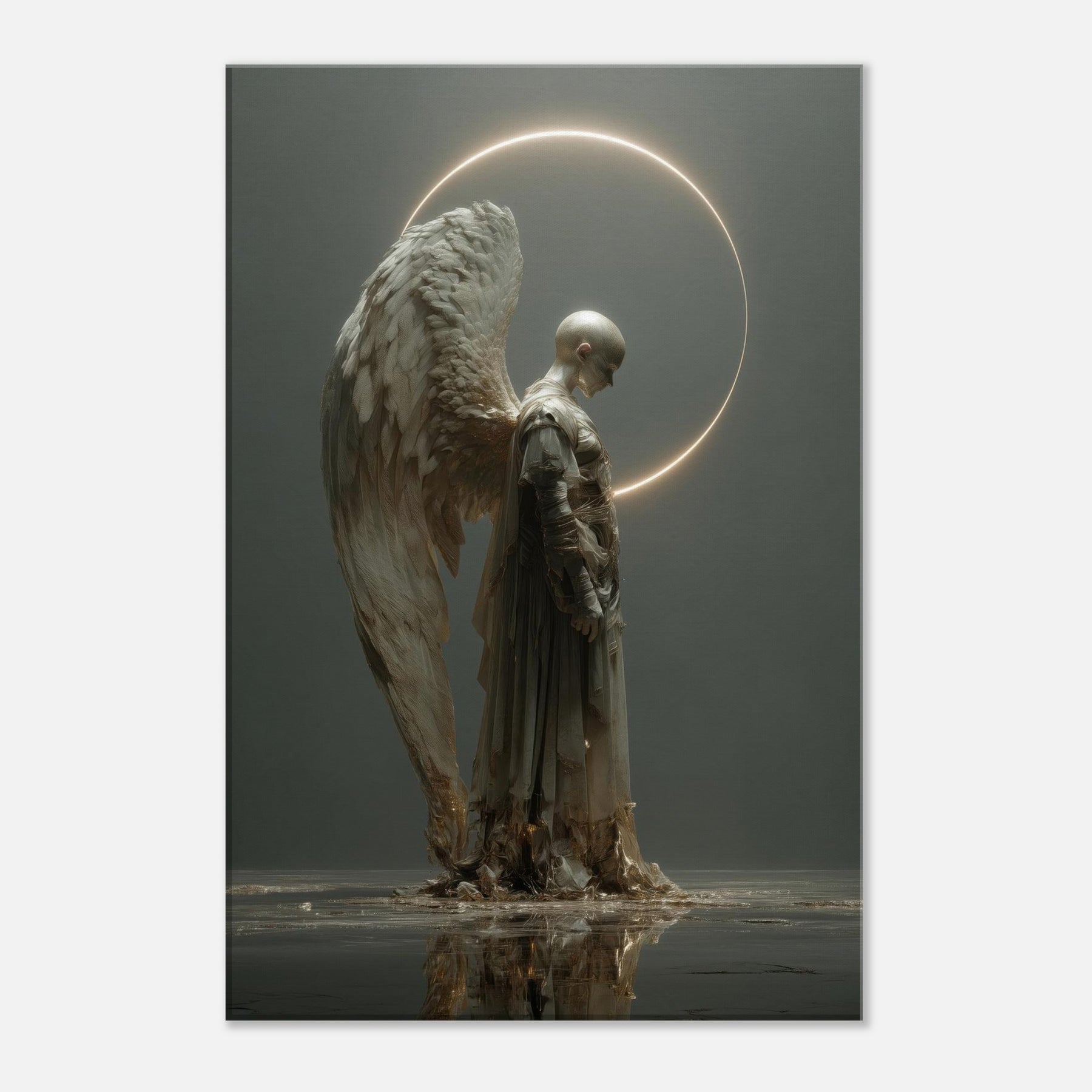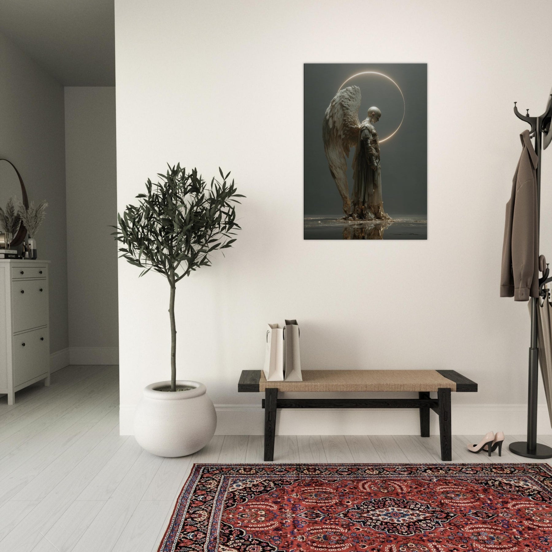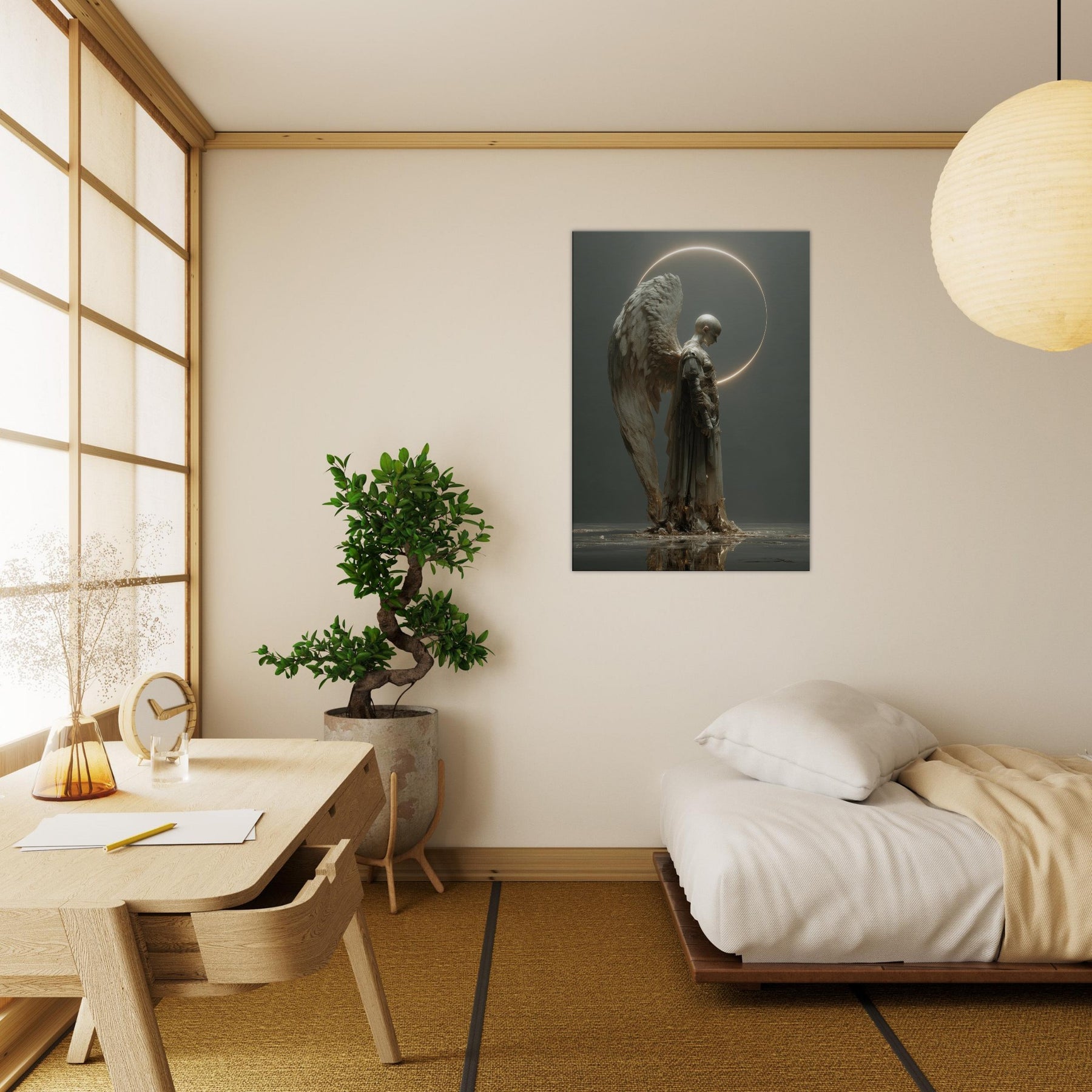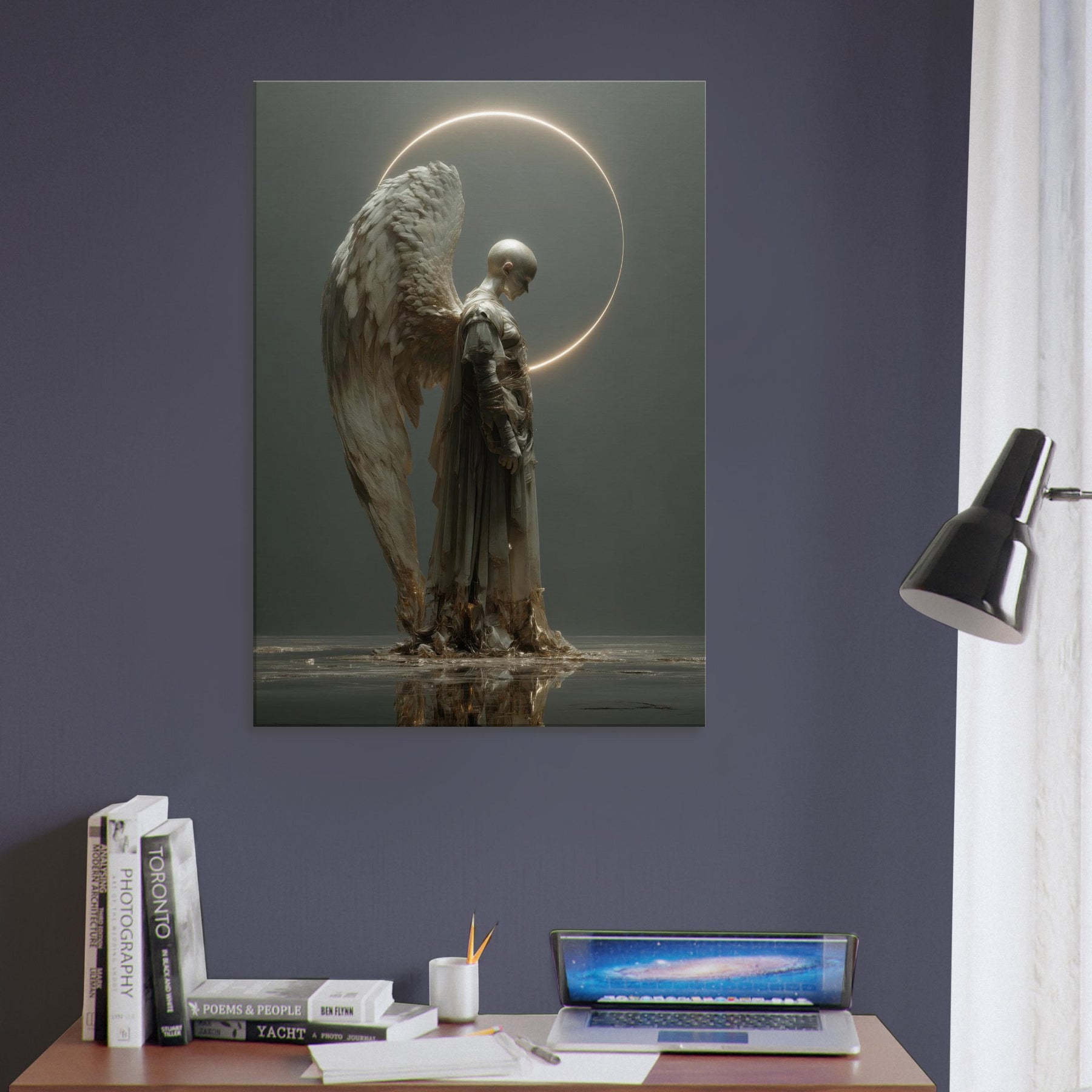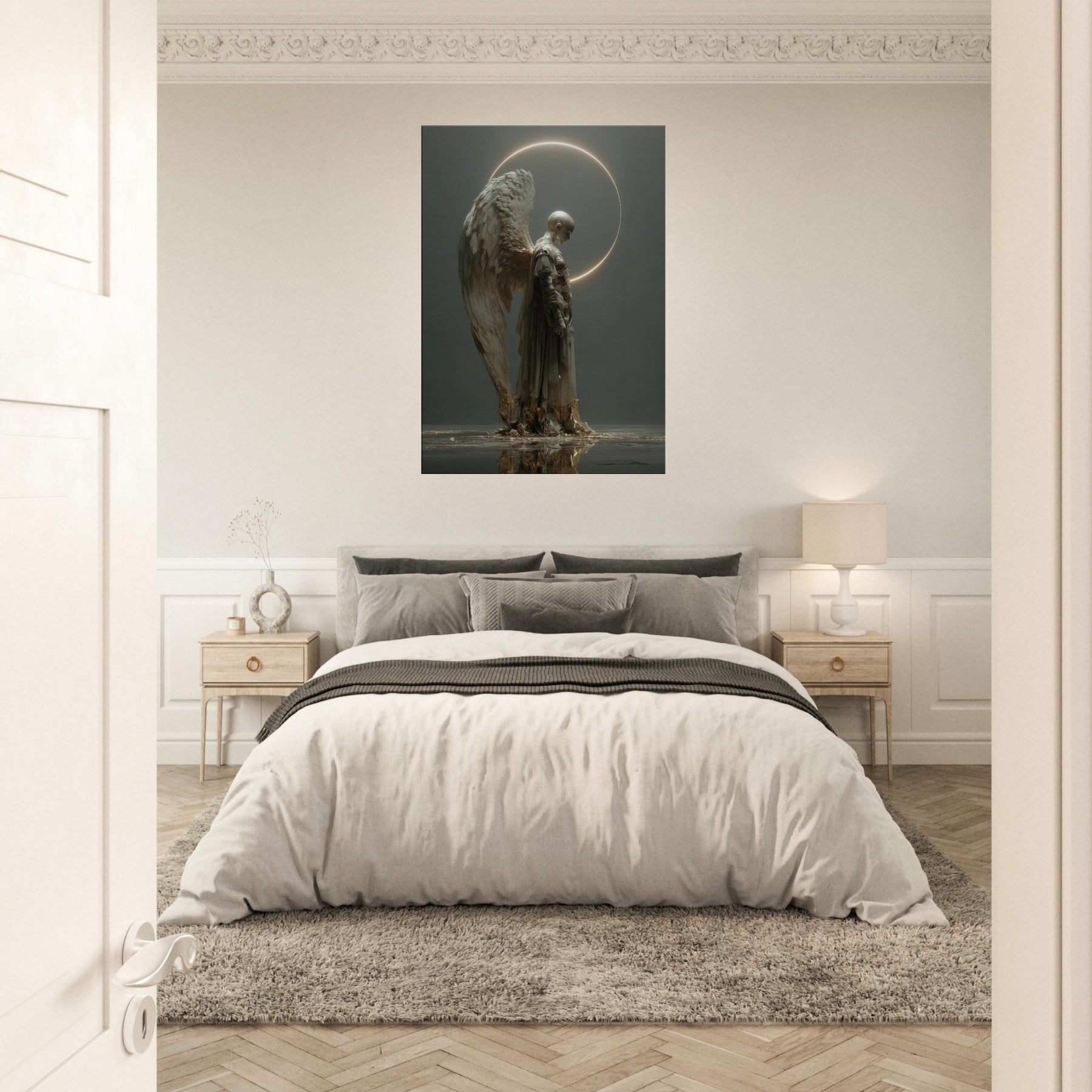 Immersed in a soft, otherworldly glow, this work centers on the Guardian Angel Wings, a serene figure rendered in dreamlike, sculptural tones. A halo of light circles the head, while a weathered robe and delicate feathers evoke both protection and quiet sorrow. The atmosphere is contemplative, inviting slow breaths and mindful pauses, as if the room itself became a sanctuary. Hang it in a living space to deepen texture, warmth, and mystery a luminous conversation between memory and possibility.