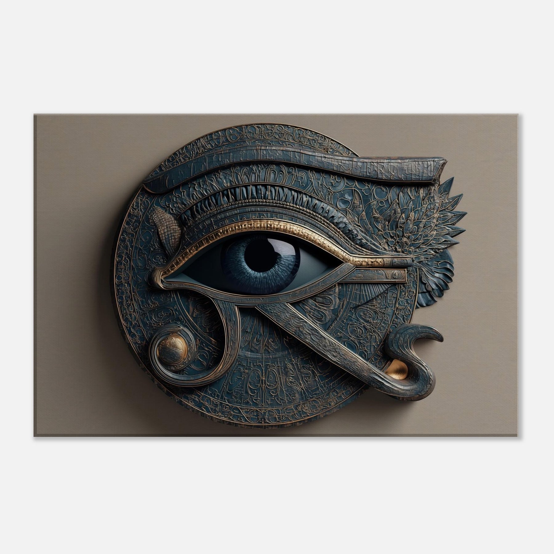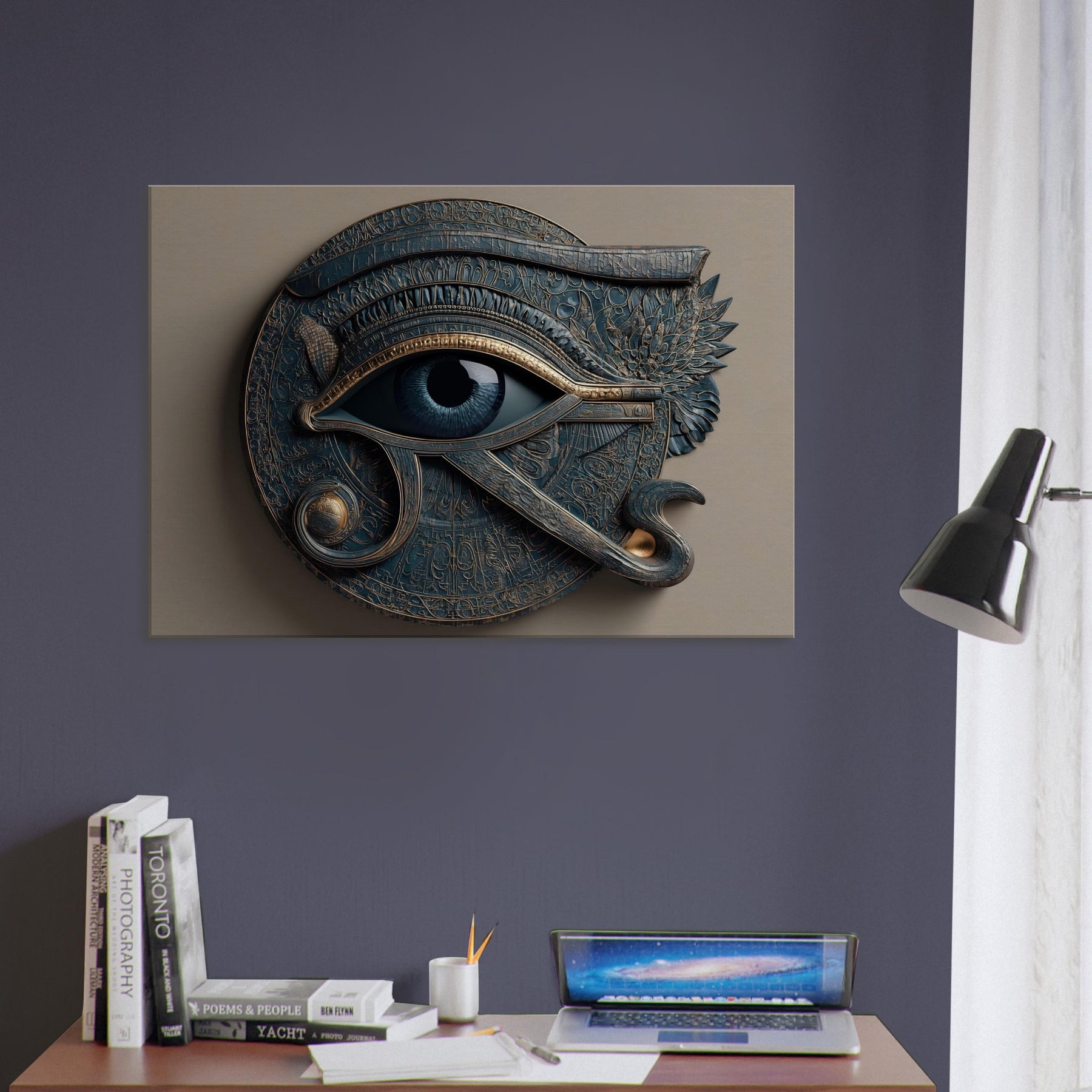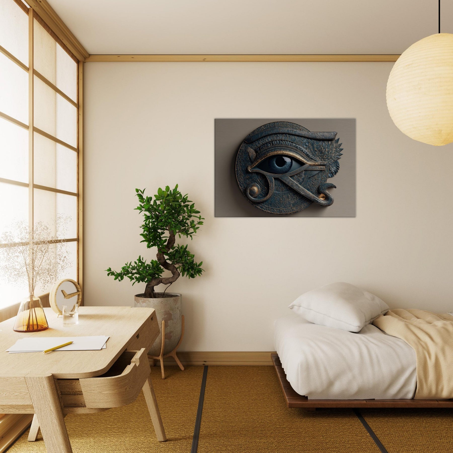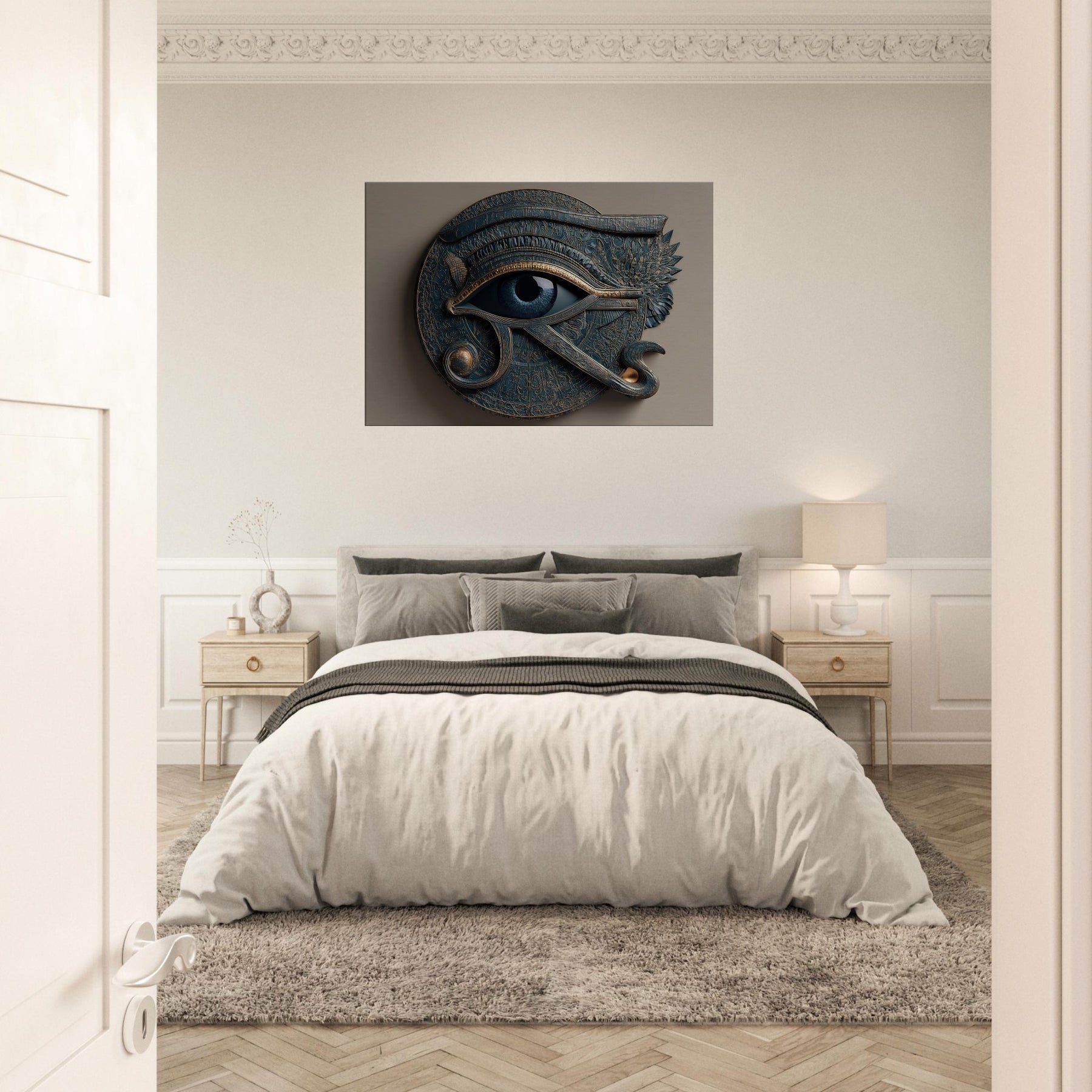 Suspended in a whispered alloy, this surreal wall sculpture layers the Eye of Horus within a circular, cryptic mandala. The etched patterns glimmer with antique gold, while a deep aquamarine and steel surface evokes a nocturnal sea. The piece invites contemplation, turning a bare wall into a portal for memory and dream. It anchors a living space with protection, mystery, and a calm, meditative rhythm.
