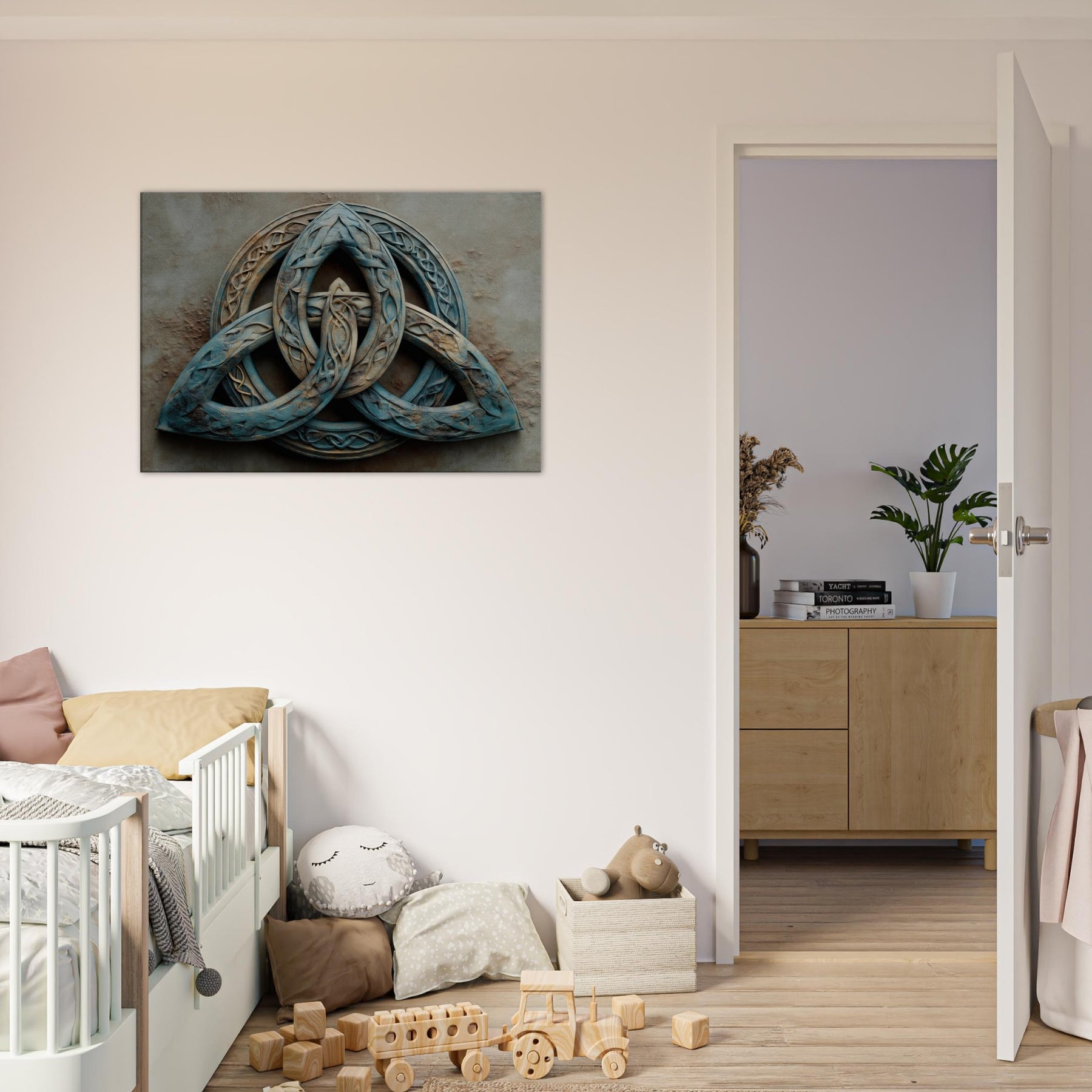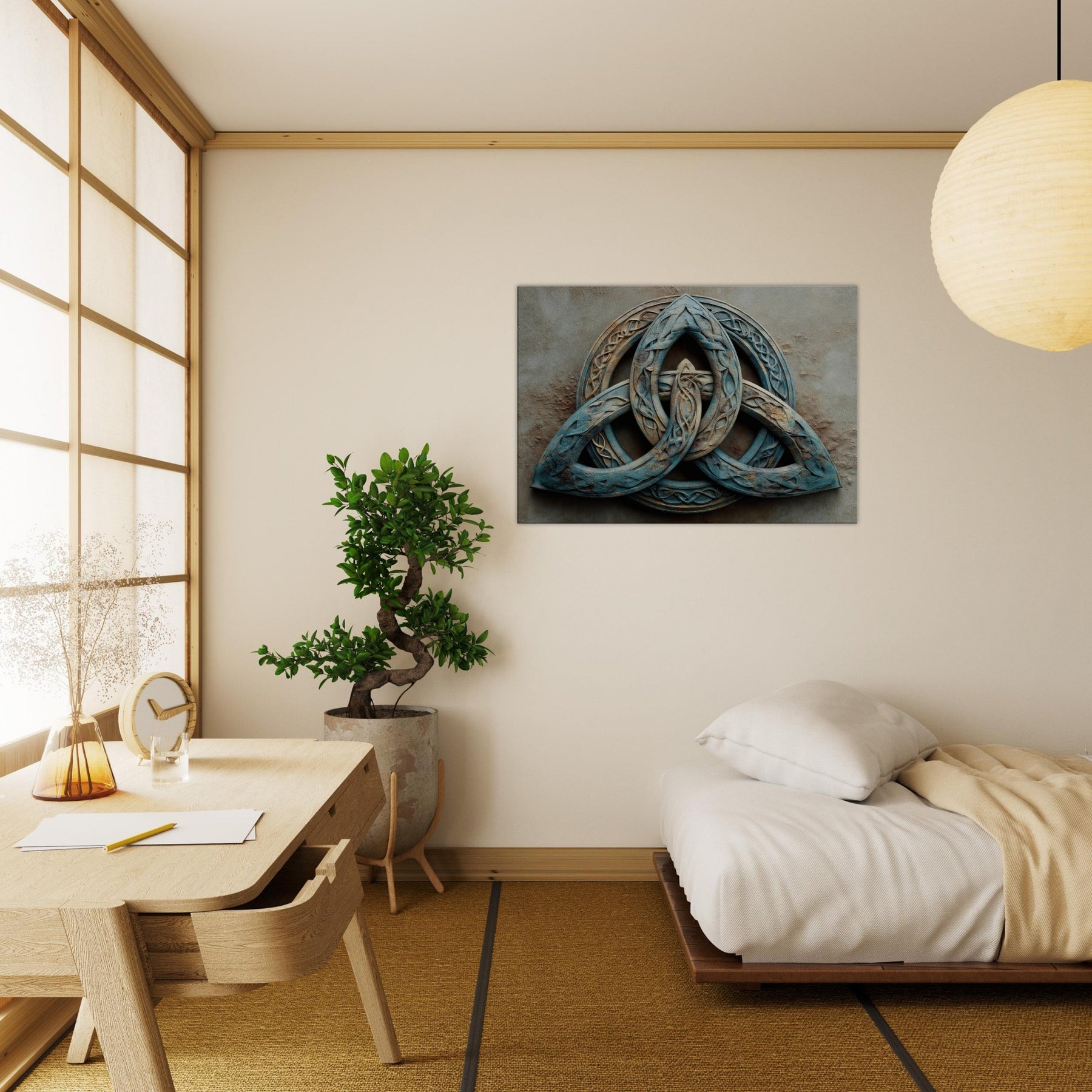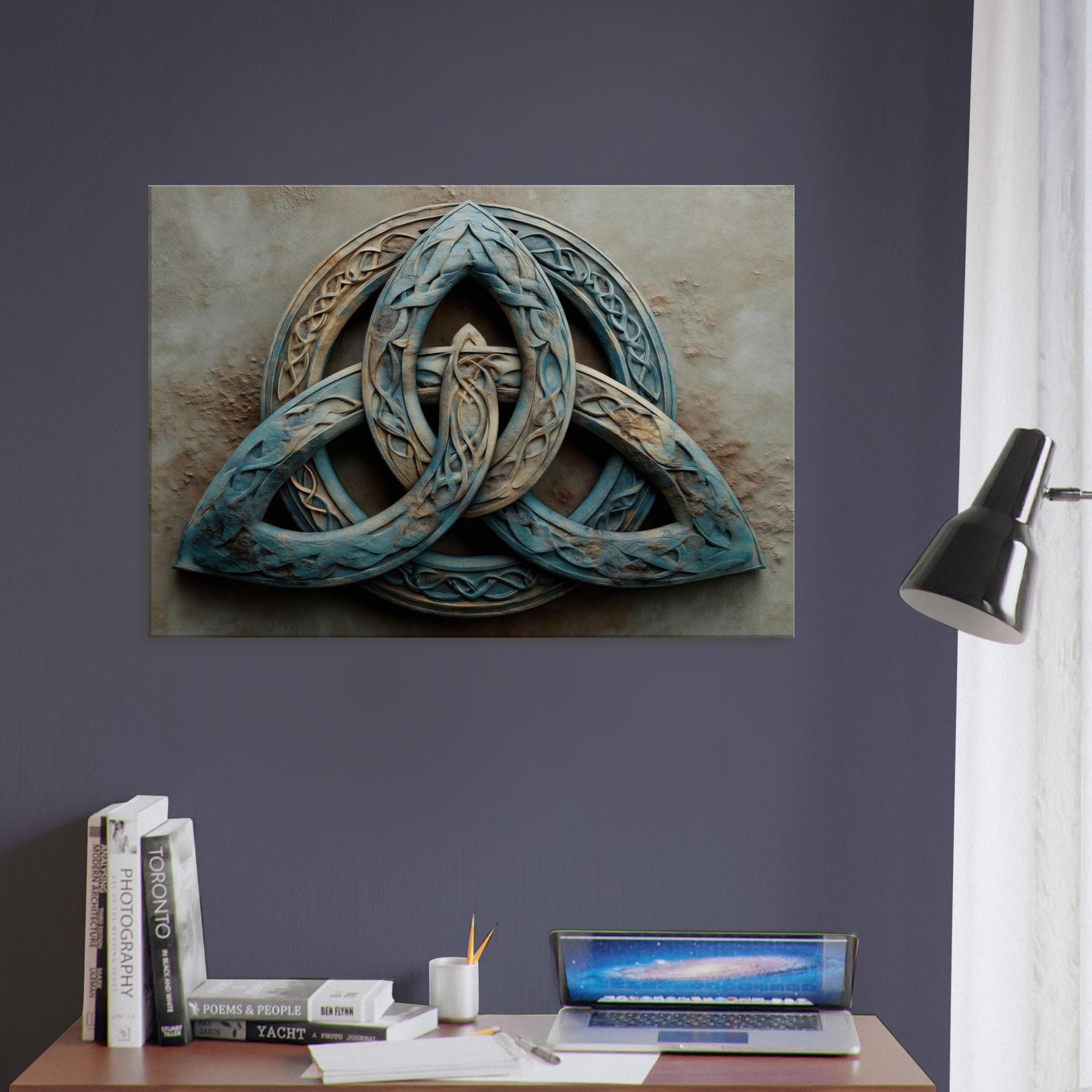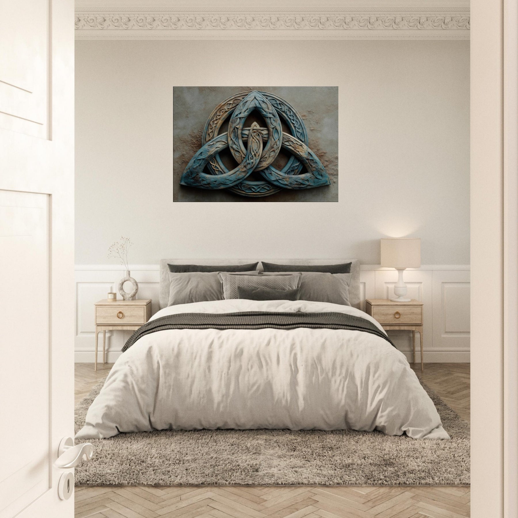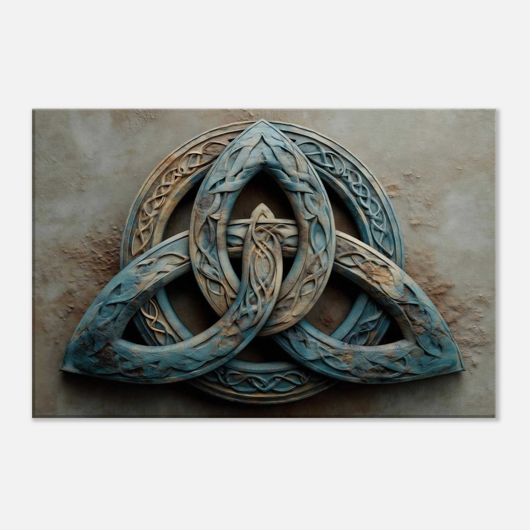 An invitation to pause within a living room where time slows and silence hums. This piece presents the Celtic Triquetra as a suspended dream three loops braided into a luminous labyrinth, each line catching light like sea worn glass. Its surreal, tumbled textures and dusk blue patina evoke wind swept stone and misted dawns, inviting contemplation rather than clamor. Hang it to transform a wall into a quiet sanctuary a mystical focal point that sparks conversation, slows evenings, and lends a sense of ancient geometry to modern space.