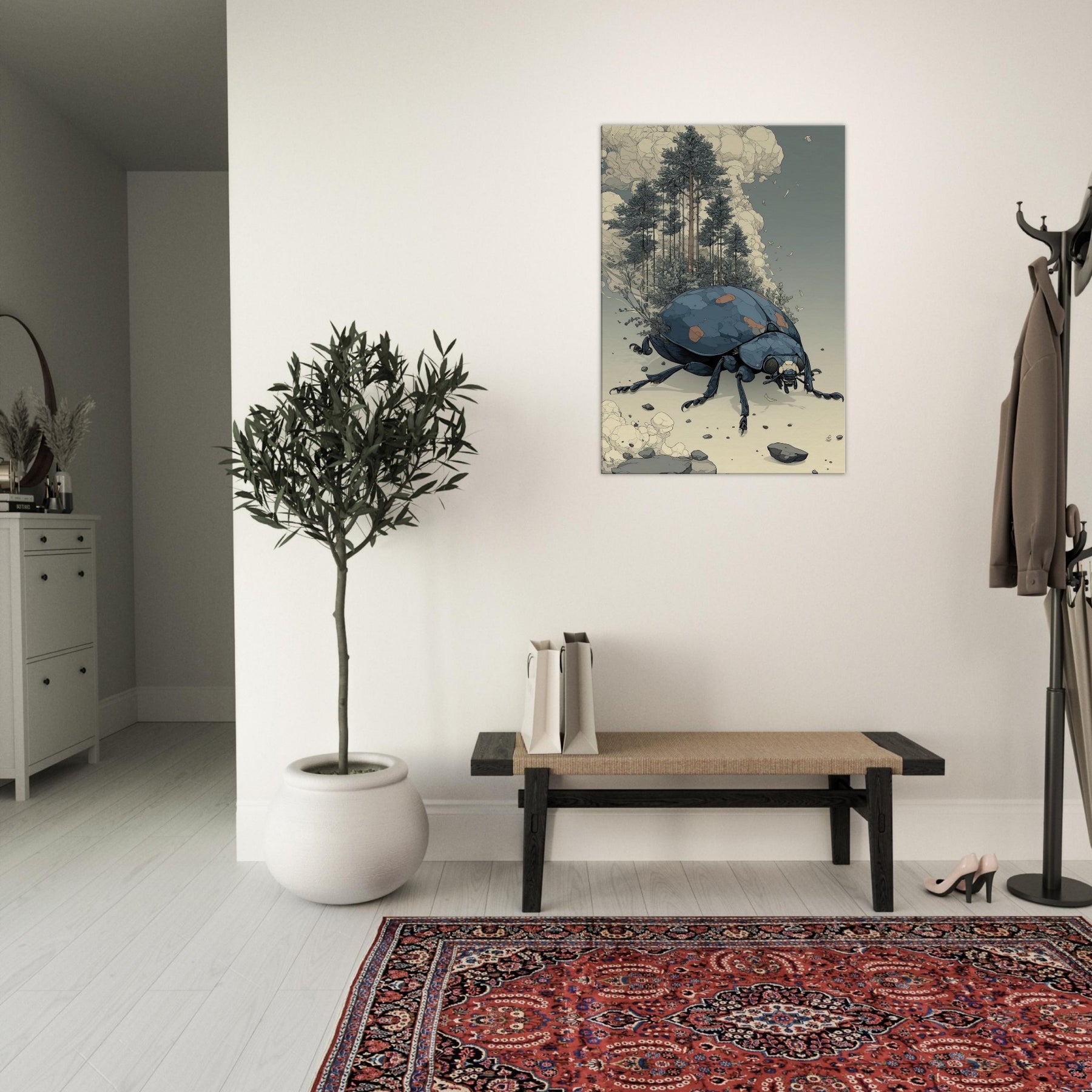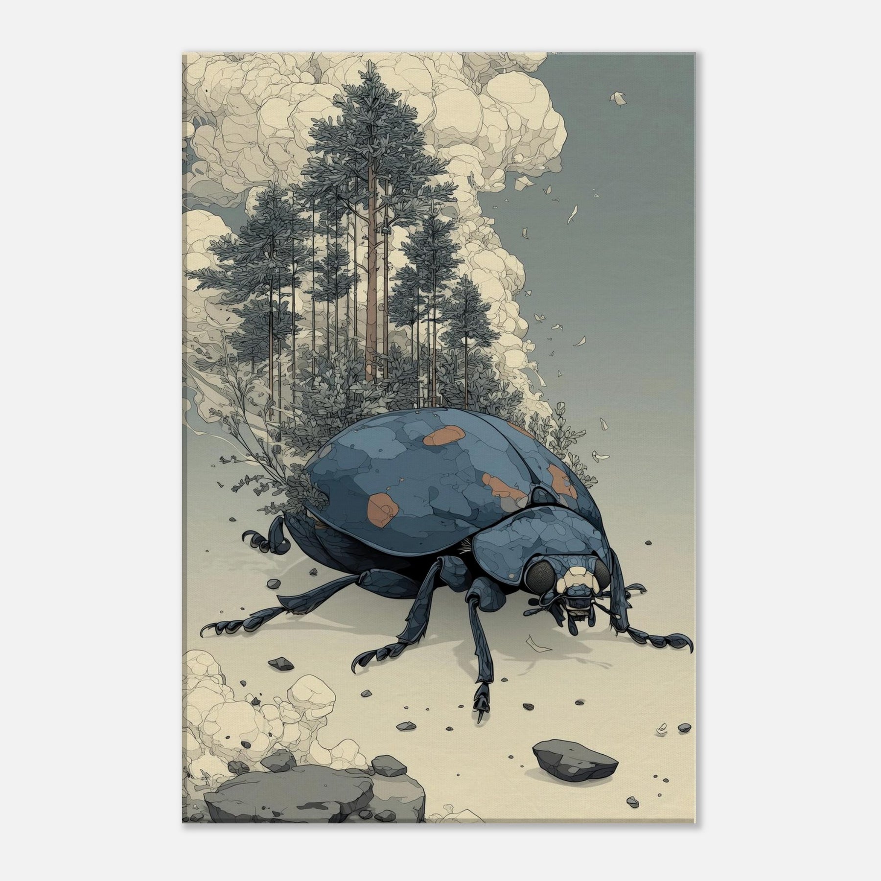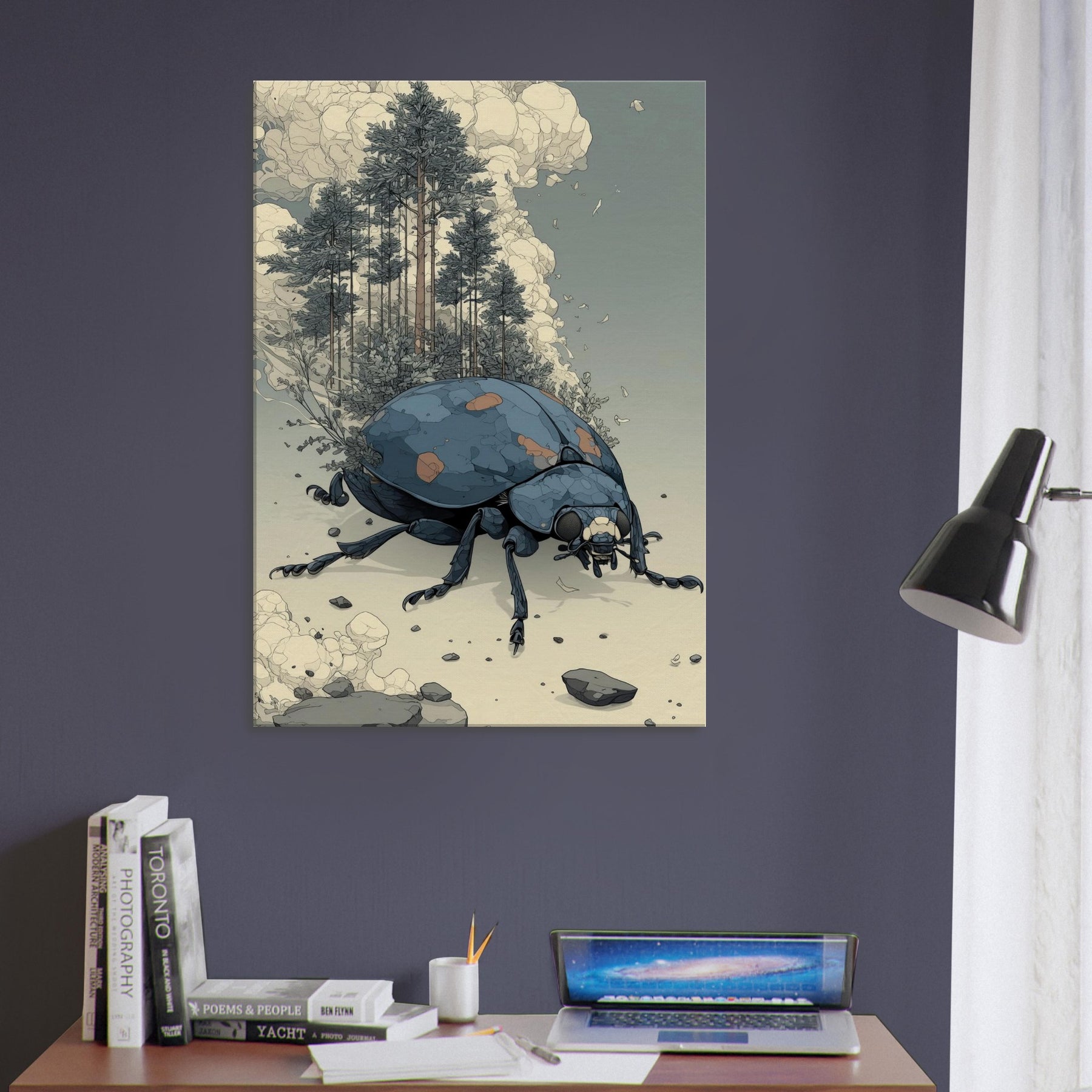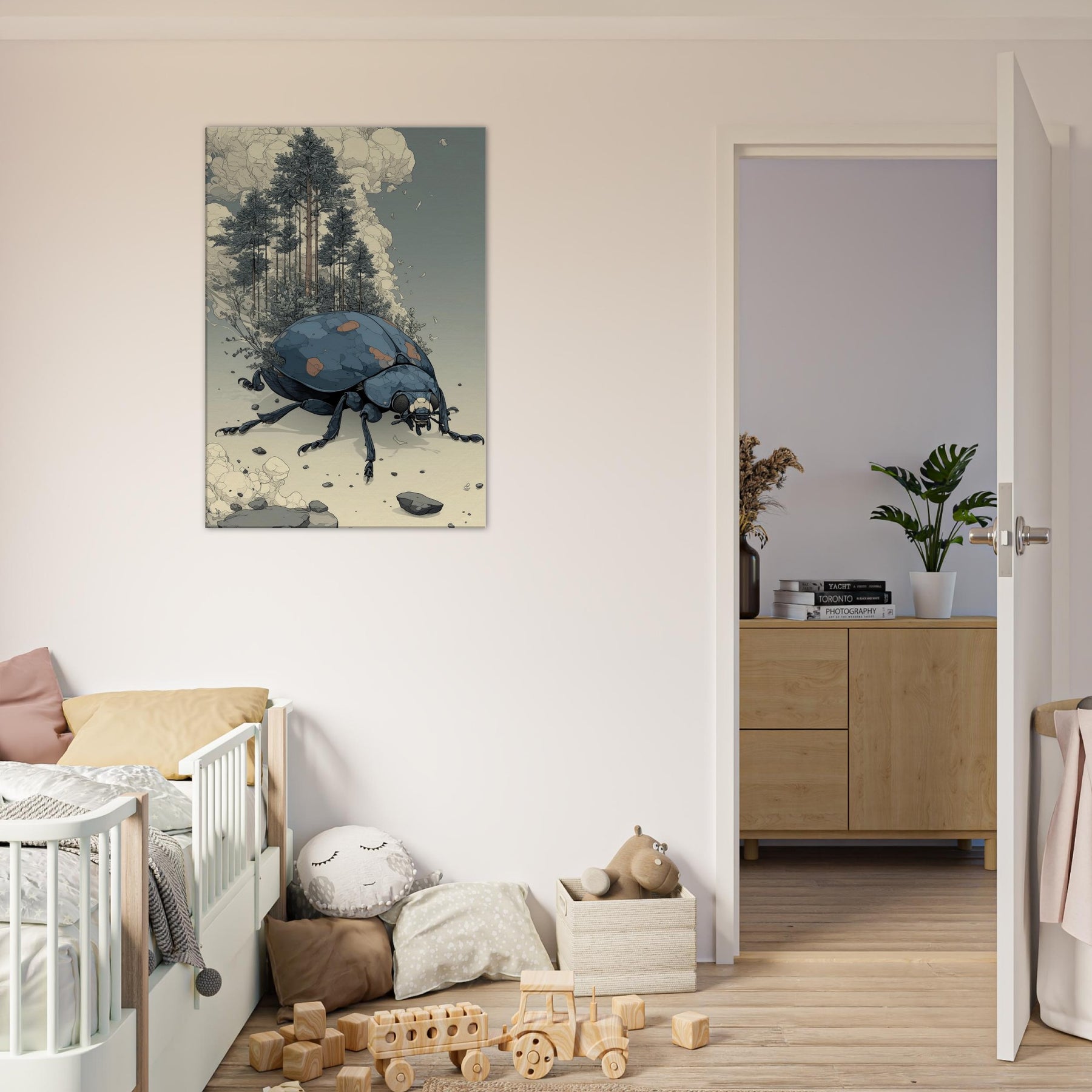 A colossal Ladybug anchors this dreamlike scene, bearing a forest on its back as slender pines reach toward a pale horizon. Clouds billow, stones scatter, and a soft dust dances in the air. The mood is serene and surreal, inviting quiet contemplation and adventurous imagination in equal measure. Hang it where conversation and calm meet a living room, study, or entry so the space breathes with wonder and a tactile sense of nature, reimagined at human scale.