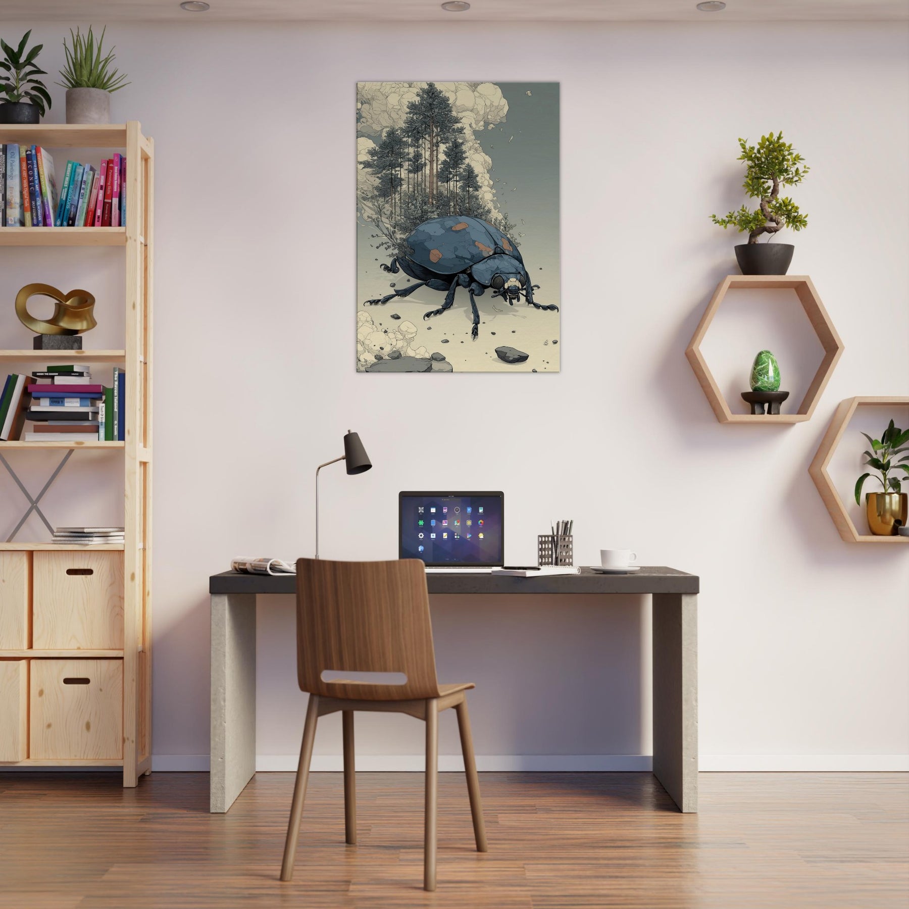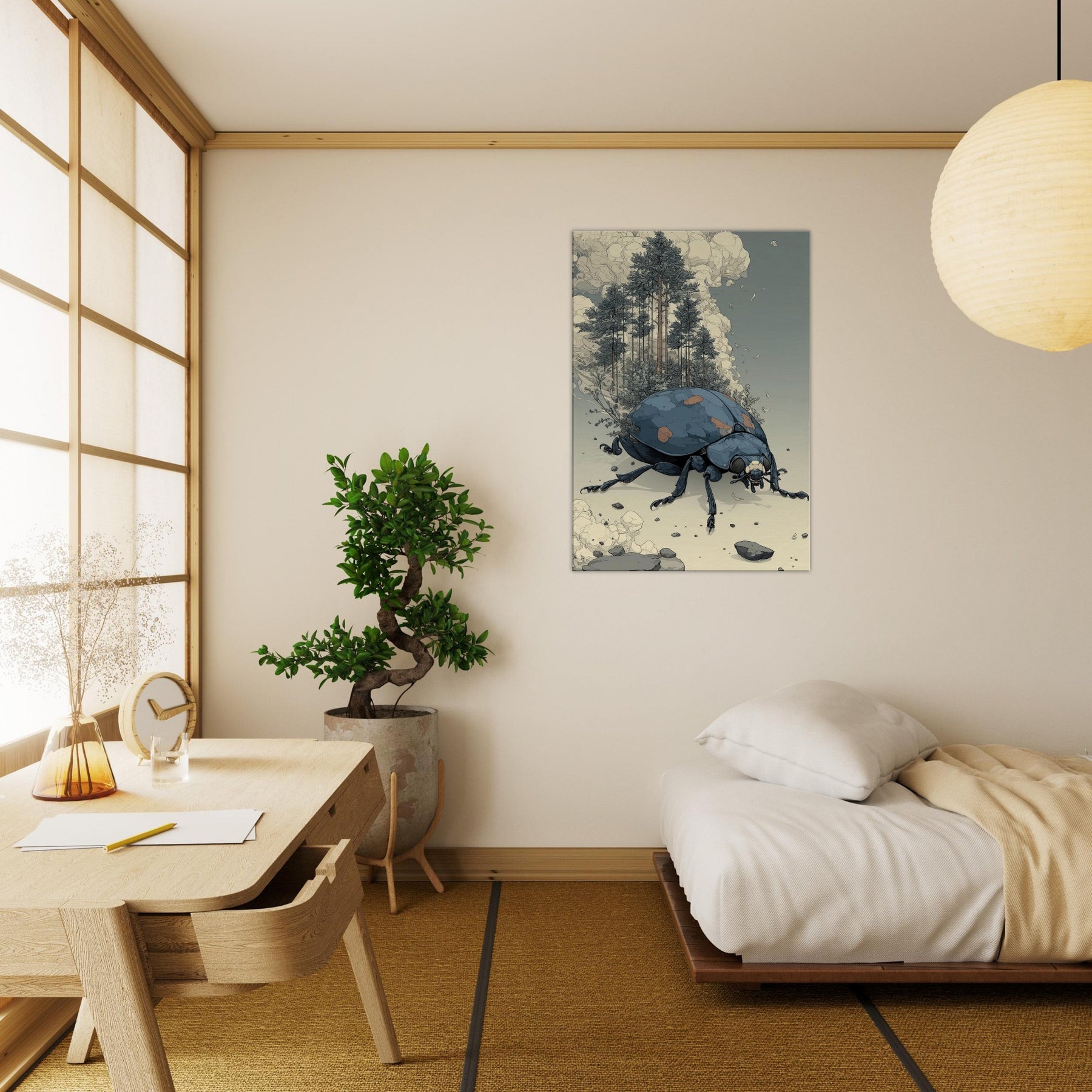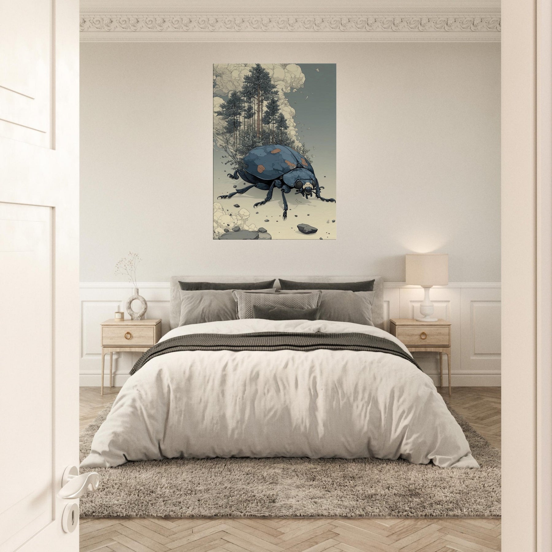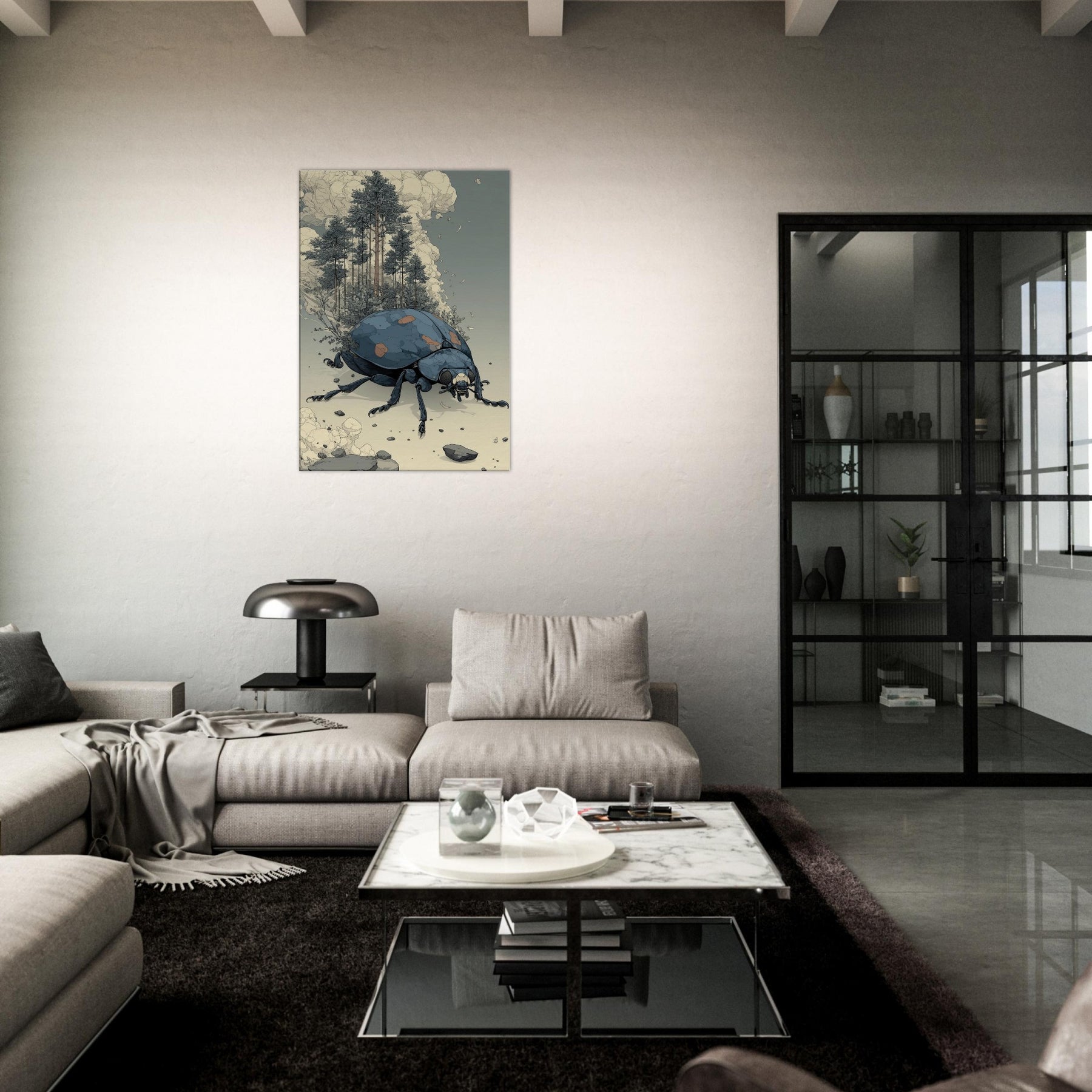 A colossal Ladybug anchors this dreamlike scene, bearing a forest on its back as slender pines reach toward a pale horizon. Clouds billow, stones scatter, and a soft dust dances in the air. The mood is serene and surreal, inviting quiet contemplation and adventurous imagination in equal measure. Hang it where conversation and calm meet a living room, study, or entry so the space breathes with wonder and a tactile sense of nature, reimagined at human scale.