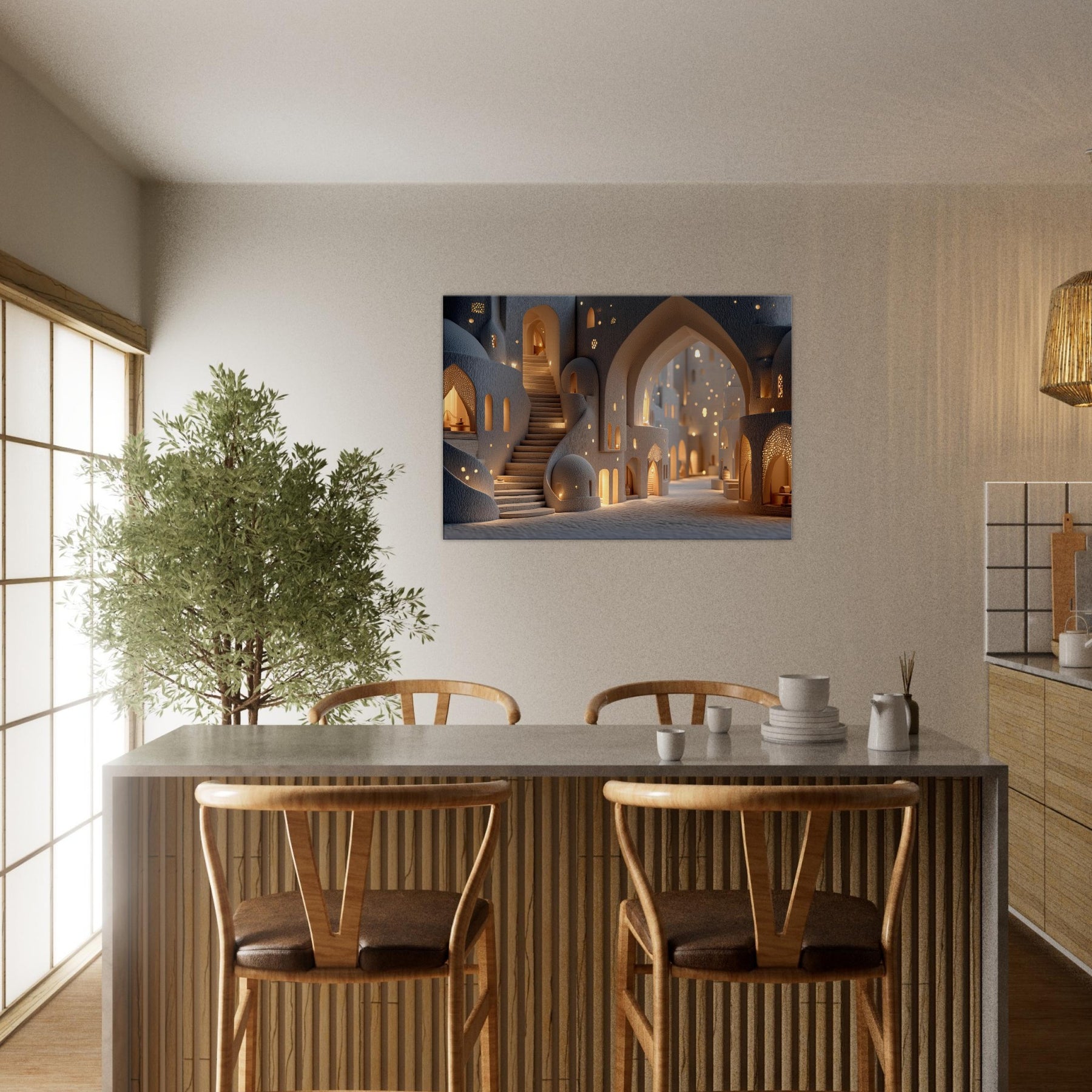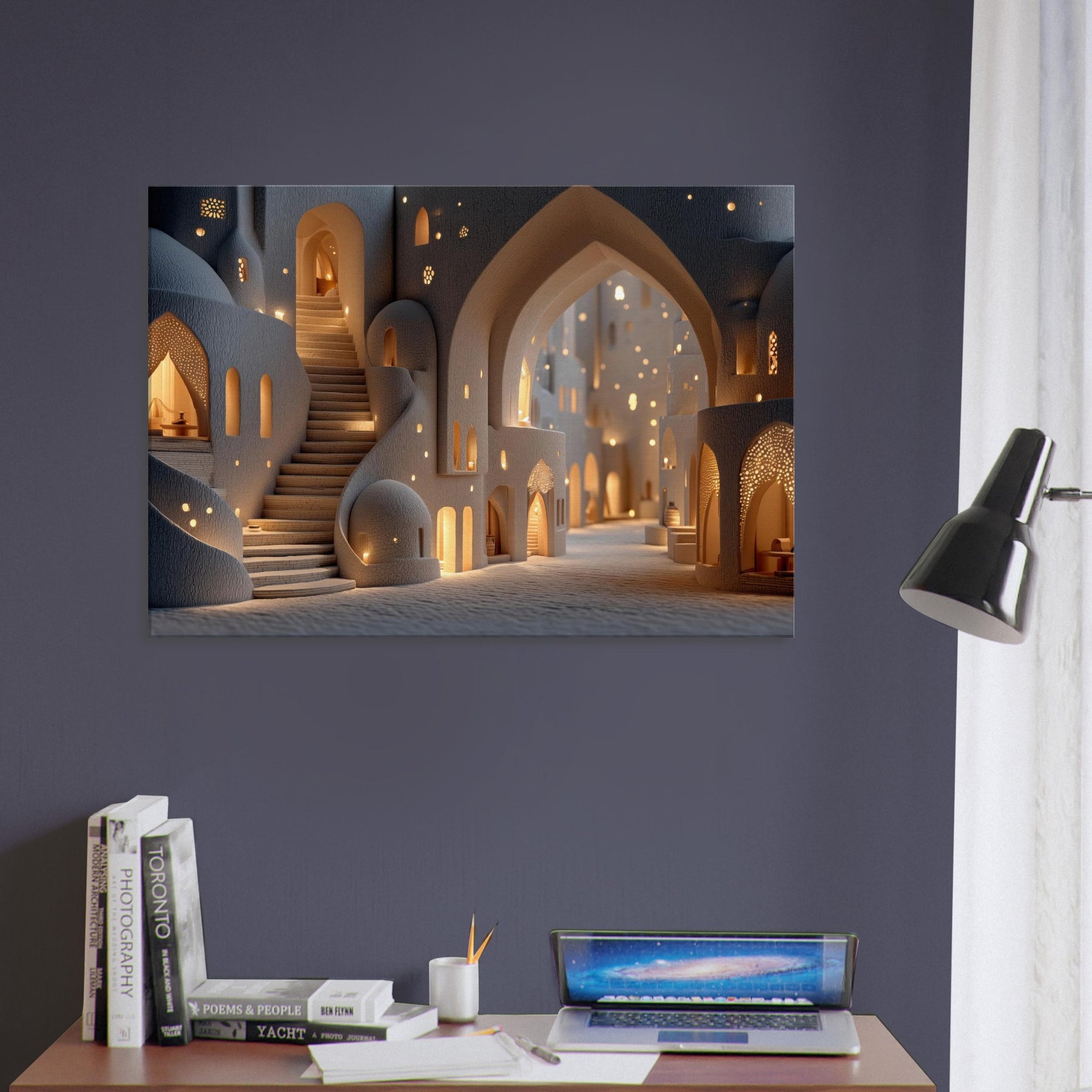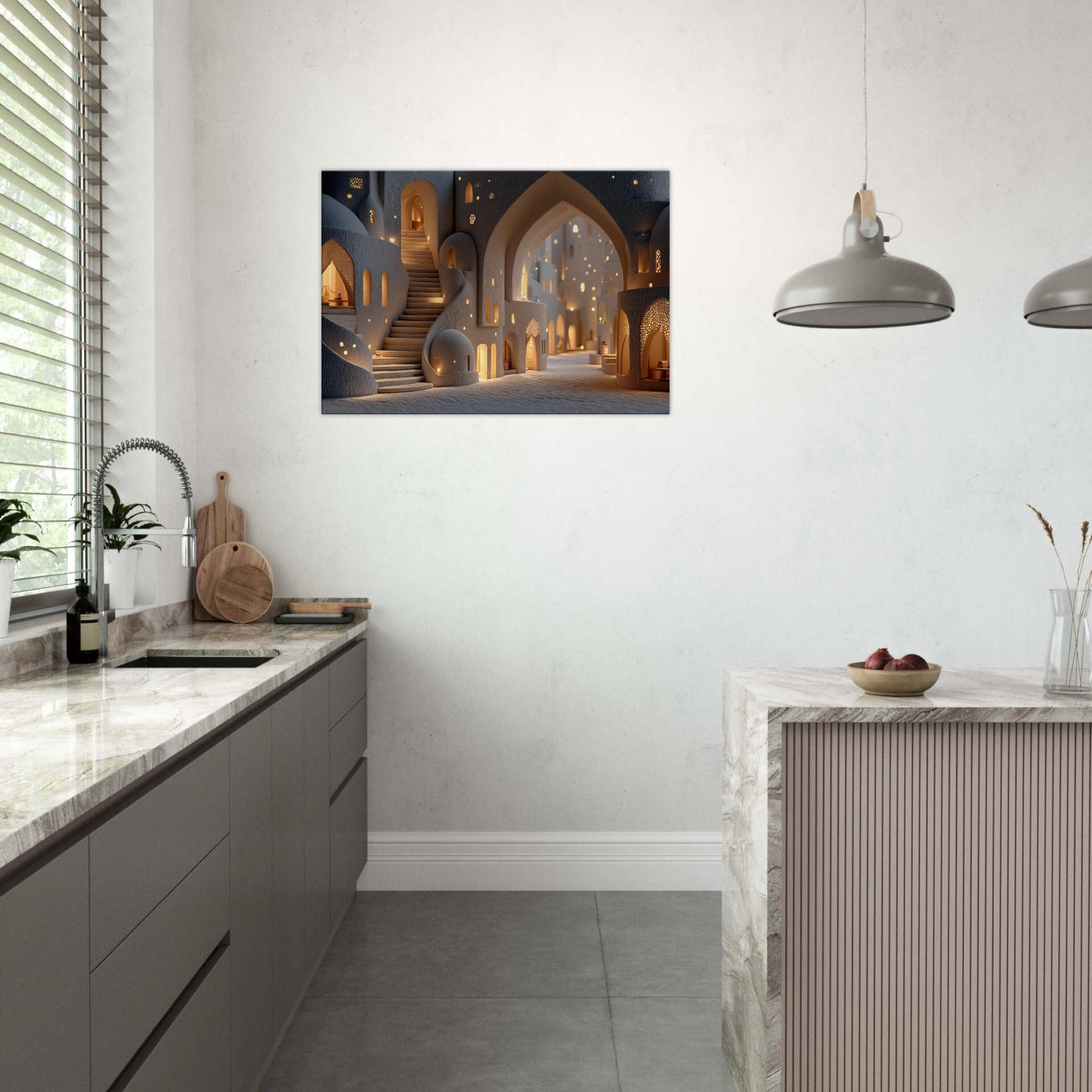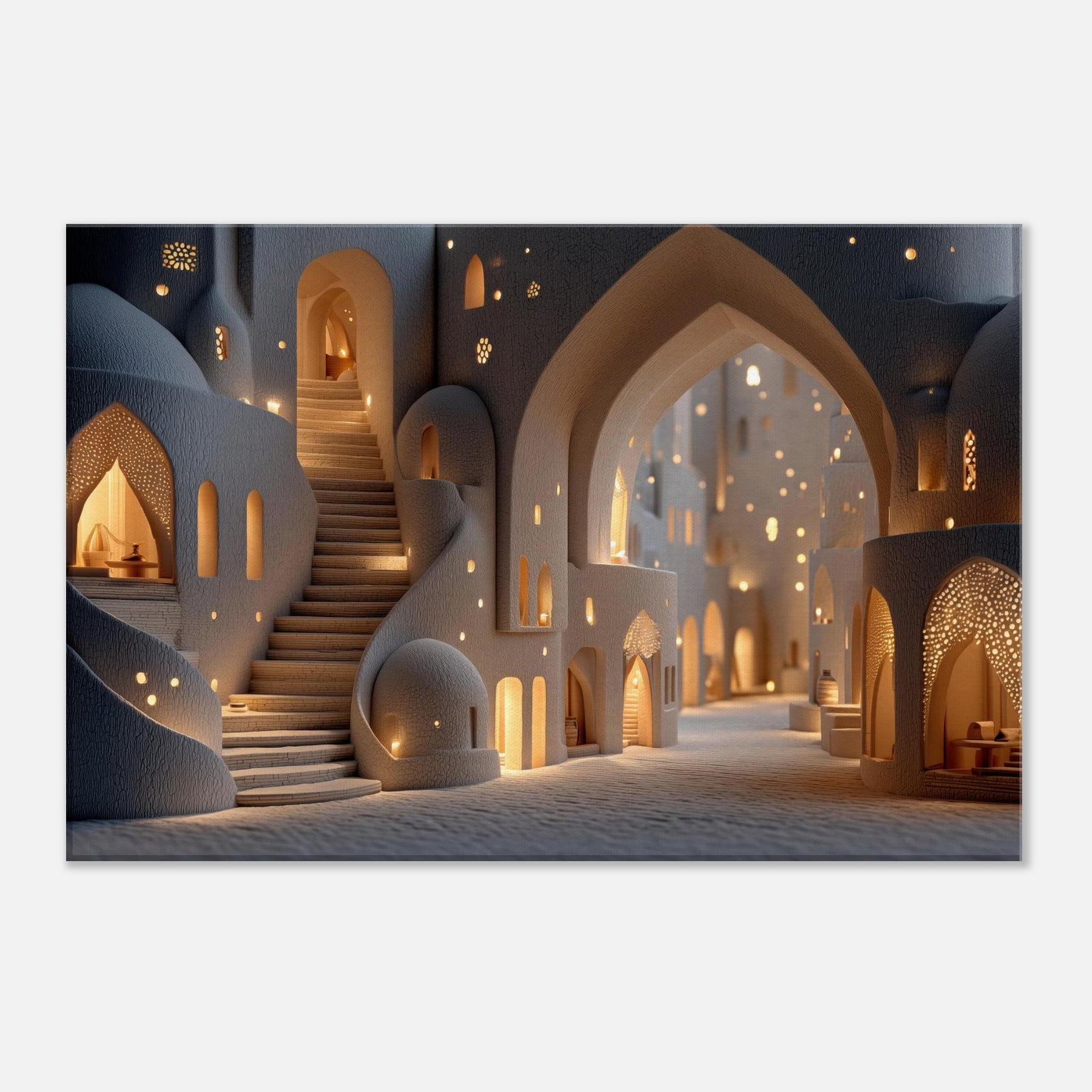 At its core lies the Arabian Bazaar, a dream of vaulted markets where staircases wind into lantern lit courtyards and archways drift like memory. Surfaces glow with amber warmth, and tiny windows become portals to unknown rooms, inviting calm conversation and unhurried contemplation. This piece threads the scent of spices with the hush of wind tossed fabrics, turning a wall into a living doorway that expands a room. Hang it to invite curiosity, warmth, and a gentle sense of voyage every day.