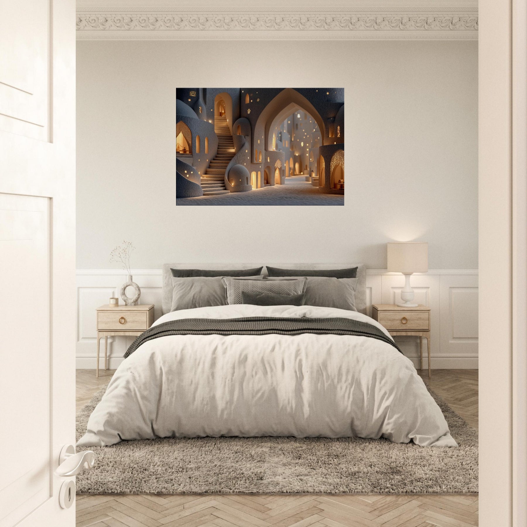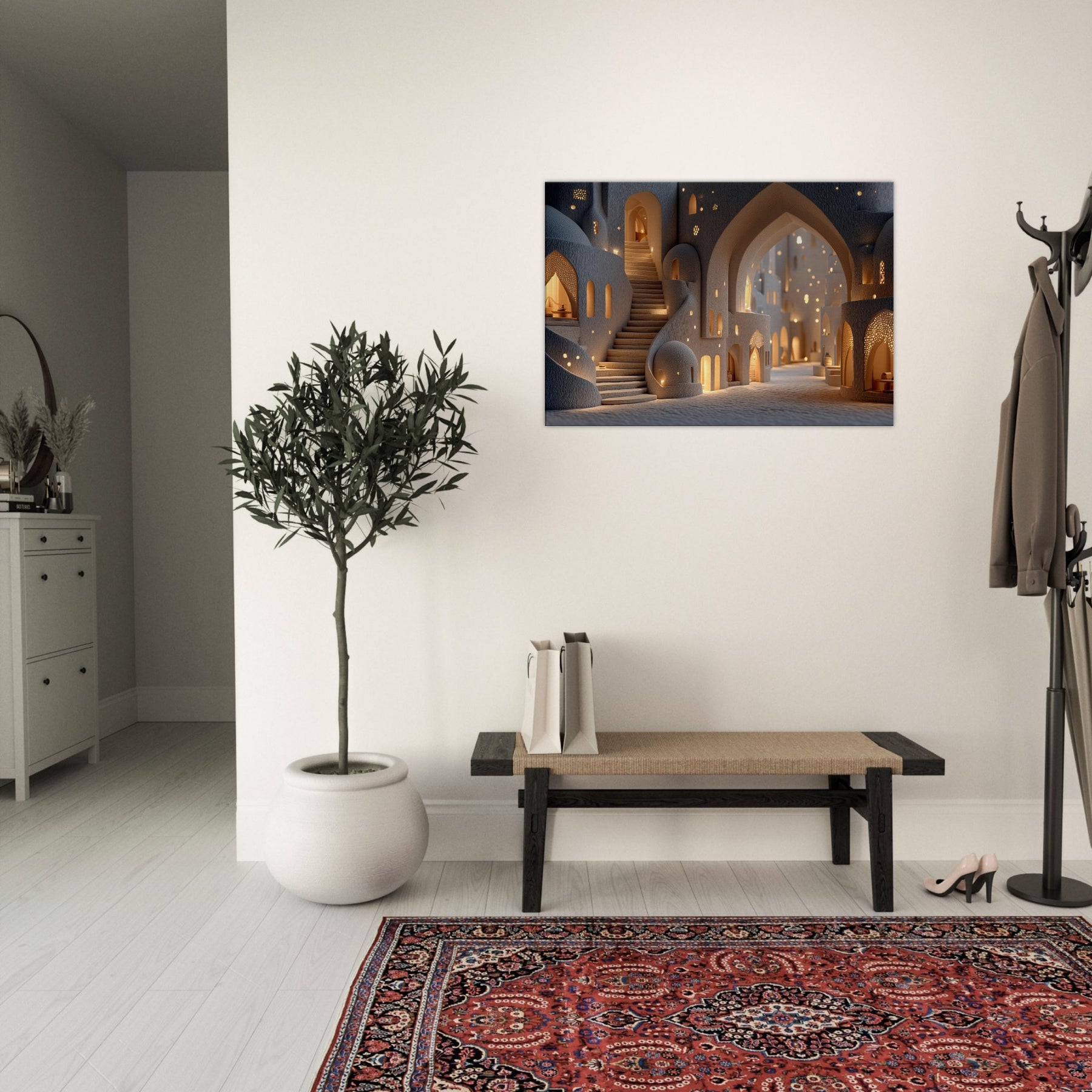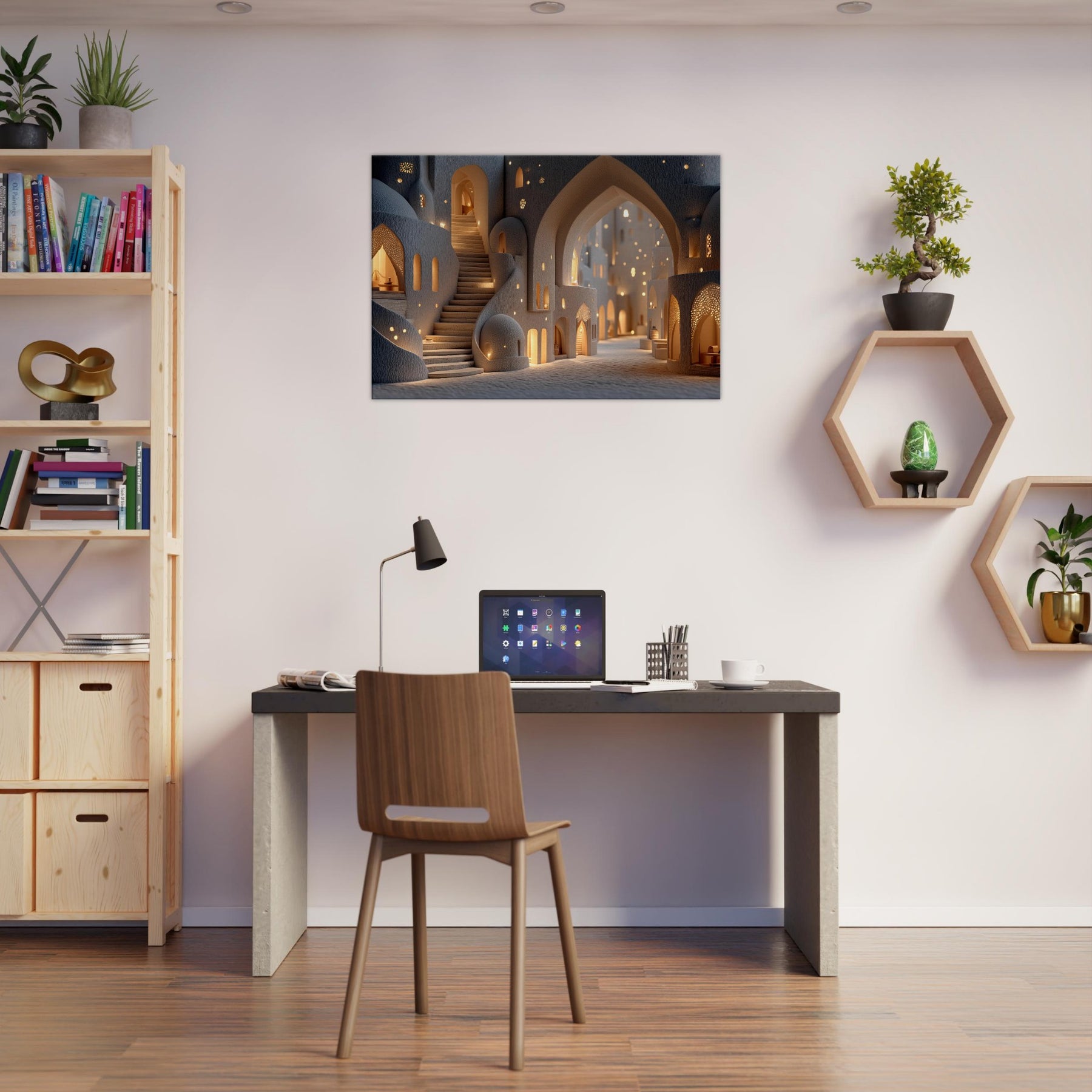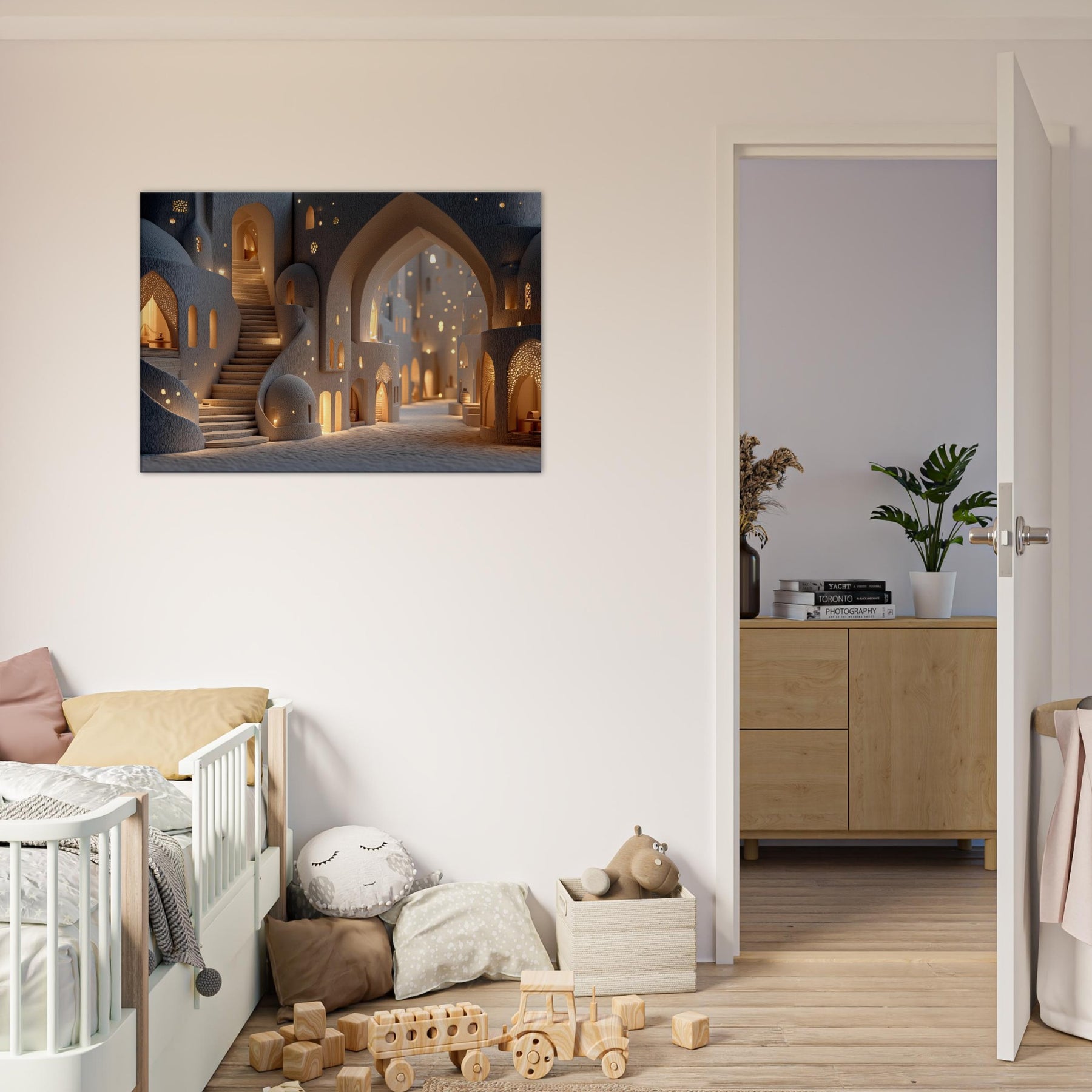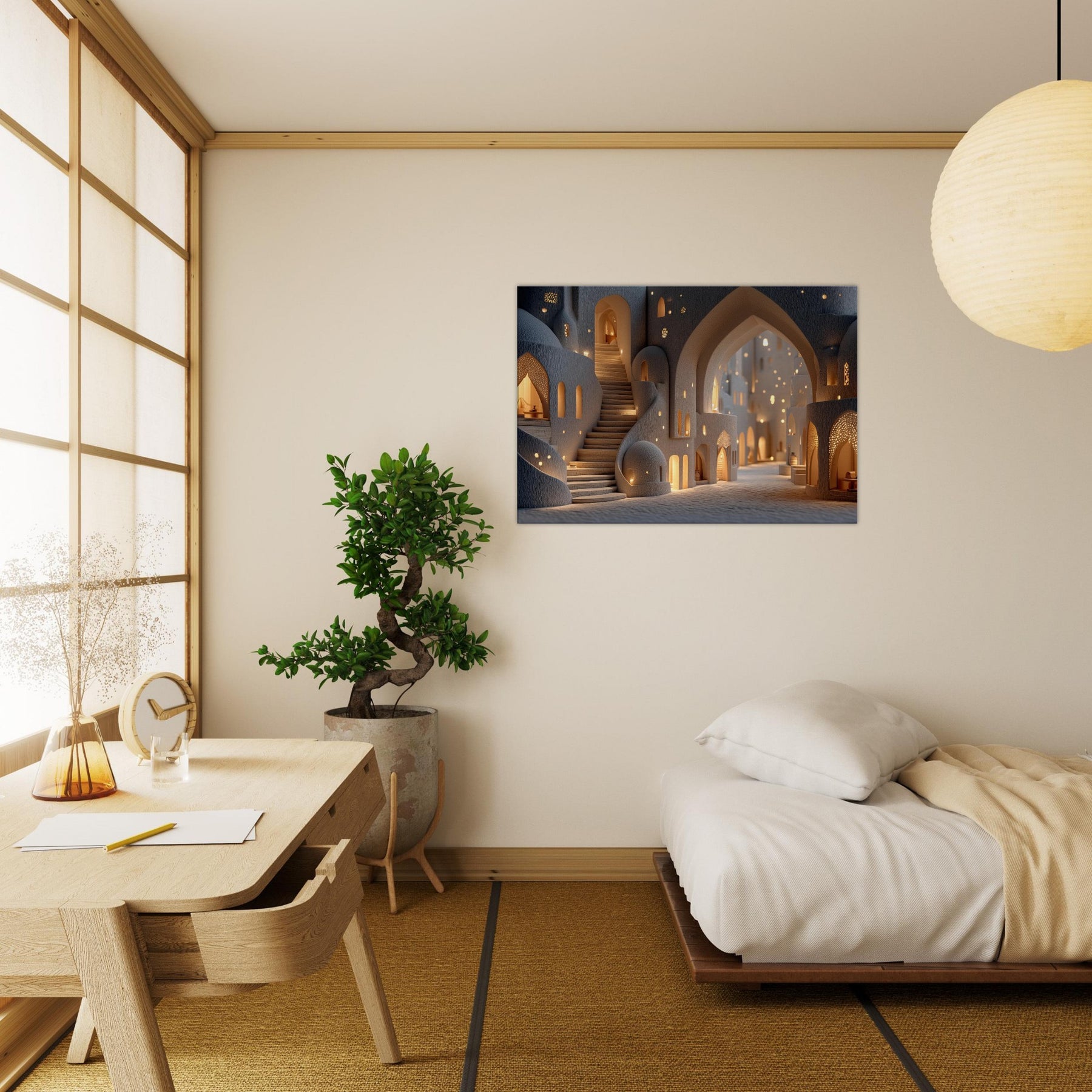 At its core lies the Arabian Bazaar, a dream of vaulted markets where staircases wind into lantern lit courtyards and archways drift like memory. Surfaces glow with amber warmth, and tiny windows become portals to unknown rooms, inviting calm conversation and unhurried contemplation. This piece threads the scent of spices with the hush of wind tossed fabrics, turning a wall into a living doorway that expands a room. Hang it to invite curiosity, warmth, and a gentle sense of voyage every day.