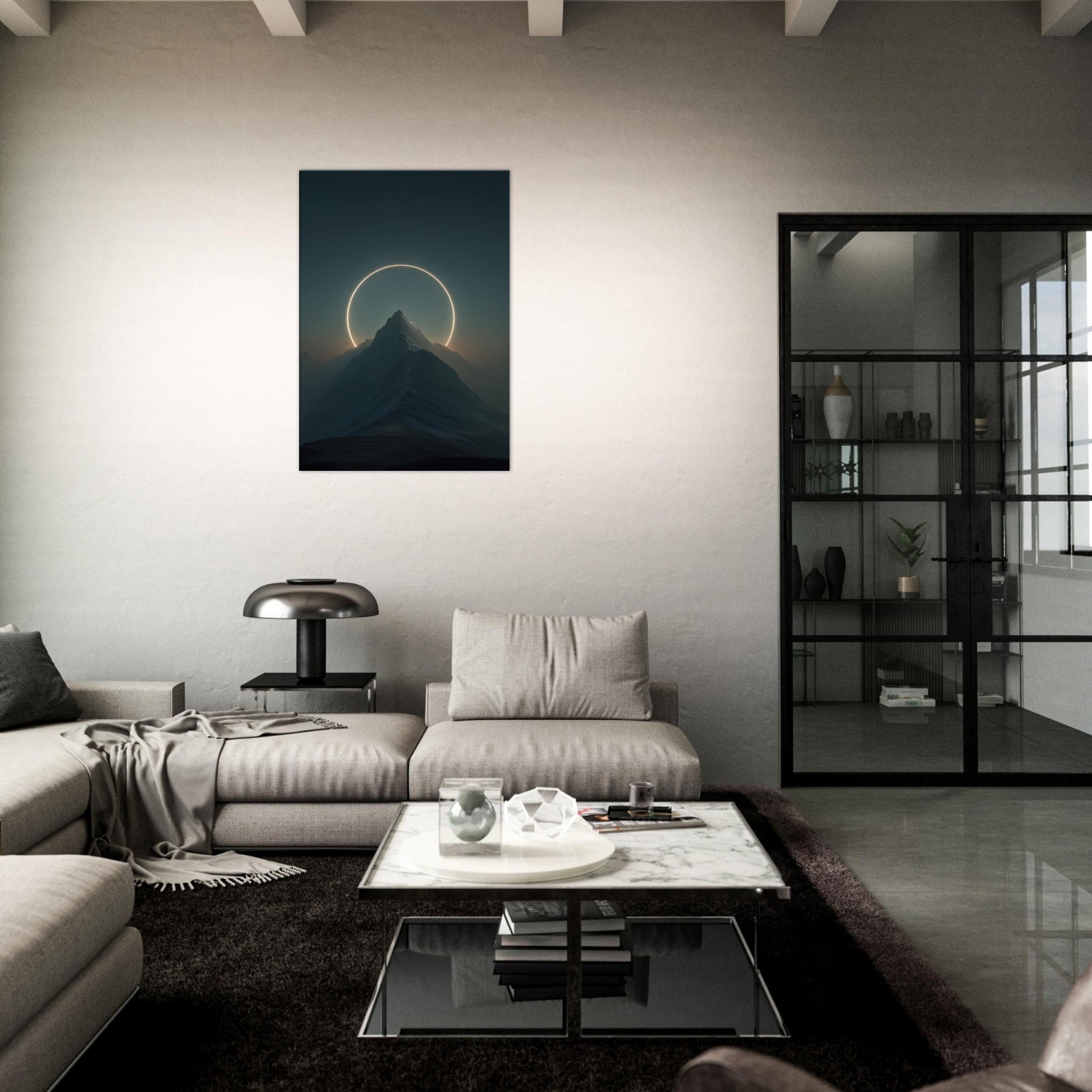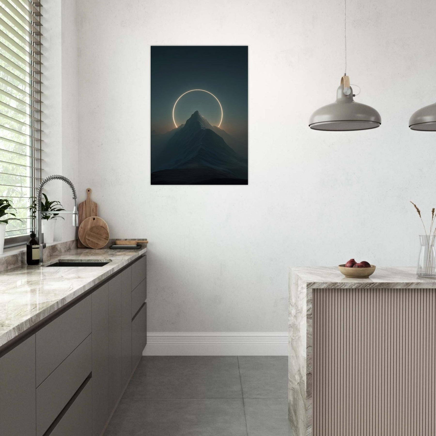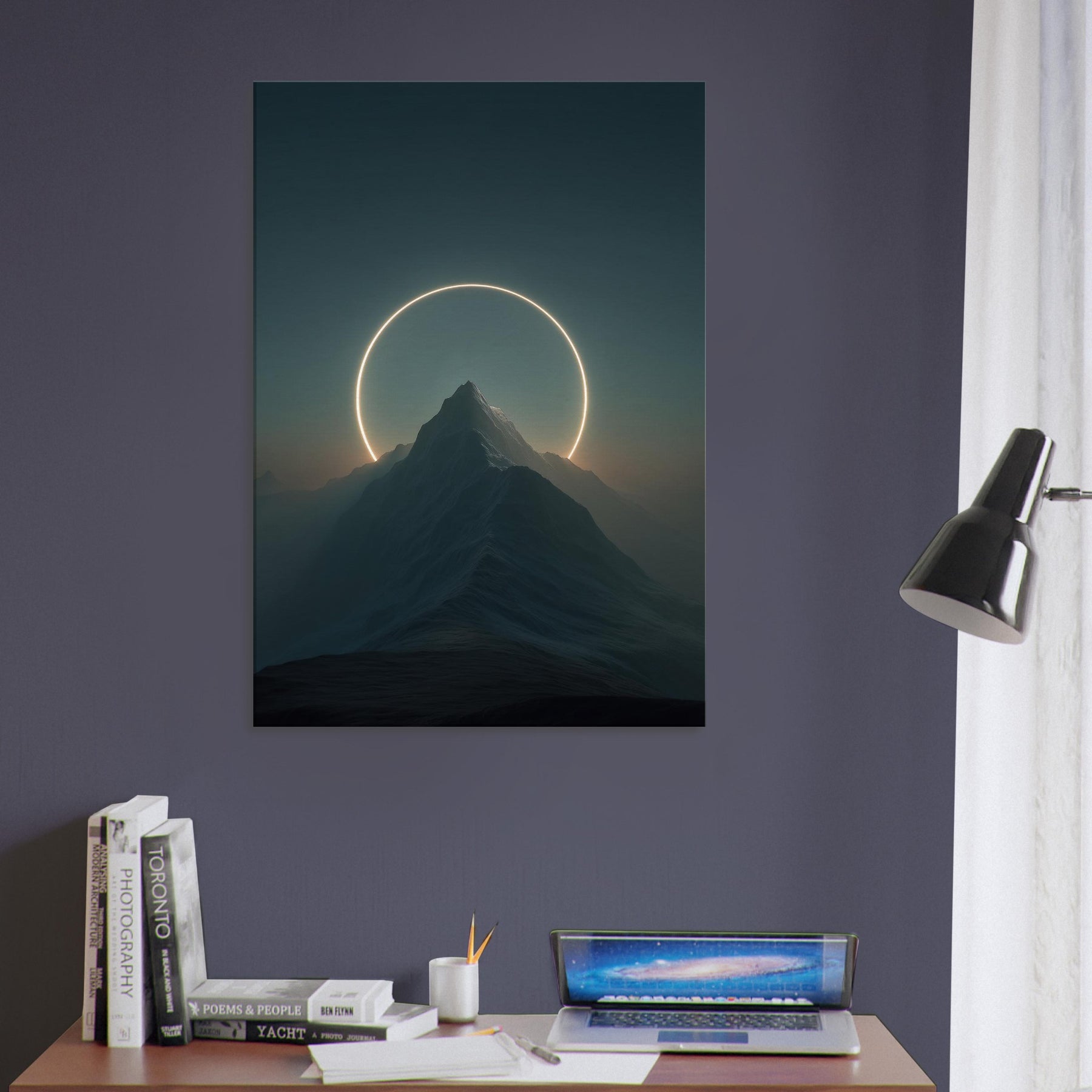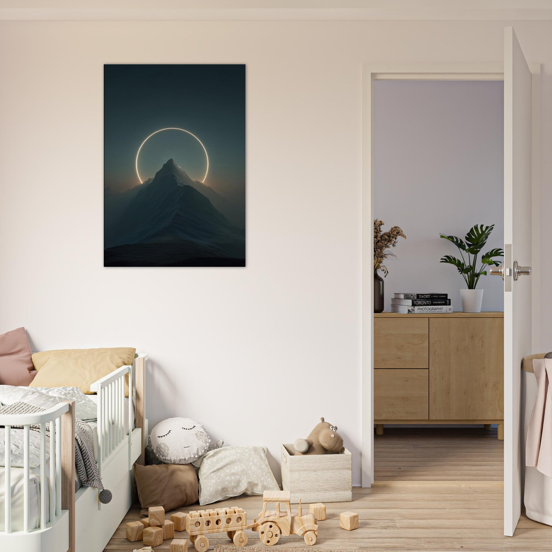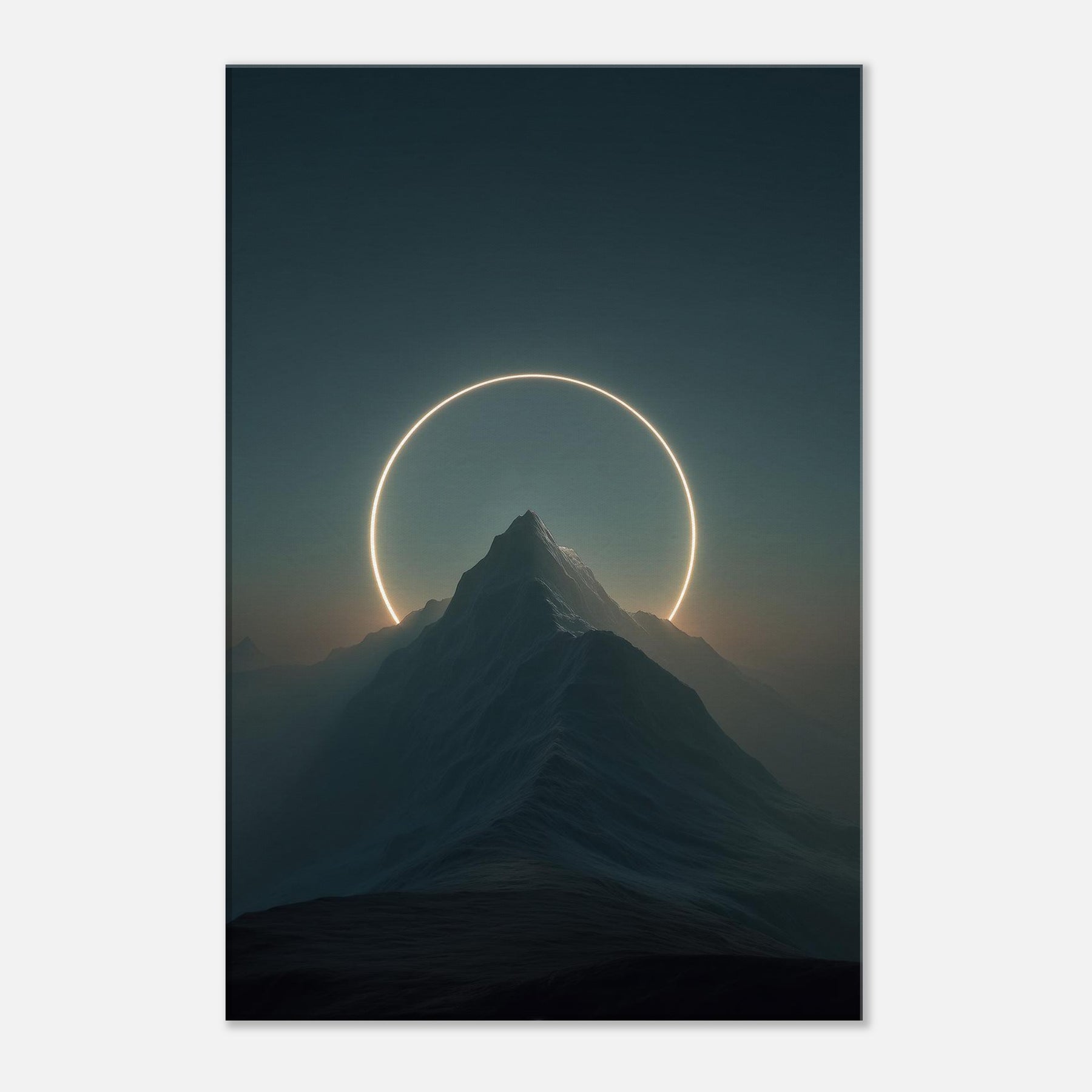 Moon over Mountains (Minimal) unfolds as a quiet vow of wonder, where a glowing circle suspends above a jagged summit and casts a soft, otherworldly light across the night’s velvet air. This surreal composition invites stillness into a living space, turning a wall into a portal for contemplation. The Primary Subject, Moon over Mountains (Minimal), anchors the room with calm authority, while the halo suggests cyclical time and distant horizons. Hang it in a living room or bedroom to nourish reflection and invite gentle awe.