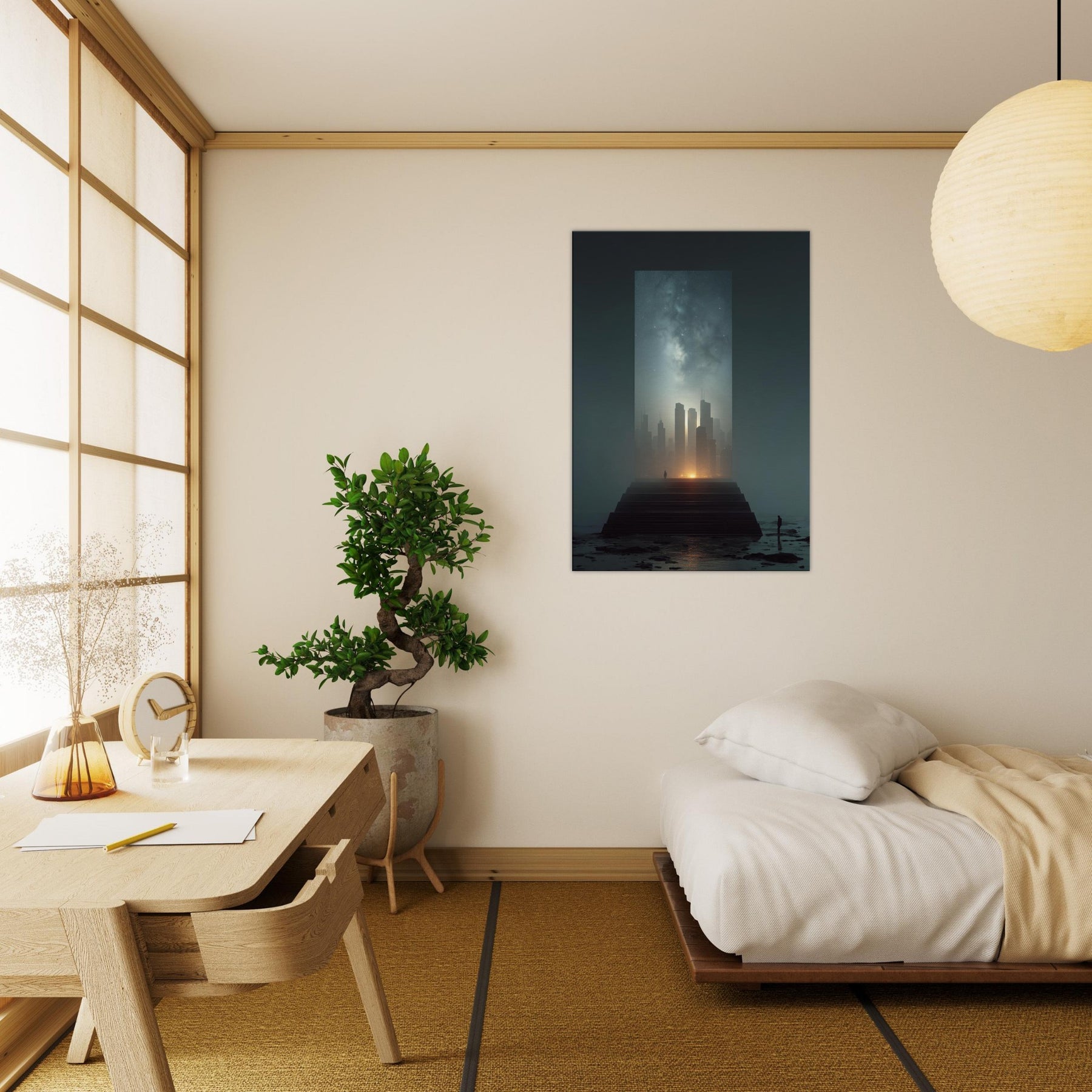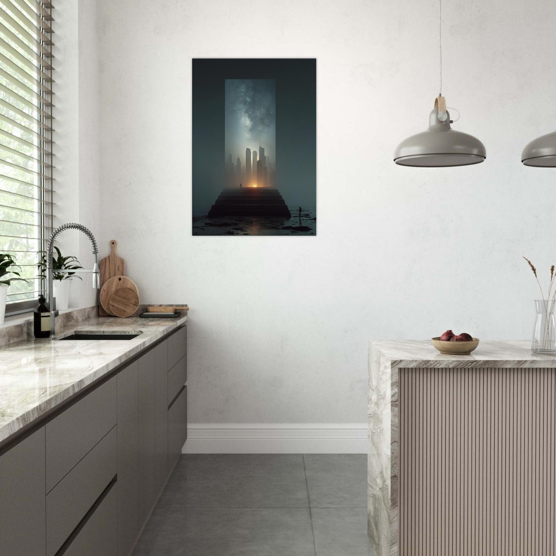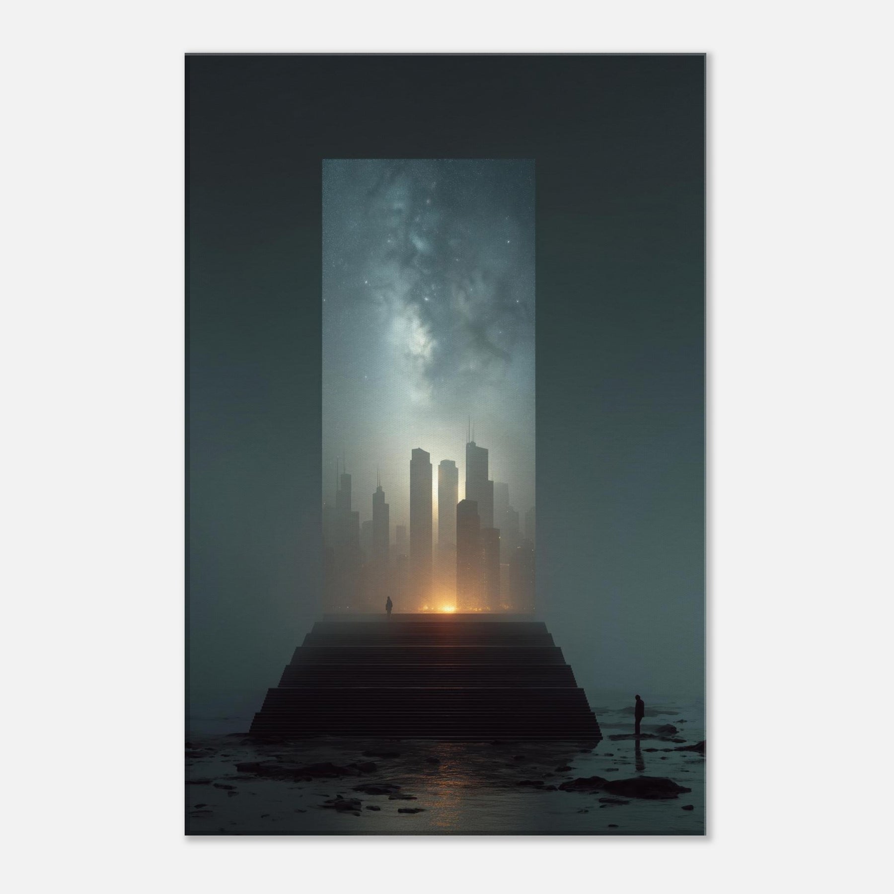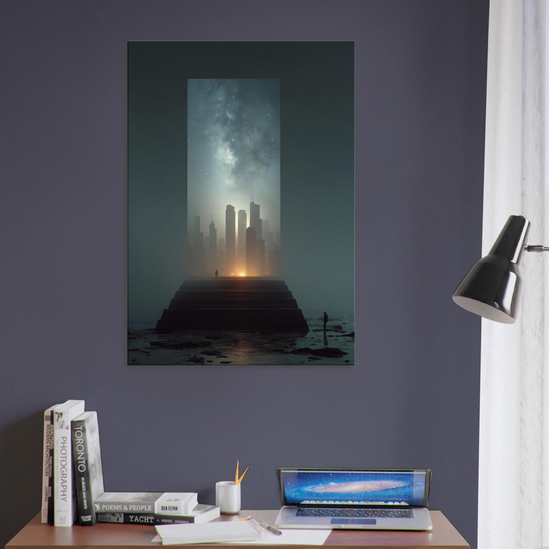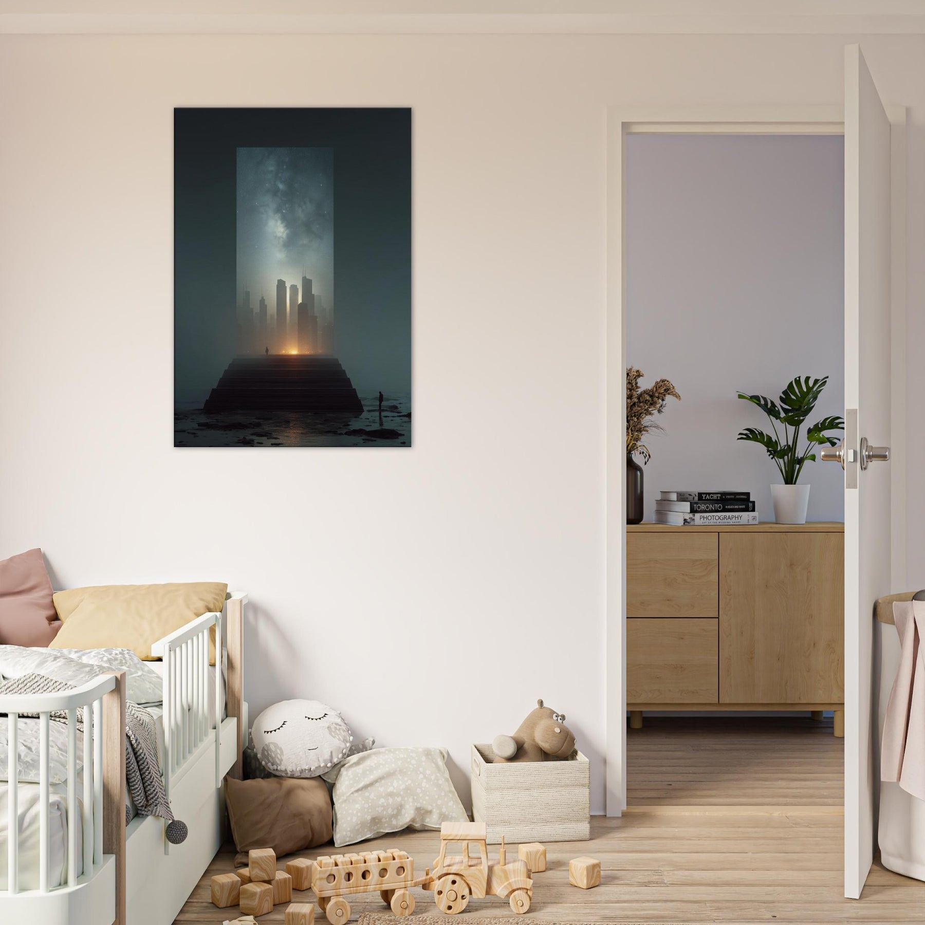 Step through the luminous doorway and let Miami unfold in a dreamlike skyline where dusk meets dawn. This surreal cityscape rises from a stair stepped platform, a beacon of warm light slicing the fog as silhouettes drift along the horizon. The air tastes of salt and ozone, and the night hums with distant traffic and stars. Hang this piece to spark cinematic mystery in your living space, turning walls into a horizon you can walk toward and a memory you’ll live inside.