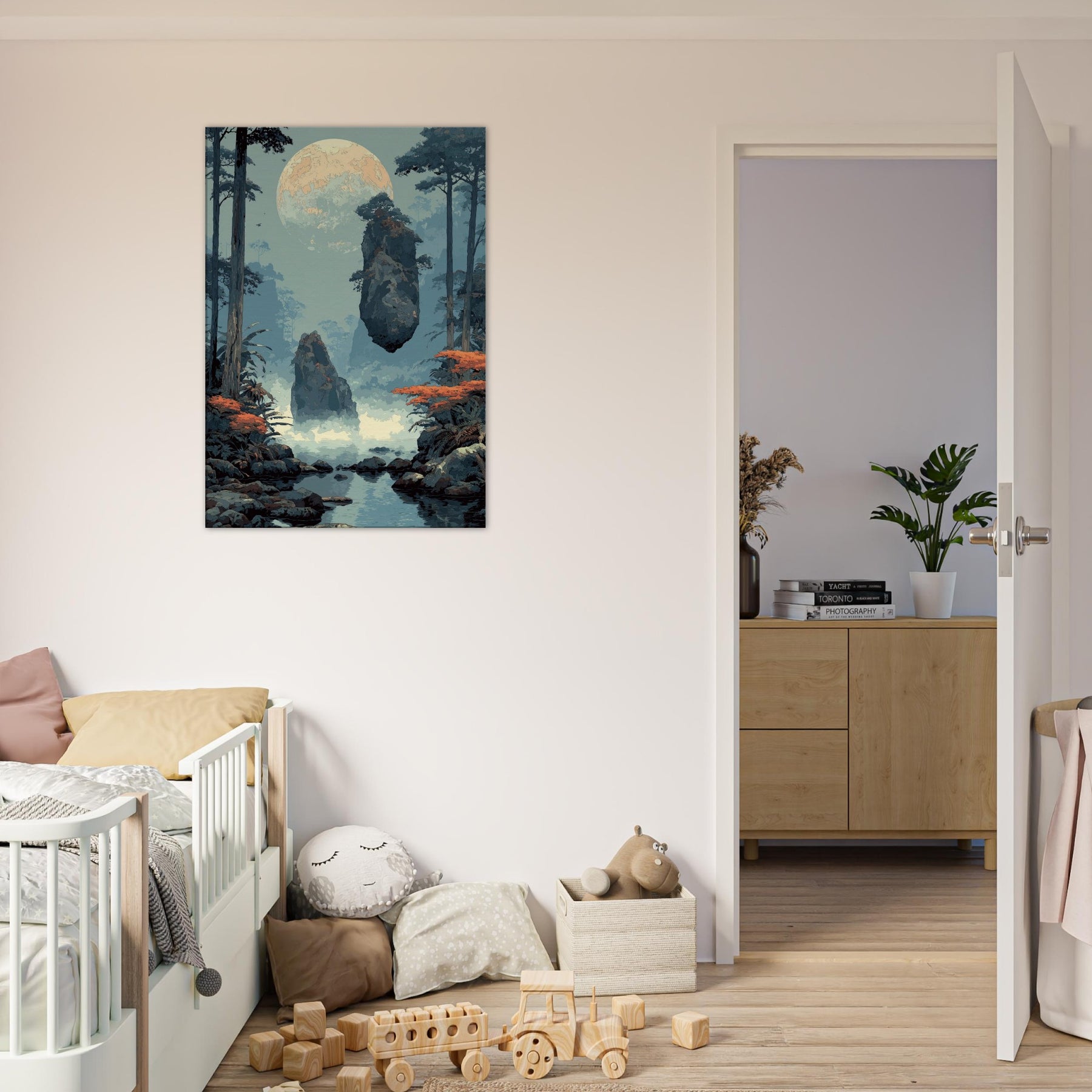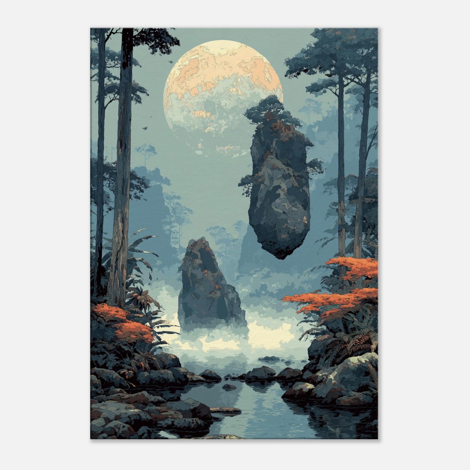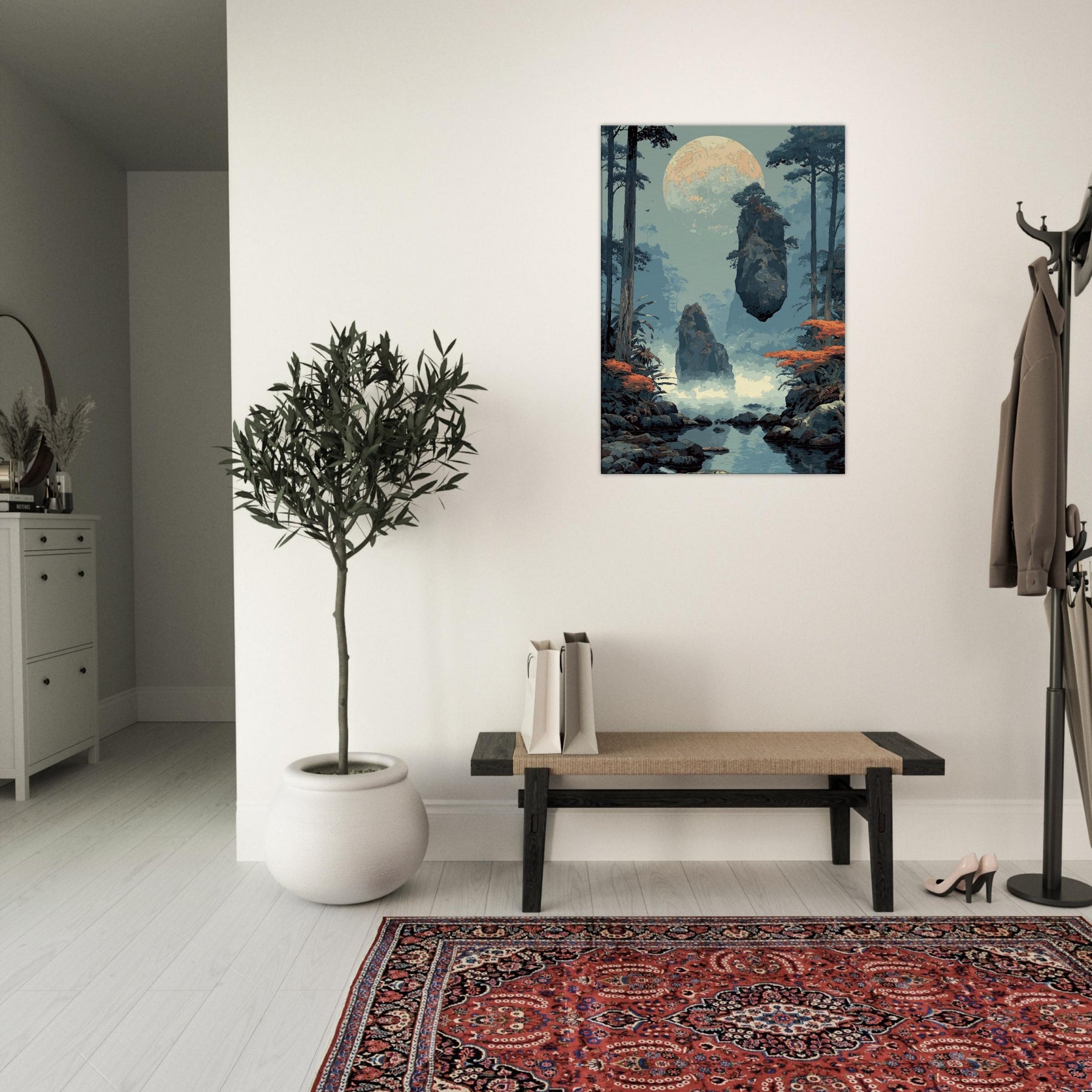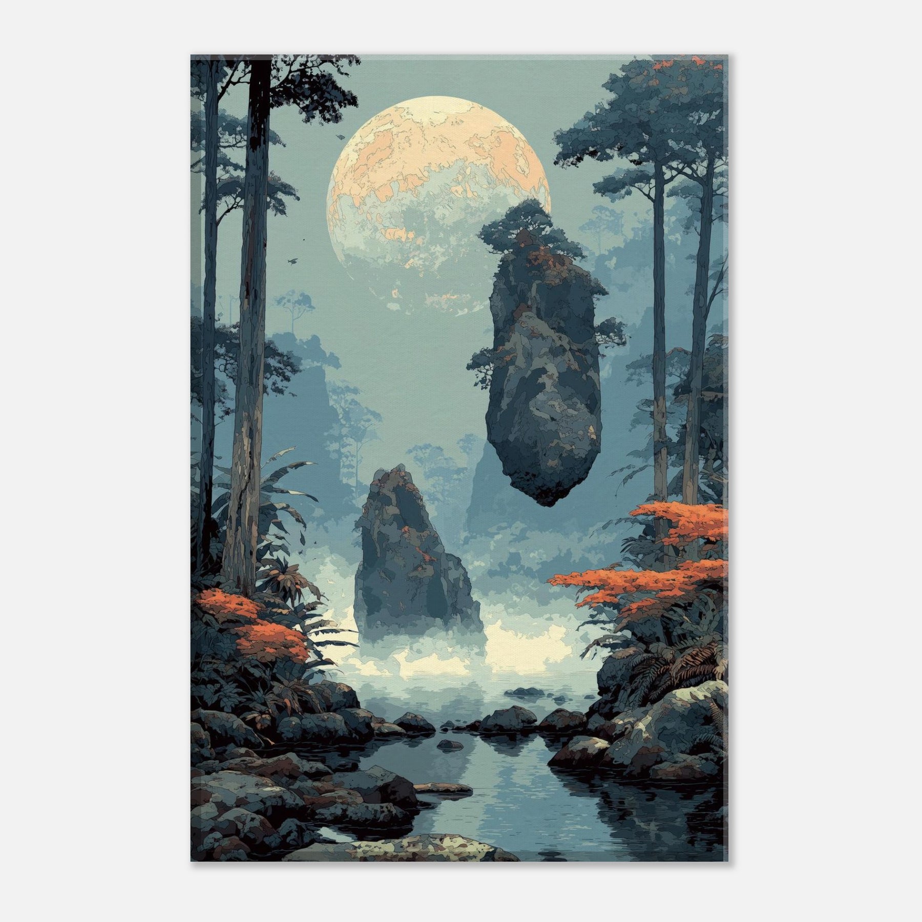 Let the Tropical Forest rise into your room as if a dream brushed by moonlight. This surreal composition invites the eye to drift along misty rivers, hovering rocks, and cotton soft horizons, turning your wall into a living sanctuary. The cool teals and cedar tones anchor a serene mood, while the buoyant forms spark curiosity and conversation. Perfect for a living space that values quiet wonder, it nourishes creativity, calm, and a sense of nature's ancient rhythm.