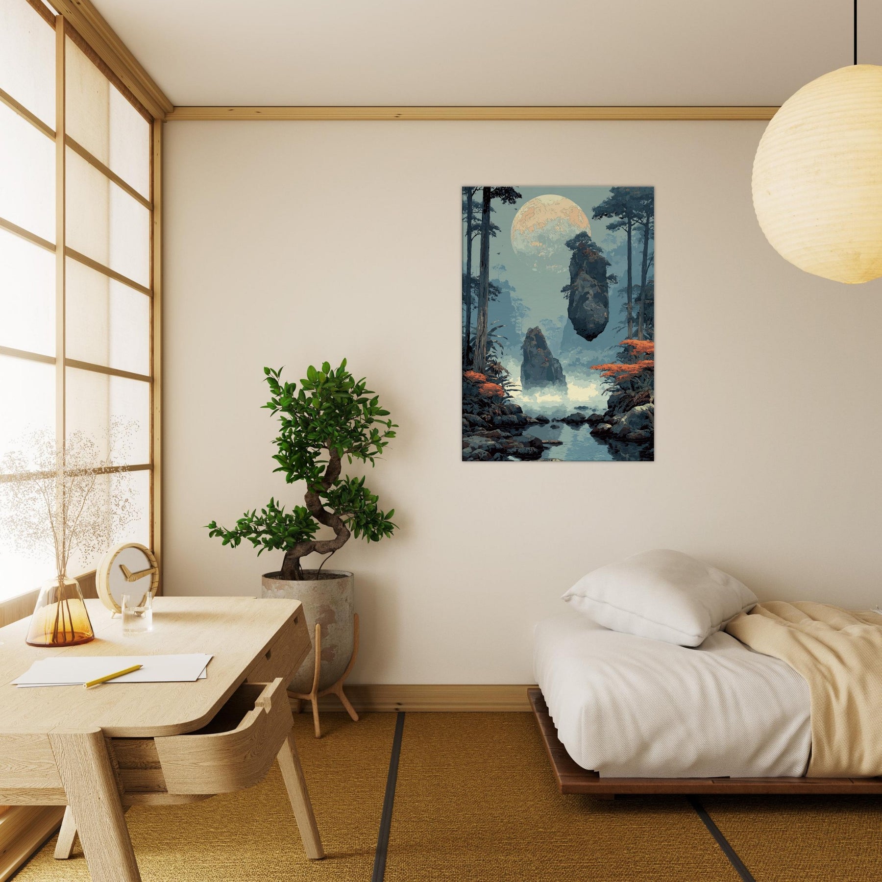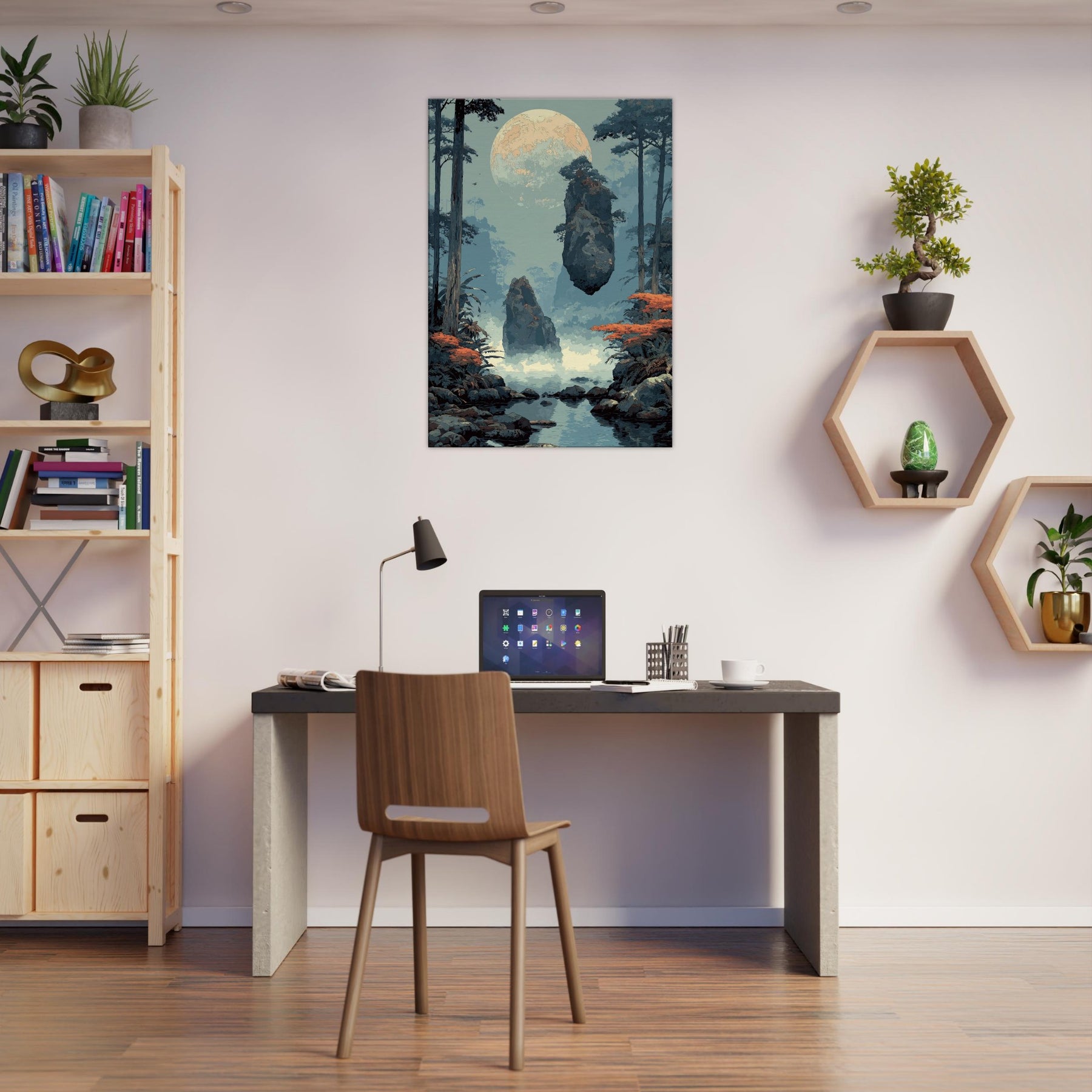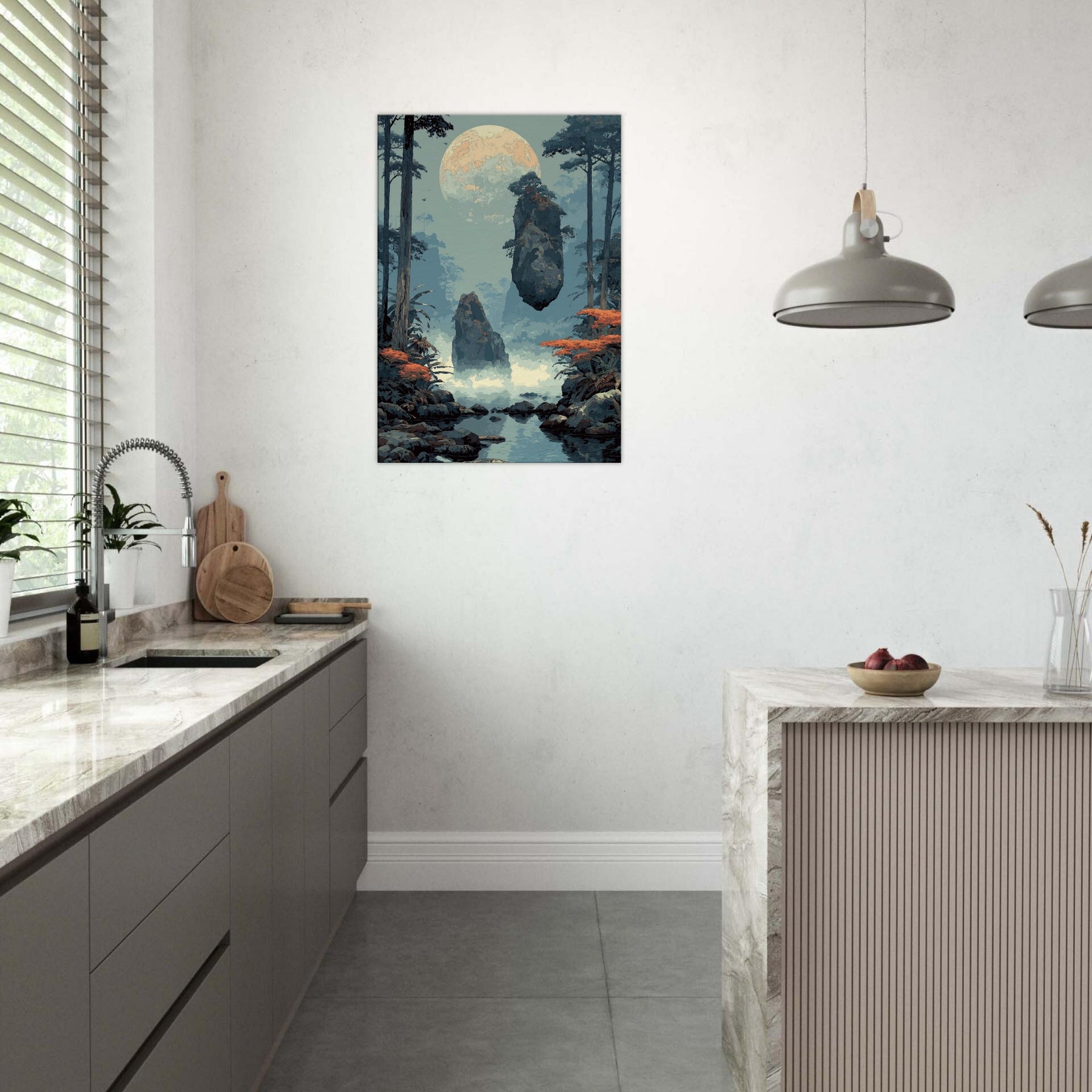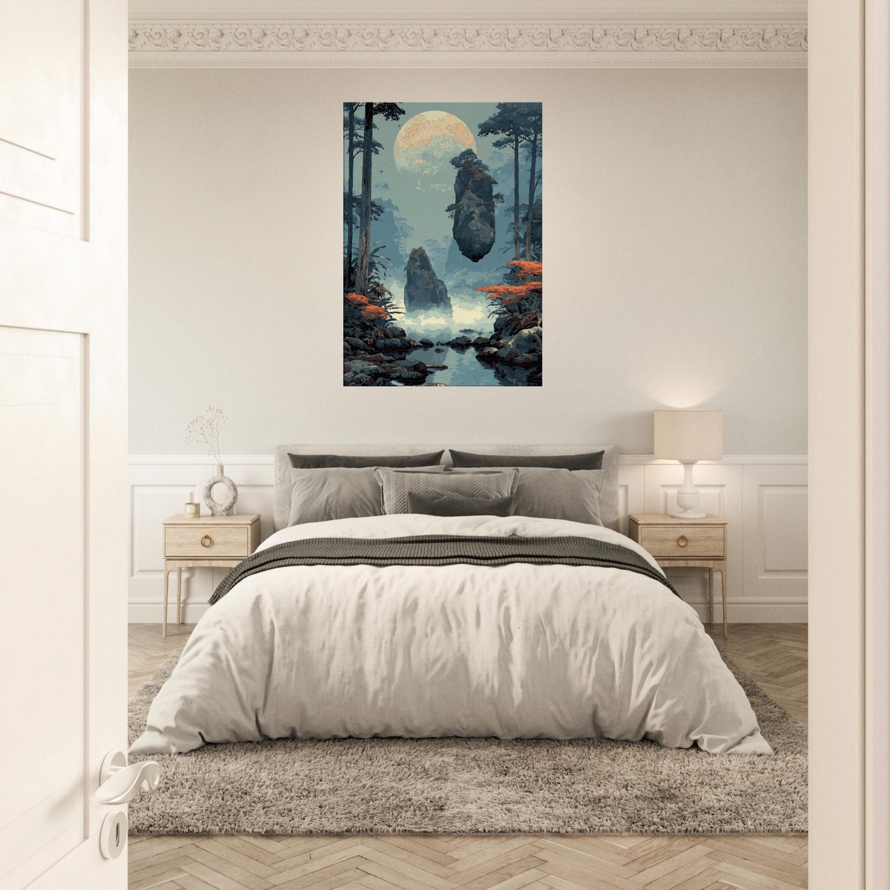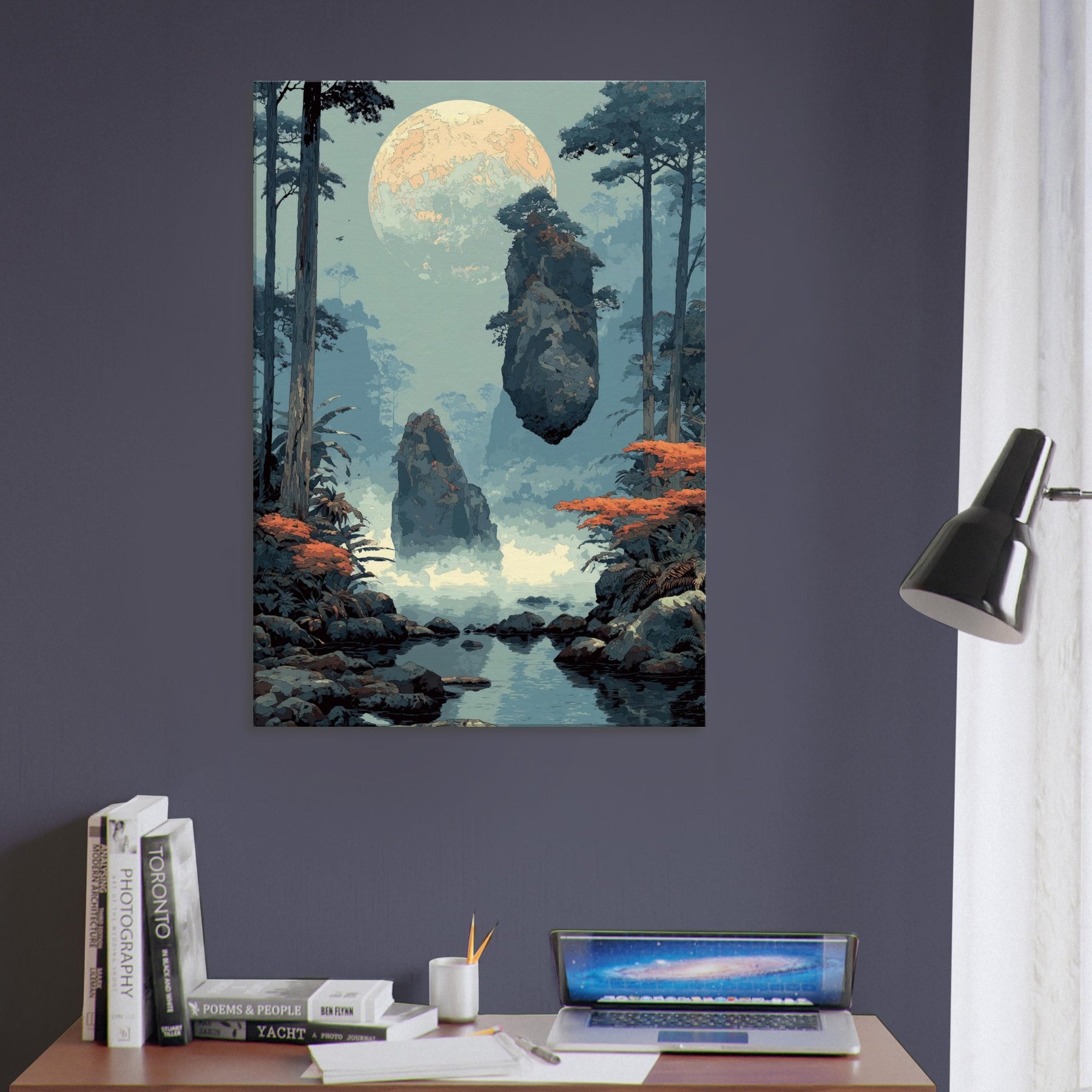 Let the Tropical Forest rise into your room as if a dream brushed by moonlight. This surreal composition invites the eye to drift along misty rivers, hovering rocks, and cotton soft horizons, turning your wall into a living sanctuary. The cool teals and cedar tones anchor a serene mood, while the buoyant forms spark curiosity and conversation. Perfect for a living space that values quiet wonder, it nourishes creativity, calm, and a sense of nature's ancient rhythm.