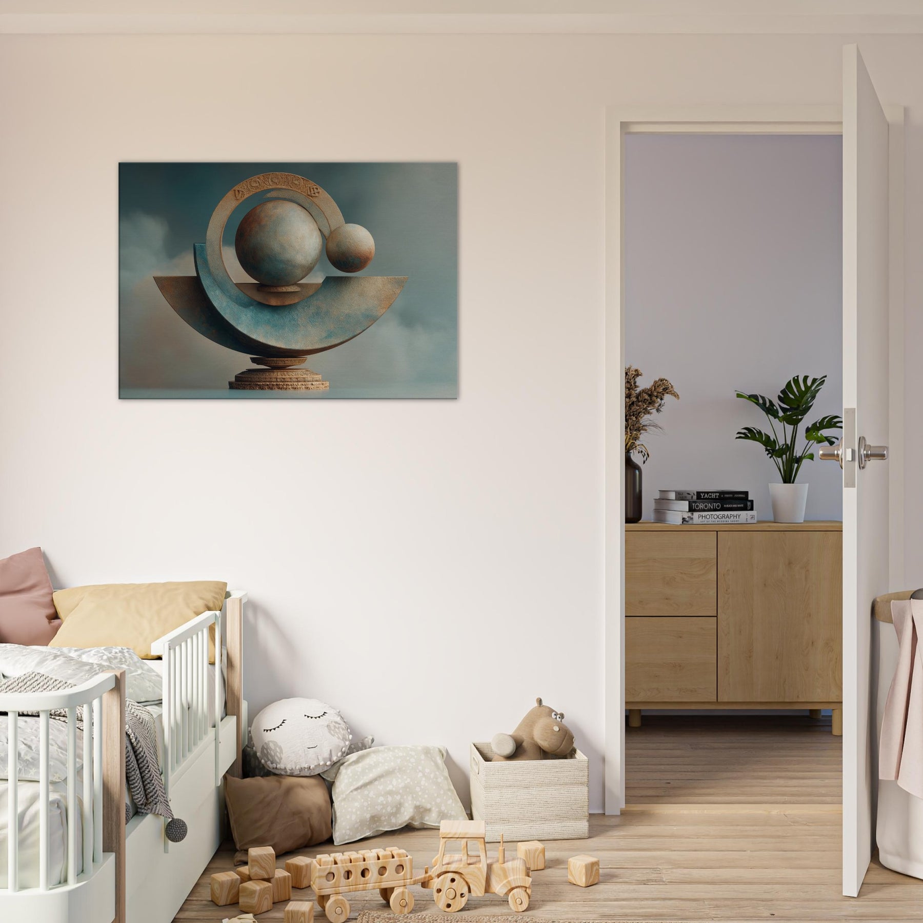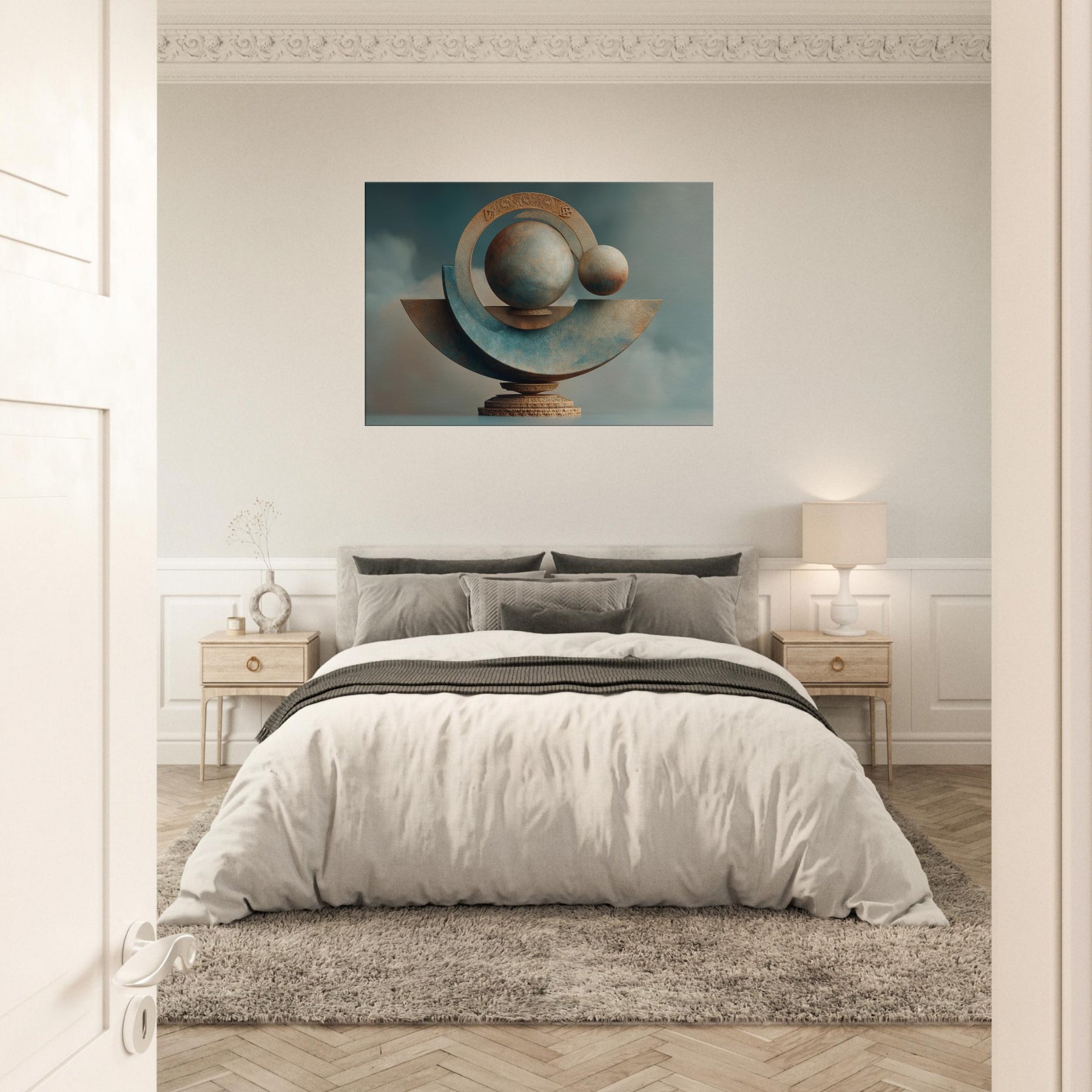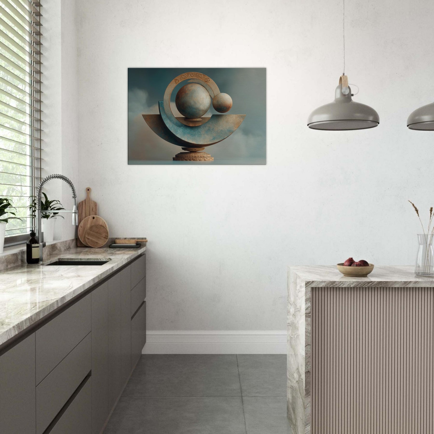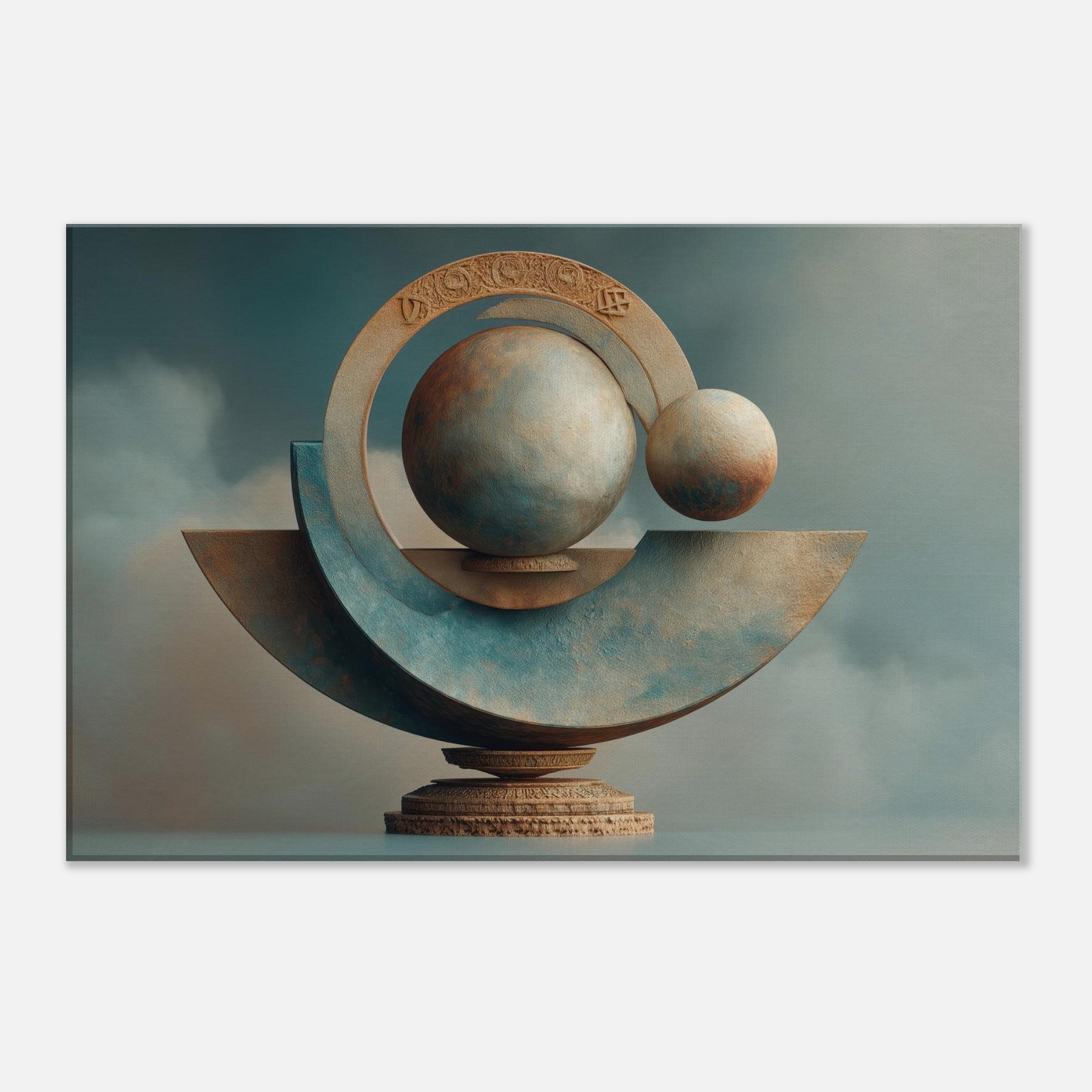 Celebrating Astrological Signs, this surreal sculpture unfurls a dreamlike balance of light and stone. Spheres drift within radiant rings, tracing a mystery beyond the ordinary, while a muted horizon grounds the piece in the room’s warmth. Its cool blues and sunlit ochres catch and soften every hour, turning walls into portals and night into a welcome ceremony. A living space anchor, it elevates everyday conversations into quiet wonder and transforms quiet corners into a mystic sanctuary.