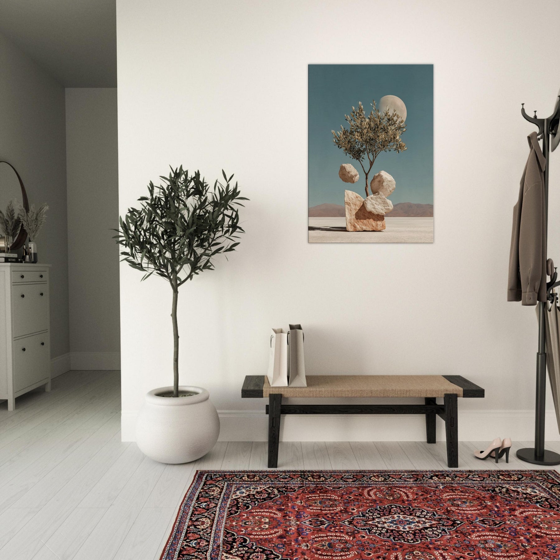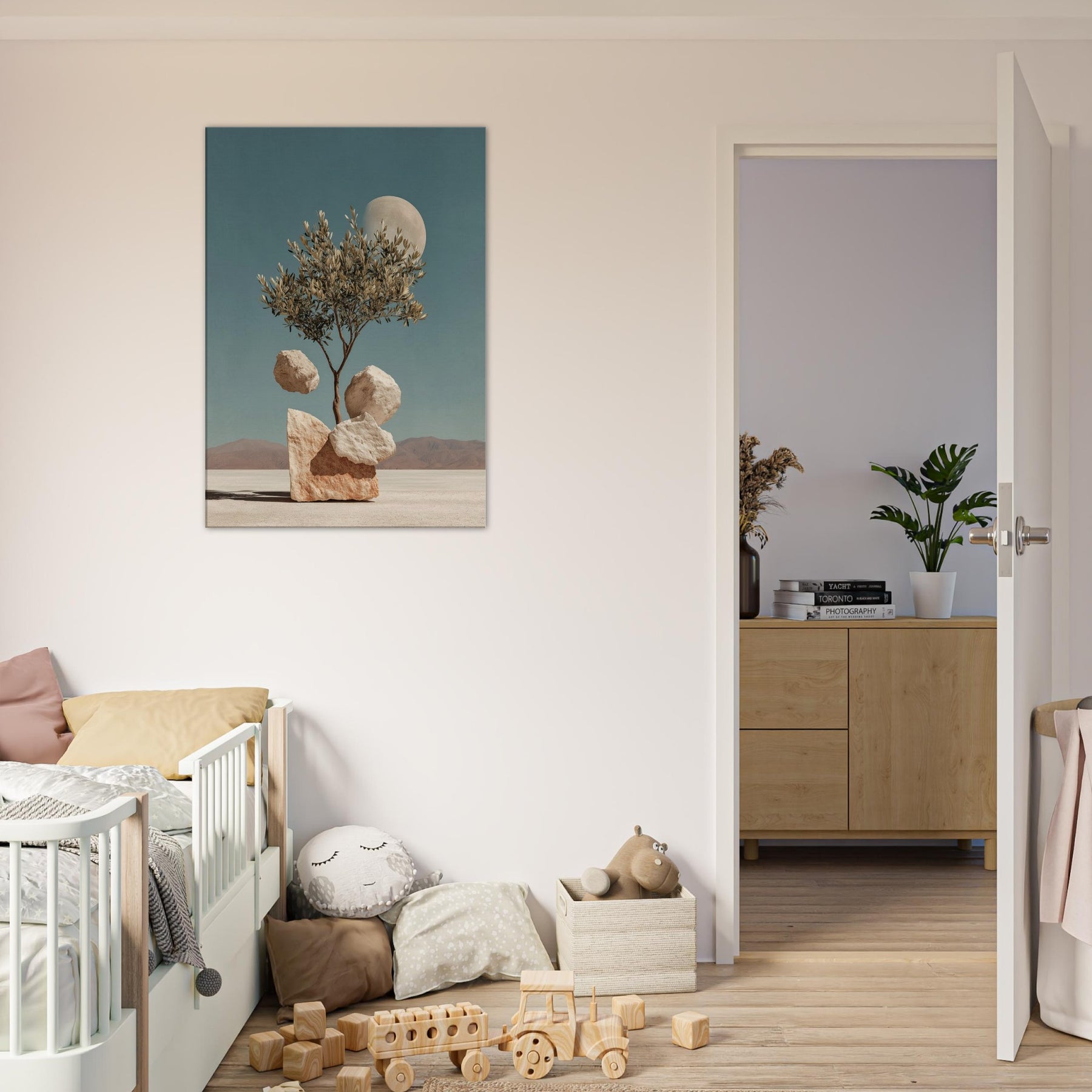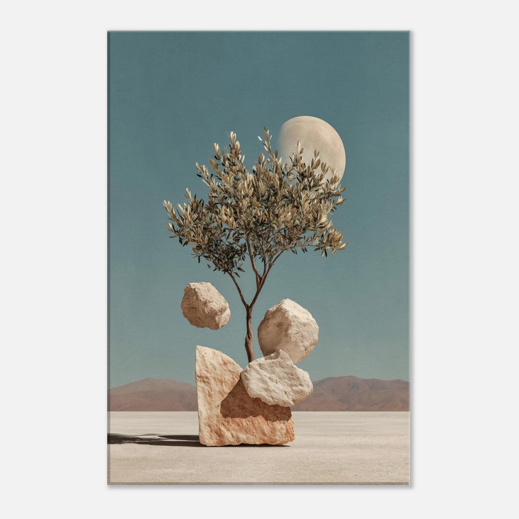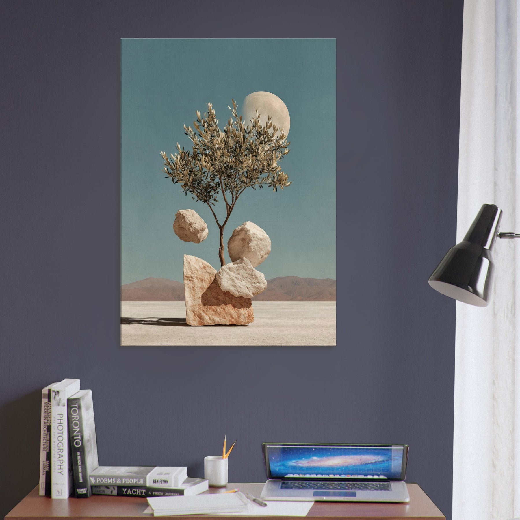 Olive Branch sits as the Primary Subject, rising above a playful cairn of stones in a dreamlike desert. Surreal light drapes the leaves, the moon lingers in the sky, and distant ranges blur into a hum of color. This piece invites calm, curiosity, and a slow breath the mood of a room that craves nature’s quiet grandeur. Its earthy palette and airy composition mingle easily with contemporary furniture, turning walls into a window to imagined landscapes.
