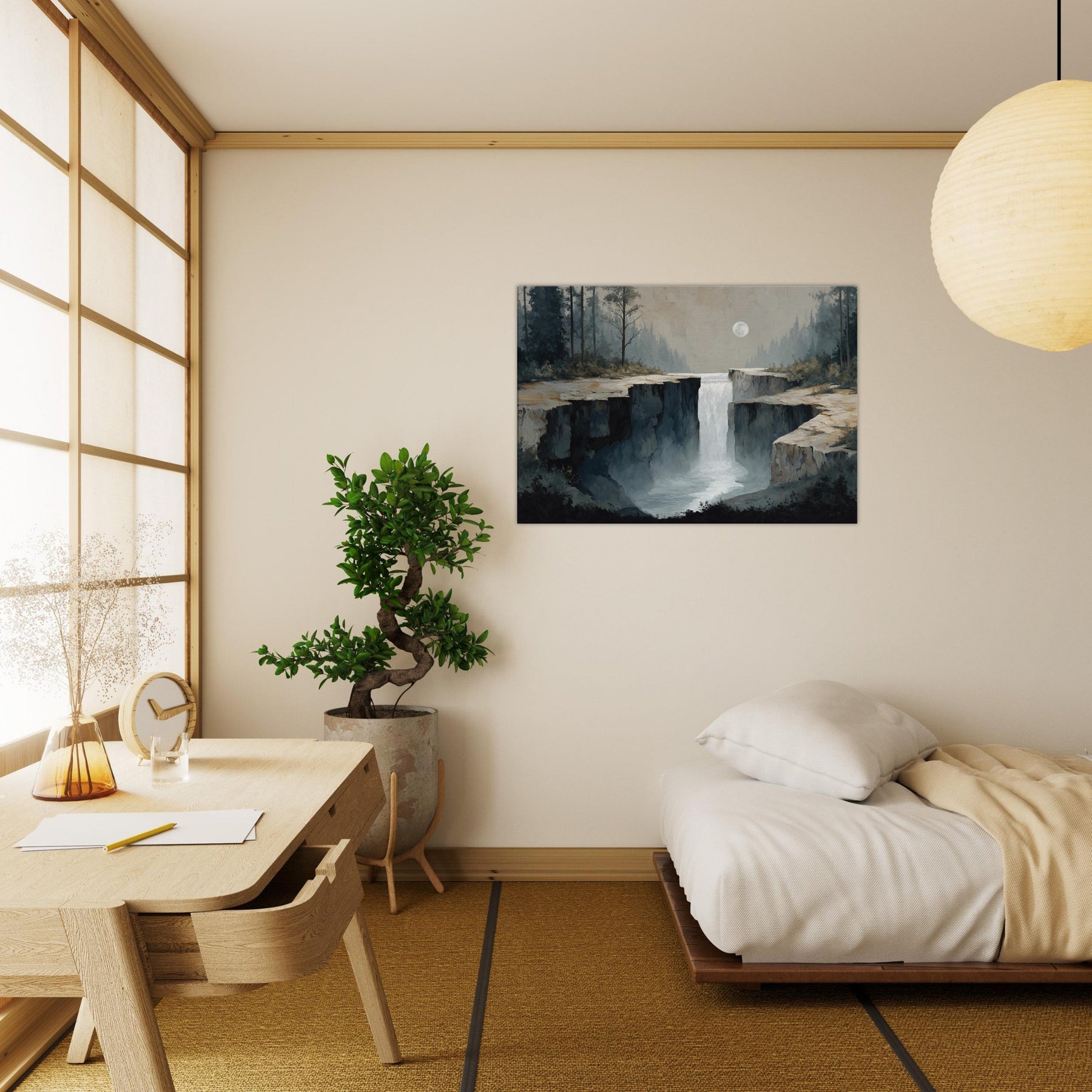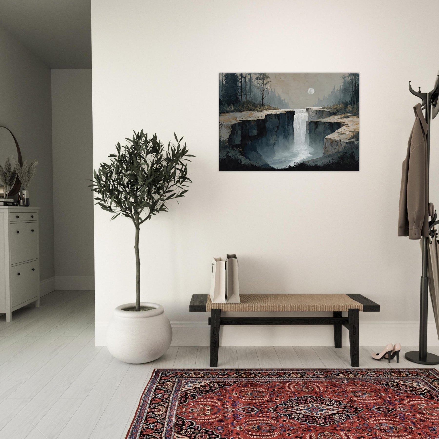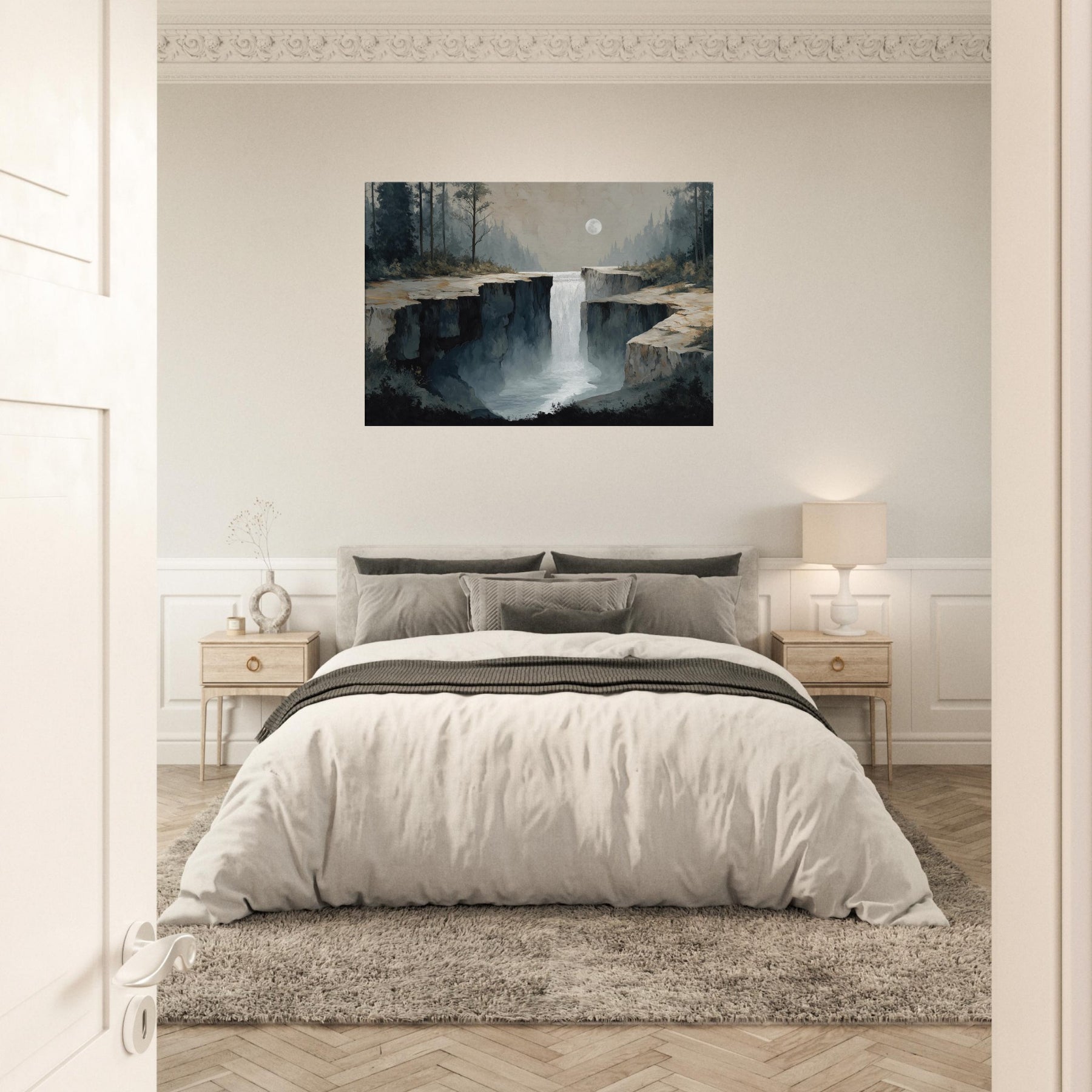 Under a pale moon, this Waterfall threads a surreal dreamscape where cliff edges fracture into light and mist. A hush of water spills into a luminous pool, while forest silhouettes lean toward the glow. The scene invites quiet reflection, as if a hidden world breathes at the edge of your room. Hang it to soften edges with cool tones, or to anchor a living space with timeless calm. Its sense of movement and distance expands everyday moments into a tranquil, contemplative atmosphere.