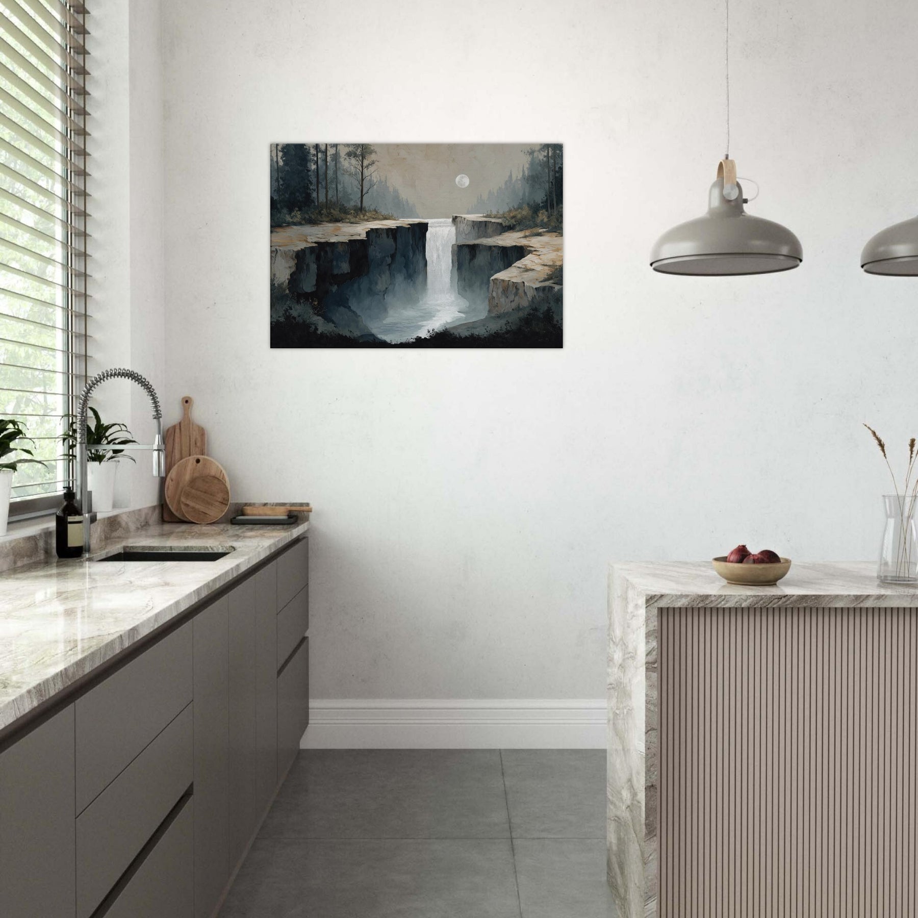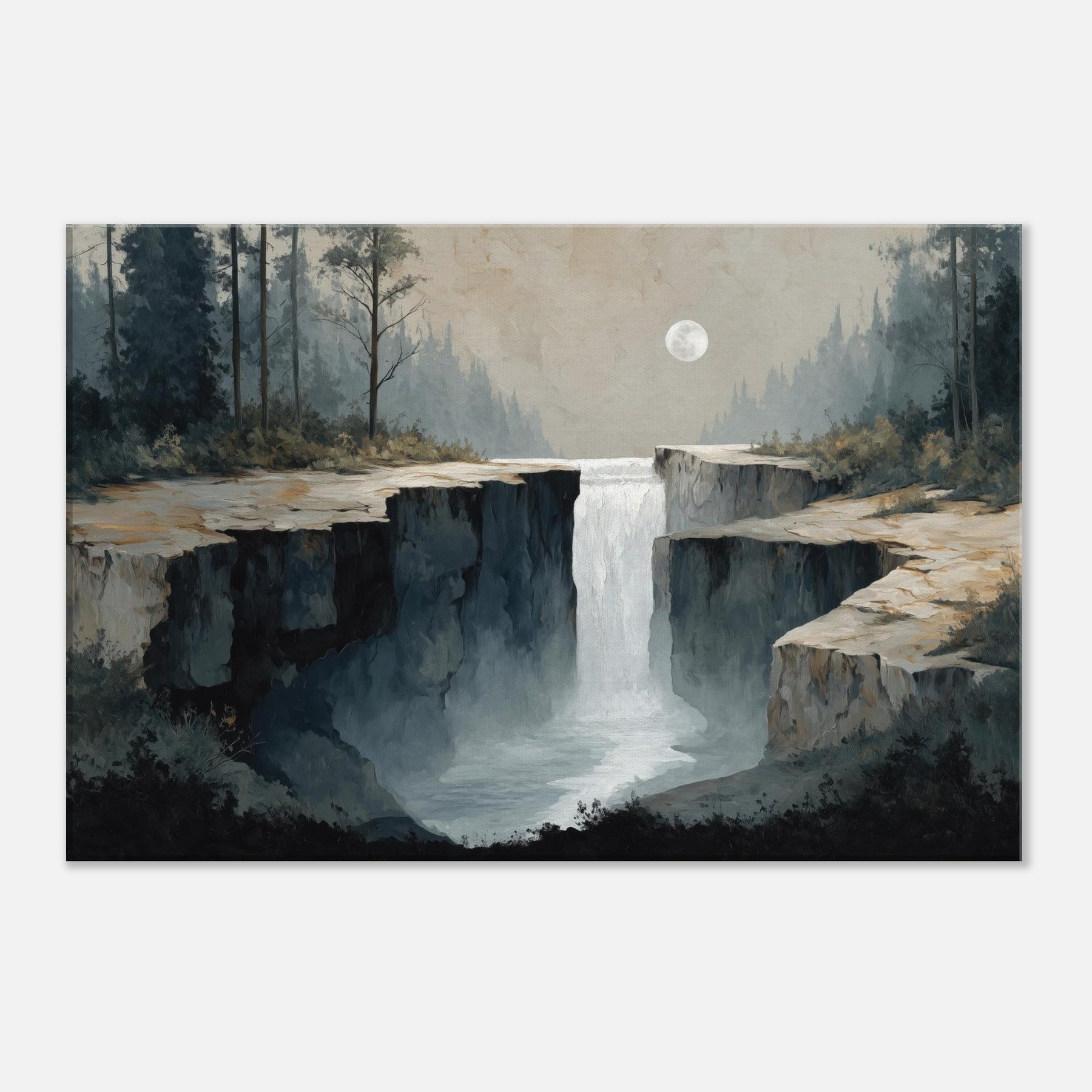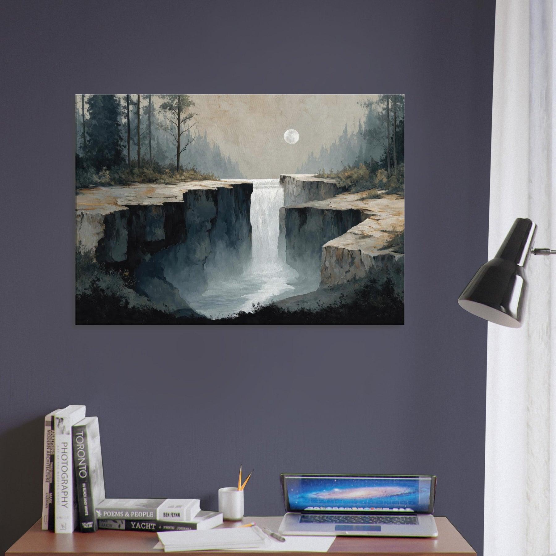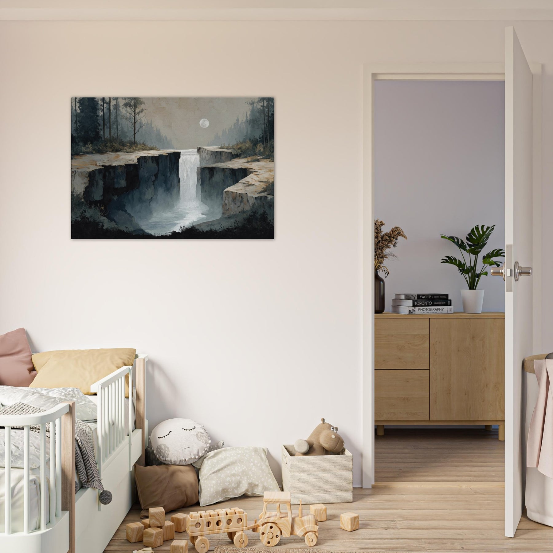 Under a pale moon, this Waterfall threads a surreal dreamscape where cliff edges fracture into light and mist. A hush of water spills into a luminous pool, while forest silhouettes lean toward the glow. The scene invites quiet reflection, as if a hidden world breathes at the edge of your room. Hang it to soften edges with cool tones, or to anchor a living space with timeless calm. Its sense of movement and distance expands everyday moments into a tranquil, contemplative atmosphere.