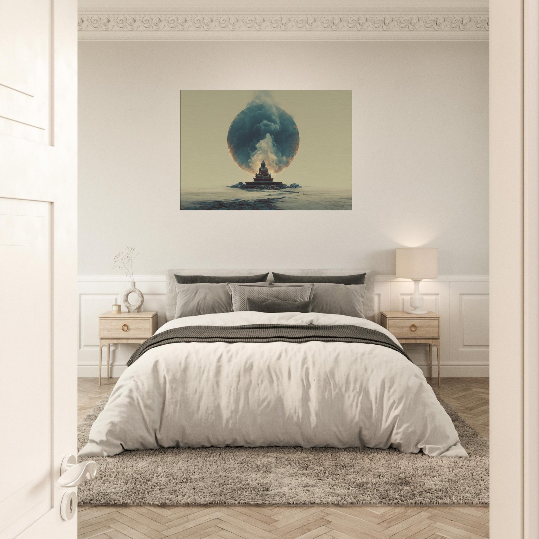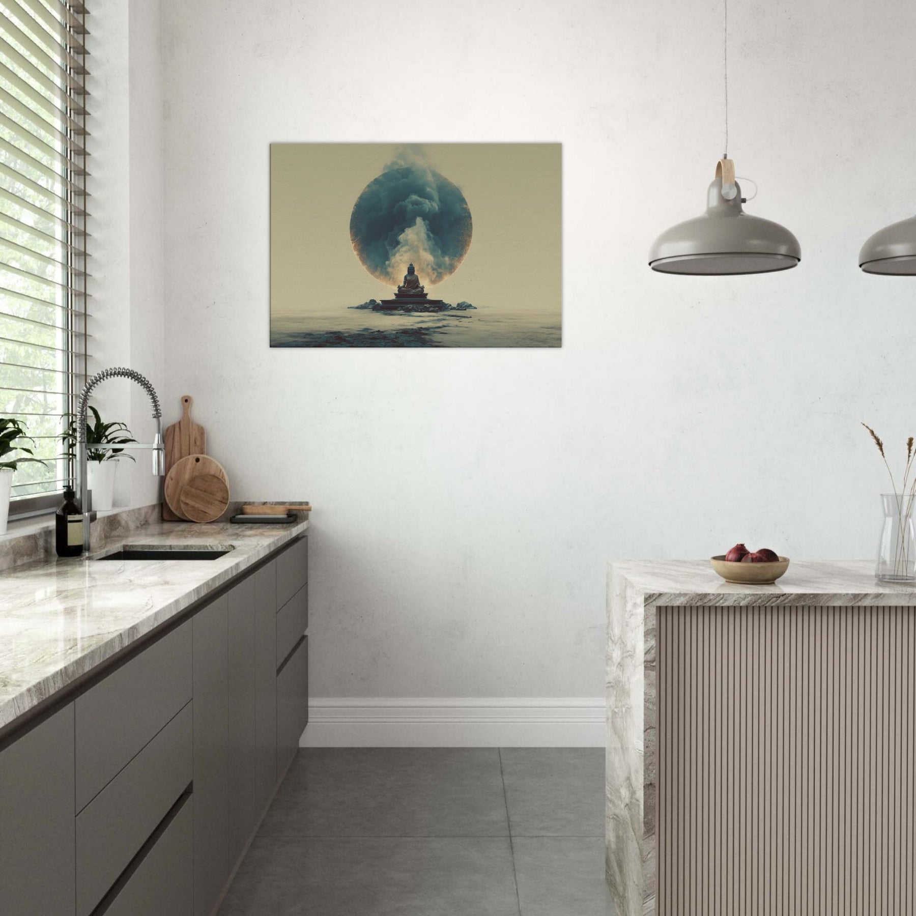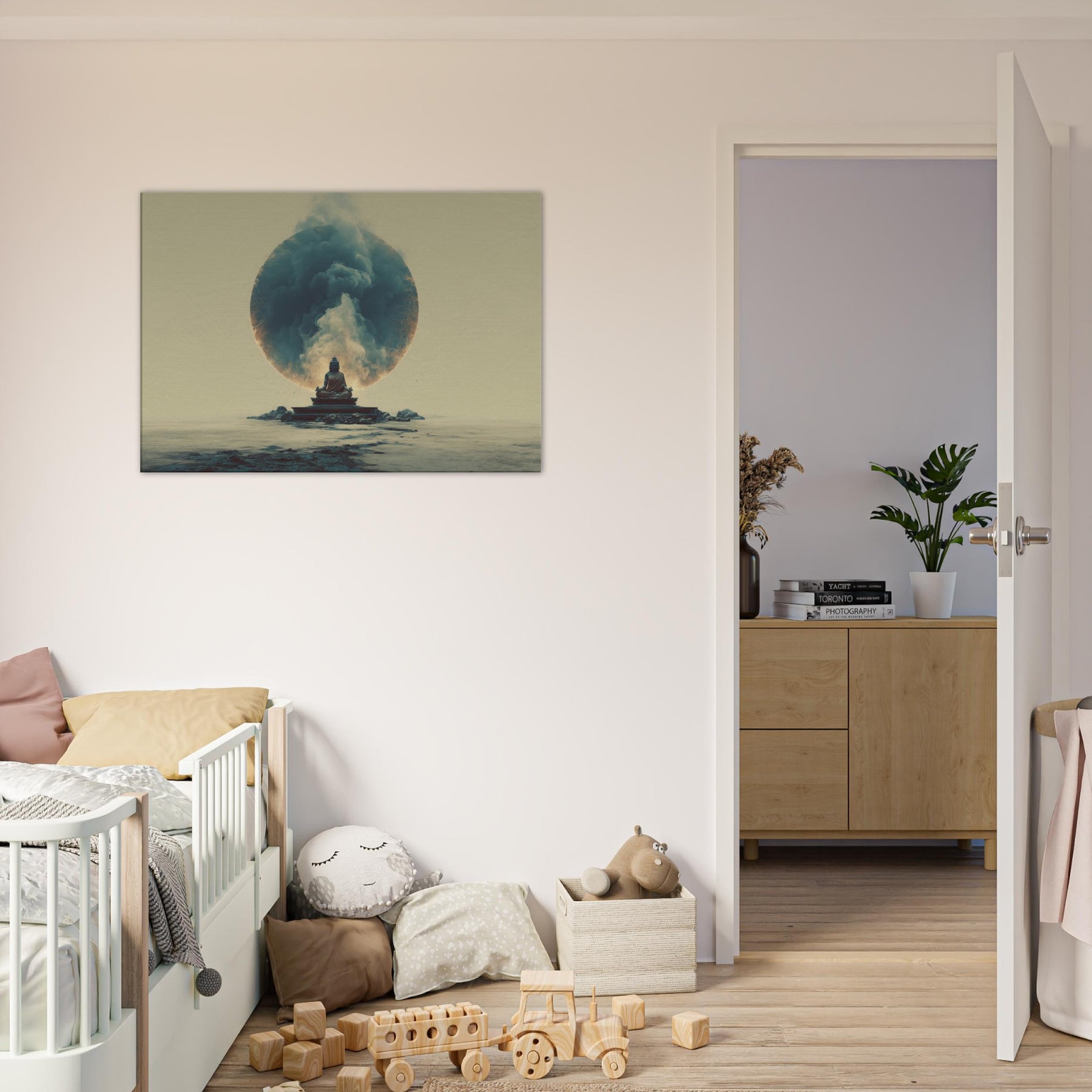 Through a dreamlike circle of clouds and moonlit light, Lakshmi sits in serene meditation, her presence crowned by a radiant halo. Surreal currents of gold and azure drape the scene, turning the wall into a sanctuary of abundance and quiet. The composition blends temple ritual with cosmic wonder, inviting breath and balance into any living space. A centerpiece that feels timeless, it pairs refinement with mysticism, inspiring generosity, hope, and a contemplative glow.