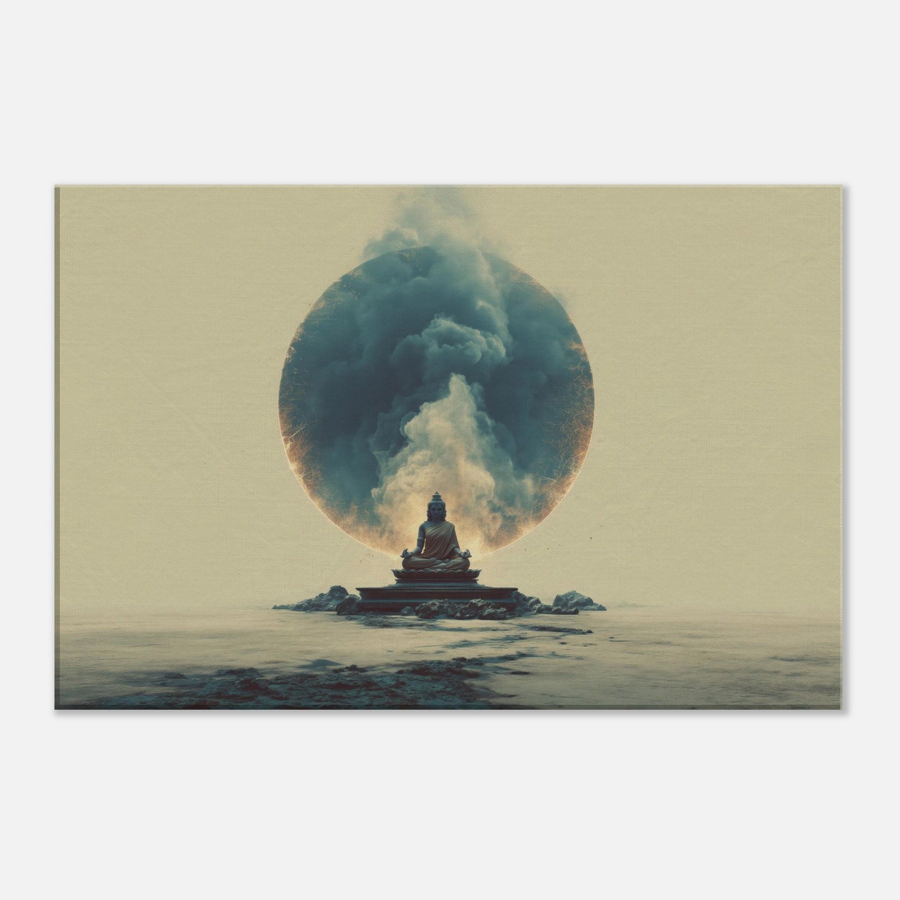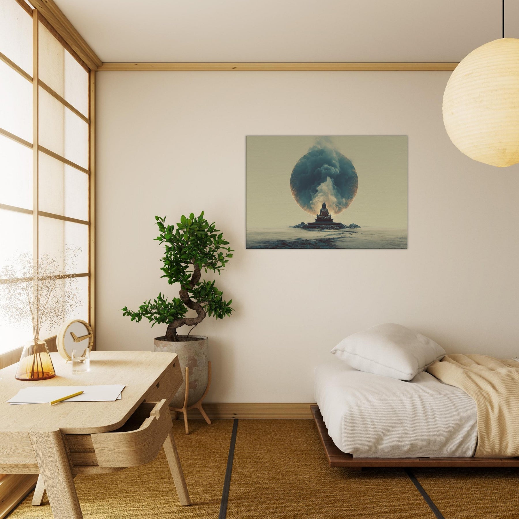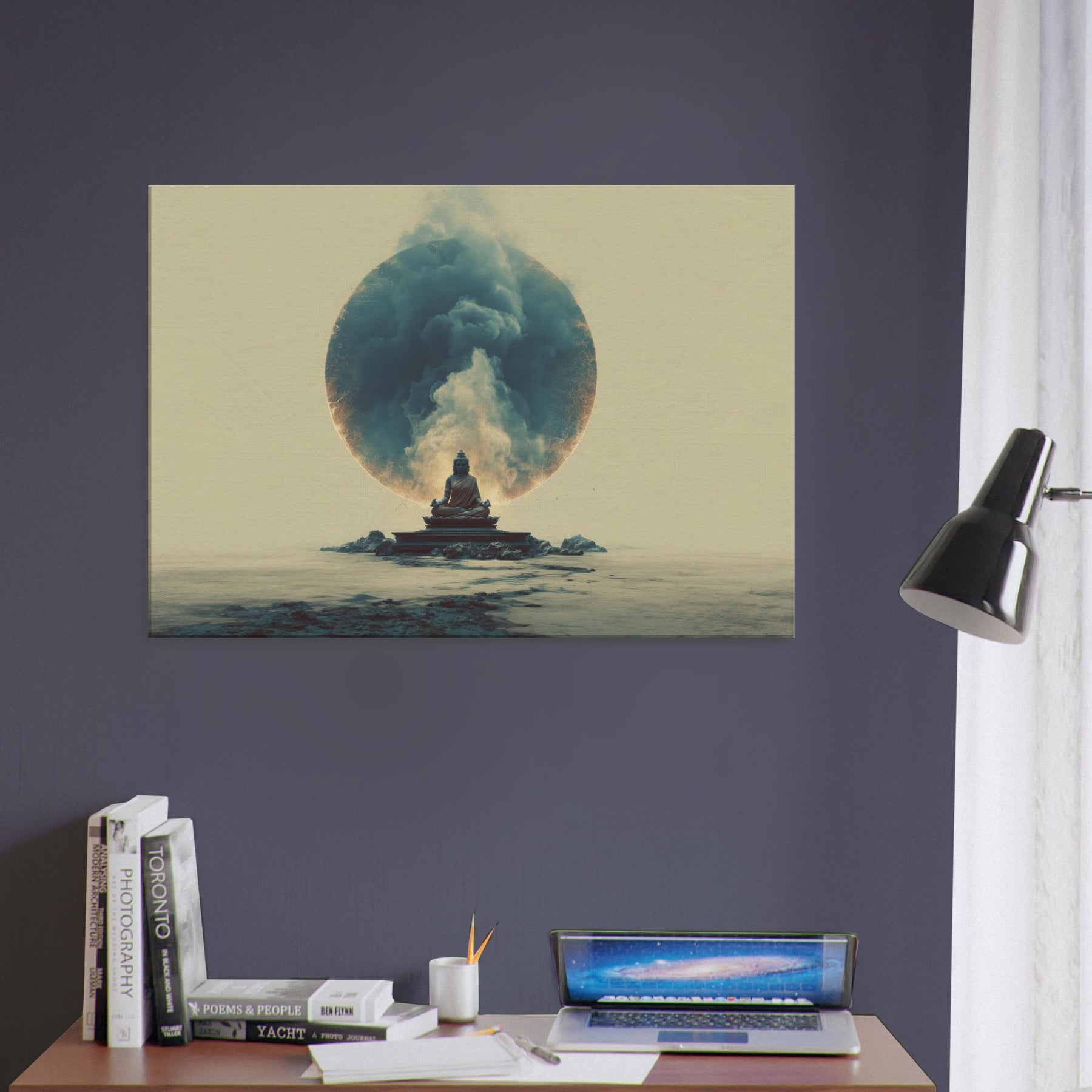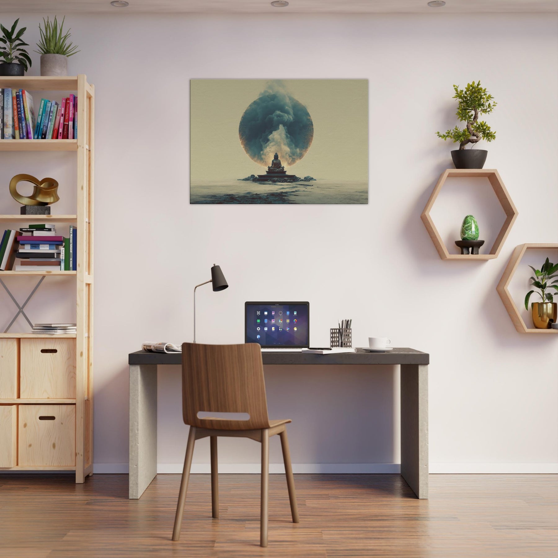 Through a dreamlike circle of clouds and moonlit light, Lakshmi sits in serene meditation, her presence crowned by a radiant halo. Surreal currents of gold and azure drape the scene, turning the wall into a sanctuary of abundance and quiet. The composition blends temple ritual with cosmic wonder, inviting breath and balance into any living space. A centerpiece that feels timeless, it pairs refinement with mysticism, inspiring generosity, hope, and a contemplative glow.