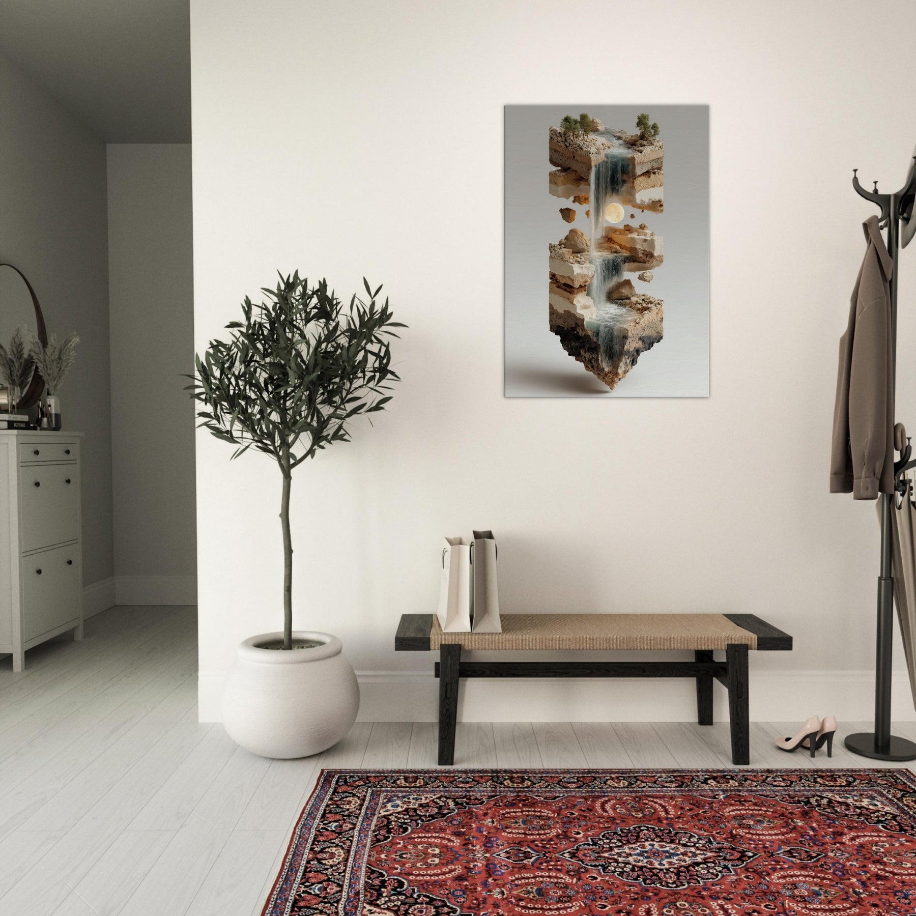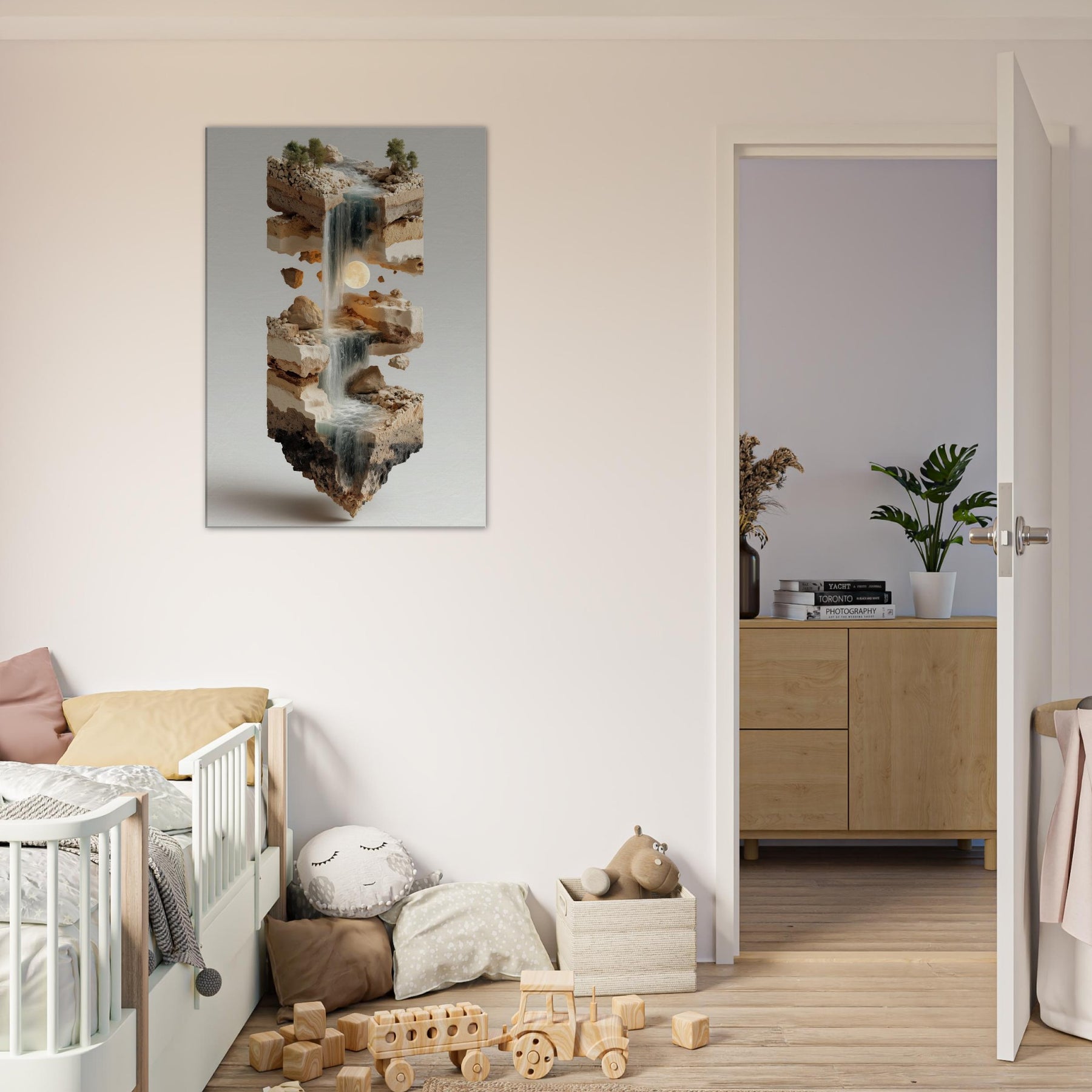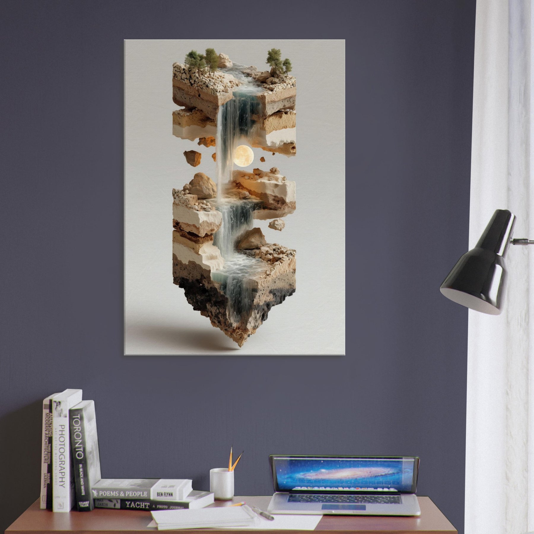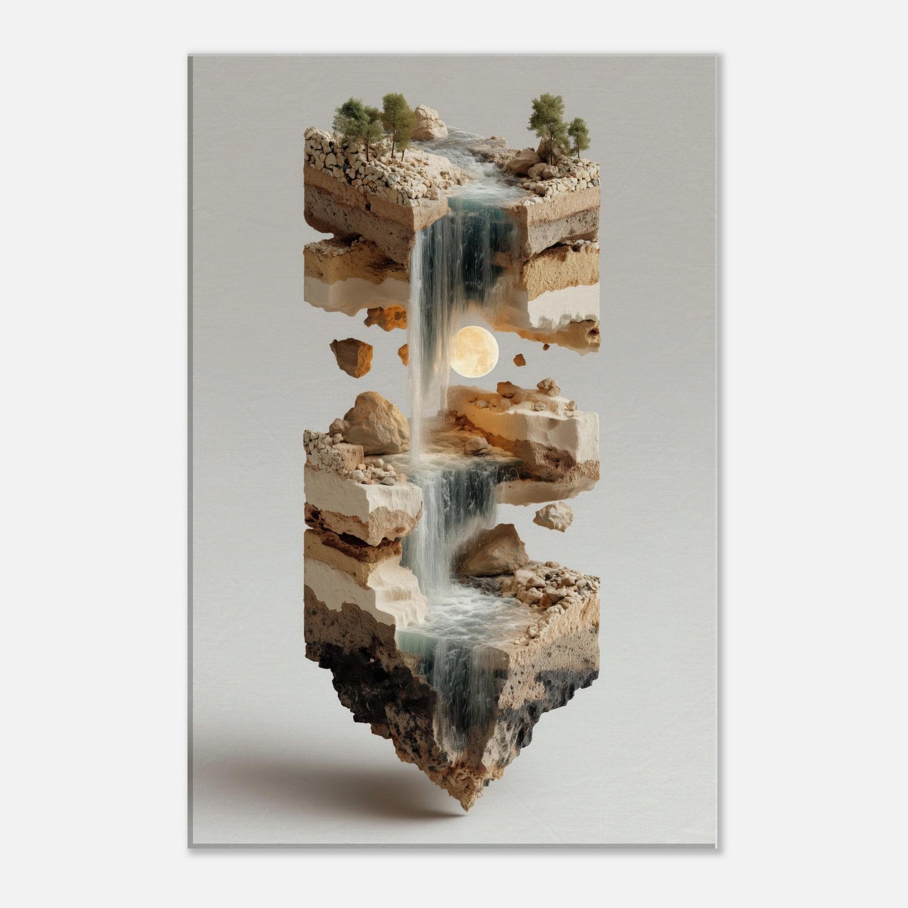 Let Tropical Rain fall through a dreamlike terrace of stone and sky. This Surreal composition constructed from suspended earth, delicate waterfalls, and a quiet lunar glow invites stillness and wonder. Each fractured layer suggests a that breathes between memory and fantasy, turning living rooms into intimate sanctuaries. Hang this piece where light can travel across its cascading textures, and let the atmosphere soften conversations, slow footsteps, and bring the scent of rain washed air to everyday moments.