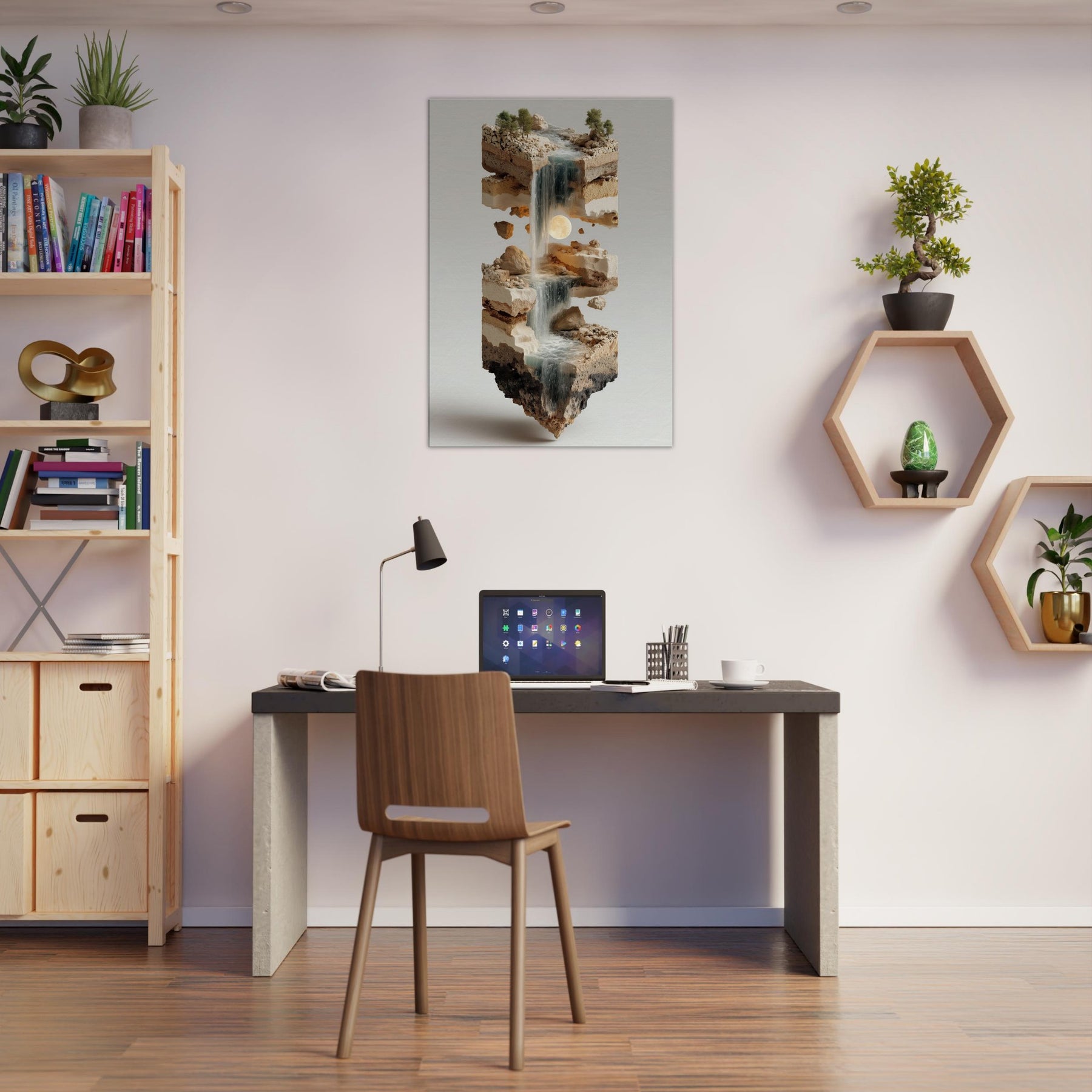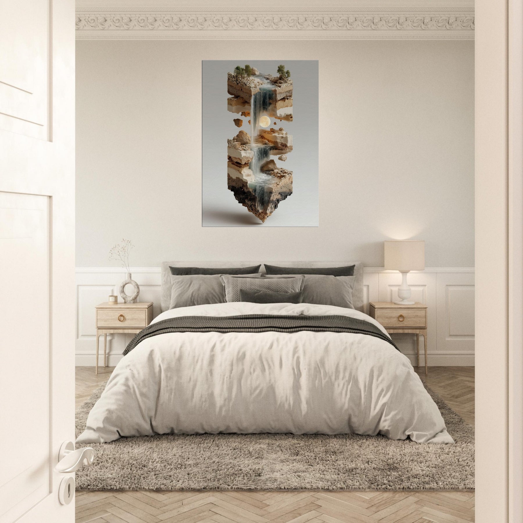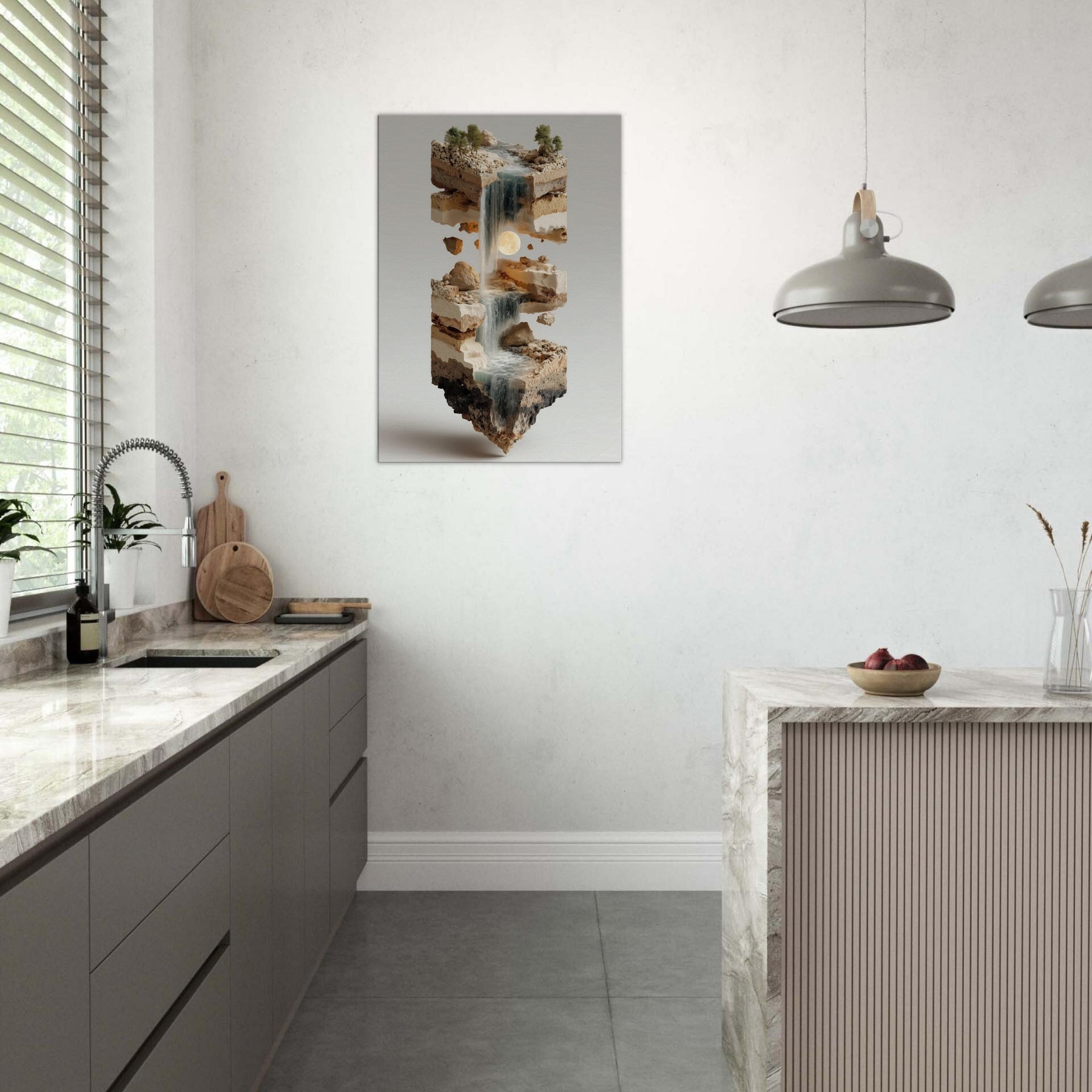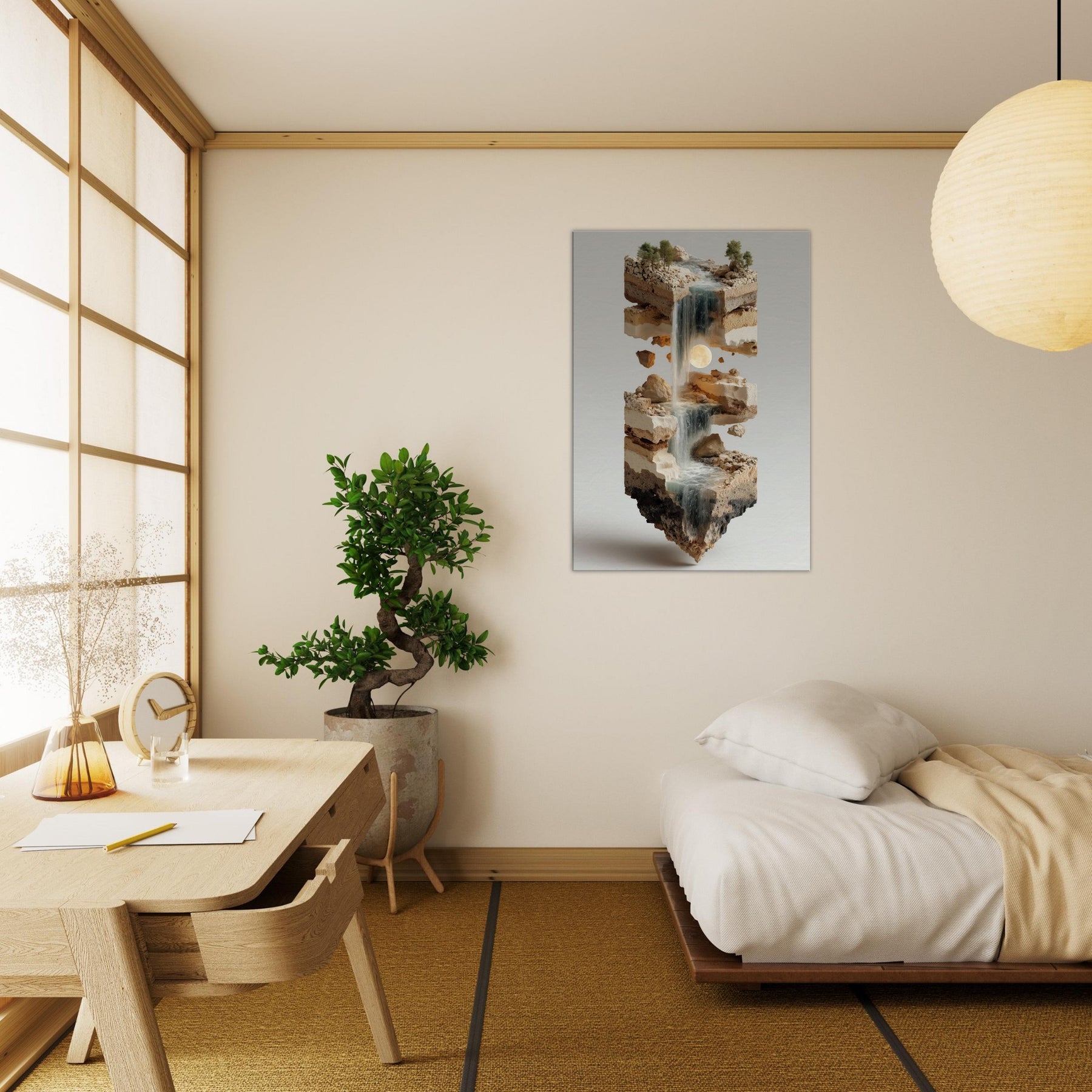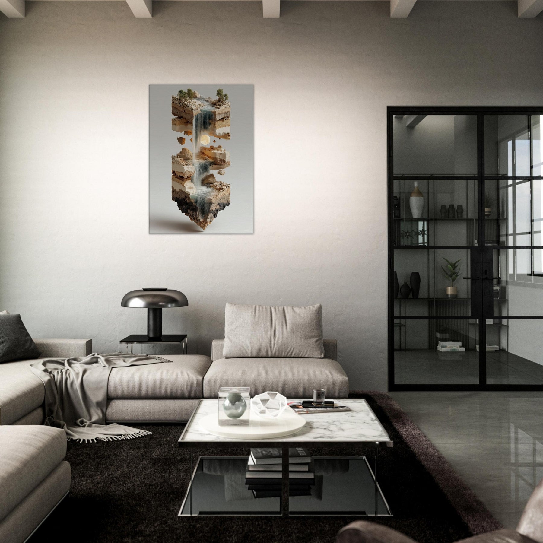 Let Tropical Rain fall through a dreamlike terrace of stone and sky. This Surreal composition constructed from suspended earth, delicate waterfalls, and a quiet lunar glow invites stillness and wonder. Each fractured layer suggests a that breathes between memory and fantasy, turning living rooms into intimate sanctuaries. Hang this piece where light can travel across its cascading textures, and let the atmosphere soften conversations, slow footsteps, and bring the scent of rain washed air to everyday moments.