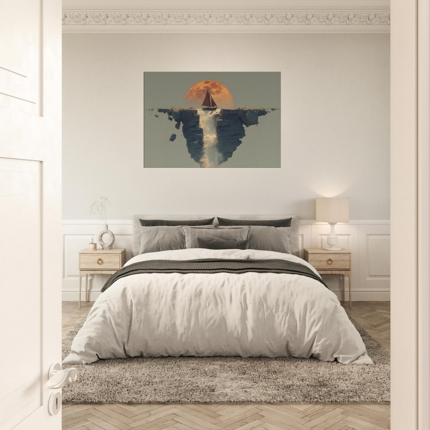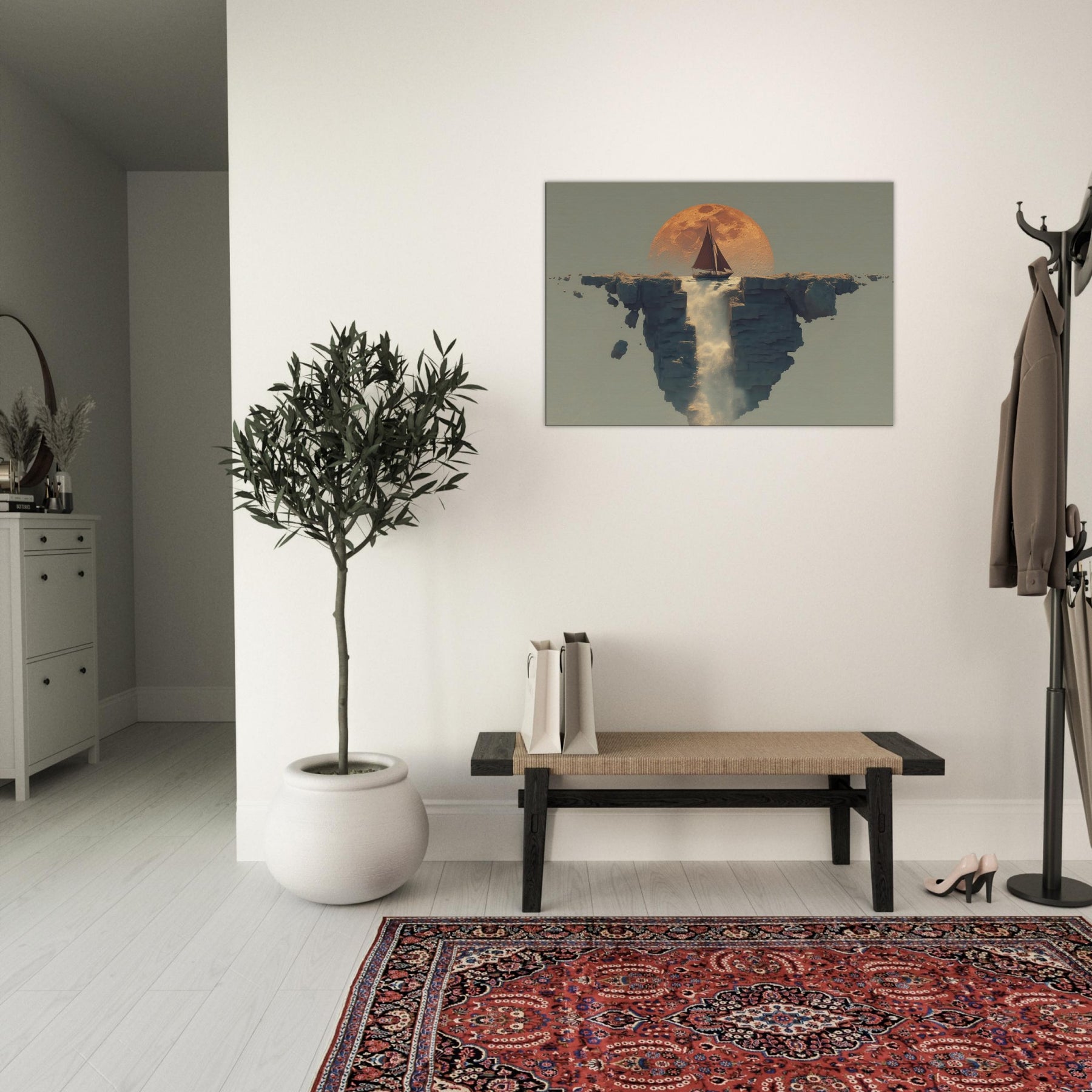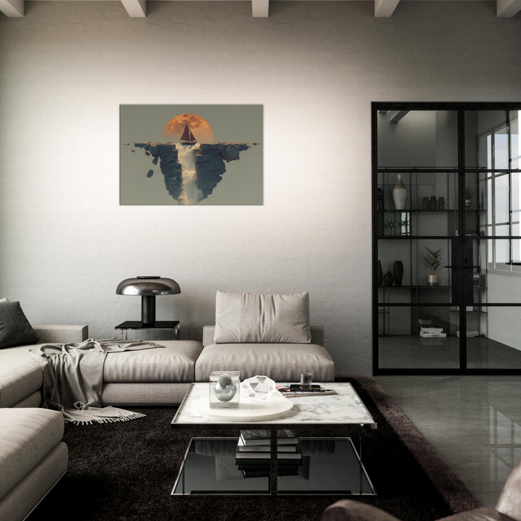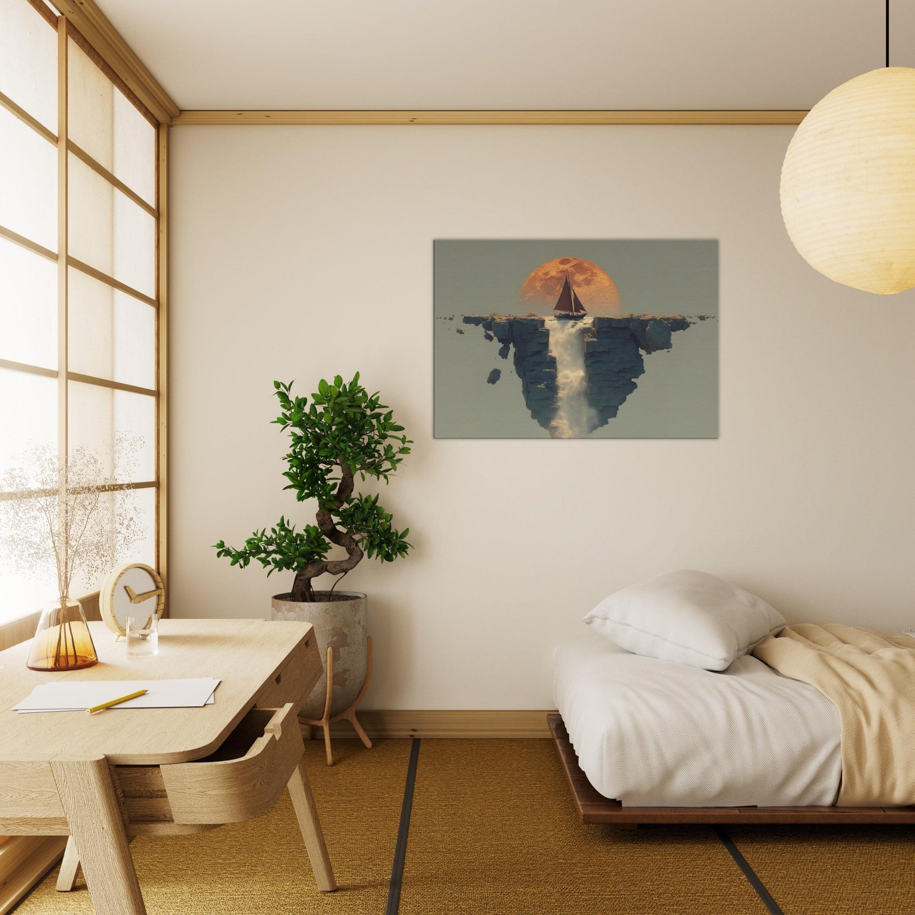 Glide into a quiet, otherworldly horizon with the Sailboat Silhouette as your guide. A suspended cliff, a cascading veil of light, and a copper orange moon conspire to invite reflection and calm. This artwork wraps a room in soft warmth and airy depth, turning a wall into a window of dreamlike travel. Ideal for living rooms and bedrooms seeking serenity, it invites slow gaze, whispered conversations, and a sense of perpetual quiet adventure.