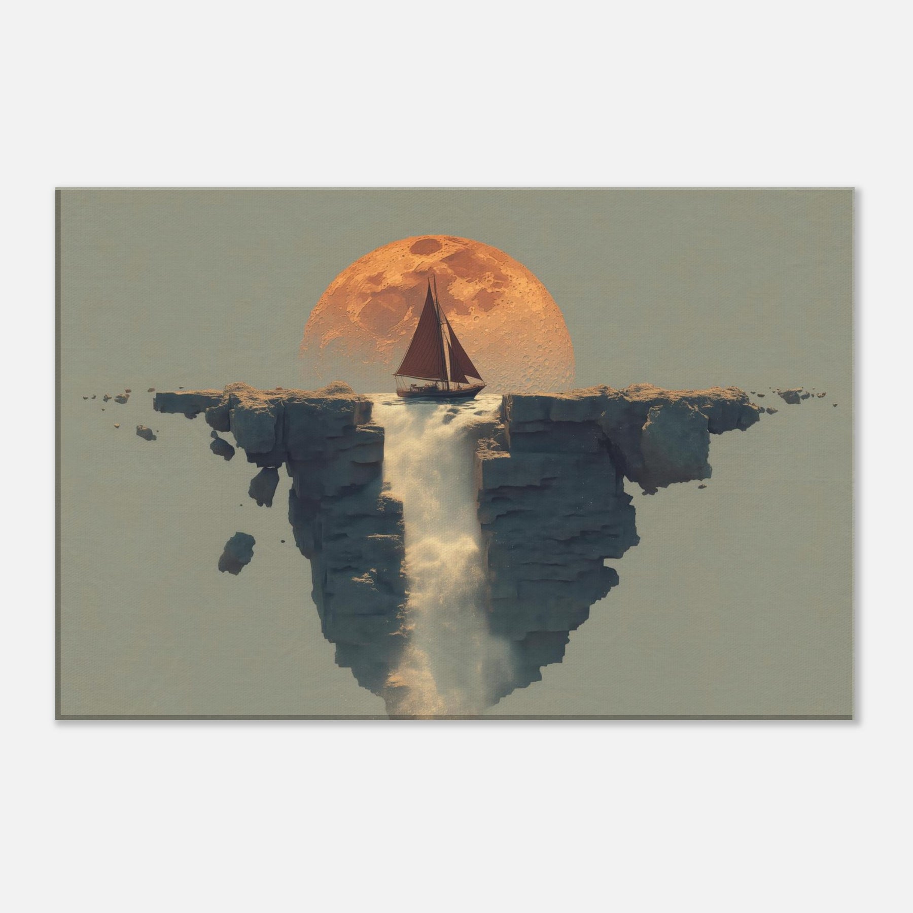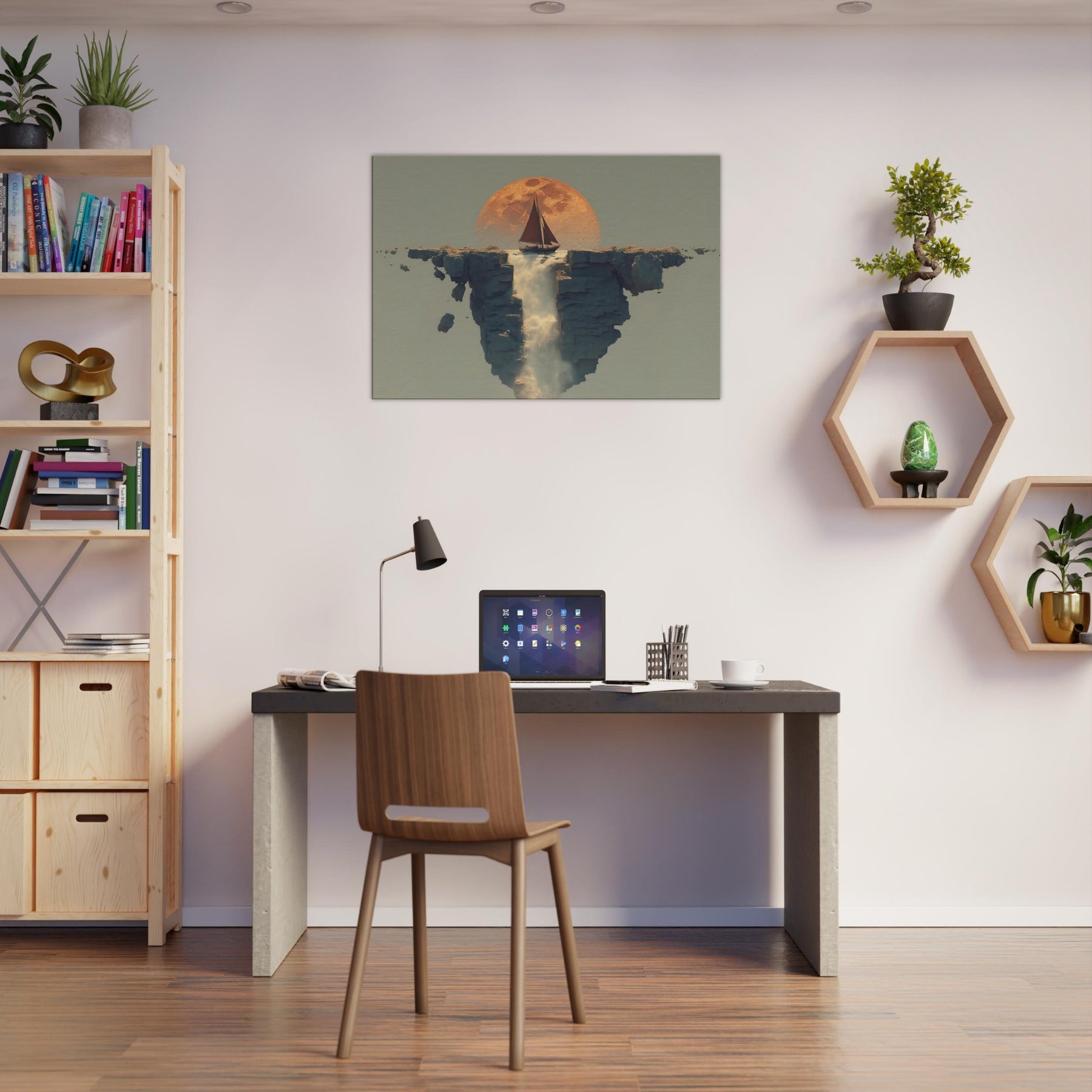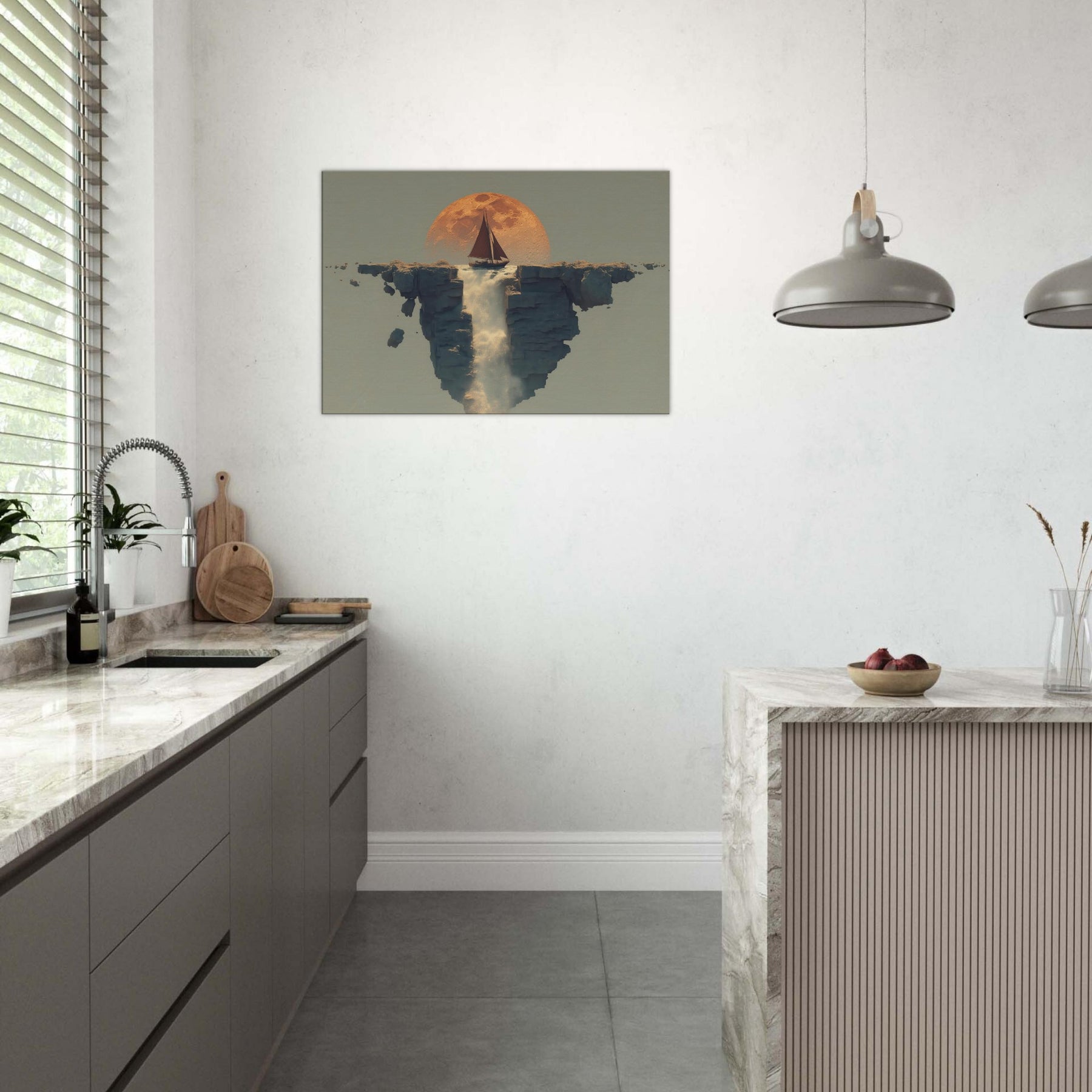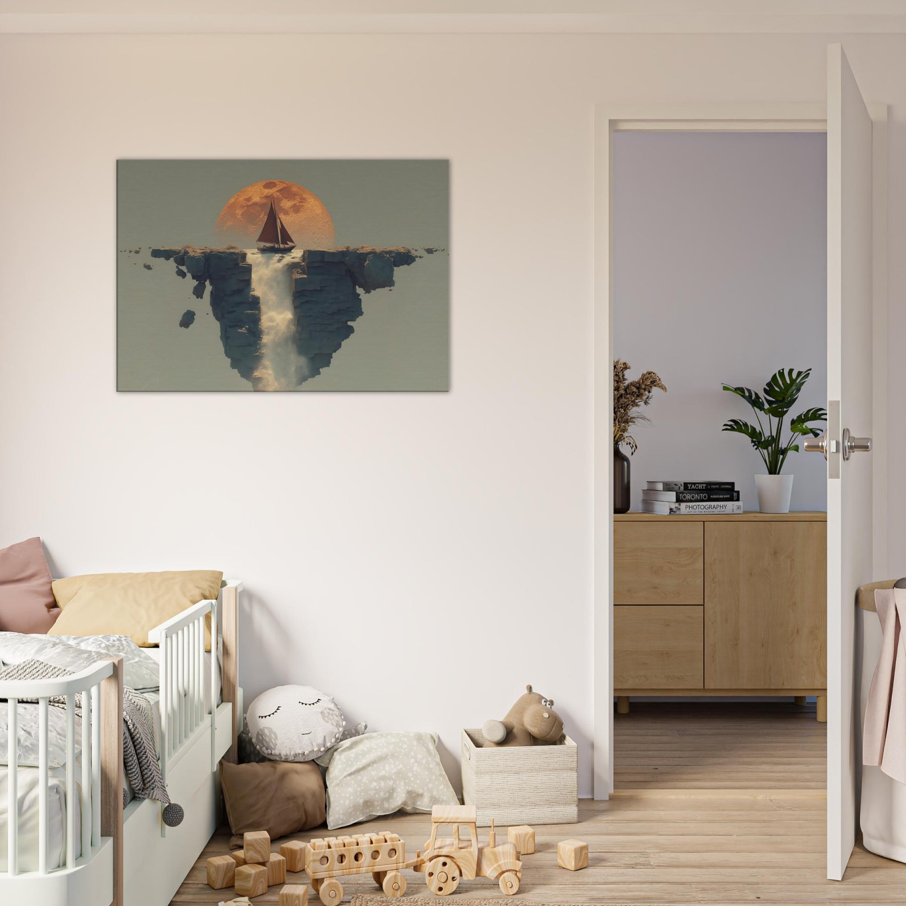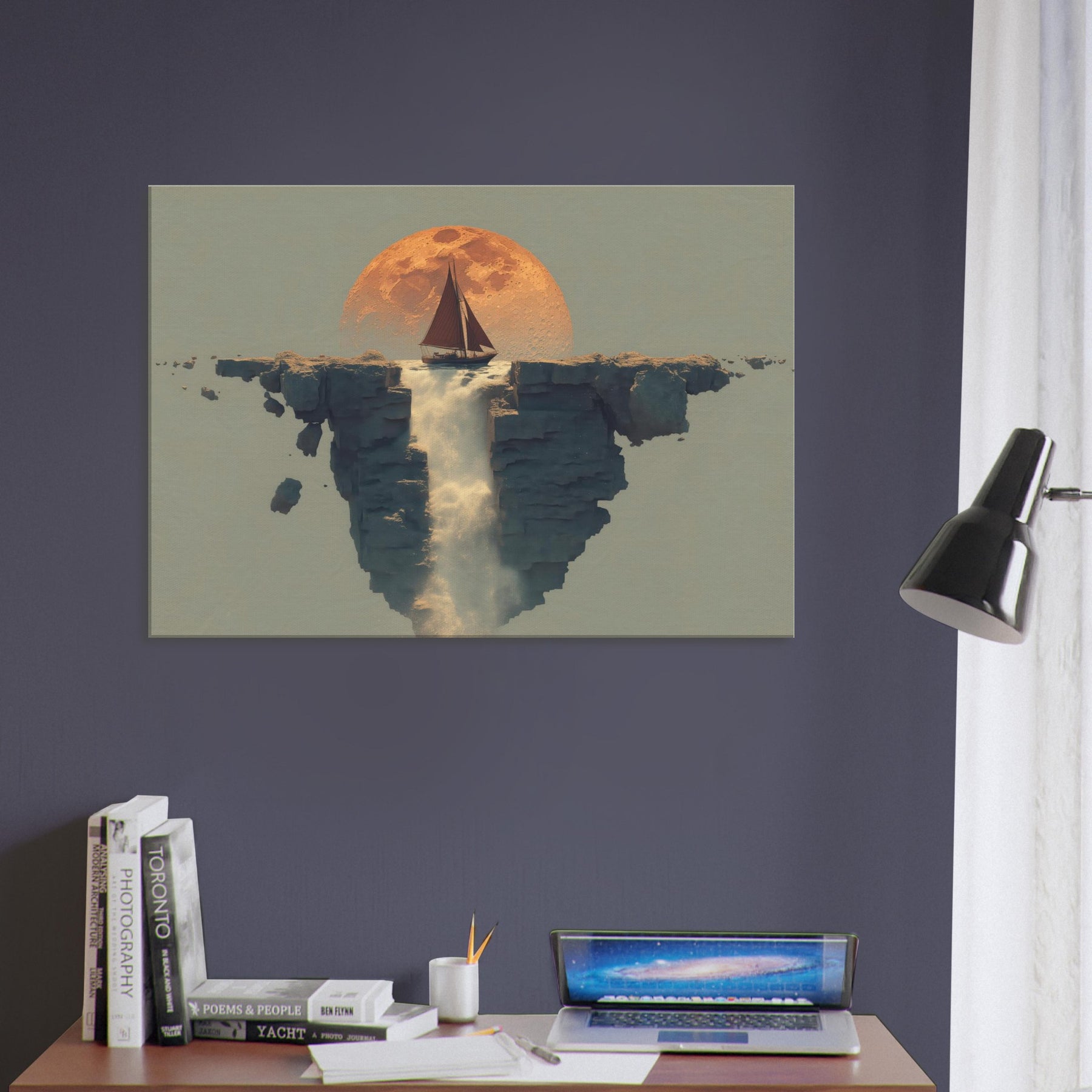 Glide into a quiet, otherworldly horizon with the Sailboat Silhouette as your guide. A suspended cliff, a cascading veil of light, and a copper orange moon conspire to invite reflection and calm. This artwork wraps a room in soft warmth and airy depth, turning a wall into a window of dreamlike travel. Ideal for living rooms and bedrooms seeking serenity, it invites slow gaze, whispered conversations, and a sense of perpetual quiet adventure.