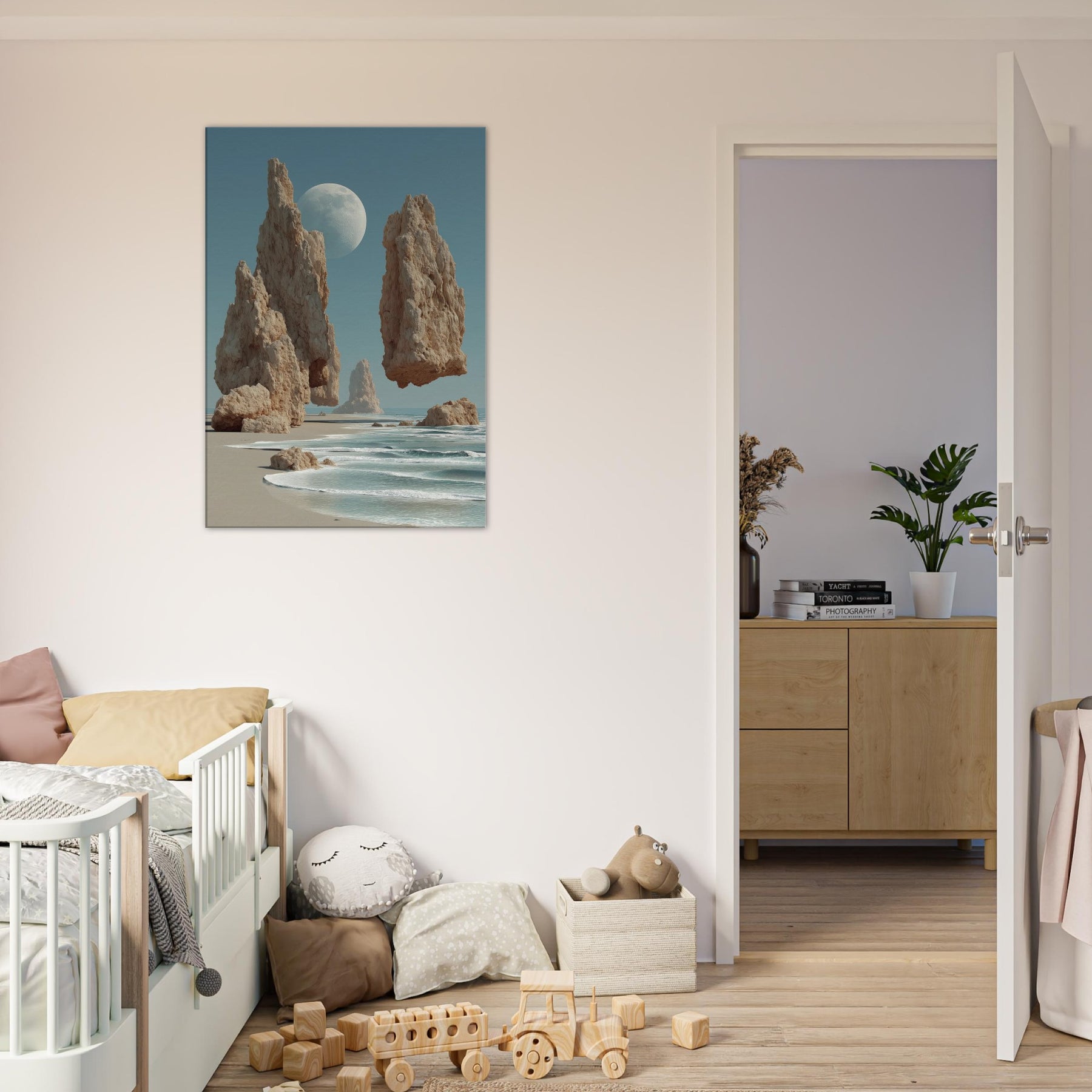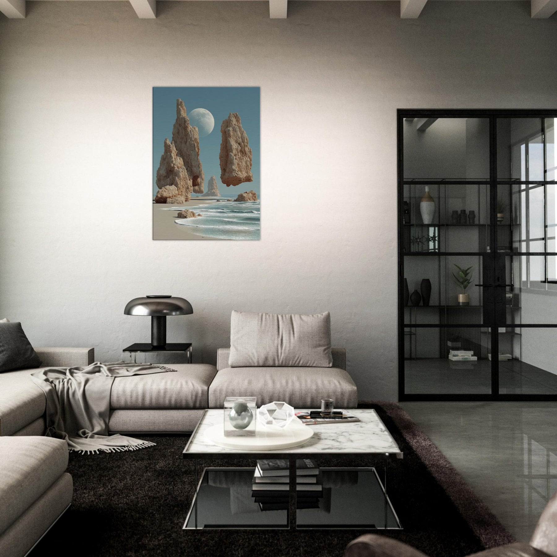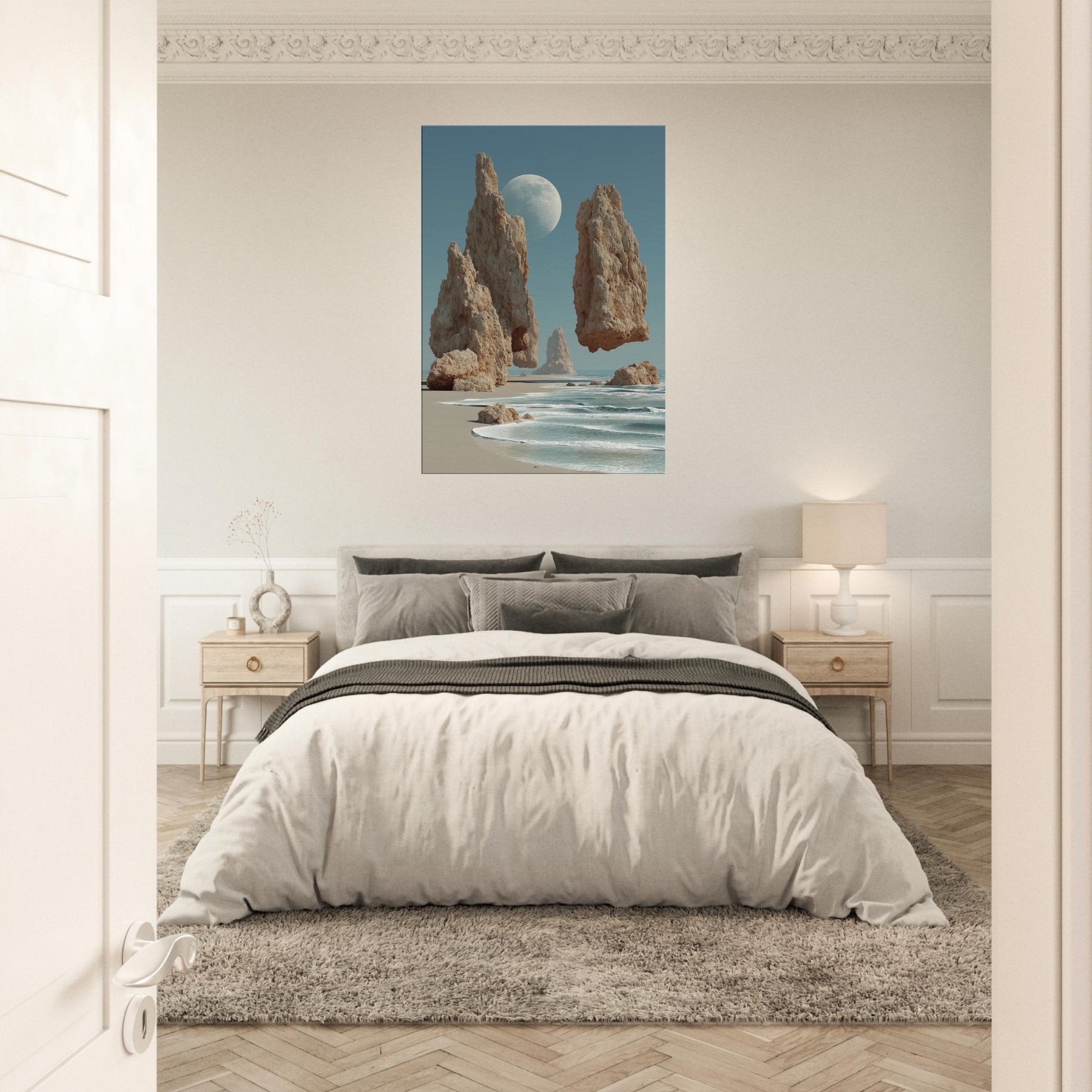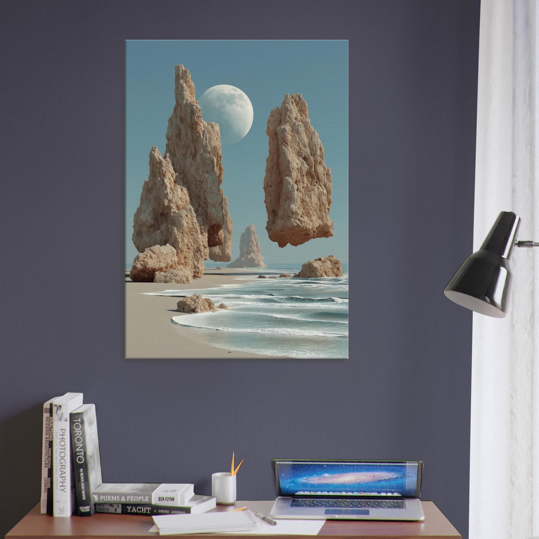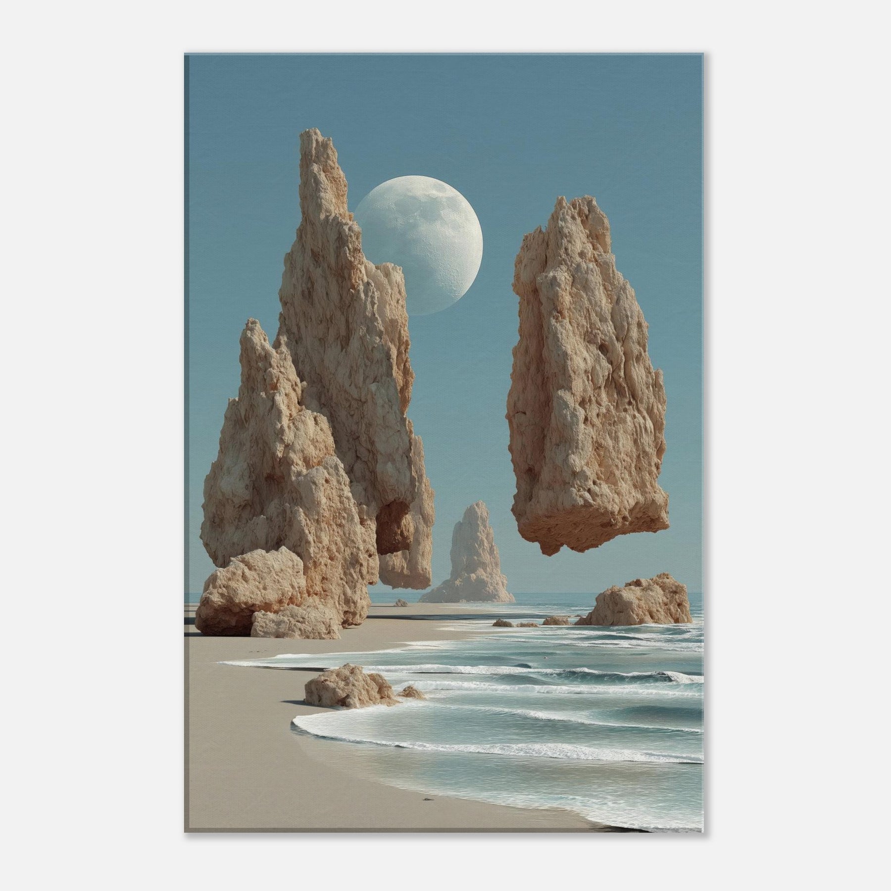 Beach air meets a dreamscape where granite spires rise in slow balance against a pale moon. This surreal composition invites the eye to drift along the shoreline of memory, where salt kissed wind and the whisper of tide become a quiet chorus. The image pairs coastal calm with otherworldly scale, turning a living room into a horizon of possibility. Hang it where light lingers hallways, lounges, bedrooms for a meditative focal point that breathes, grounds, and expands the mood of any space.
