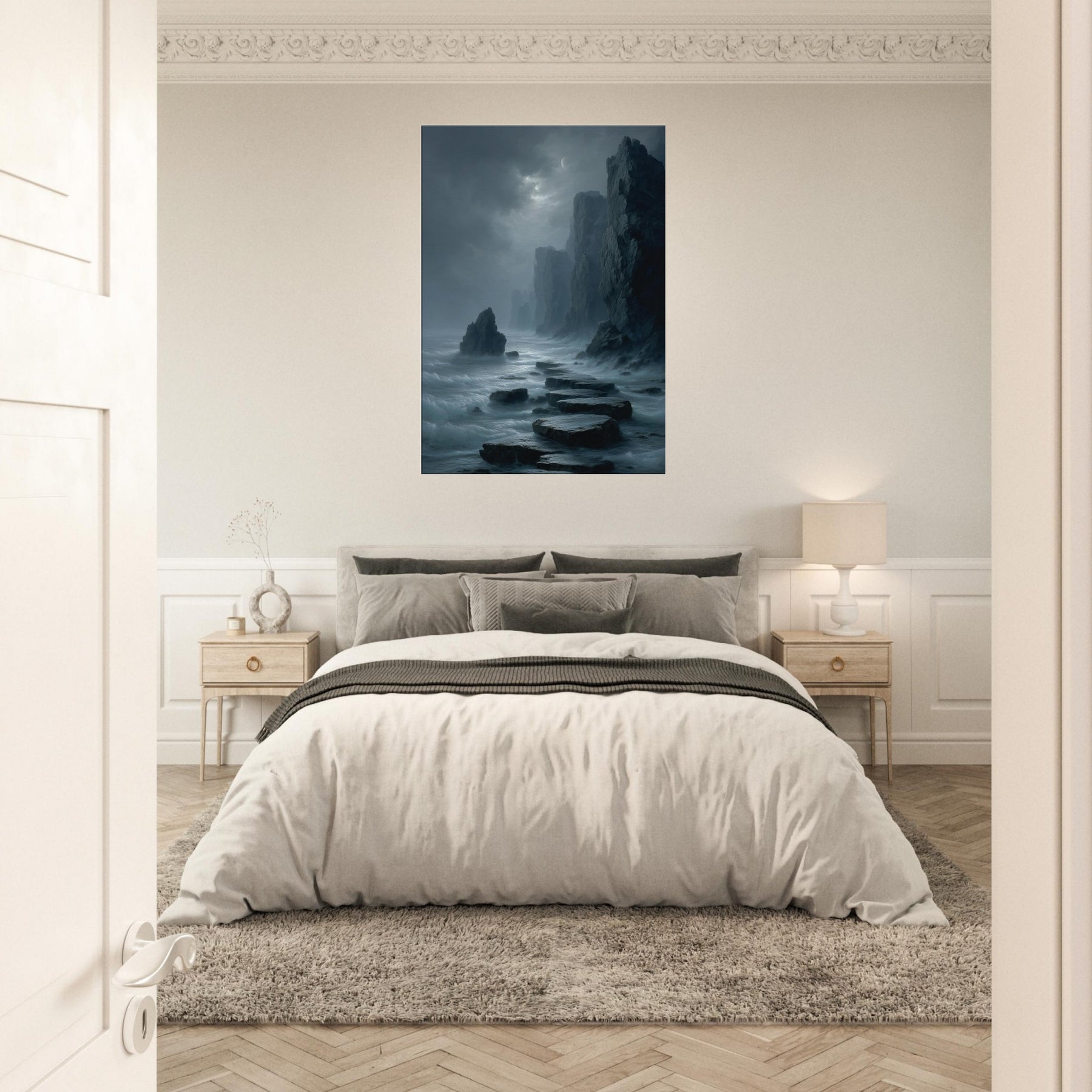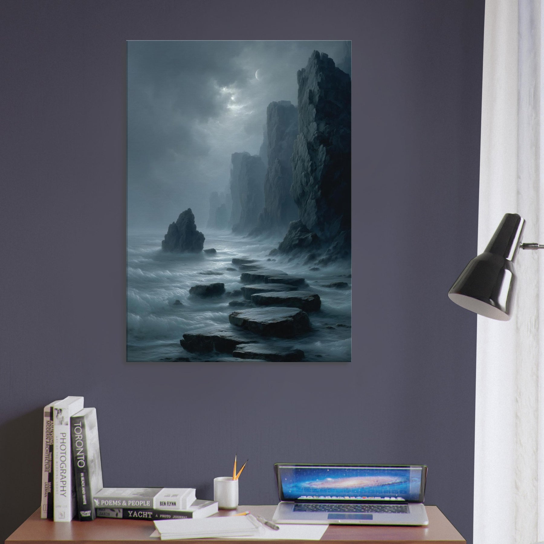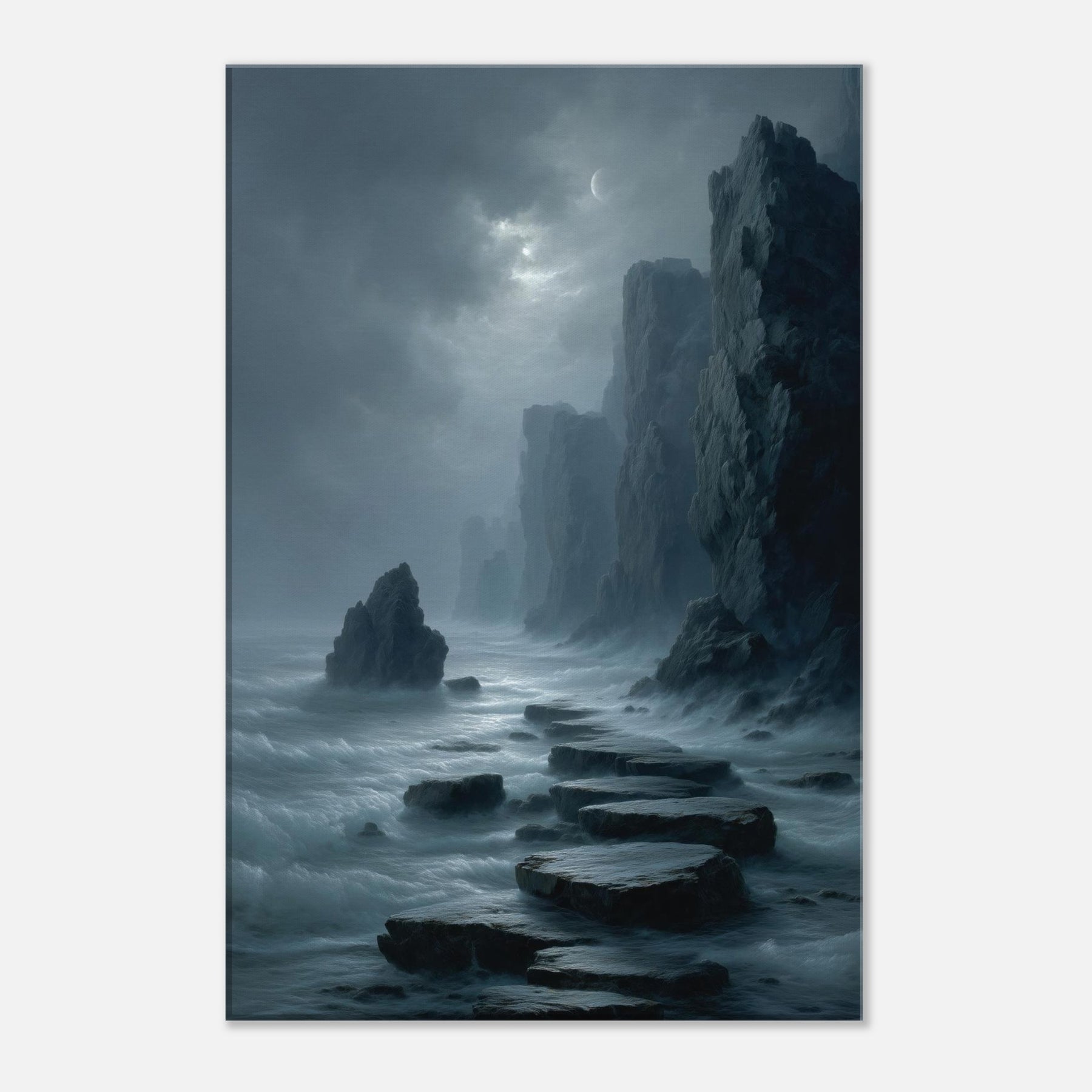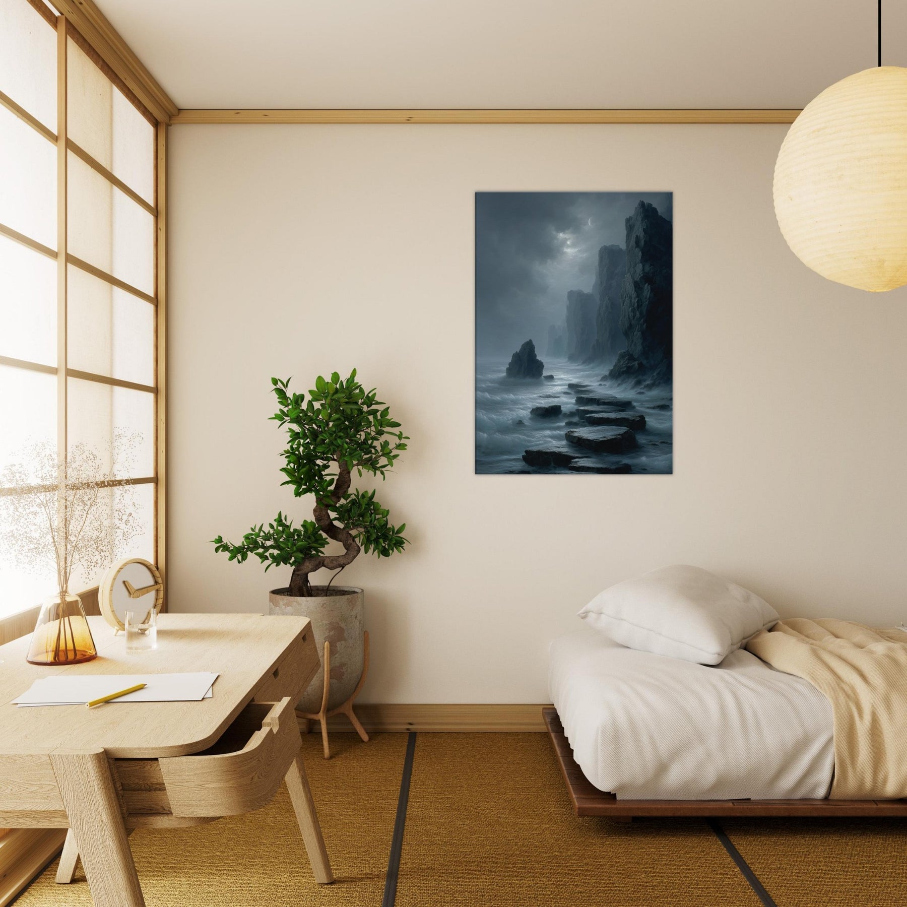 Coastal Cliffs rise like dream stitched sentinels as moonlight spills over a sleeping sea. This Surrealism inspired scene dissolves the ordinary into mist and distance, inviting contemplation of weathered stone and endless horizon. The Primary Subject anchors the imagination while delicate shadows breathe motion into still air. Hang this piece where soft blues and silvery grays can glow above a sofa, a desk, or a bed, evoking quiet courage, ancient tides, and the thrill of stepping into the unknown every day.