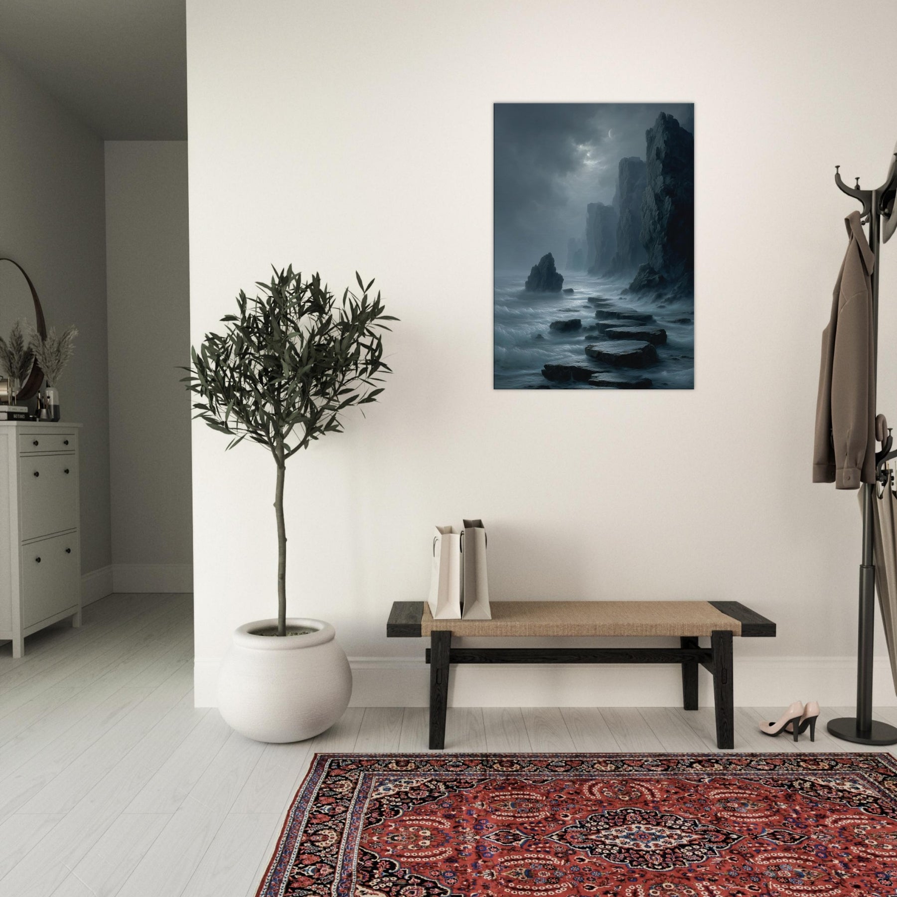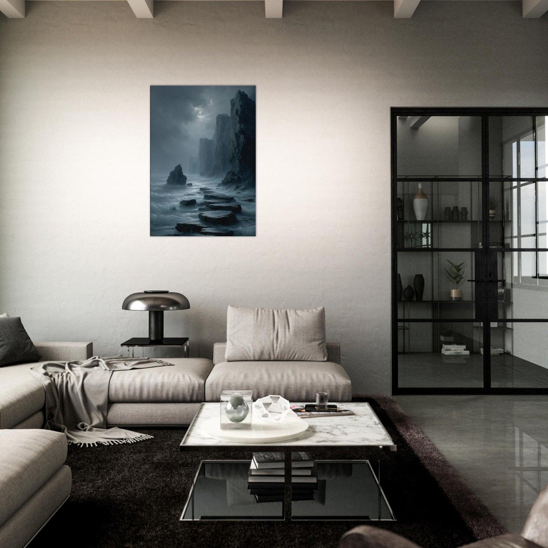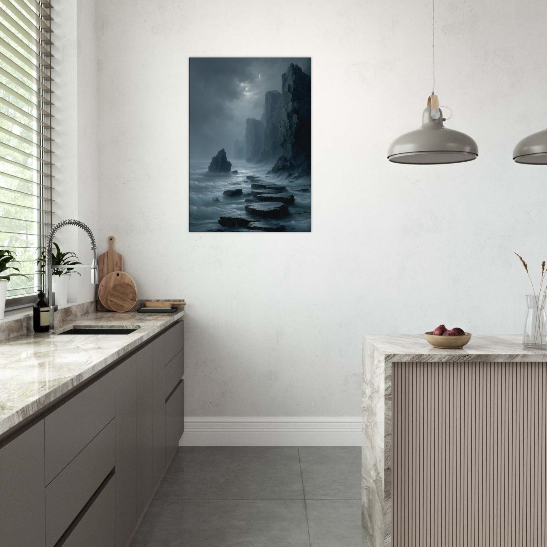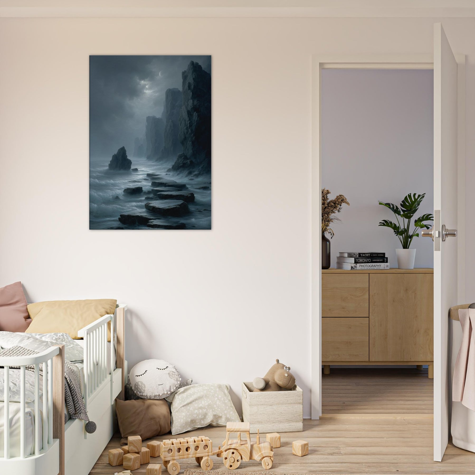 Coastal Cliffs rise like dream stitched sentinels as moonlight spills over a sleeping sea. This Surrealism inspired scene dissolves the ordinary into mist and distance, inviting contemplation of weathered stone and endless horizon. The Primary Subject anchors the imagination while delicate shadows breathe motion into still air. Hang this piece where soft blues and silvery grays can glow above a sofa, a desk, or a bed, evoking quiet courage, ancient tides, and the thrill of stepping into the unknown every day.