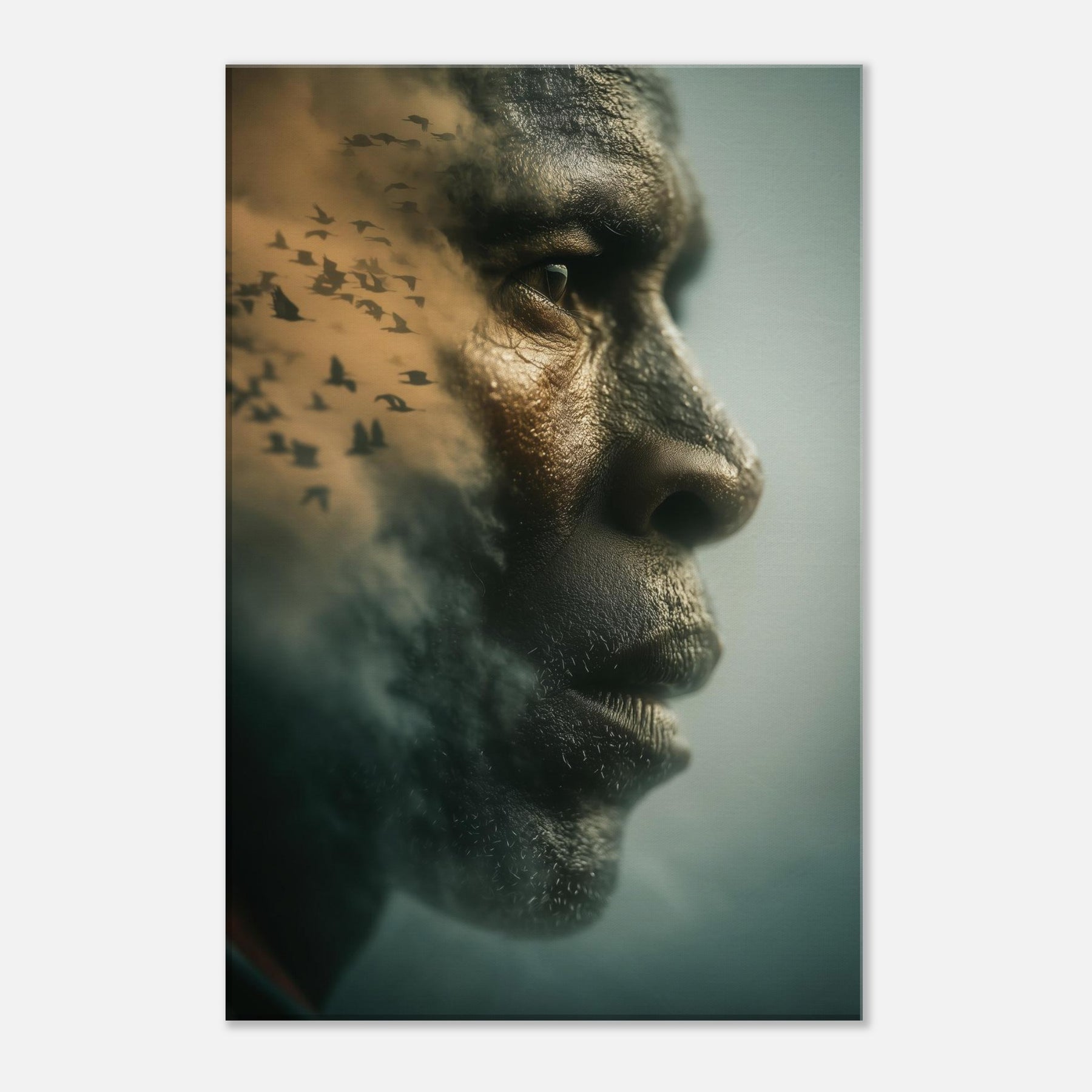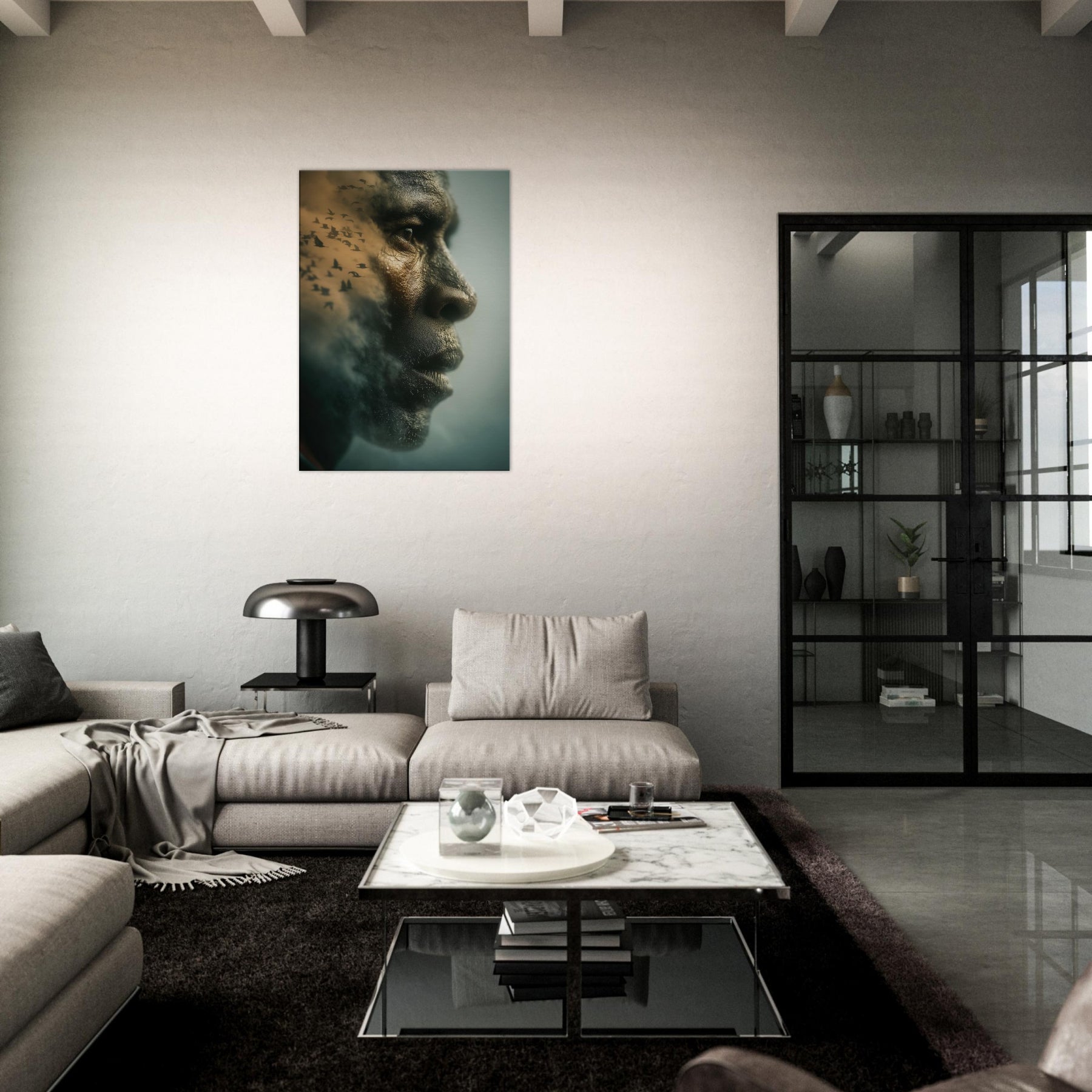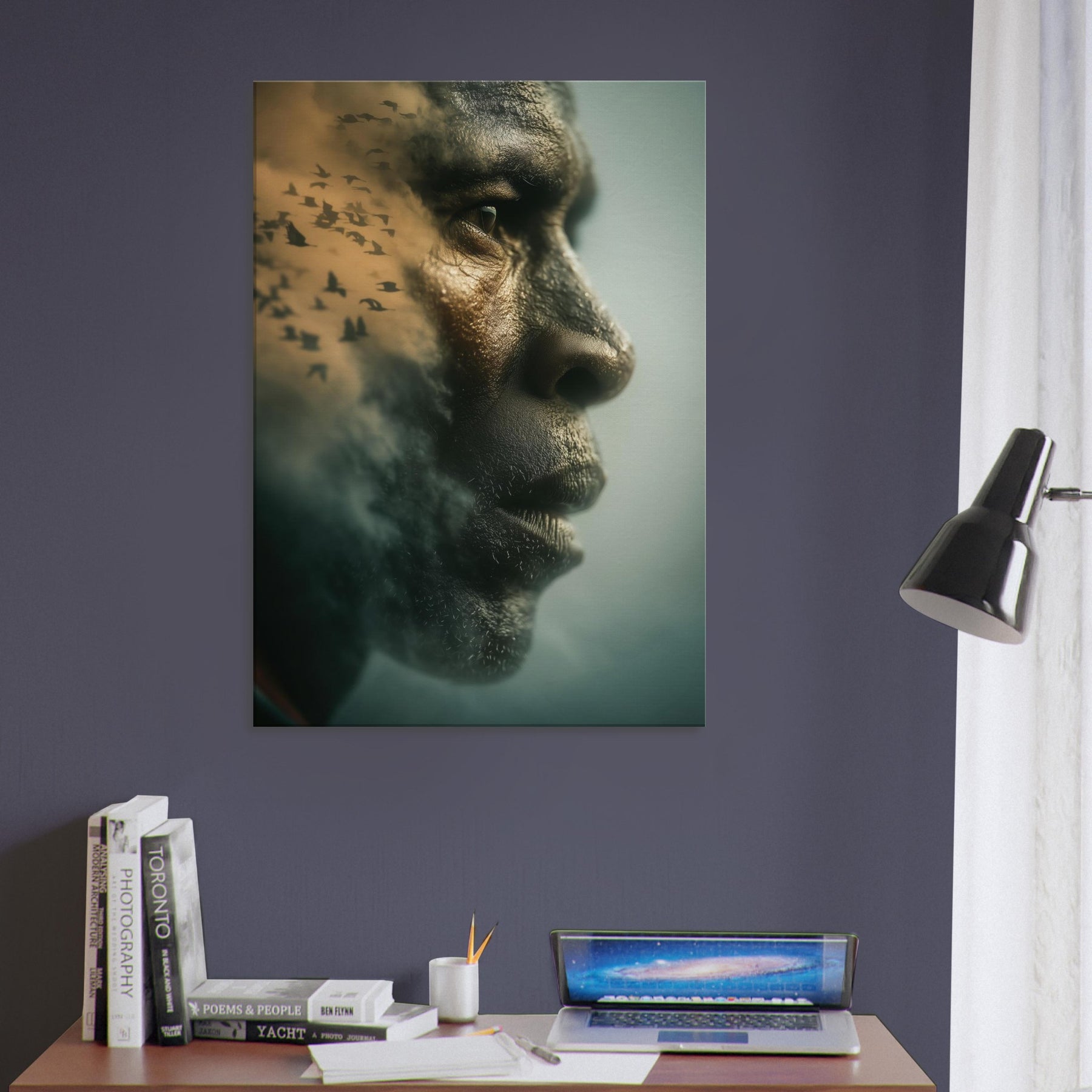 This folds the human and the sky into one breath. The Runner in Motion emerges beside a flock dissolving into fog, a surreal veil inviting the gaze to travel between the texture of skin and the swell of flight. Rich browns and muted teals ground the scene, while shifting light suggests motion, memory, and possibility. Hang it to awaken a room with quiet drama, turning walls into a moving meditation that enriches conversation and refuge.