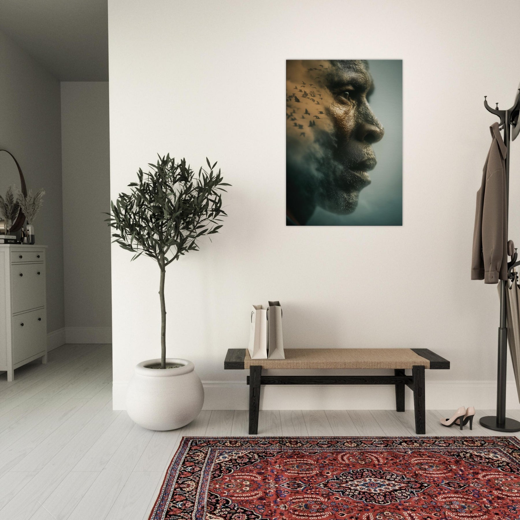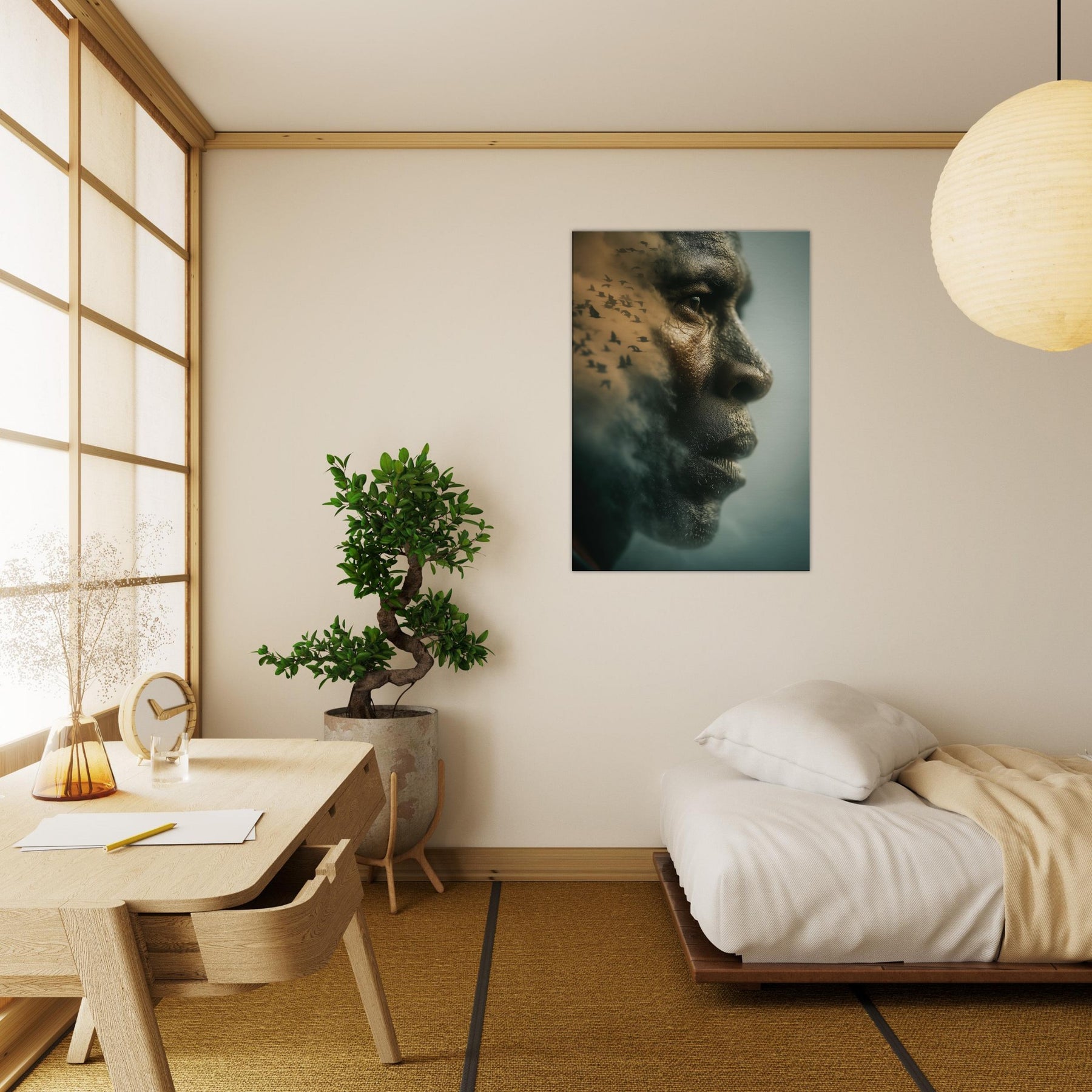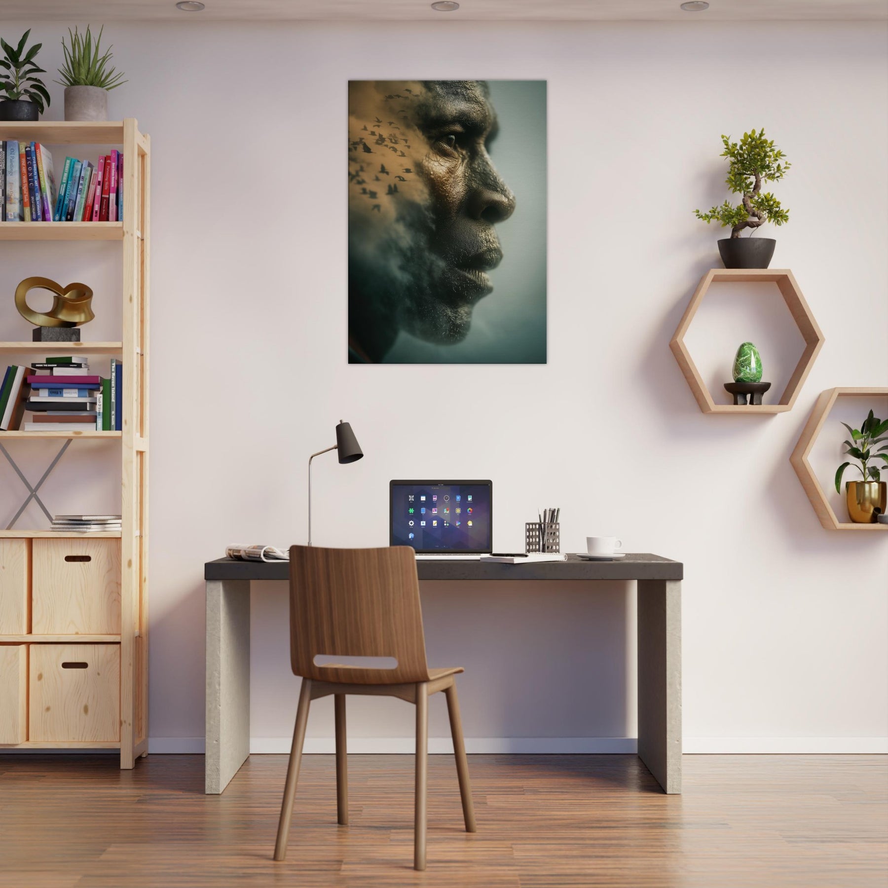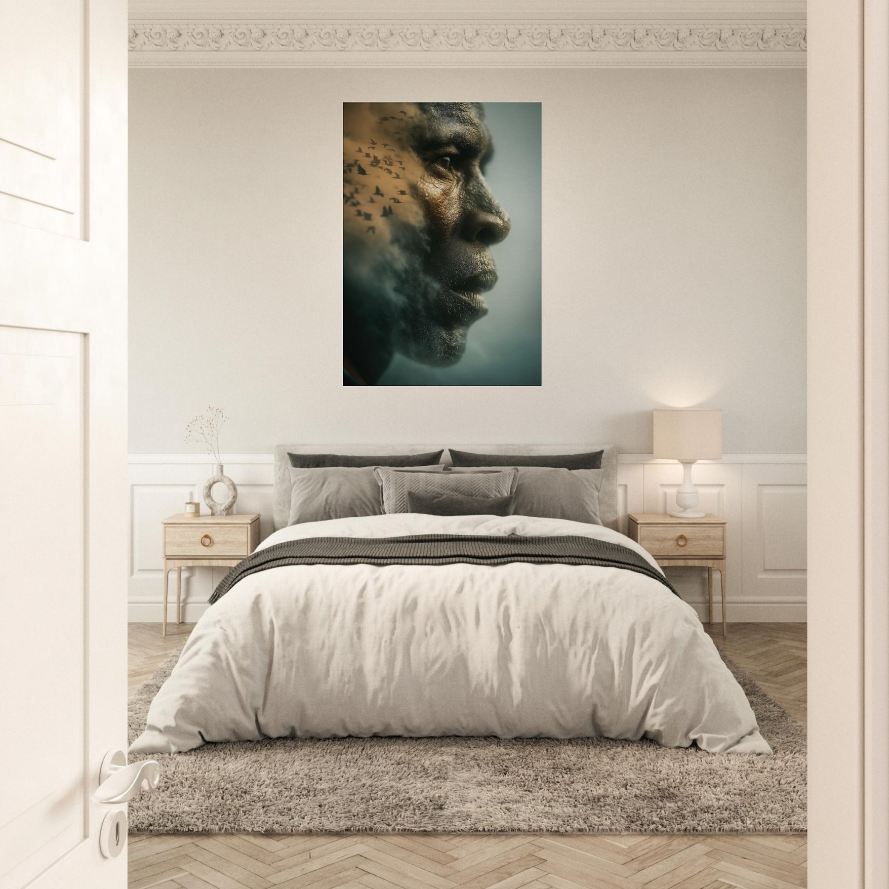 This folds the human and the sky into one breath. The Runner in Motion emerges beside a flock dissolving into fog, a surreal veil inviting the gaze to travel between the texture of skin and the swell of flight. Rich browns and muted teals ground the scene, while shifting light suggests motion, memory, and possibility. Hang it to awaken a room with quiet drama, turning walls into a moving meditation that enriches conversation and refuge.