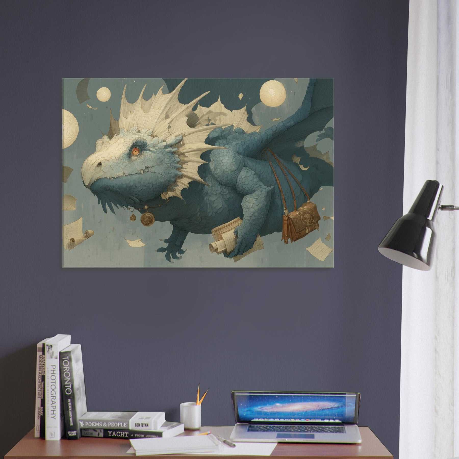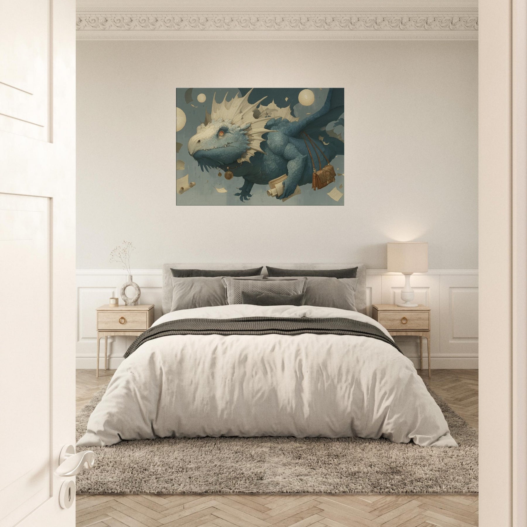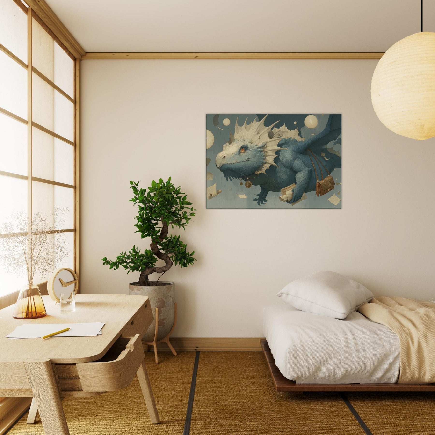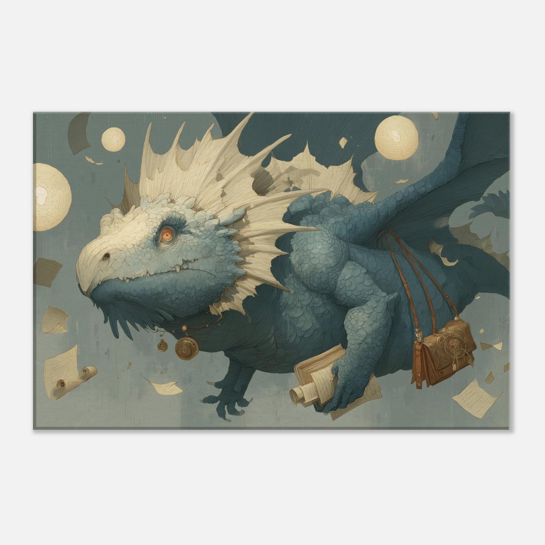 Immerse your space in a dream of weightless wonder, where a Majestic Dragon threads the air with parchment and moonlight. This surreal composition drifts above an amber lit study of scrolls and coins, its textured scales catching light like seashells, while floating orbs cast a soft, otherworldly glow. The mood is tranquil yet charged with possibility an invitation to linger on the edge of myth. Hang it in a living room or bedroom, and let the atmosphere unfurl into quiet conversations, imagination, and late night reveries.