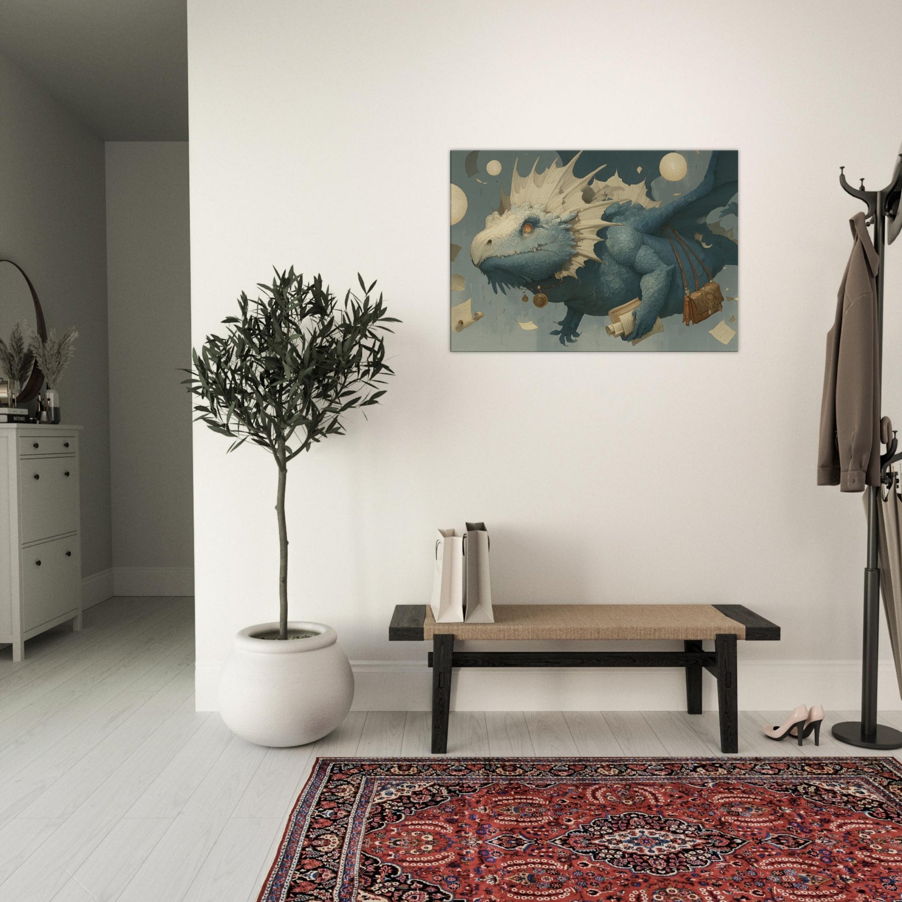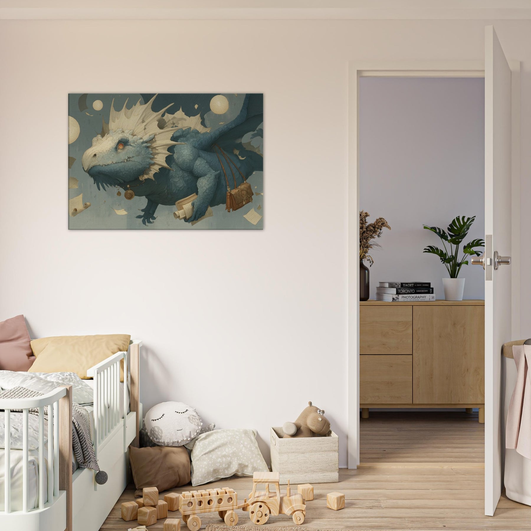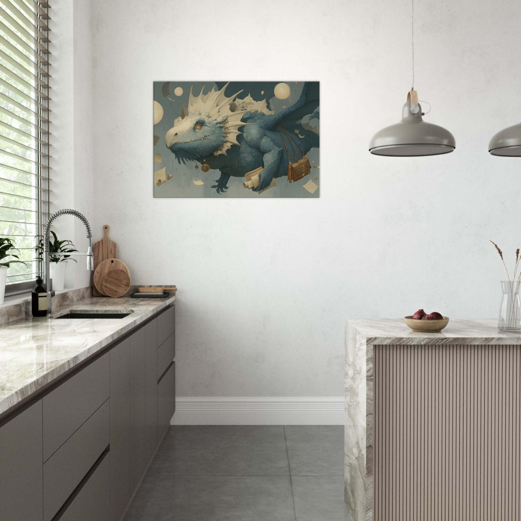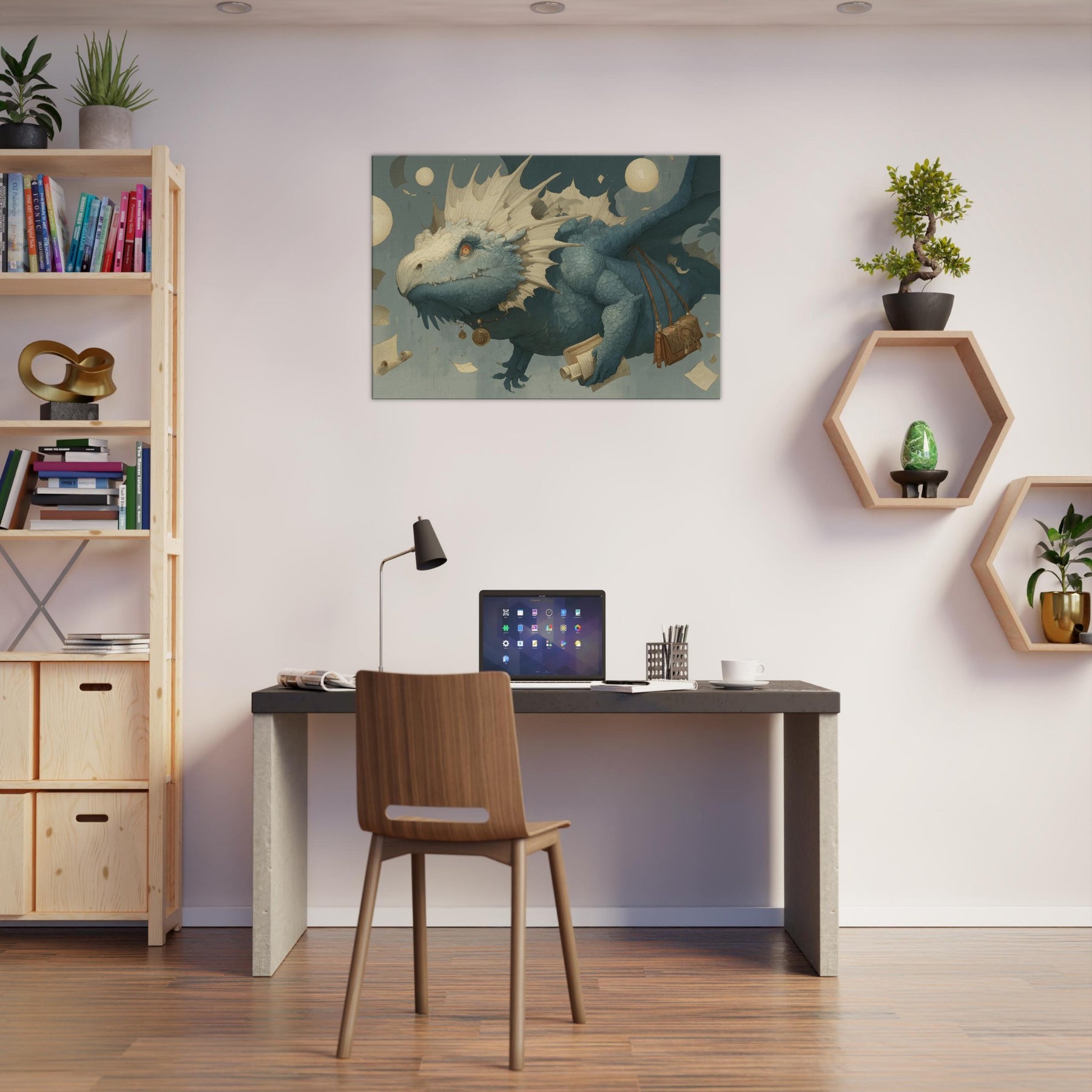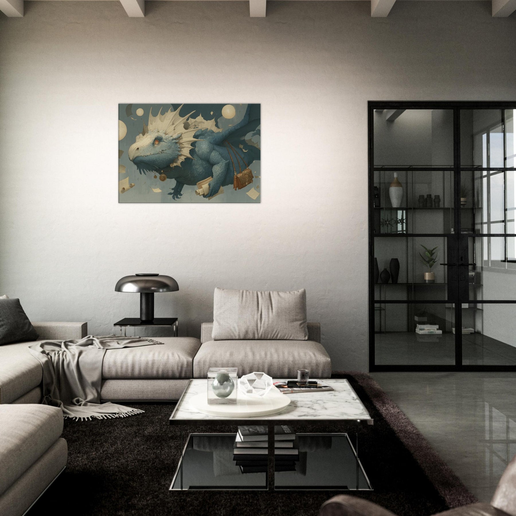 Immerse your space in a dream of weightless wonder, where a Majestic Dragon threads the air with parchment and moonlight. This surreal composition drifts above an amber lit study of scrolls and coins, its textured scales catching light like seashells, while floating orbs cast a soft, otherworldly glow. The mood is tranquil yet charged with possibility an invitation to linger on the edge of myth. Hang it in a living room or bedroom, and let the atmosphere unfurl into quiet conversations, imagination, and late night reveries.