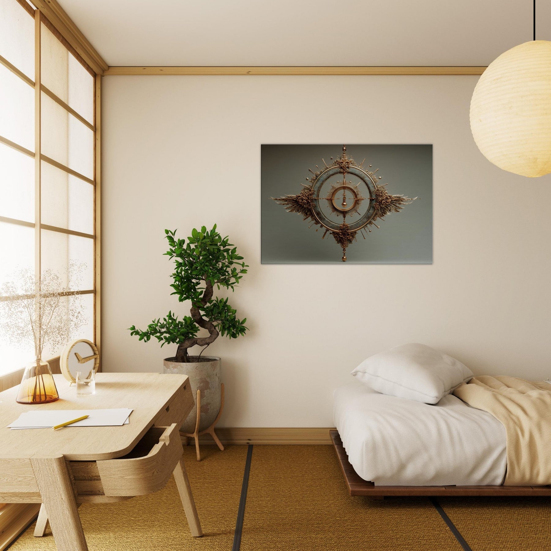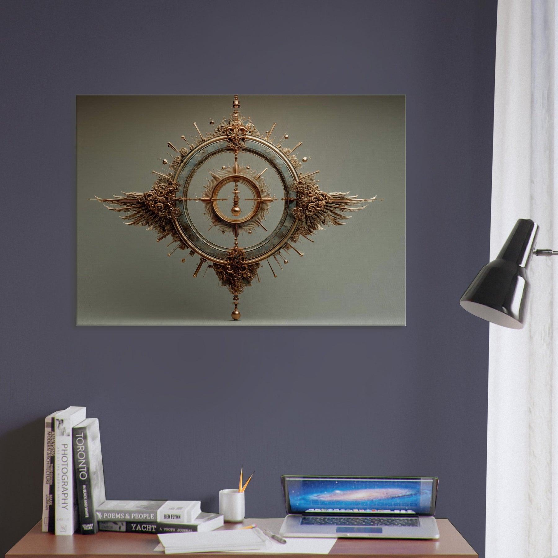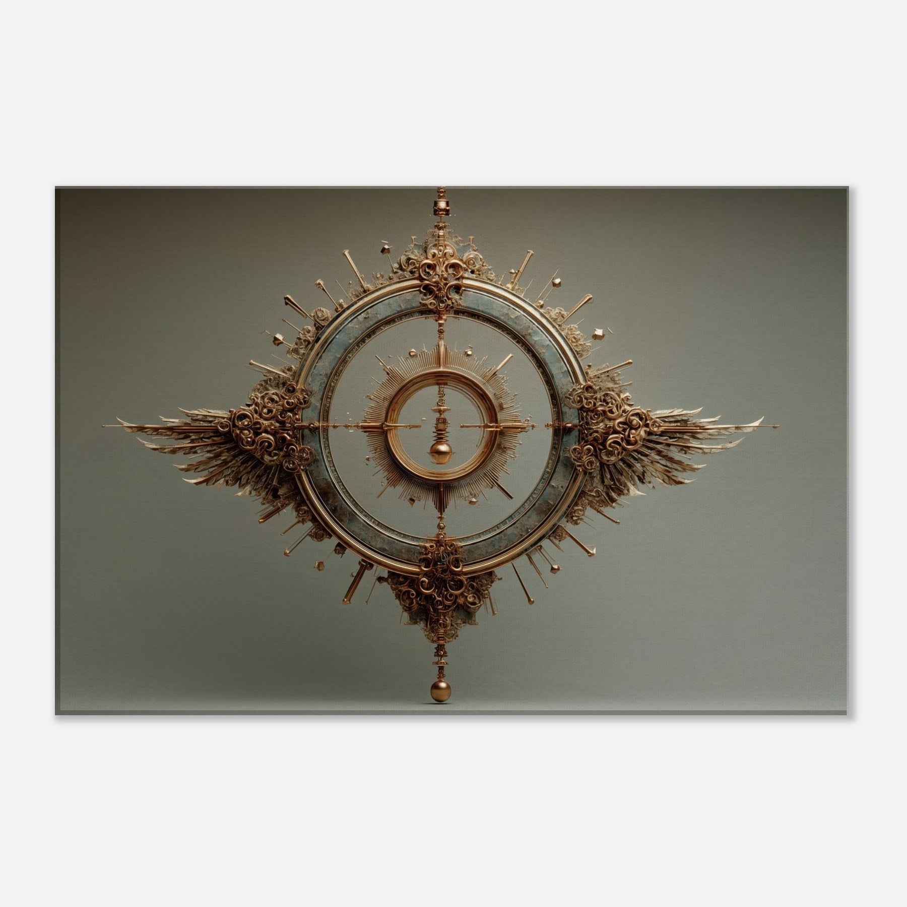 Within this surreal meditation, the Pendulum (Divination) unfolds in a bronze halo, suspended between memory and dream. The sculpture's circular gears catch the glow of lamps and candles, scattering warmth across a quiet living space. Its measured arc becomes a living reminder to pause, breathe, and listen. Wings of copper and sunbursts of spindled detail invite the eye to wander, turning your wall into a threshold between the ordinary and the mystical.