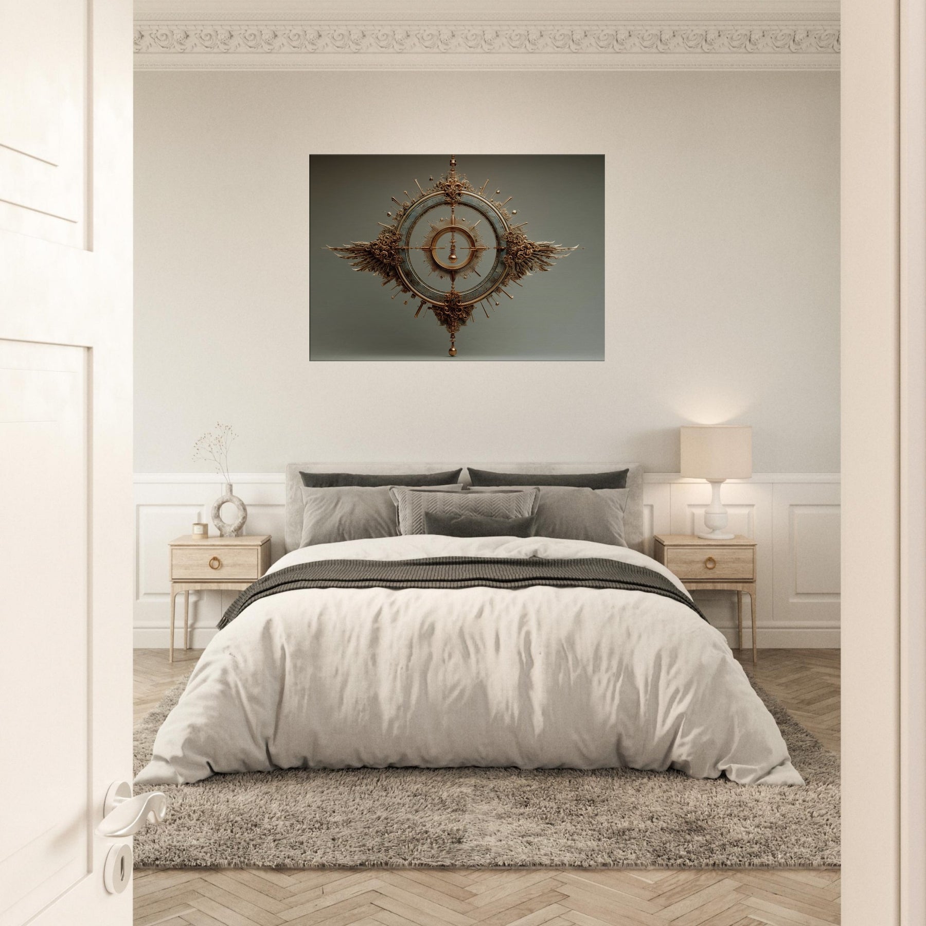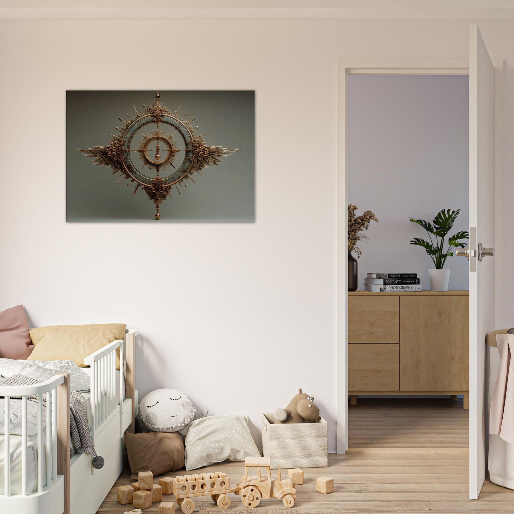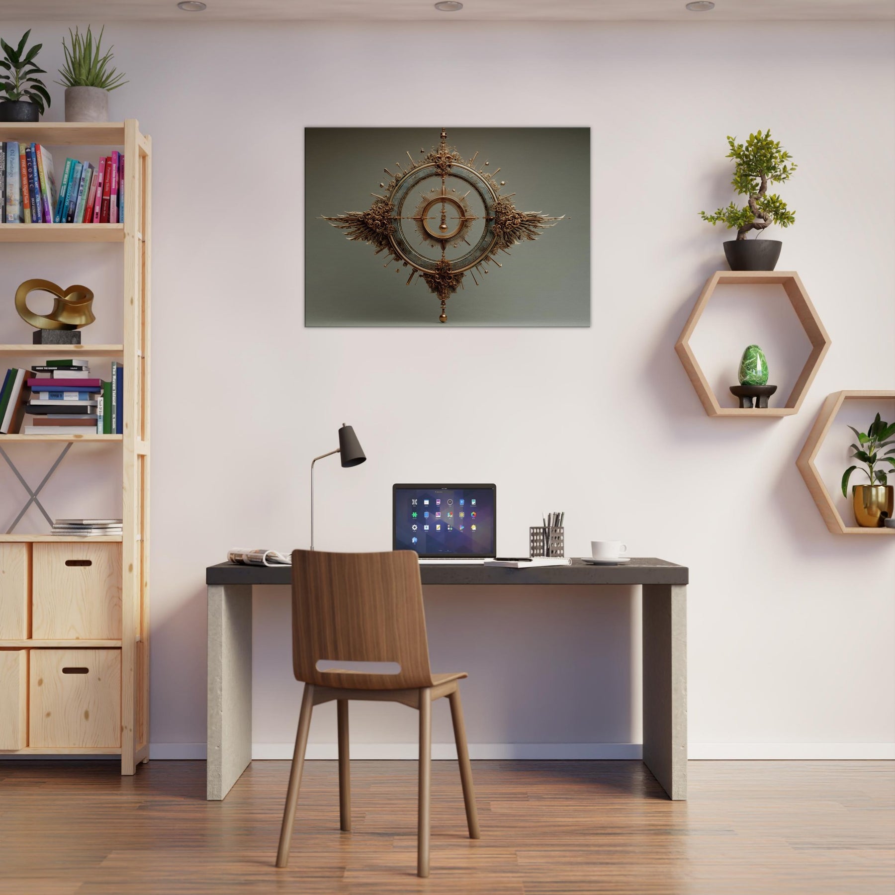 Within this surreal meditation, the Pendulum (Divination) unfolds in a bronze halo, suspended between memory and dream. The sculpture's circular gears catch the glow of lamps and candles, scattering warmth across a quiet living space. Its measured arc becomes a living reminder to pause, breathe, and listen. Wings of copper and sunbursts of spindled detail invite the eye to wander, turning your wall into a threshold between the ordinary and the mystical.