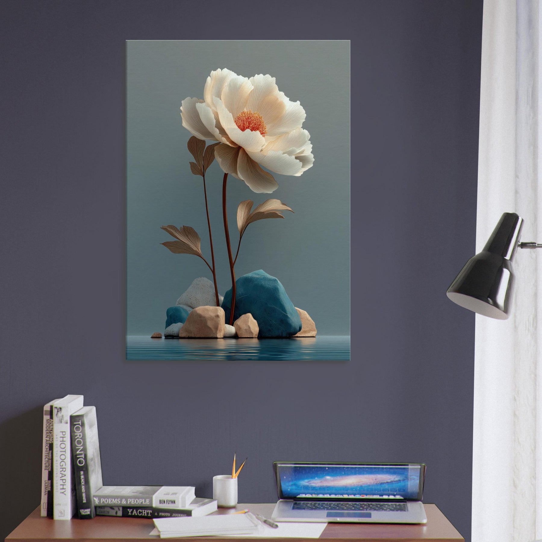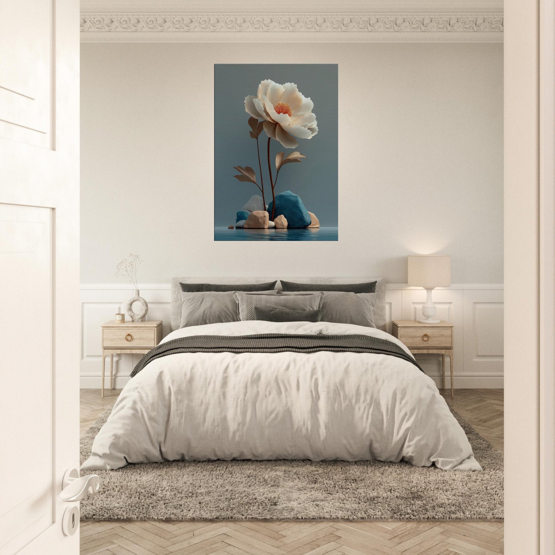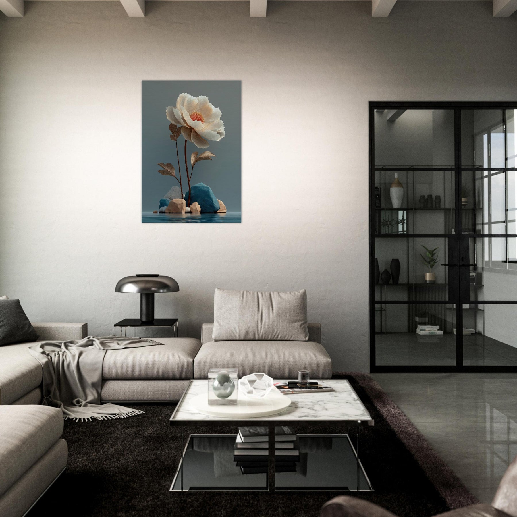 Softly luminous and otherworldly, this Peony the Primary Subject floats above a quiet shoreline of stones and water, a study in balance between fragility and strength. The petals unfurl in creamy whites with a coral heart, while slender stems anchor the dreamlike bloom in a surreal, still world. The work invites calm, contemplative light into a living room, bedroom, or study, pairing tactile detail with luminous color to transform walls into a hypnotic focal point an invitation to pause, breathe, and rediscover wonder.