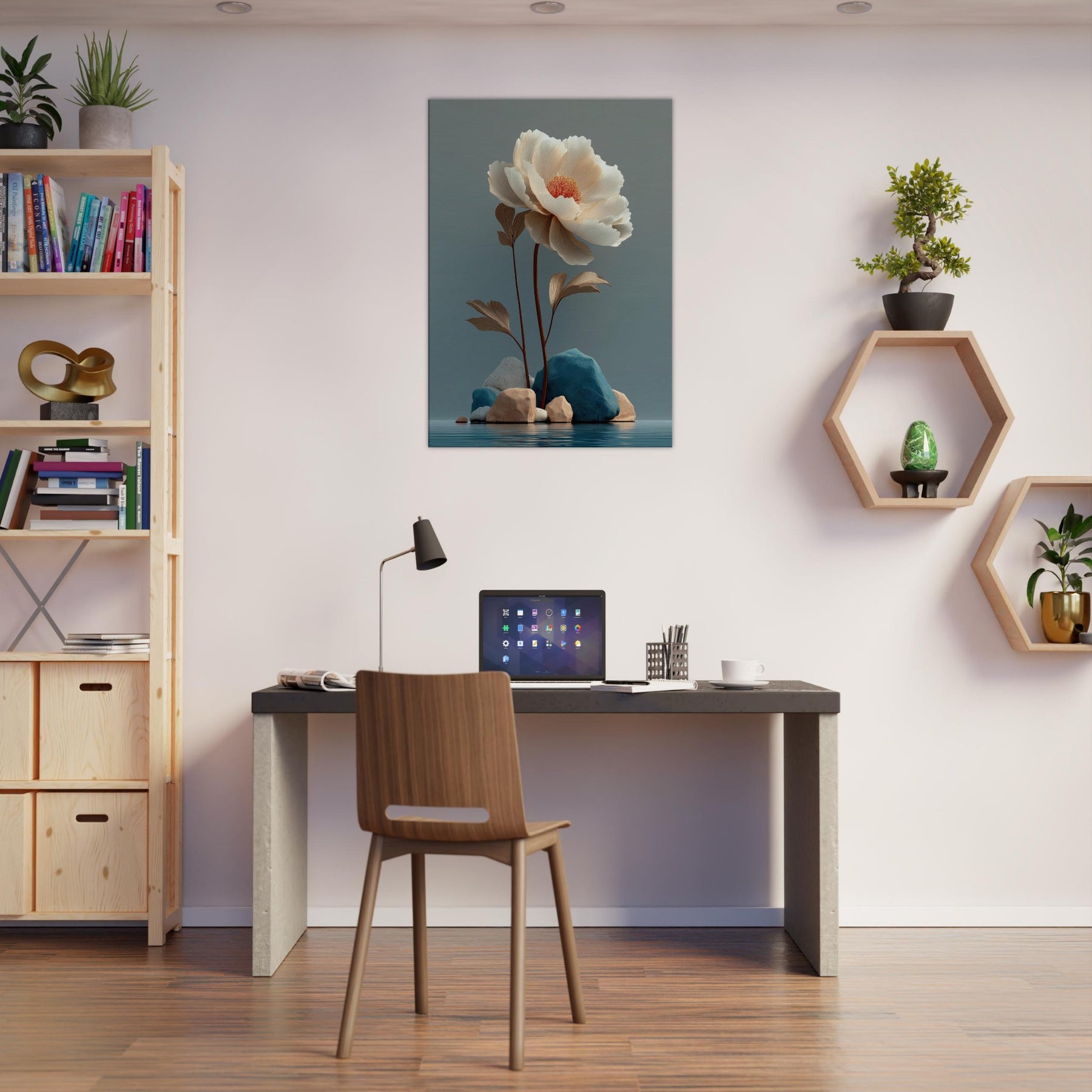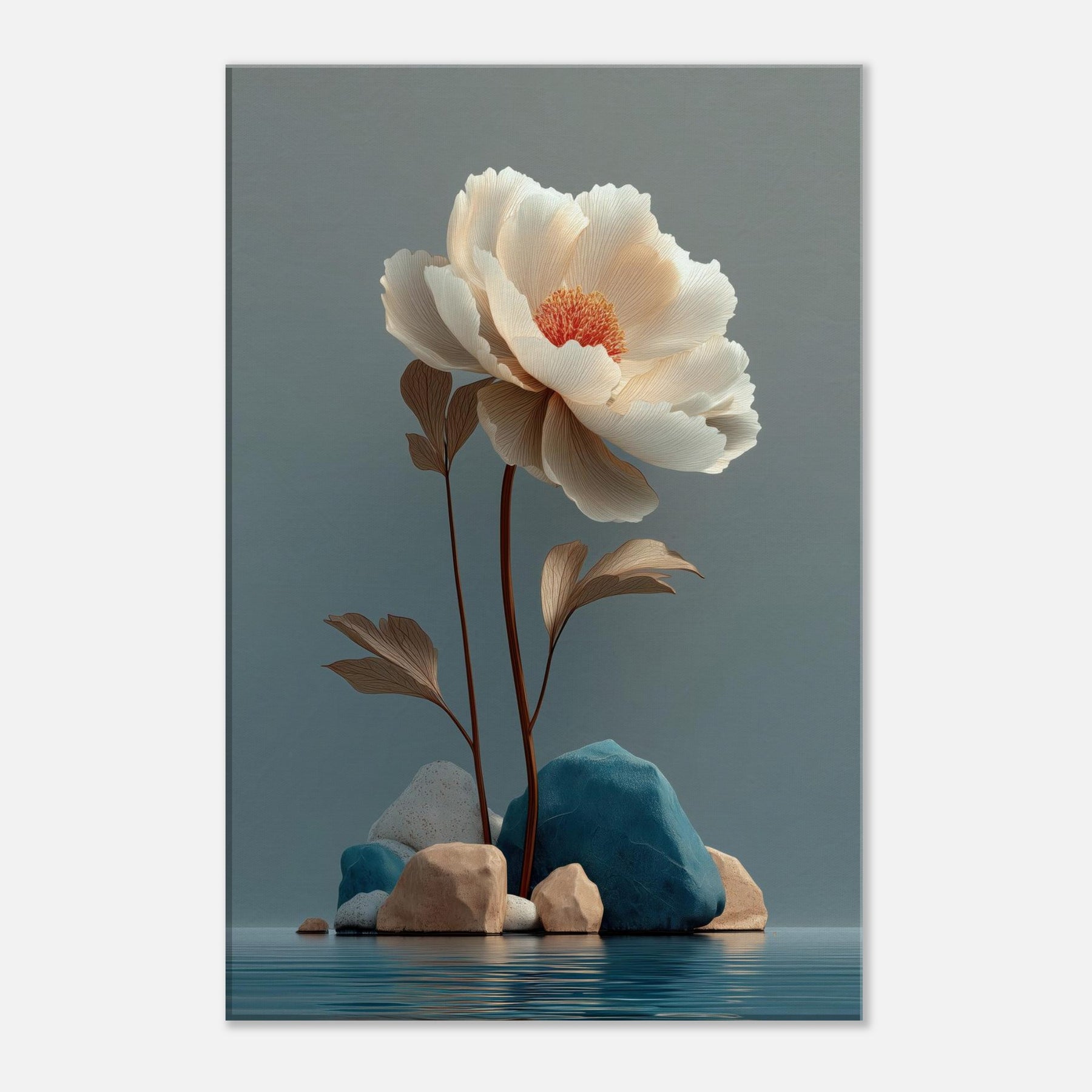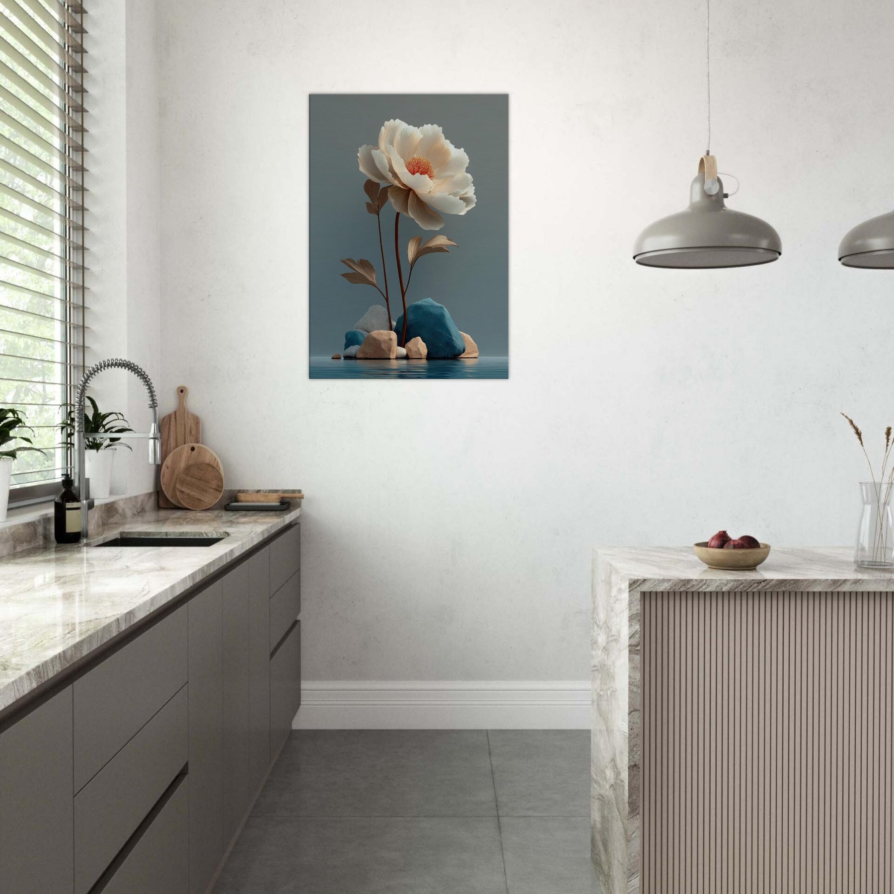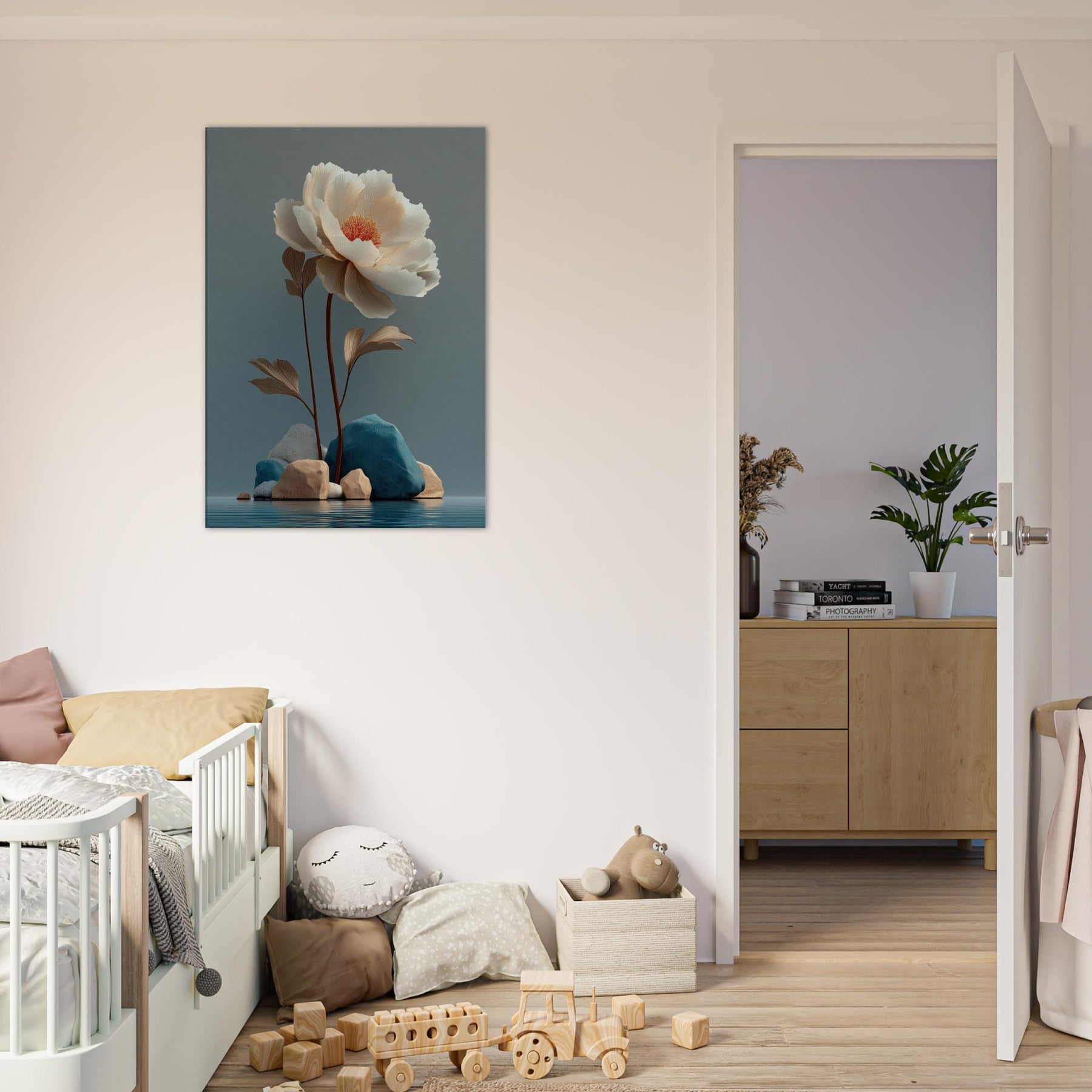 Softly luminous and otherworldly, this Peony the Primary Subject floats above a quiet shoreline of stones and water, a study in balance between fragility and strength. The petals unfurl in creamy whites with a coral heart, while slender stems anchor the dreamlike bloom in a surreal, still world. The work invites calm, contemplative light into a living room, bedroom, or study, pairing tactile detail with luminous color to transform walls into a hypnotic focal point an invitation to pause, breathe, and rediscover wonder.