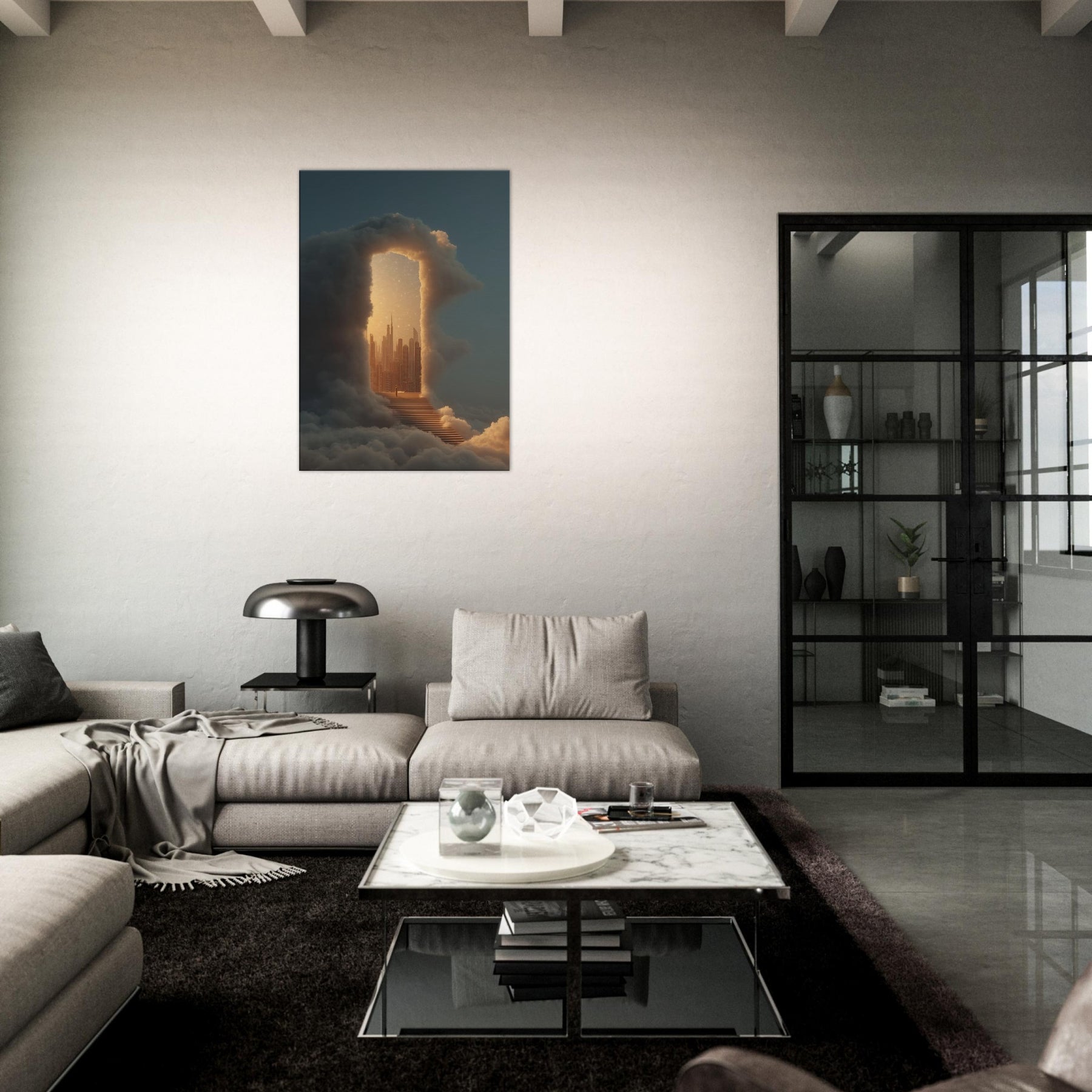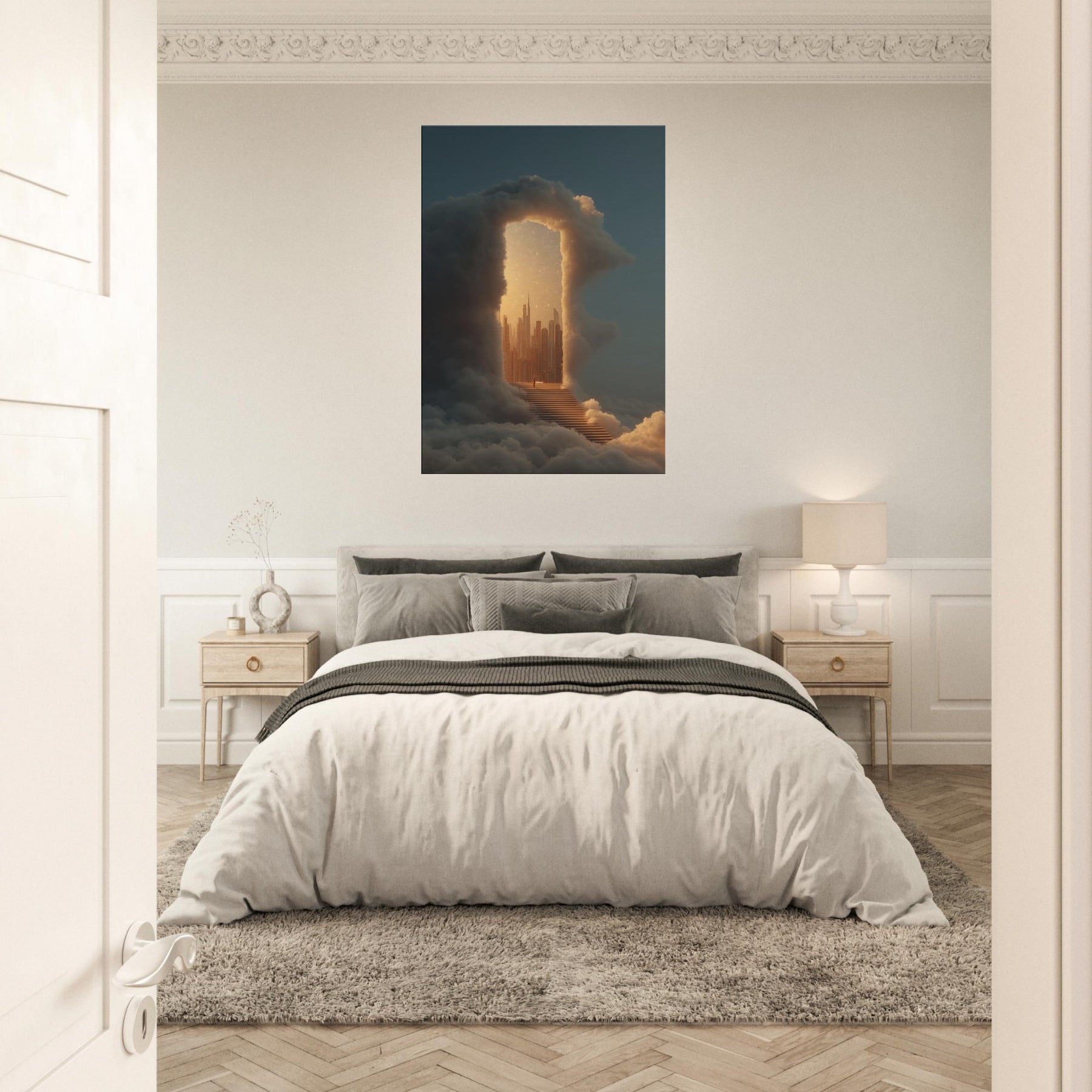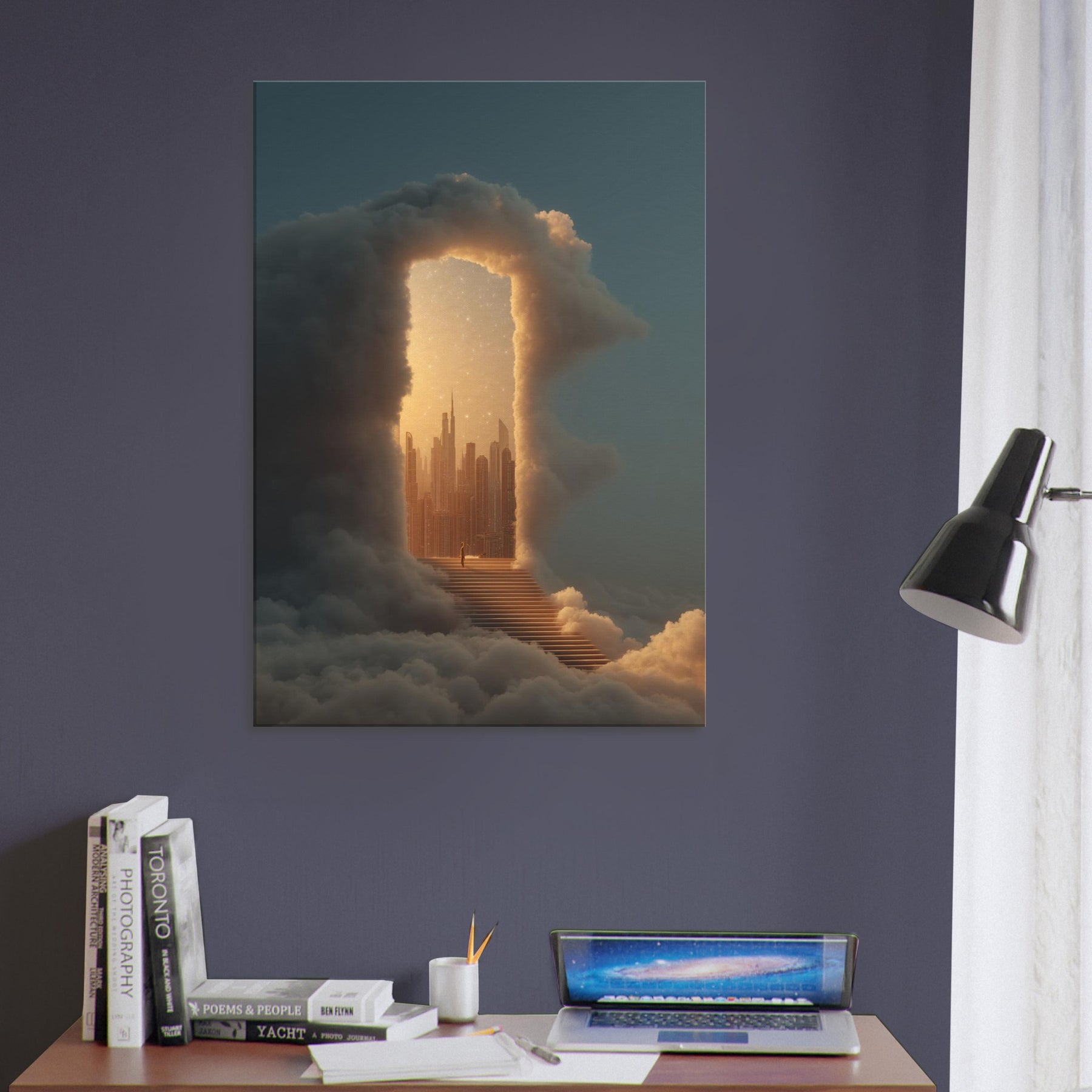 An otherworldly doorway carved from cloud light opens to a gleaming Miami skyline, where glass towers rise beyond a warm, honeyed horizon. Surreal music of light and space washes the room in a quiet drama, as stair steps float up through mist toward a city that feels both familiar and miraculous. The atmosphere blends dream and daily life, inviting reflection and wonder. Ideal for a living room or bedroom, it adds depth, luminosity, and a fearless sense of possibility to any contemporary space.