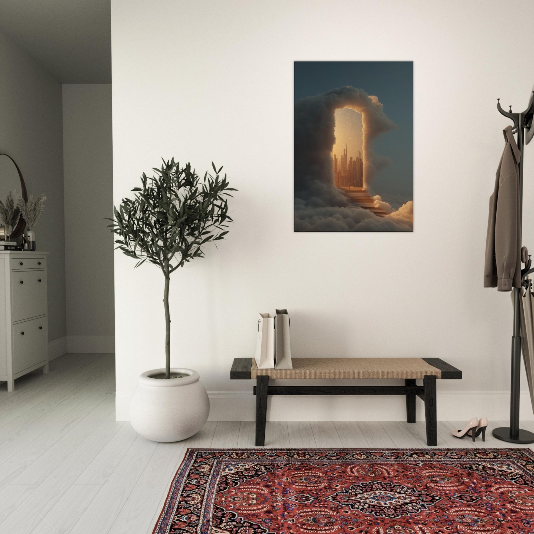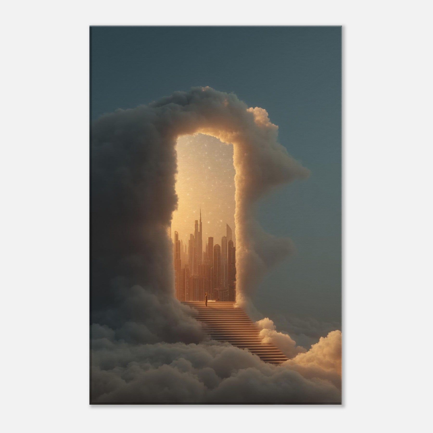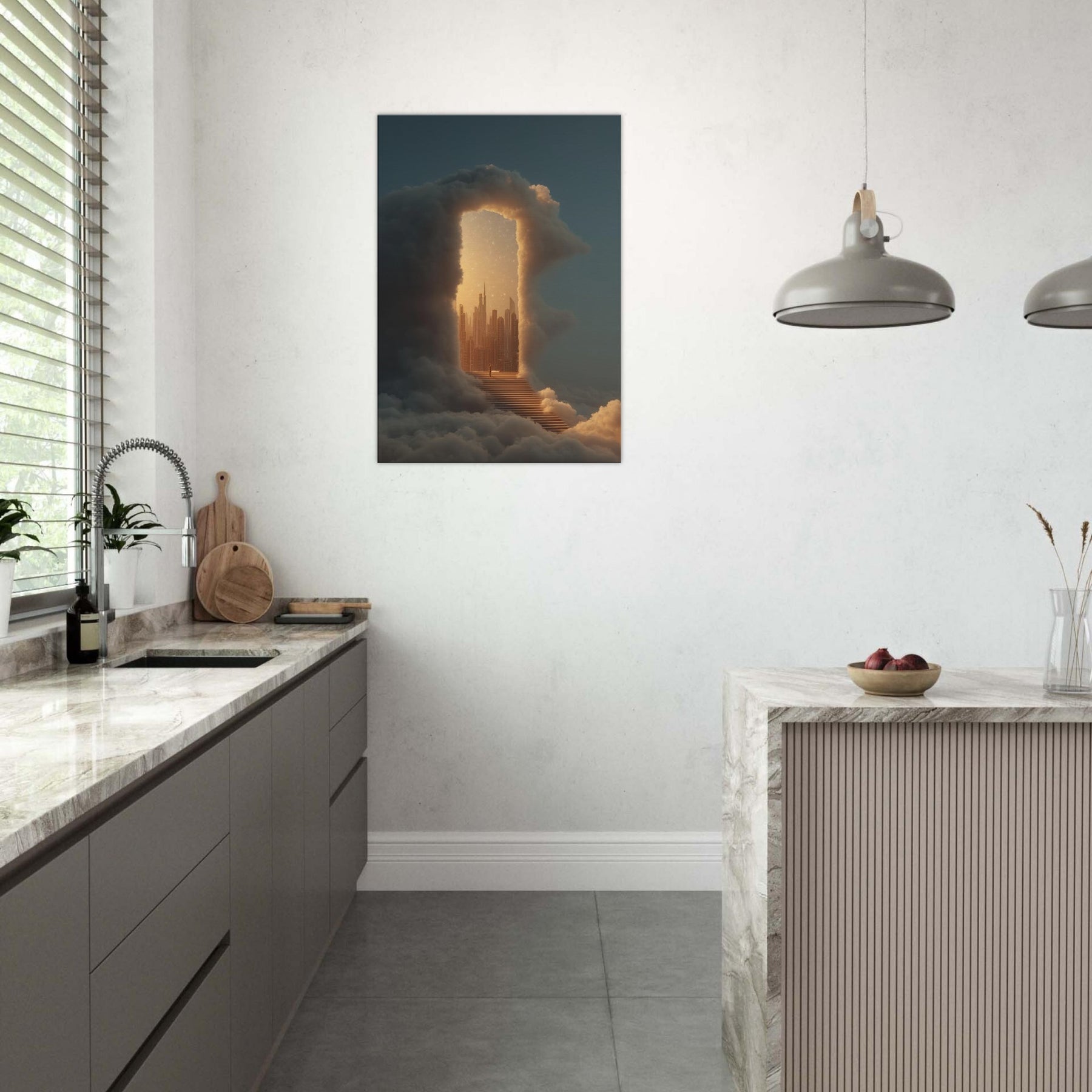 An otherworldly doorway carved from cloud light opens to a gleaming Miami skyline, where glass towers rise beyond a warm, honeyed horizon. Surreal music of light and space washes the room in a quiet drama, as stair steps float up through mist toward a city that feels both familiar and miraculous. The atmosphere blends dream and daily life, inviting reflection and wonder. Ideal for a living room or bedroom, it adds depth, luminosity, and a fearless sense of possibility to any contemporary space.