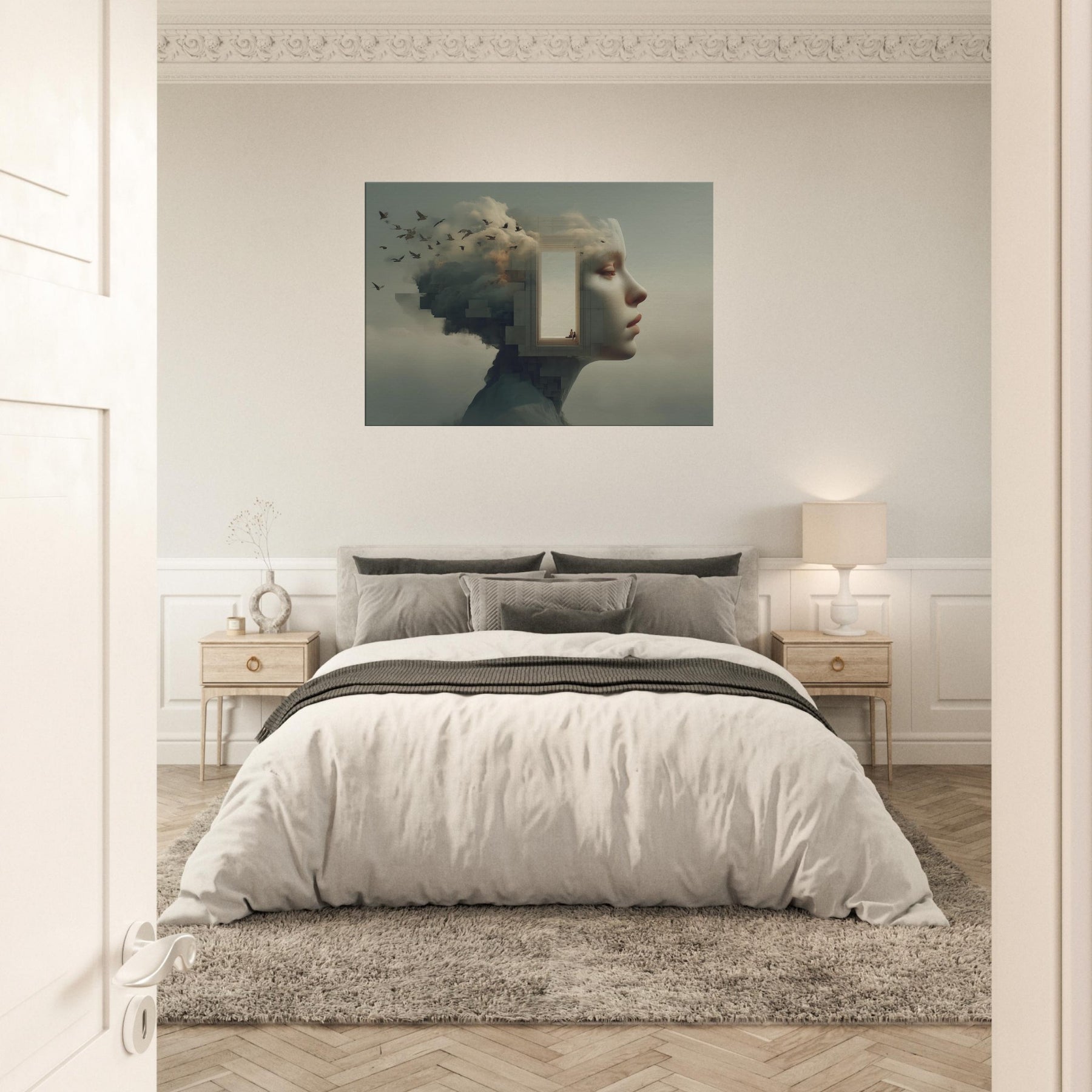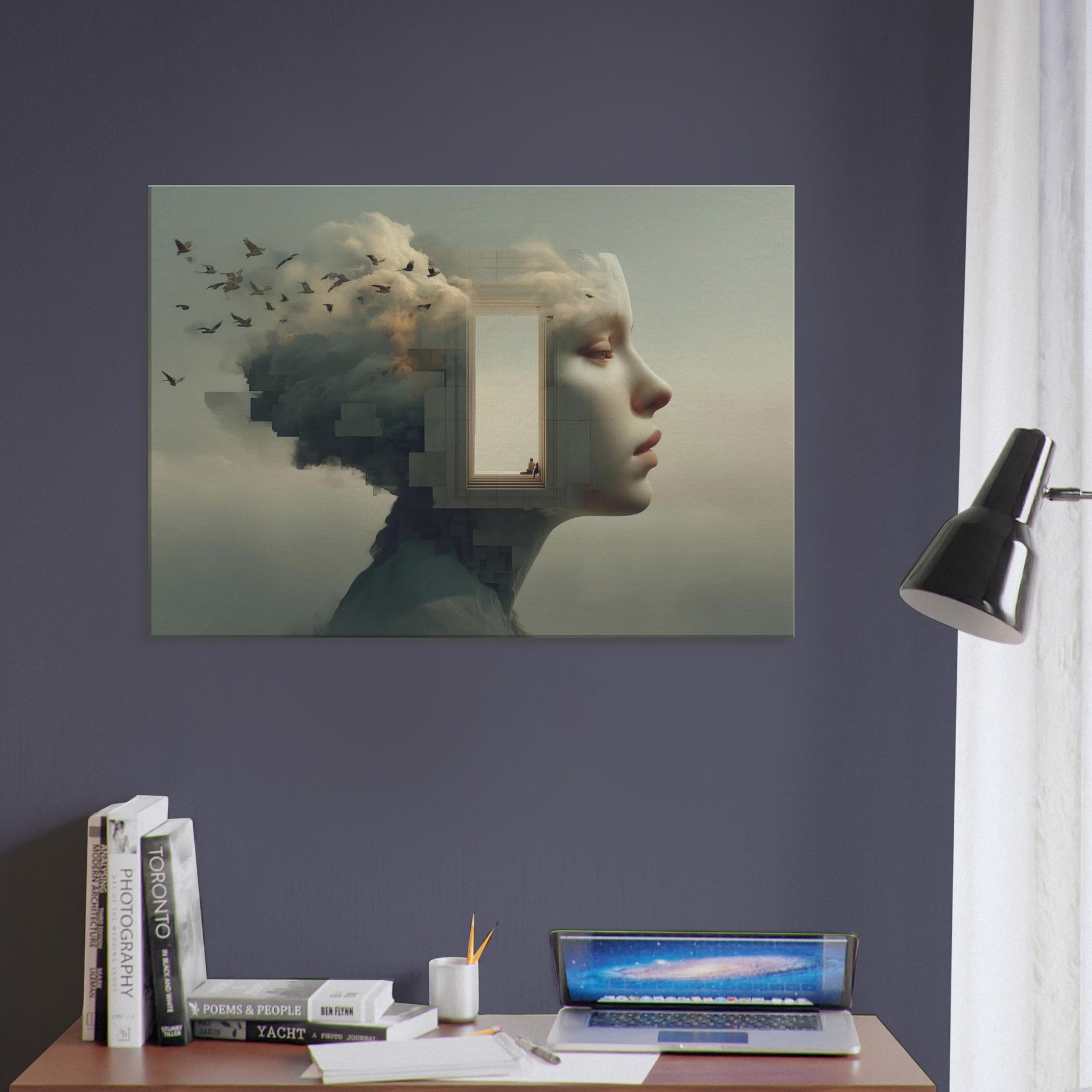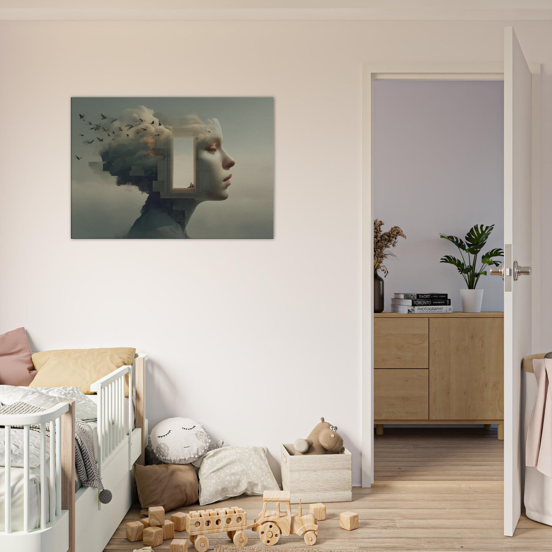 Bauhaus Blocks, the Primary Subject, meets surrealism in a of architectural quiet. This piece marries solid, modular forms with a luminous profile, where a doorway opens into cloud swept horizons and a distant, patient gaze. The Bauhaus Blocks emerge as tactile geometry that anchors a room, while wisps of fog and birds drift overhead like thoughts. Framed by soft, cinematic light, it invites calm, contemplation, and conversation a luminous anchor for living rooms or bedrooms craving a refined, imaginative atmosphere.