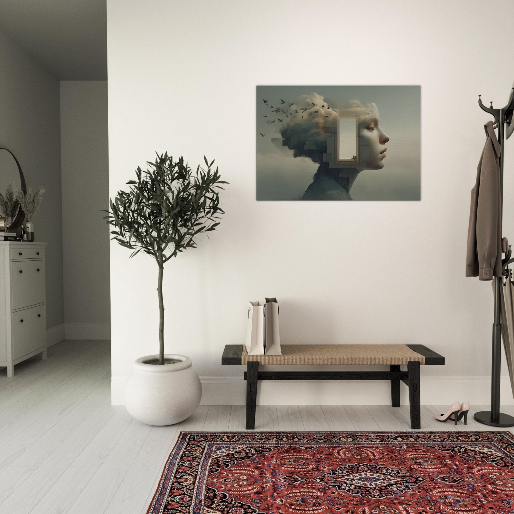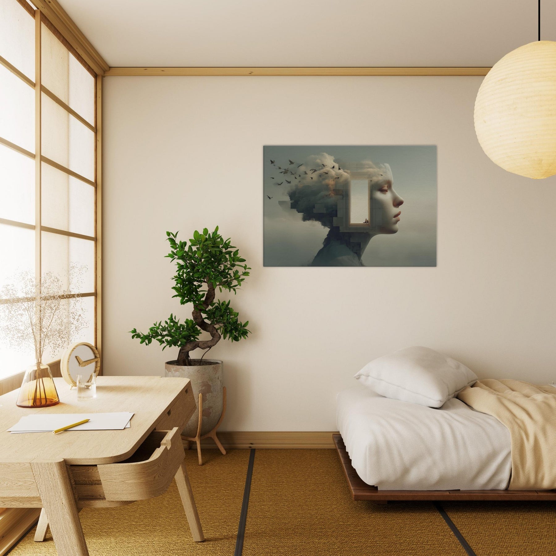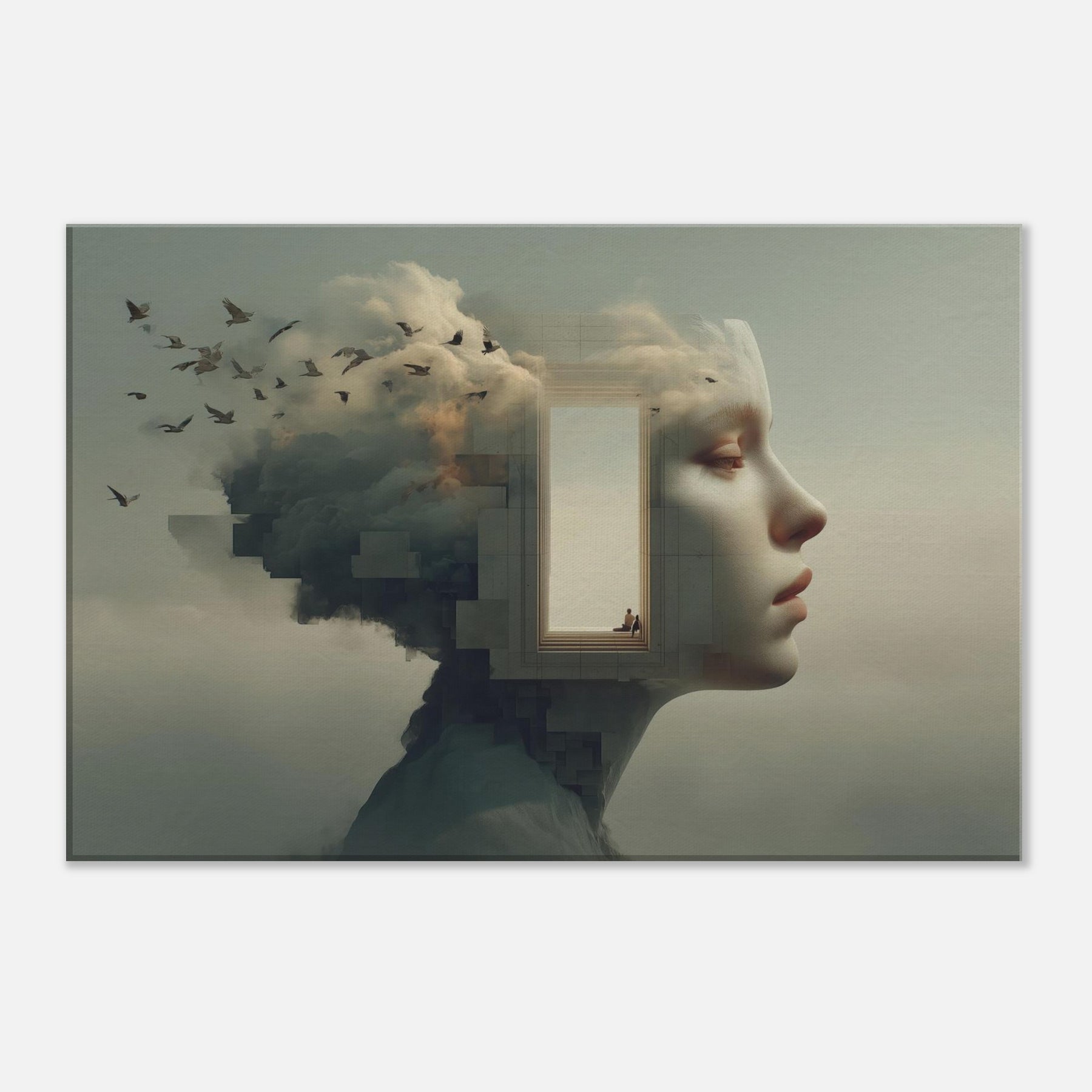 Bauhaus Blocks, the Primary Subject, meets surrealism in a of architectural quiet. This piece marries solid, modular forms with a luminous profile, where a doorway opens into cloud swept horizons and a distant, patient gaze. The Bauhaus Blocks emerge as tactile geometry that anchors a room, while wisps of fog and birds drift overhead like thoughts. Framed by soft, cinematic light, it invites calm, contemplation, and conversation a luminous anchor for living rooms or bedrooms craving a refined, imaginative atmosphere.
