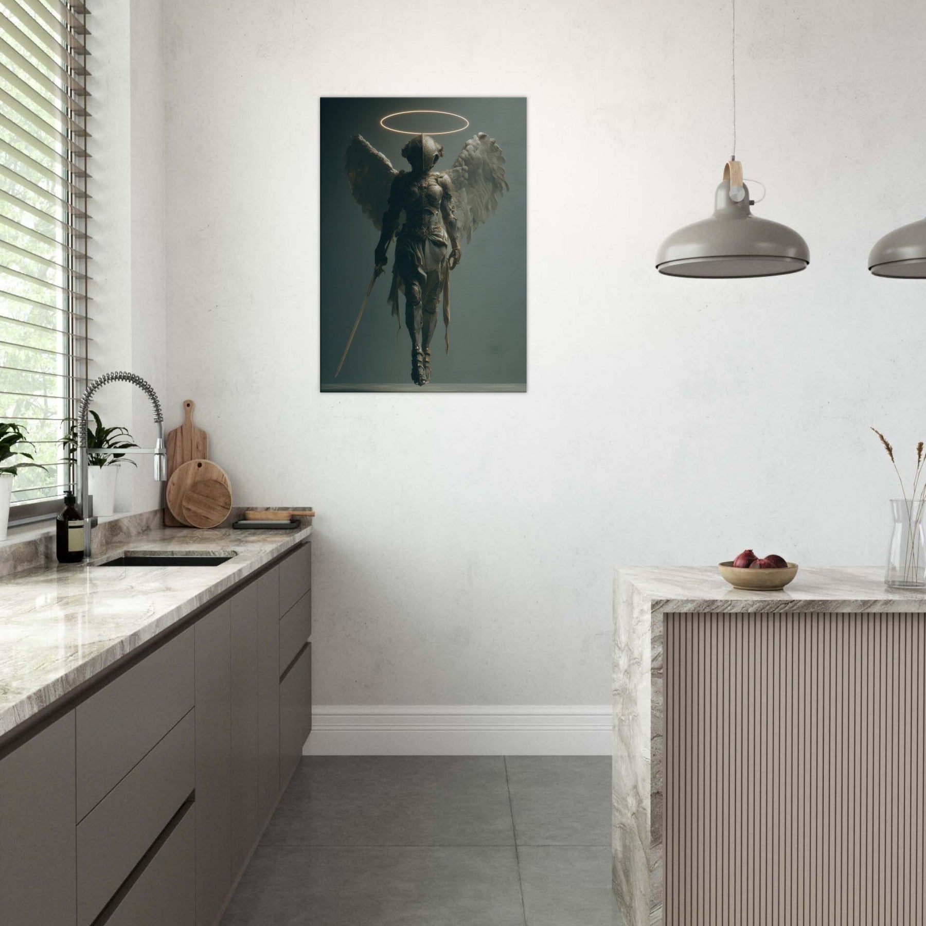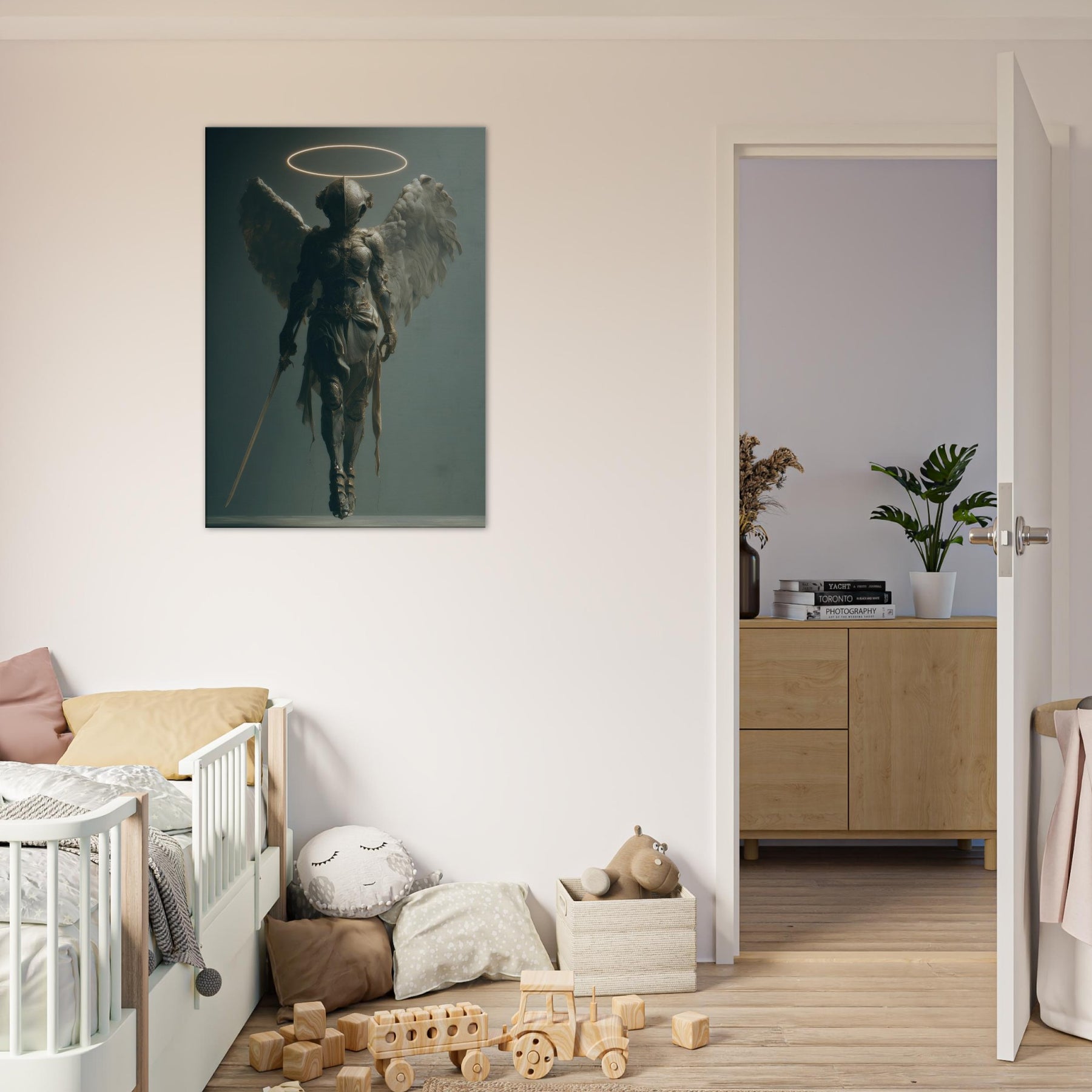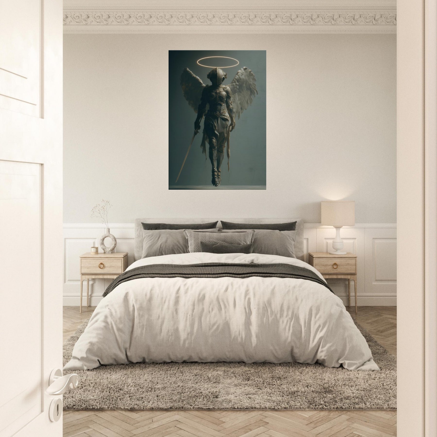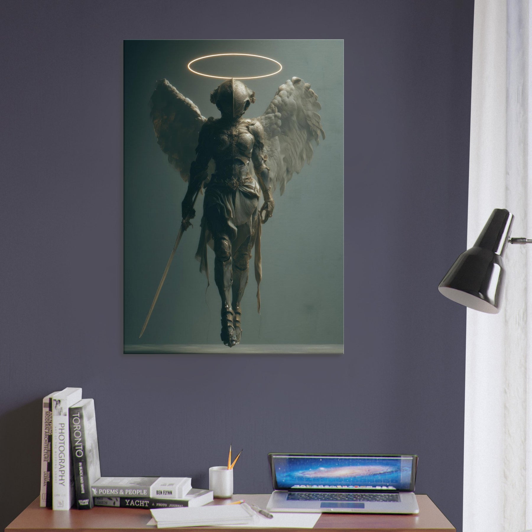Descending in a dreamlike gravity, Archangel Michael (Sword & Scales) stands crowned by a halo of light, his wings unfurled in surreal majesty. The air hums with a quiet tension as metal and mist meet in measured balance. This work invites reflection and awe, turning a living space into a sanctuary of spirit and style. Its luminous halo and armored grace infuse the room with ethereal drama, guiding conversation and imagination in equal measure.